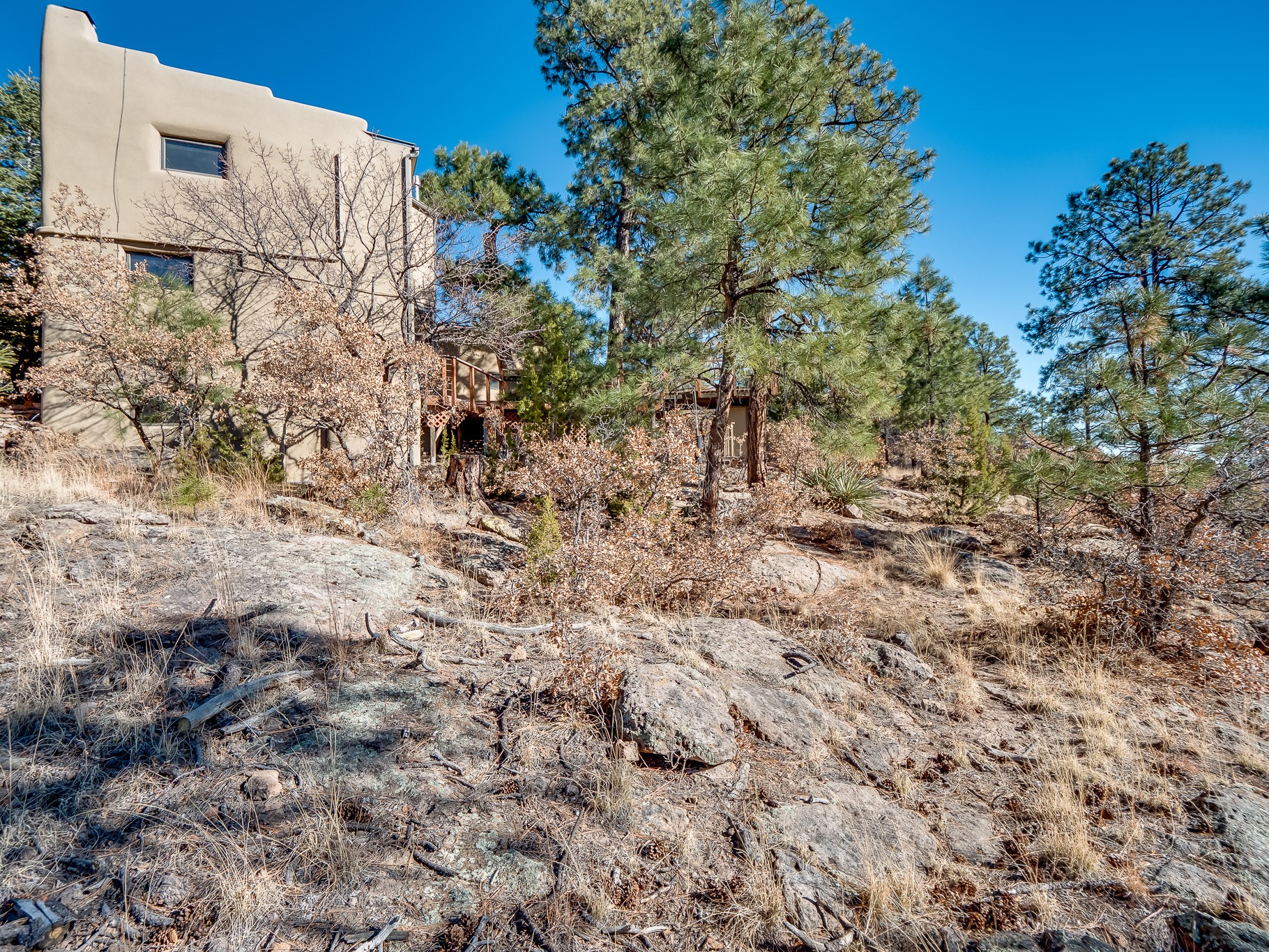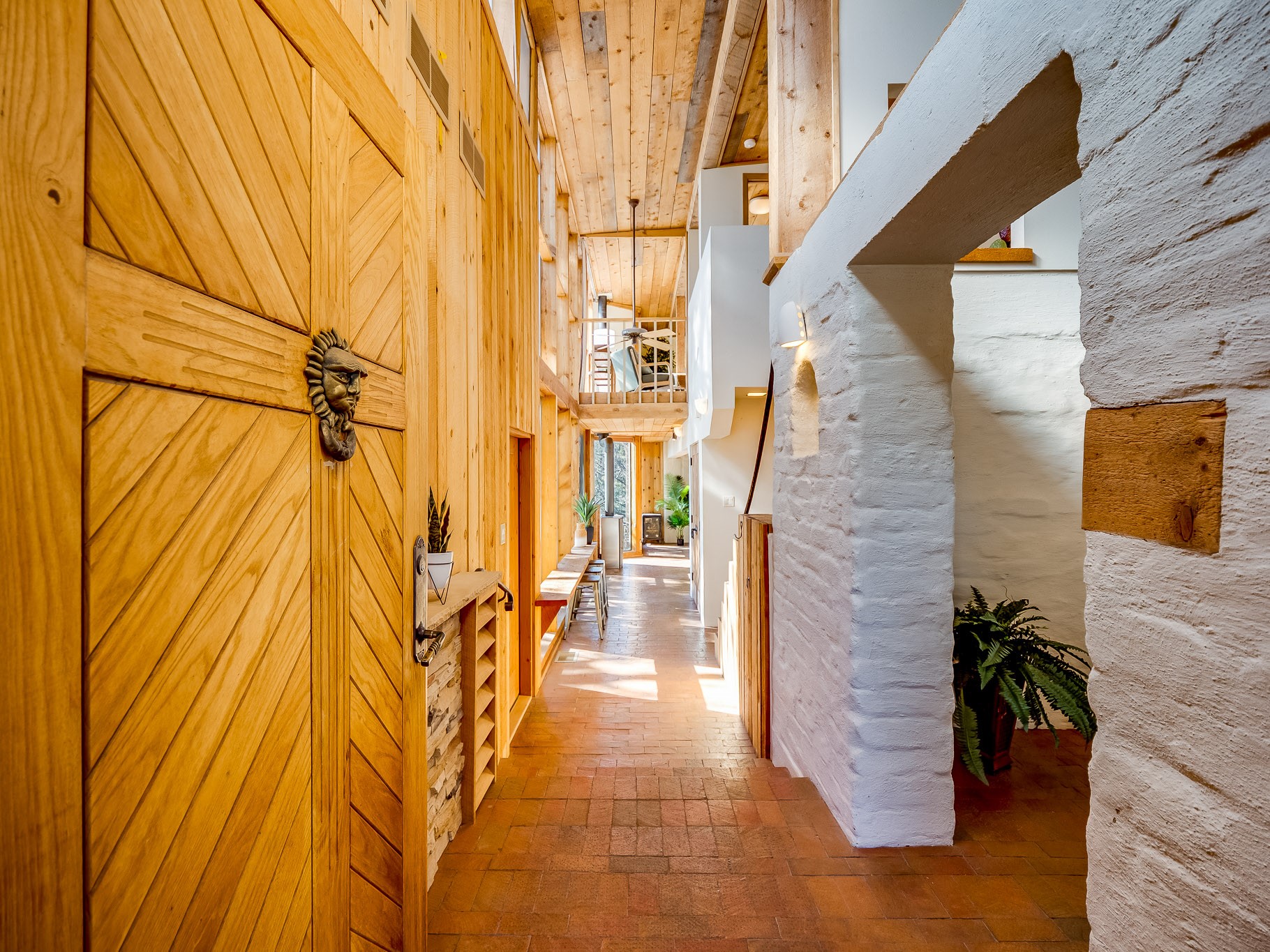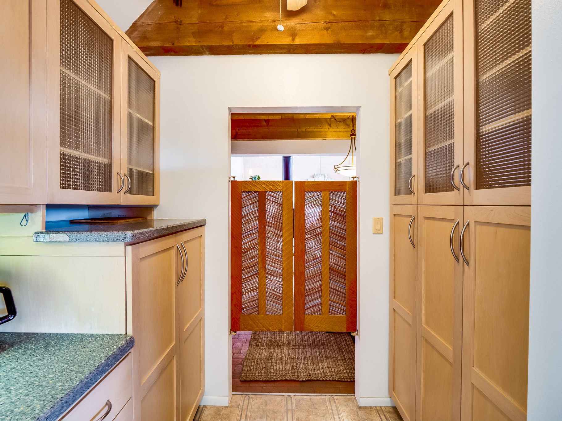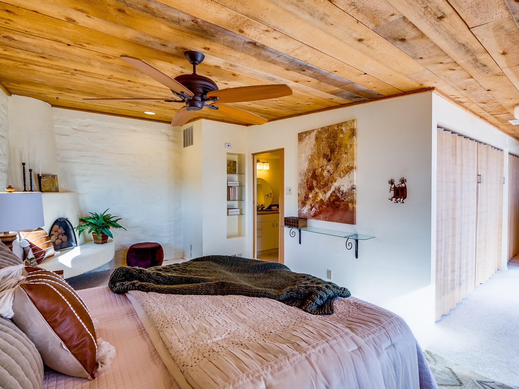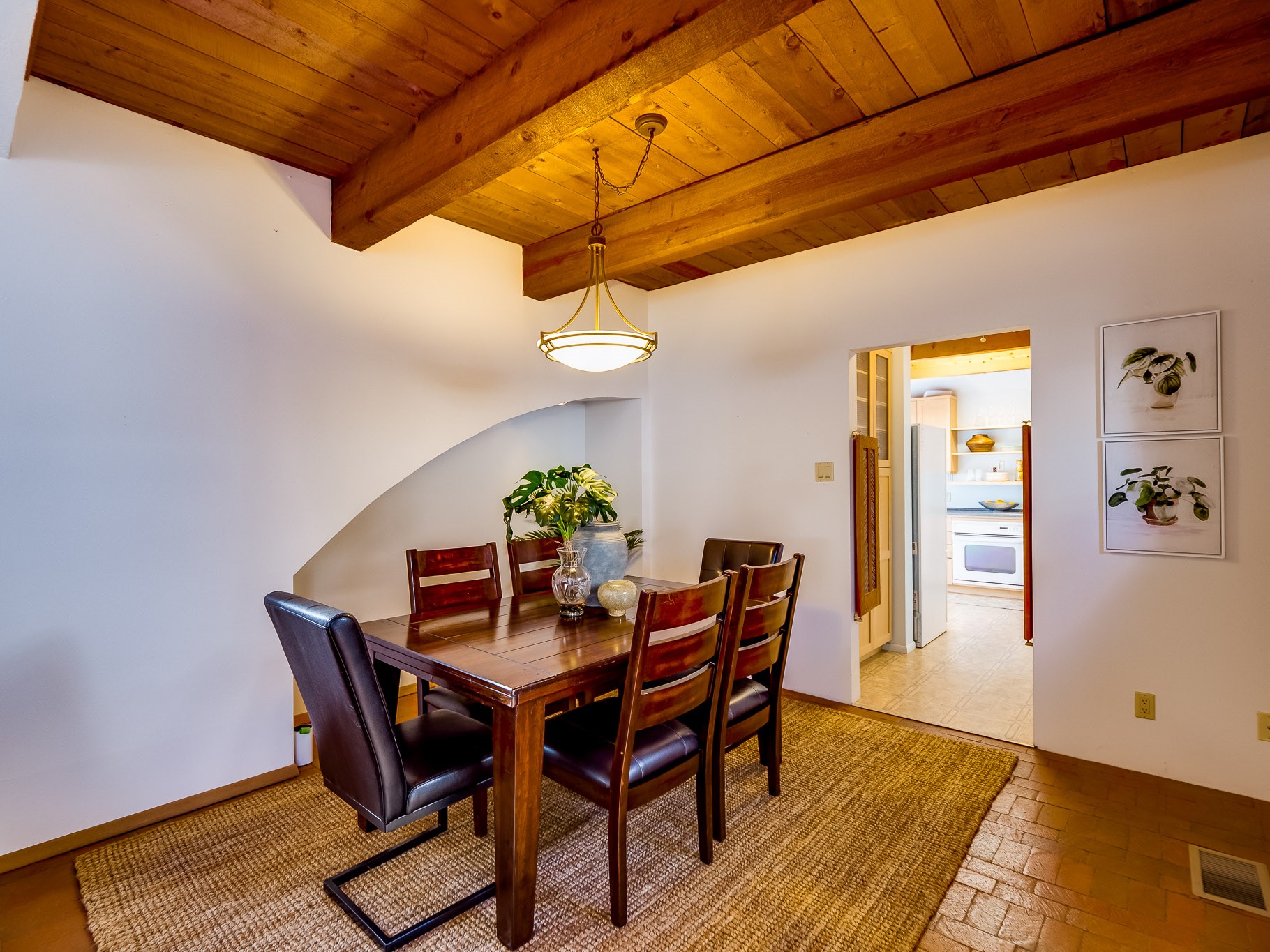 Perched on the canyon in North Mesa, this custom modern adobe home is a rare architectural offering that seamlessly blends natural materials, thoughtful design, and breathtaking surroundings. Character and craftsmanship are evident at every turn, with expansive canyon and treetop views. From the moment you step through the front door your'e greeted with a long, dramatic hallway setting the tone, featuring wood-planked vaulted ceilings, brick flooring, floor to ceiling windows and a rich combination of wood plank and plastered walls that continue throughout the home. The living room carries forward the vaulted ceilings and is anchored by a wood-burning freestanding fireplace that serves as a striking focal point between the living and dining area, thoughtfully tying the spaces together. The kitchen and family room form a bright, open living space with wood-beamed ceilings, abundant windows, and sliding doors that lead directly to the deck. The family room offers a custom wood built-in cabinetry and a gas freestanding fireplace. The kitchen features light-toned wood cabinetry, hard surface counters, and a peninsula island with bar seating, perfect for casual meals or entertaining. Just off the kitchen is a guest bath with a single-sink vanity and a tiled walk-in shower. This level also provides access to the two-car garage, which includes a connected green room. Upstairs, is fully carpeted and offers two bedrooms. A guest bed and the spacious primary suite that feels luxurious and serene, highlighted by a kiva fireplace and a dedicated seating area. There's a large closet and a washer and dryer for added convenience. The generously sized bathroom is shared between the two bedrooms and includes a deep jetted soaking tub, a walk-in shower, and two separate single-sink vanities. Outdoor living is truly exceptional, with a massive composite deck offering multiple areas for entertaining and taking in those canyon views. Book your tour to experience this home for yourself!
