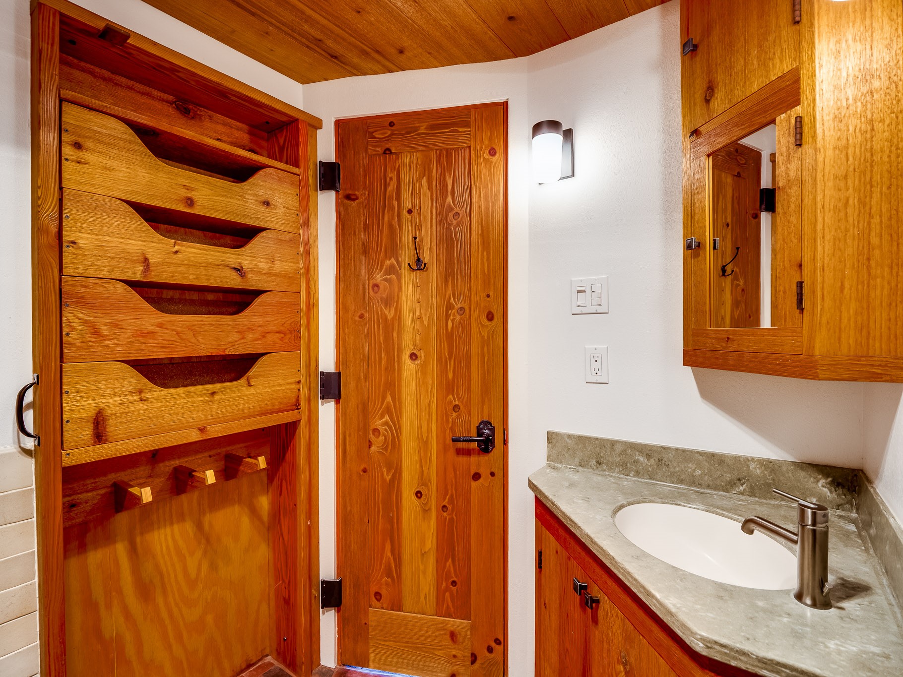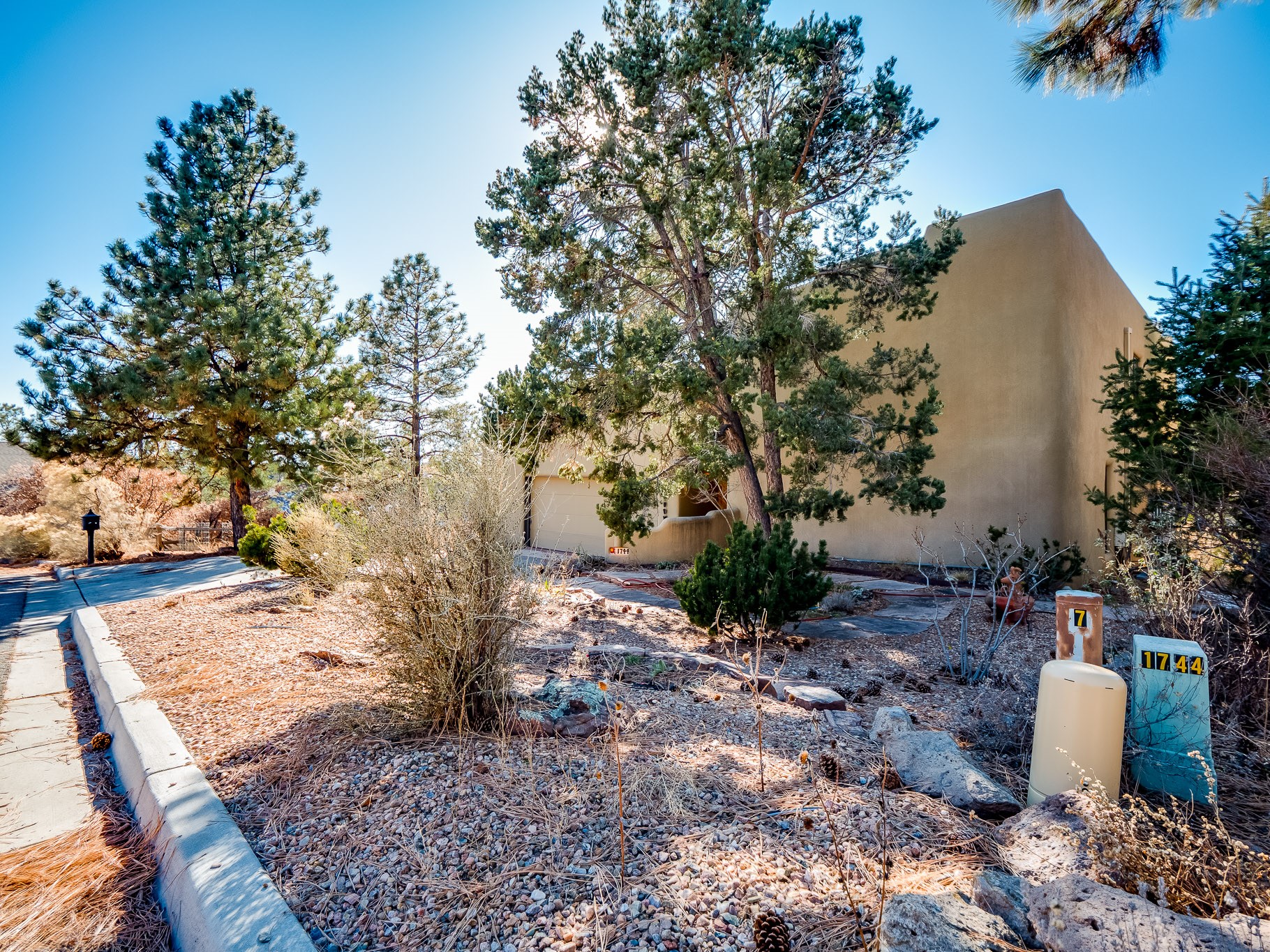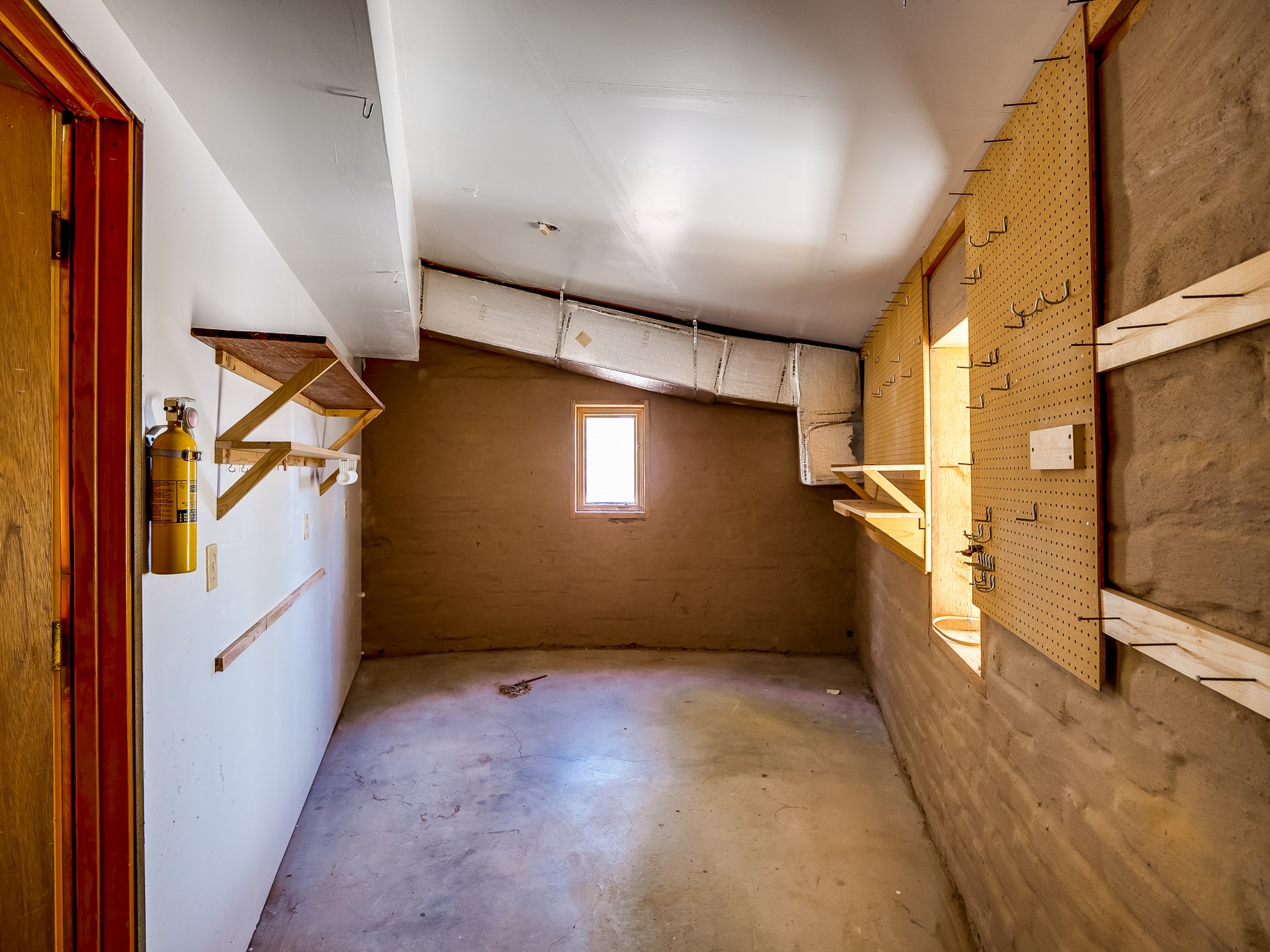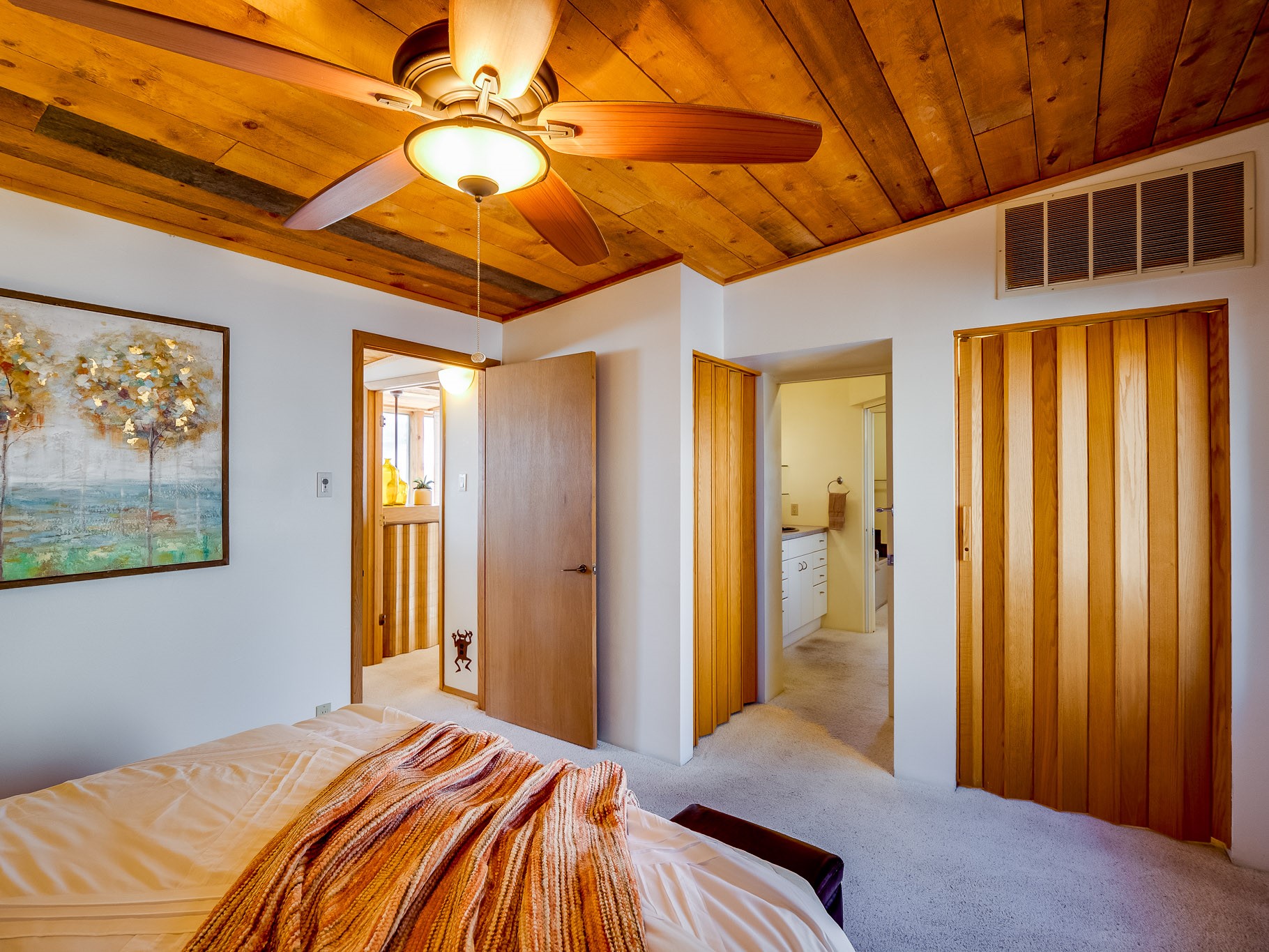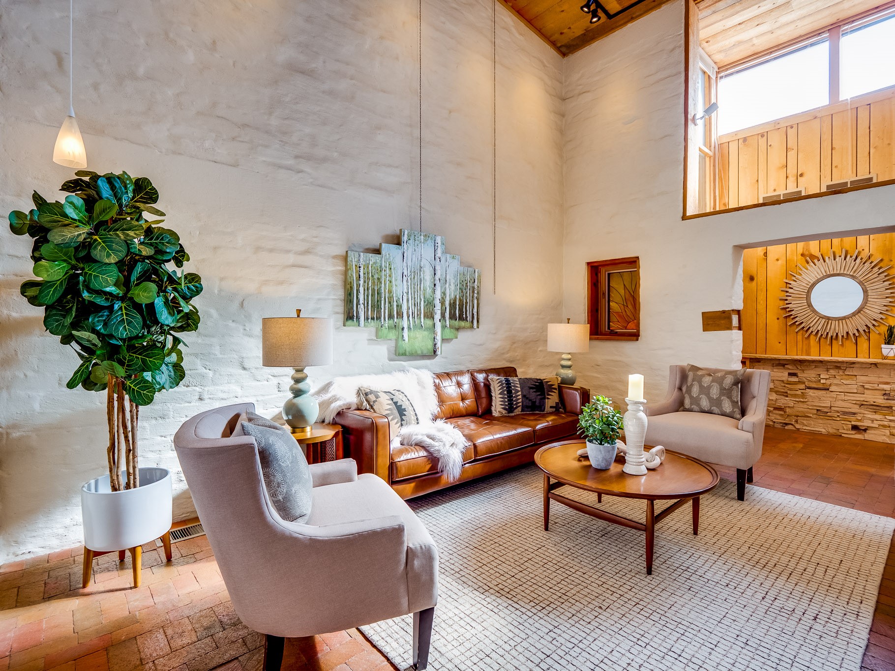 Perched on the canyon in North Mesa, this custom modern adobe home is a rare architectural offering that seamlessly blends natural materials, thoughtful design, and breathtaking surroundings. Character and craftsmanship are evident at every turn, with expansive canyon and treetop views. From the moment you step through the front door your'e greeted with a long, dramatic hallway setting the tone, featuring wood-planked vaulted ceilings, brick flooring, floor to ceiling windows and a rich combination of wood plank and plastered walls that continue throughout the home. The living room carries forward the vaulted ceilings and is anchored by a wood-burning freestanding fireplace that serves as a striking focal point between the living and dining area, thoughtfully tying the spaces together. The kitchen and family room form a bright, open living space with wood-beamed ceilings, abundant windows, and sliding doors that lead directly to the deck. The family room offers a custom wood built-in cabinetry and a gas freestanding fireplace. The kitchen features light-toned wood cabinetry, hard surface counters, and a peninsula island with bar seating, perfect for casual meals or entertaining. Just off the kitchen is a guest bath with a single-sink vanity and a tiled walk-in shower. This level also provides access to the two-car garage, which includes a connected green room. Upstairs, is fully carpeted and offers two bedrooms. A guest bed and the spacious primary suite that feels luxurious and serene, highlighted by a kiva fireplace and a dedicated seating area. There's a large closet and a washer and dryer for added convenience. The generously sized bathroom is shared between the two bedrooms and includes a deep jetted soaking tub, a walk-in shower, and two separate single-sink vanities. Outdoor living is truly exceptional, with a massive composite deck offering multiple areas for entertaining and taking in those canyon views. Book your tour to experience this home for yourself!