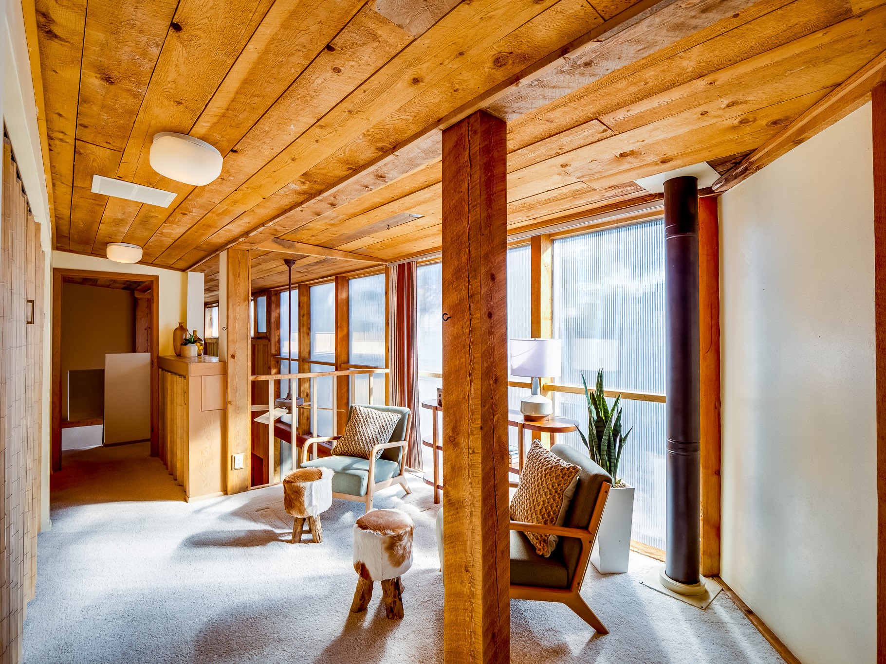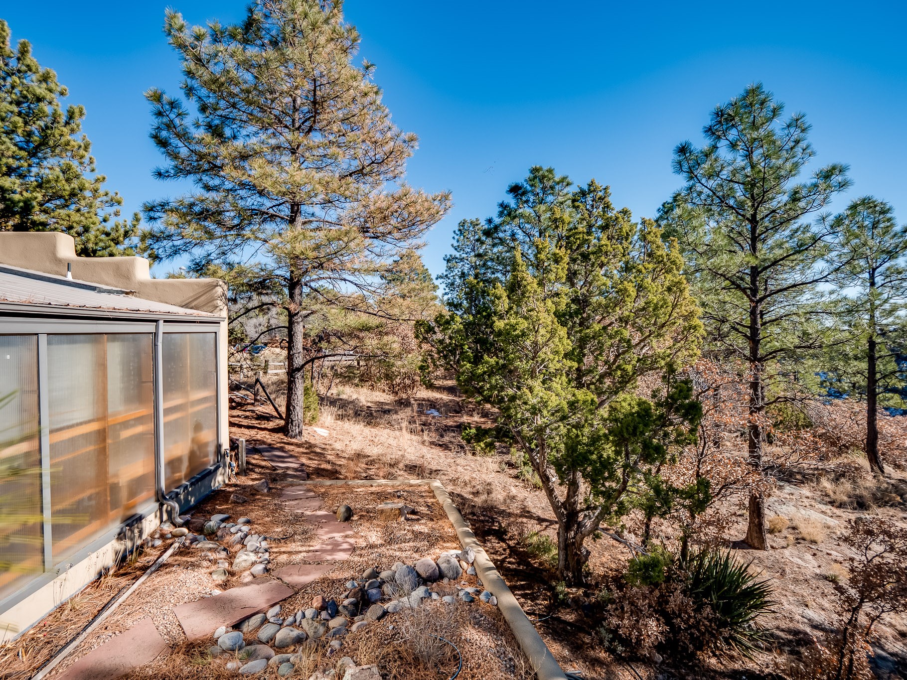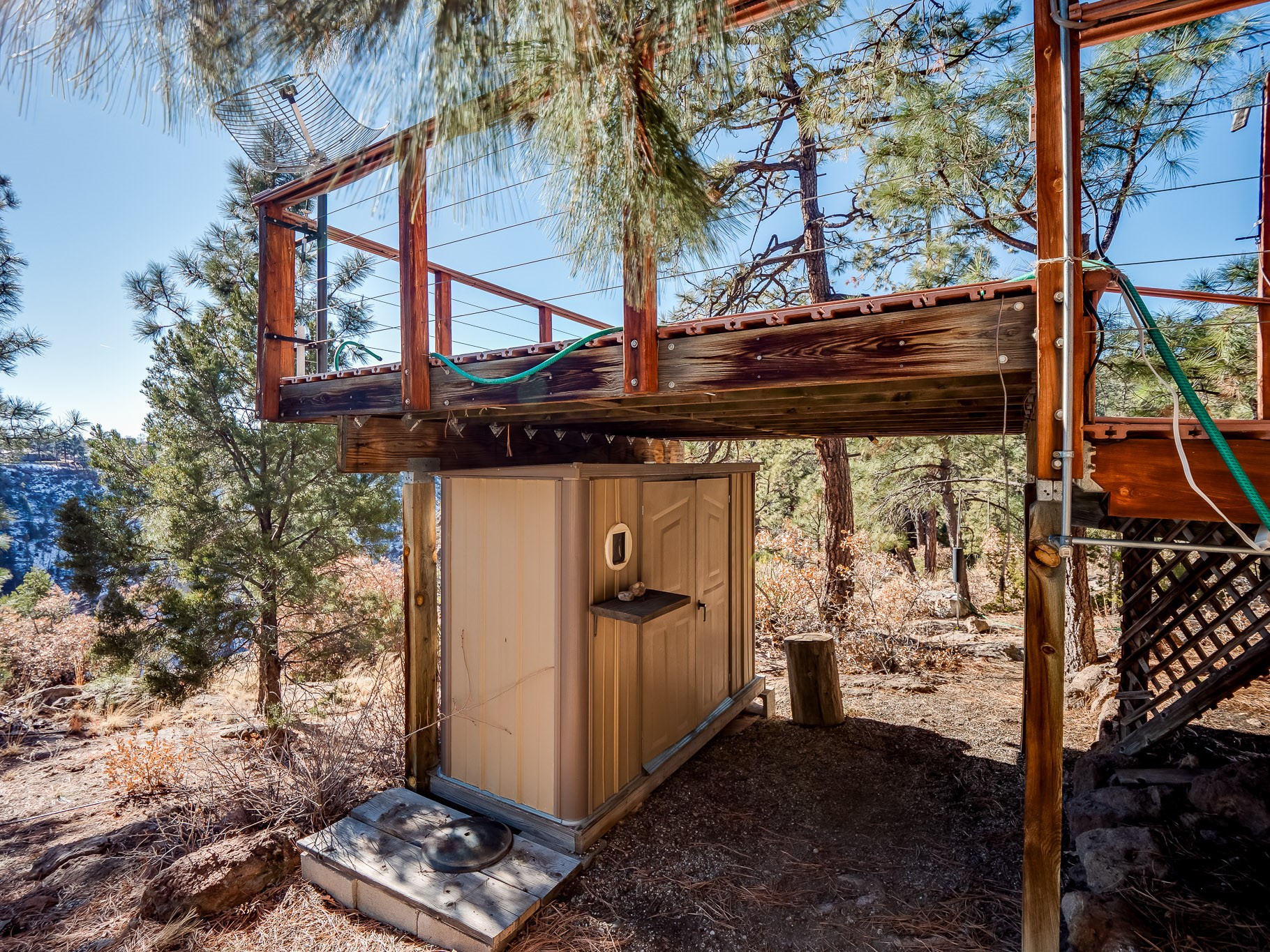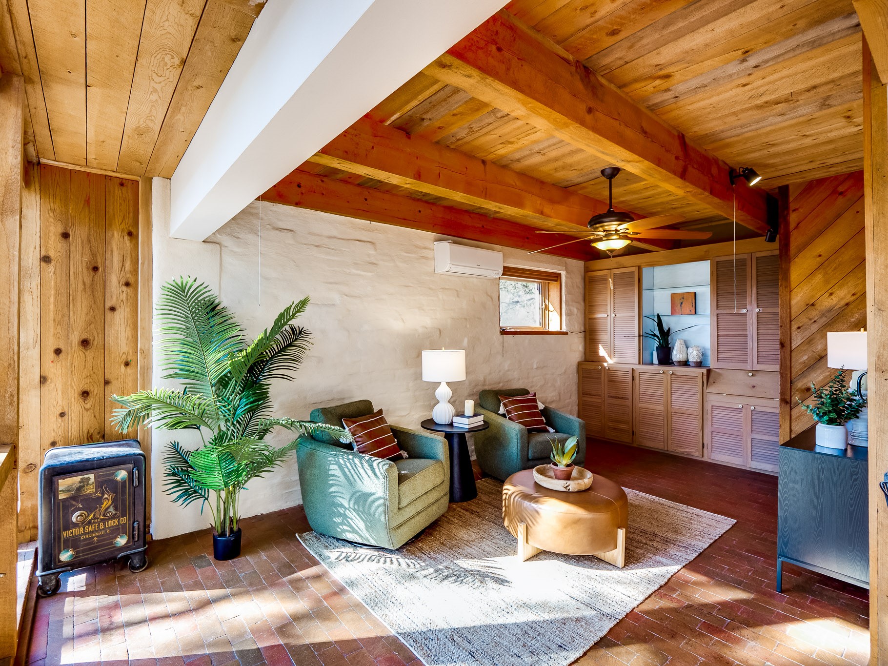 Perched on the canyon in North Mesa, this custom modern adobe home is a rare architectural offering that seamlessly blends natural materials, thoughtful design, and breathtaking surroundings. Character and craftsmanship are evident at every turn, with expansive canyon and treetop views. From the moment you step through the front door your'e greeted with a long, dramatic hallway setting the tone, featuring wood-planked vaulted ceilings, brick flooring, floor to ceiling windows and a rich combination of wood plank and plastered walls that continue throughout the home. The living room carries forward the vaulted ceilings and is anchored by a wood-burning freestanding fireplace that serves as a striking focal point between the living and dining area, thoughtfully tying the spaces together. The kitchen and family room form a bright, open living space with wood-beamed ceilings, abundant windows, and sliding doors that lead directly to the deck. The family room offers a custom wood built-in cabinetry and a gas freestanding fireplace. The kitchen features light-toned wood cabinetry, hard surface counters, and a peninsula island with bar seating, perfect for casual meals or entertaining. Just off the kitchen is a guest bath with a single-sink vanity and a tiled walk-in shower. This level also provides access to the two-car garage, which includes a connected green room. Upstairs, is fully carpeted and offers two bedrooms. A guest bed and the spacious primary suite that feels luxurious and serene, highlighted by a kiva fireplace and a dedicated seating area. There's a large closet and a washer and dryer for added convenience. The generously sized bathroom is shared between the two bedrooms and includes a deep jetted soaking tub, a walk-in shower, and two separate single-sink vanities. Outdoor living is truly exceptional, with a massive composite deck offering multiple areas for entertaining and taking in those canyon views. Book your tour to experience this home for yourself!