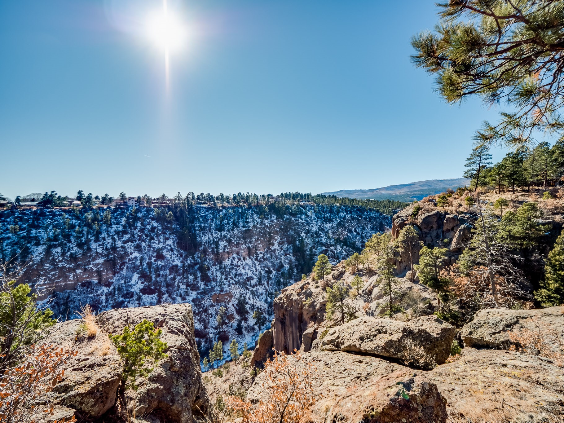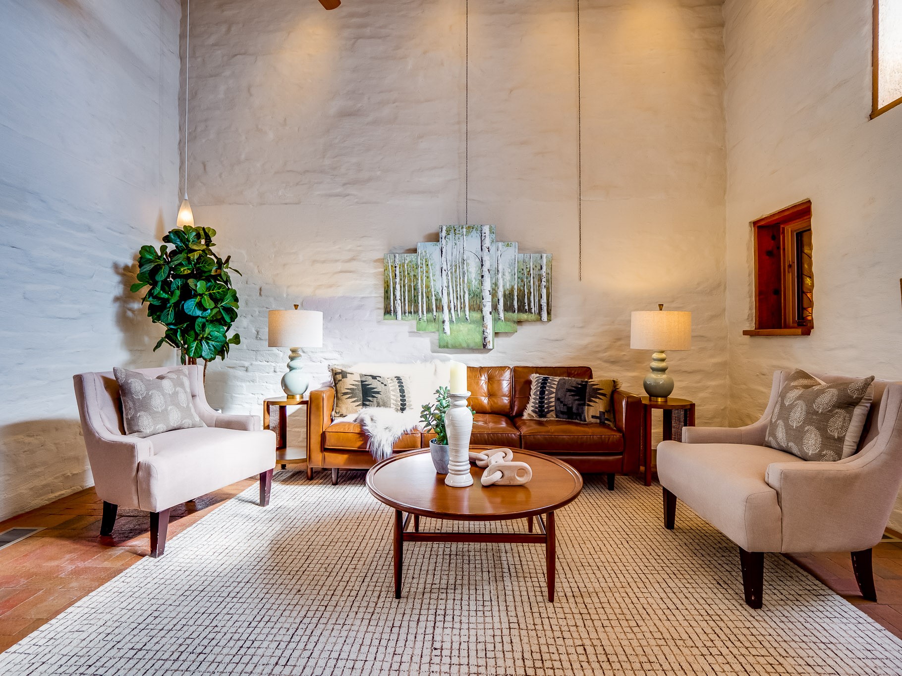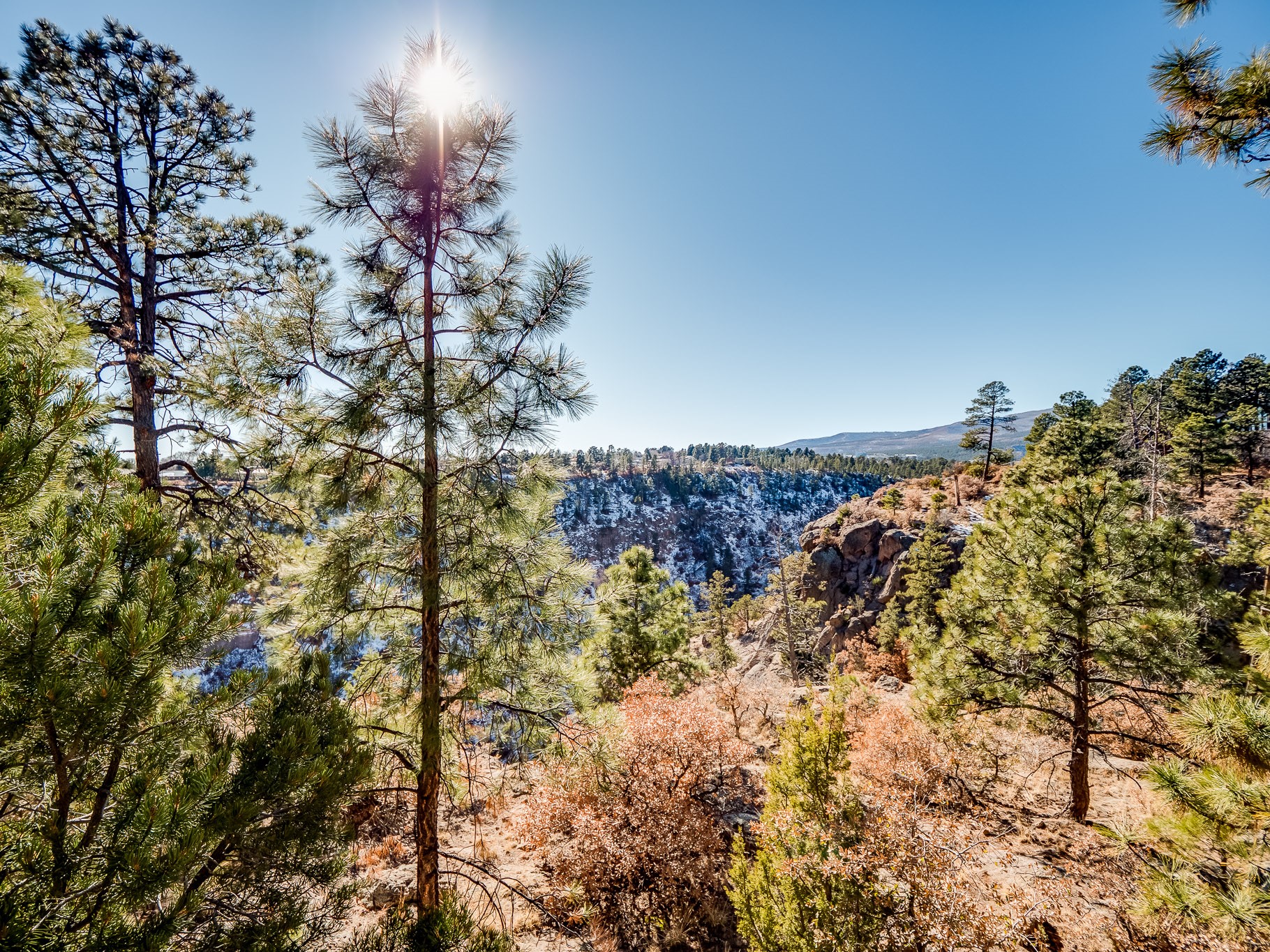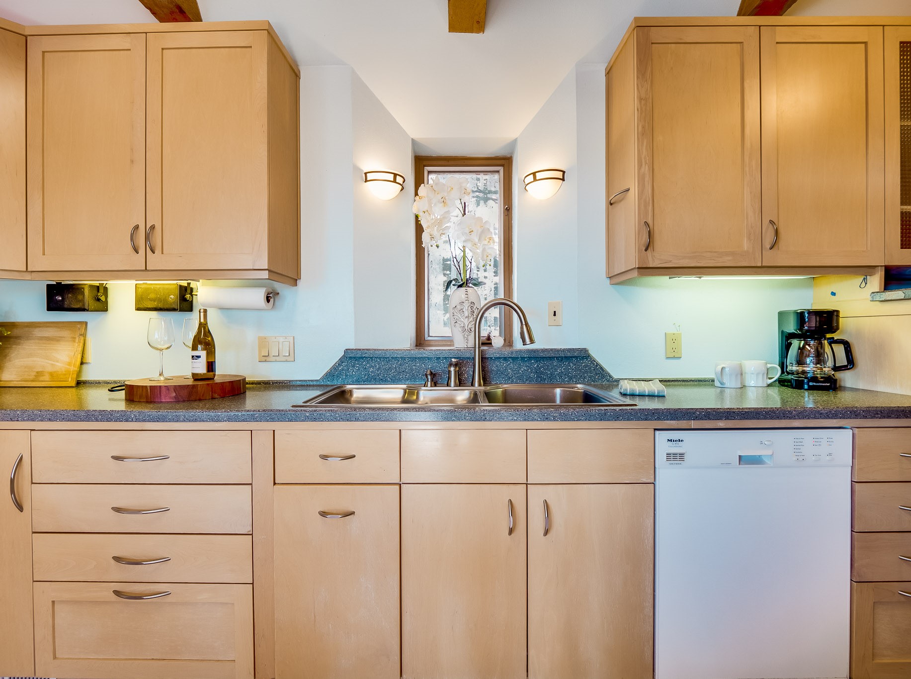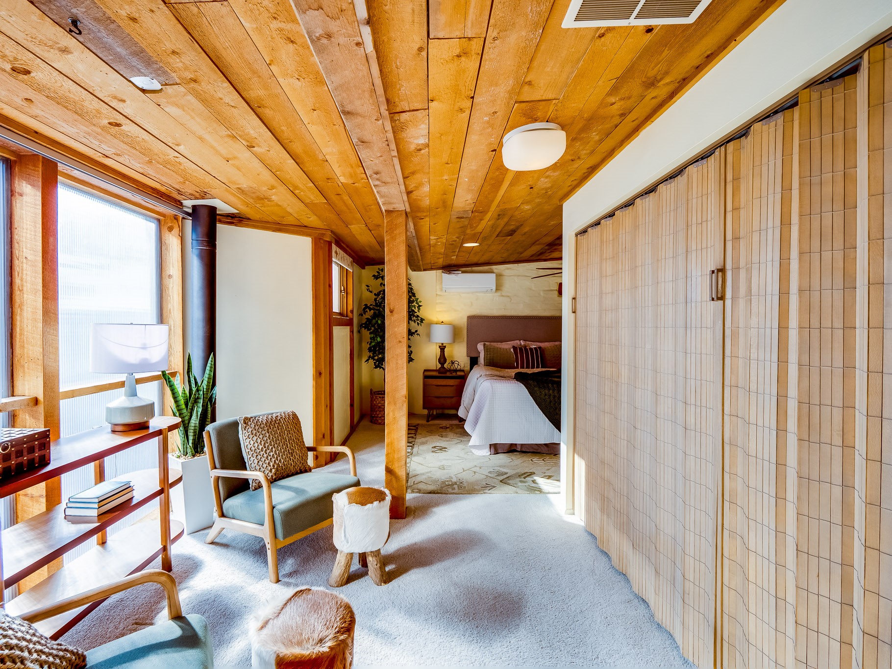 Perched on the canyon in North Mesa, this custom modern adobe home is a rare architectural offering that seamlessly blends natural materials, thoughtful design, and breathtaking surroundings. Character and craftsmanship are evident at every turn, with expansive canyon and treetop views. From the moment you step through the front door your'e greeted with a long, dramatic hallway setting the tone, featuring wood-planked vaulted ceilings, brick flooring, floor to ceiling windows and a rich combination of wood plank and plastered walls that continue throughout the home. The living room carries forward the vaulted ceilings and is anchored by a wood-burning freestanding fireplace that serves as a striking focal point between the living and dining area, thoughtfully tying the spaces together. The kitchen and family room form a bright, open living space with wood-beamed ceilings, abundant windows, and sliding doors that lead directly to the deck. The family room offers a custom wood built-in cabinetry and a gas freestanding fireplace. The kitchen features light-toned wood cabinetry, hard surface counters, and a peninsula island with bar seating, perfect for casual meals or entertaining. Just off the kitchen is a guest bath with a single-sink vanity and a tiled walk-in shower. This level also provides access to the two-car garage, which includes a connected green room. Upstairs, is fully carpeted and offers two bedrooms. A guest bed and the spacious primary suite that feels luxurious and serene, highlighted by a kiva fireplace and a dedicated seating area. There's a large closet and a washer and dryer for added convenience. The generously sized bathroom is shared between the two bedrooms and includes a deep jetted soaking tub, a walk-in shower, and two separate single-sink vanities. Outdoor living is truly exceptional, with a massive composite deck offering multiple areas for entertaining and taking in those canyon views. Book your tour to experience this home for yourself!