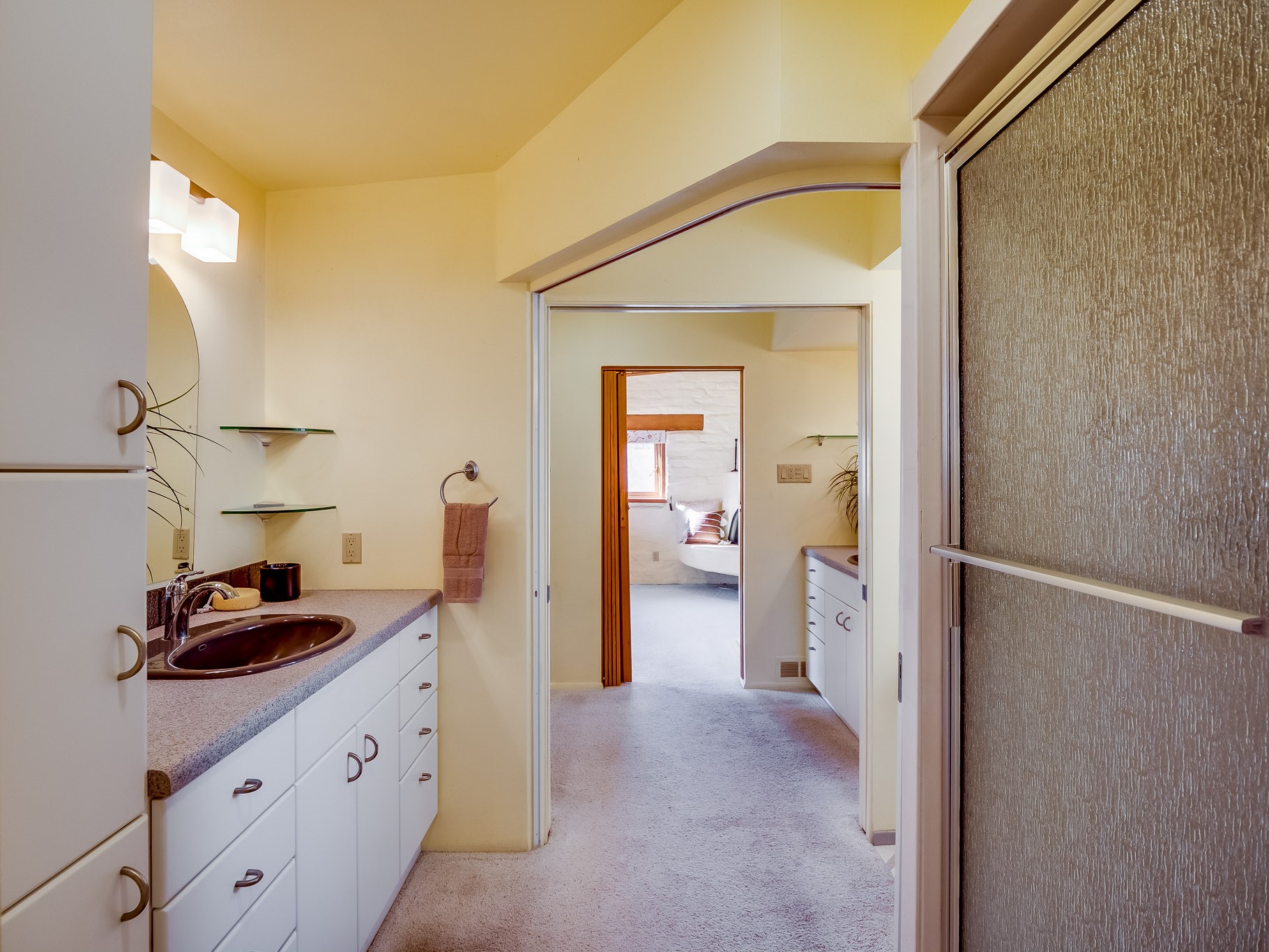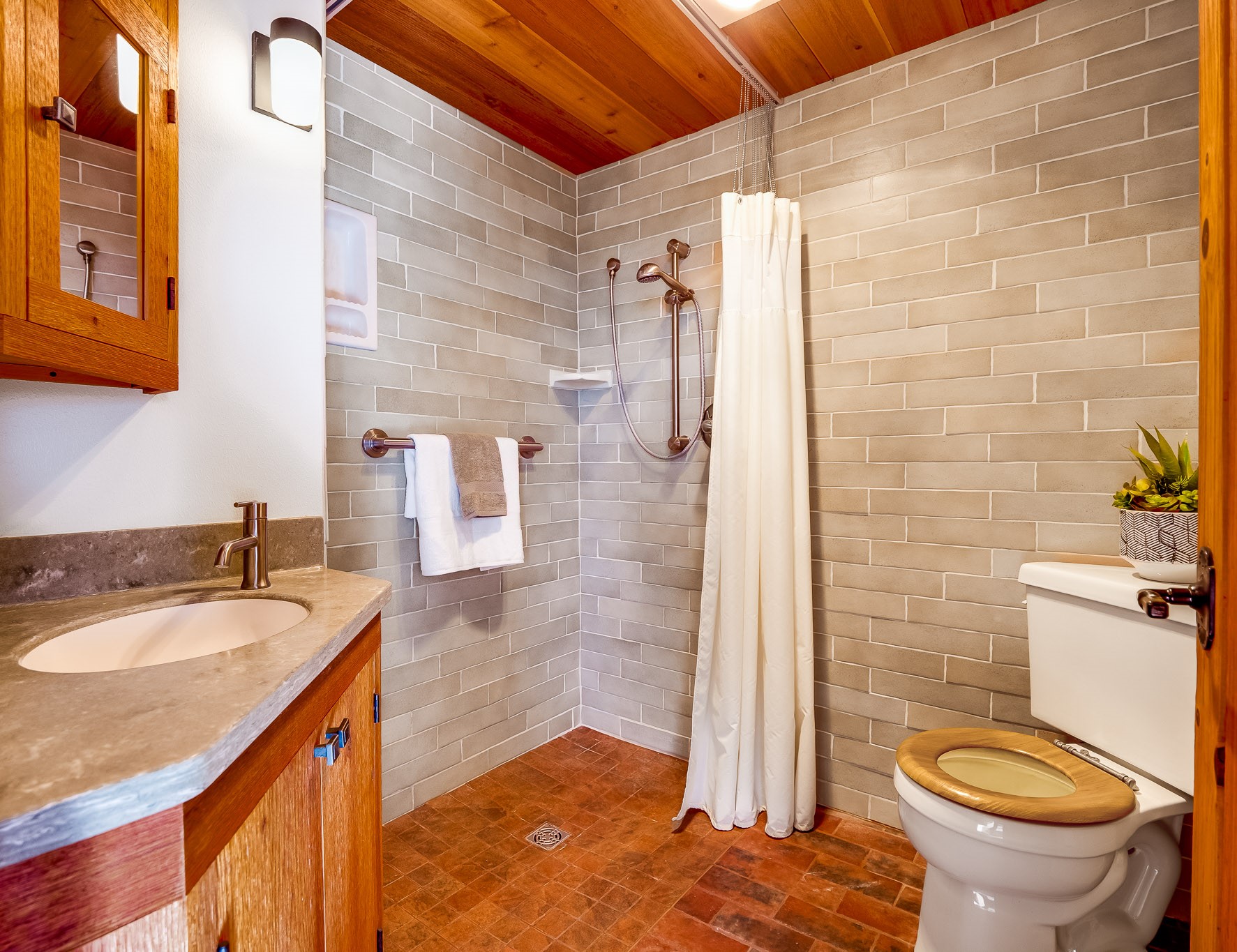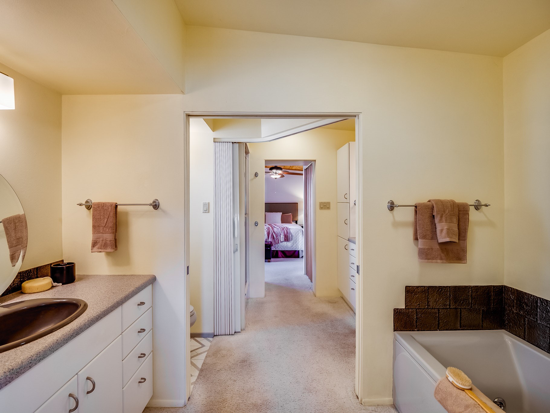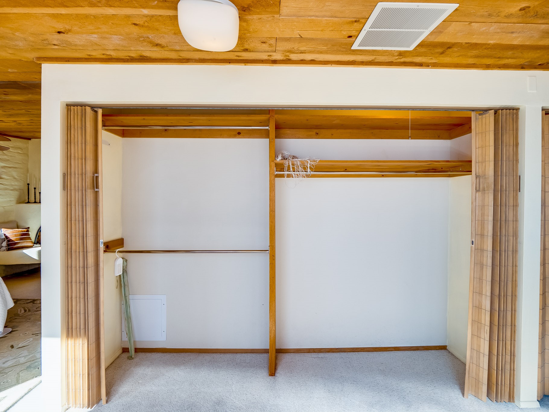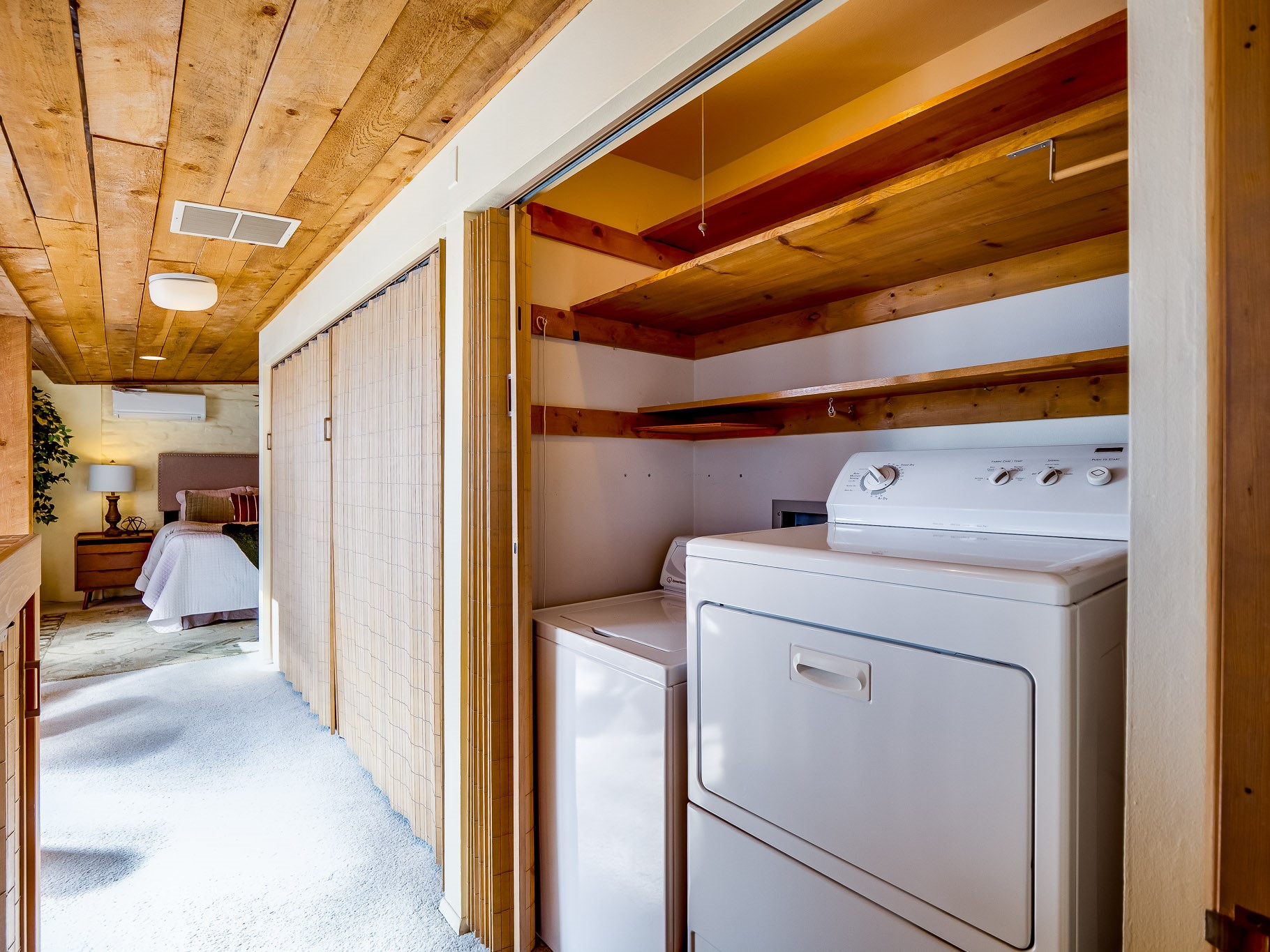 Perched on the canyon in North Mesa, this custom modern adobe home is a rare architectural offering that seamlessly blends natural materials, thoughtful design, and breathtaking surroundings. Character and craftsmanship are evident at every turn, with expansive canyon and treetop views. From the moment you step through the front door your'e greeted with a long, dramatic hallway setting the tone, featuring wood-planked vaulted ceilings, brick flooring, floor to ceiling windows and a rich combination of wood plank and plastered walls that continue throughout the home. The living room carries forward the vaulted ceilings and is anchored by a wood-burning freestanding fireplace that serves as a striking focal point between the living and dining area, thoughtfully tying the spaces together. The kitchen and family room form a bright, open living space with wood-beamed ceilings, abundant windows, and sliding doors that lead directly to the deck. The family room offers a custom wood built-in cabinetry and a gas freestanding fireplace. The kitchen features light-toned wood cabinetry, hard surface counters, and a peninsula island with bar seating, perfect for casual meals or entertaining. Just off the kitchen is a guest bath with a single-sink vanity and a tiled walk-in shower. This level also provides access to the two-car garage, which includes a connected green room. Upstairs, is fully carpeted and offers two bedrooms. A guest bed and the spacious primary suite that feels luxurious and serene, highlighted by a kiva fireplace and a dedicated seating area. There's a large closet and a washer and dryer for added convenience. The generously sized bathroom is shared between the two bedrooms and includes a deep jetted soaking tub, a walk-in shower, and two separate single-sink vanities. Outdoor living is truly exceptional, with a massive composite deck offering multiple areas for entertaining and taking in those canyon views. Book your tour to experience this home for yourself!