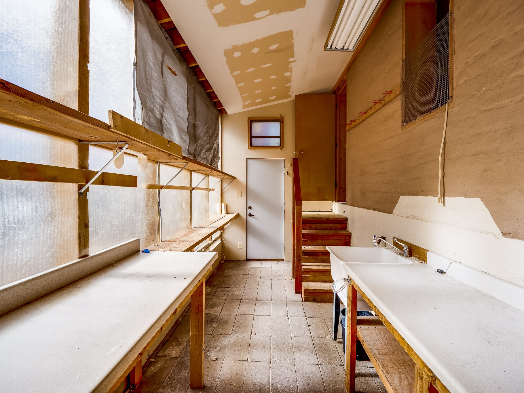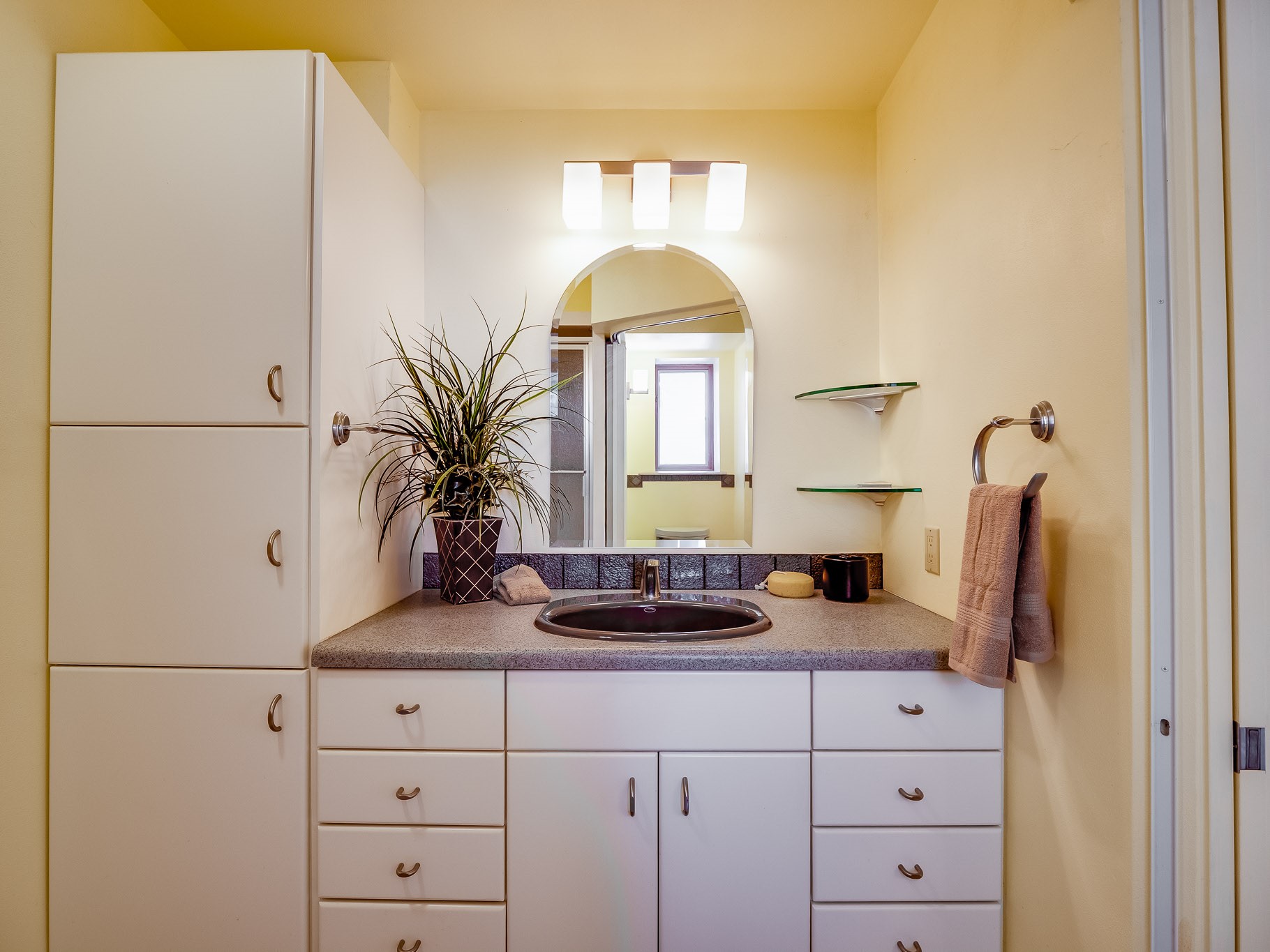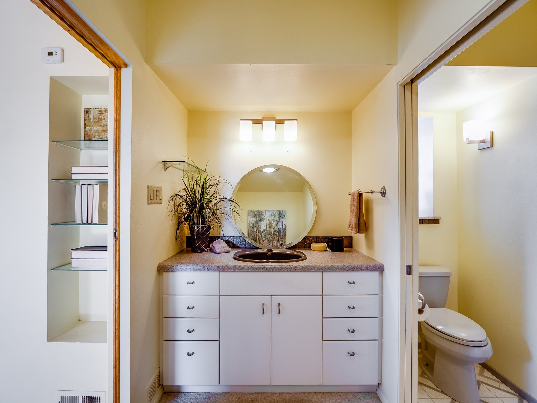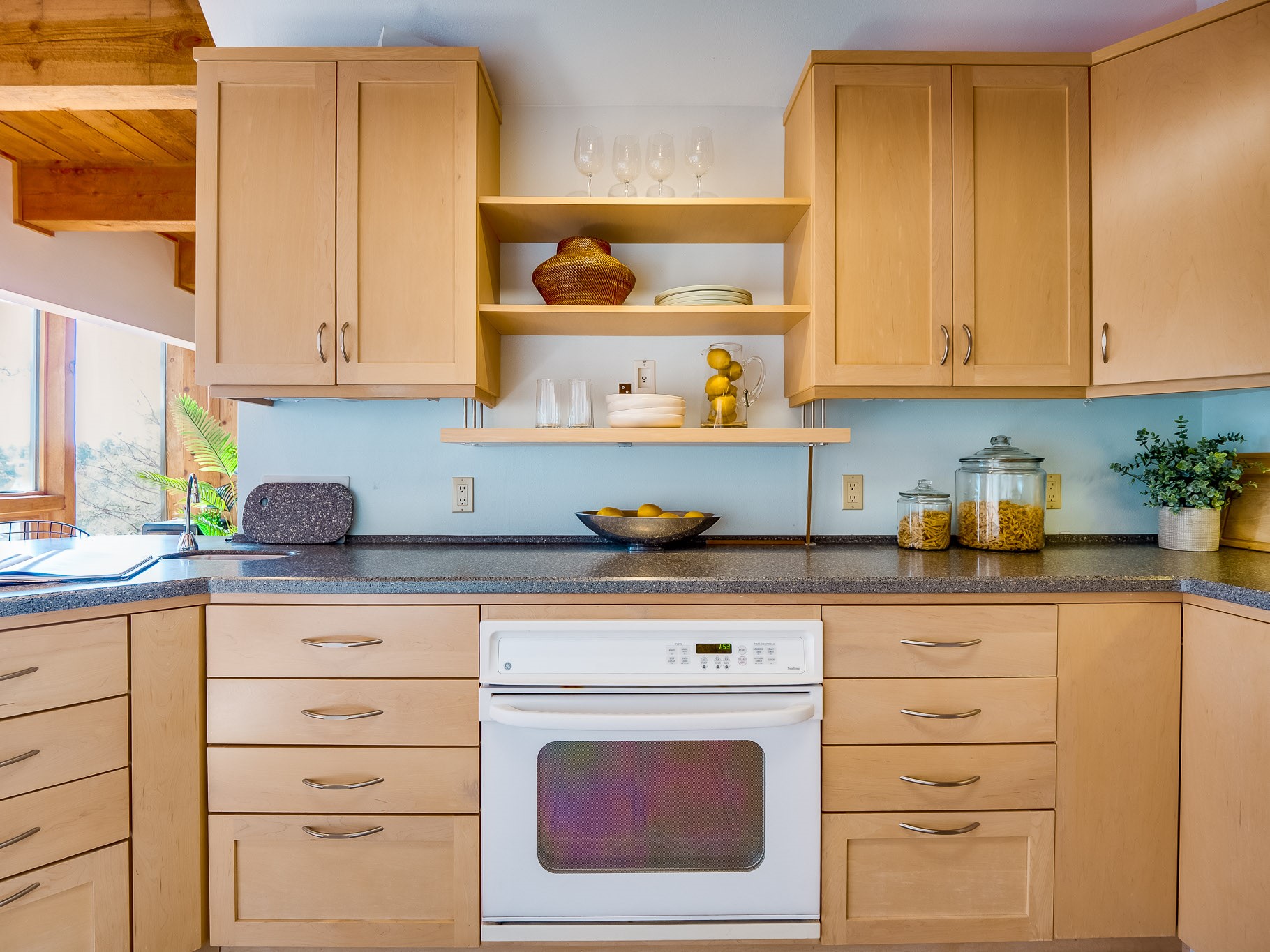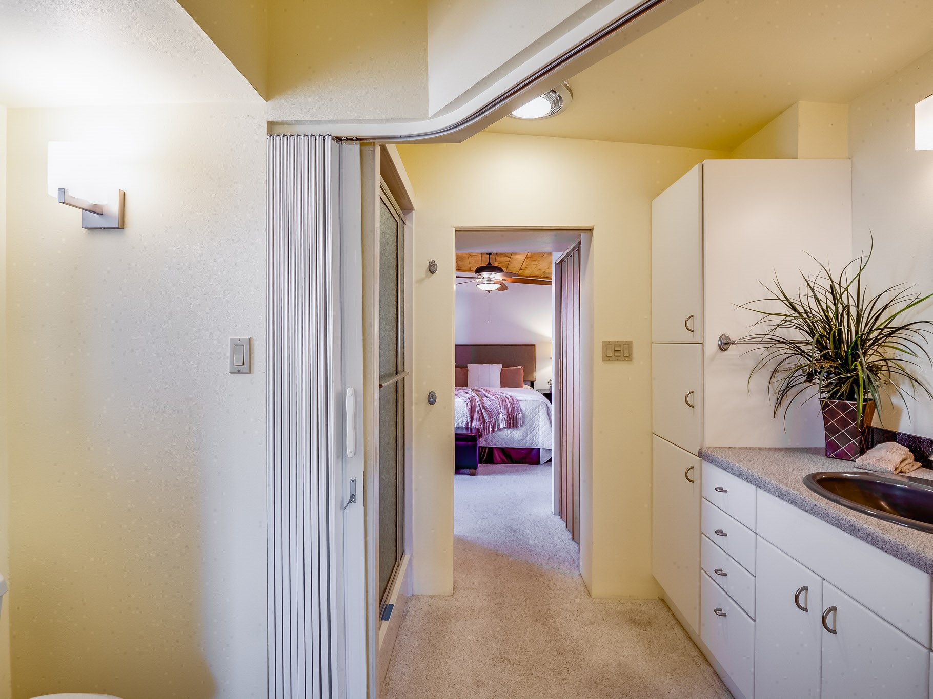 Perched on the canyon in North Mesa, this custom modern adobe home is a rare architectural offering that seamlessly blends natural materials, thoughtful design, and breathtaking surroundings. Character and craftsmanship are evident at every turn, with expansive canyon and treetop views. From the moment you step through the front door your'e greeted with a long, dramatic hallway setting the tone, featuring wood-planked vaulted ceilings, brick flooring, floor to ceiling windows and a rich combination of wood plank and plastered walls that continue throughout the home. The living room carries forward the vaulted ceilings and is anchored by a wood-burning freestanding fireplace that serves as a striking focal point between the living and dining area, thoughtfully tying the spaces together. The kitchen and family room form a bright, open living space with wood-beamed ceilings, abundant windows, and sliding doors that lead directly to the deck. The family room offers a custom wood built-in cabinetry and a gas freestanding fireplace. The kitchen features light-toned wood cabinetry, hard surface counters, and a peninsula island with bar seating, perfect for casual meals or entertaining. Just off the kitchen is a guest bath with a single-sink vanity and a tiled walk-in shower. This level also provides access to the two-car garage, which includes a connected green room. Upstairs, is fully carpeted and offers two bedrooms. A guest bed and the spacious primary suite that feels luxurious and serene, highlighted by a kiva fireplace and a dedicated seating area. There's a large closet and a washer and dryer for added convenience. The generously sized bathroom is shared between the two bedrooms and includes a deep jetted soaking tub, a walk-in shower, and two separate single-sink vanities. Outdoor living is truly exceptional, with a massive composite deck offering multiple areas for entertaining and taking in those canyon views. Book your tour to experience this home for yourself!