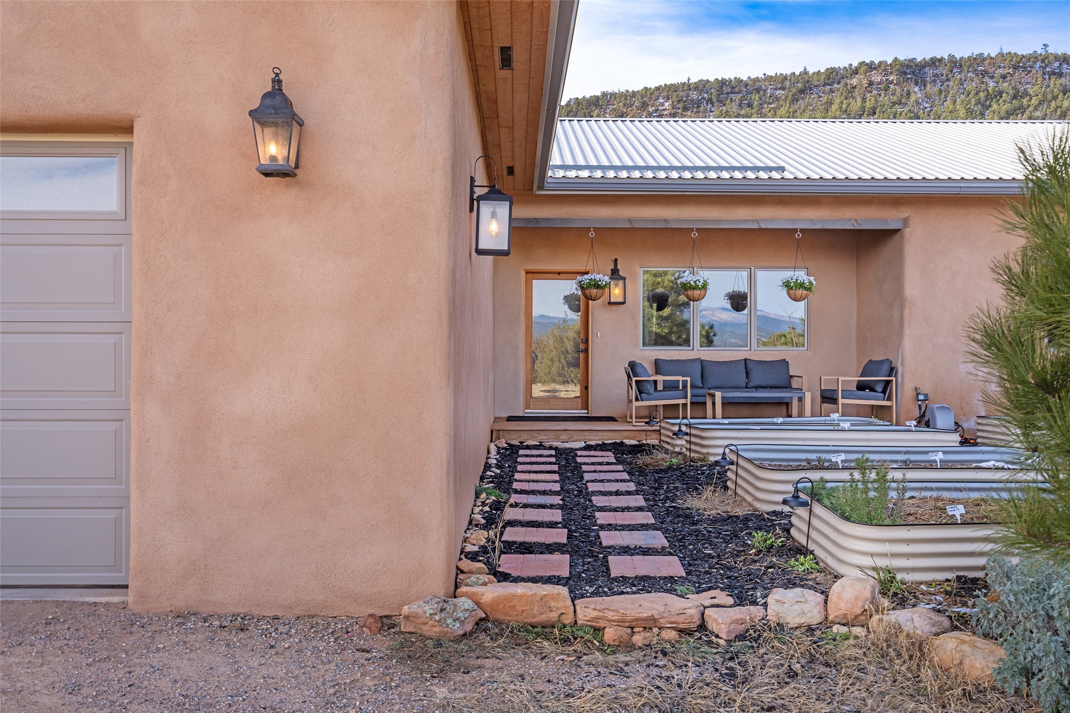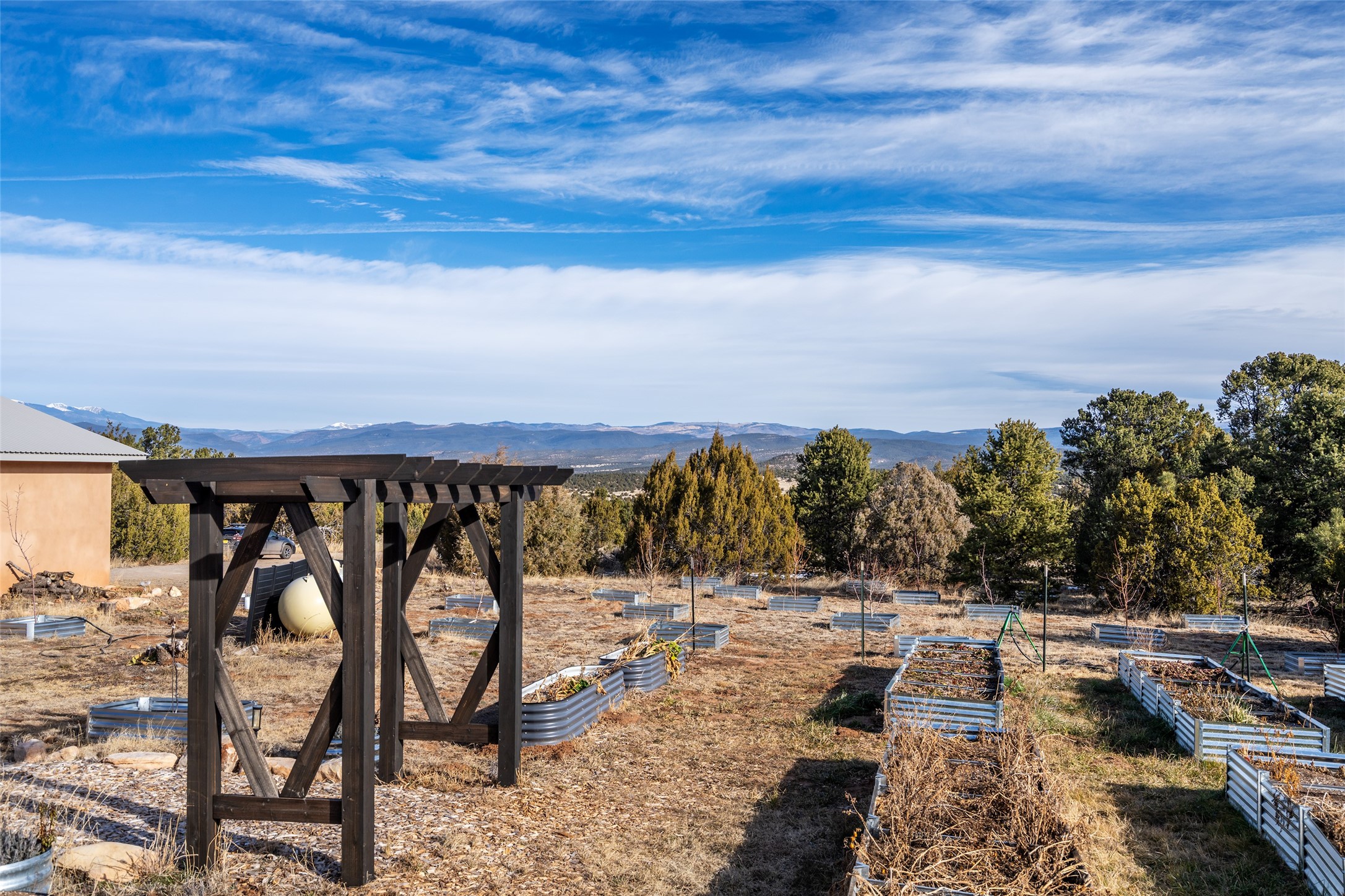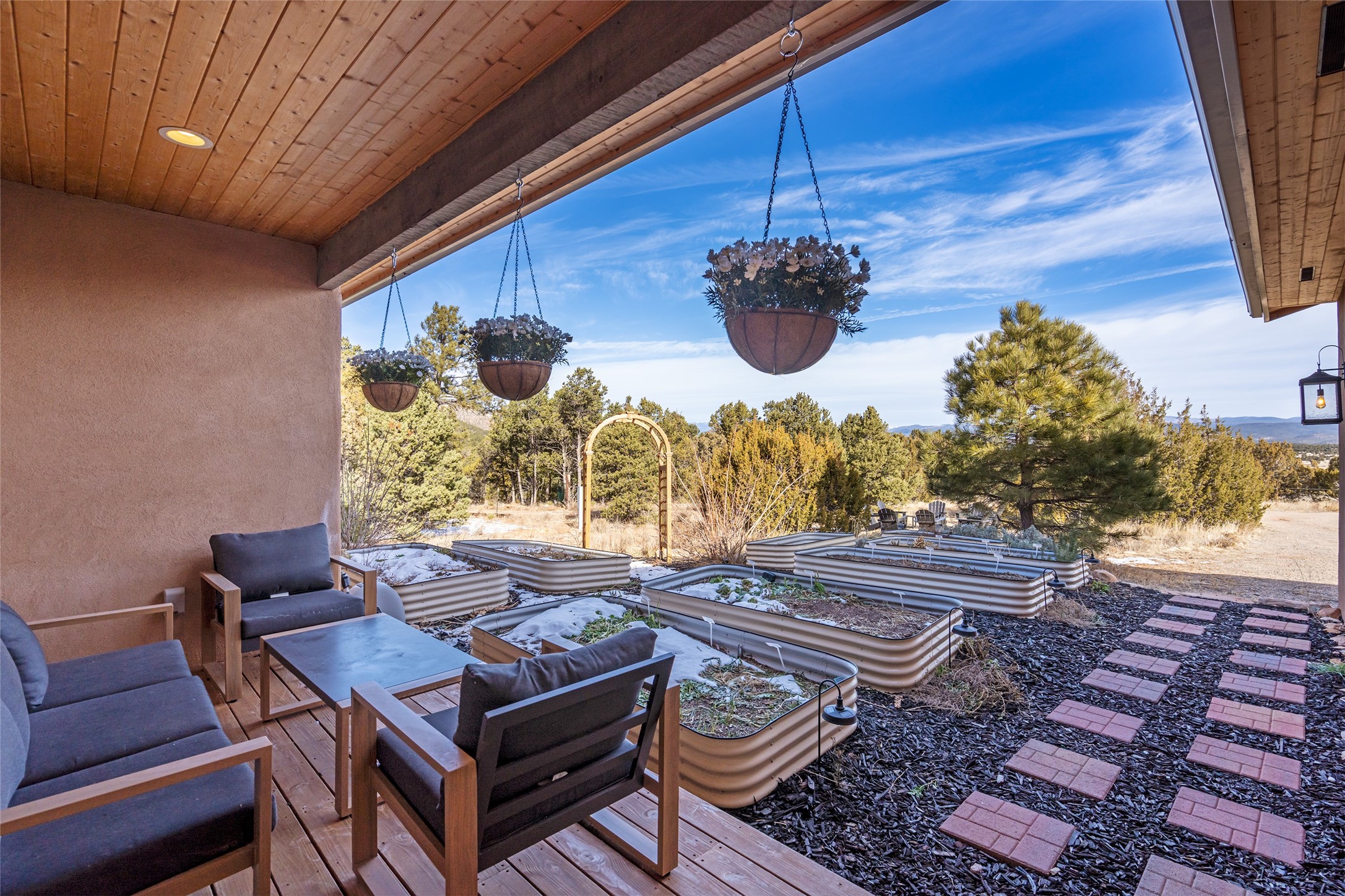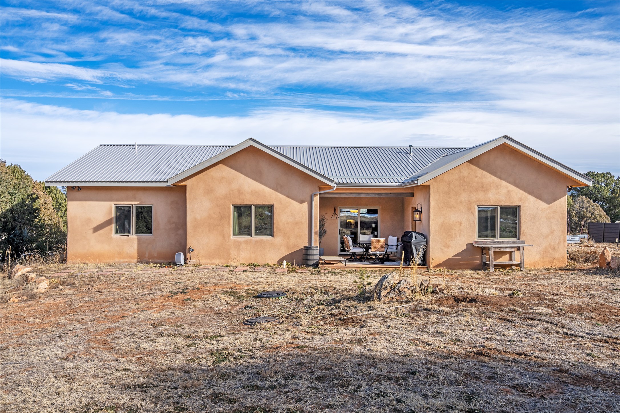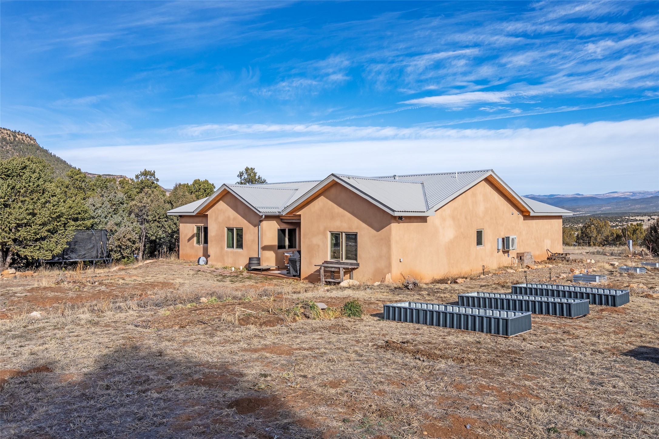 Located at the base of Rowe Mesa, this ranch-style home on nearly 4 Acres of flat useable land, offers wide skies, mountain views, and rural privacy all just 30 minutes from Santa Fe.Built in 2021, the custom residence provides exceptional comfort with a modern ranch style. A pitched propanel roof, classic stucco exterior, and warm natural finishes create an inviting, grounded feel throughout. Inside, the open-concept living and kitchen area is ideal for entertaining, with island seating, a pantry, and easy access to the attached two car garage. Brick floors, wood cabinetry, subway tile accents, and planked wood ceilings add texture and space, while three bedrooms and two baths provide flexible, comfortable living. Radiant heat and mini-splits ensure year-round comfort.Outside, the land truly shines. Mature fruit trees and thoughtfully tended garden beds support a slower, more self-sufficient lifestyle. Bordering the Santa Fe National Forest, the property offers direct access to nature, and unbounded recreation.With usable acreage and newer construction in a serene high-desert setting, this is a place to breathe deeply, spread out, and feel at home.