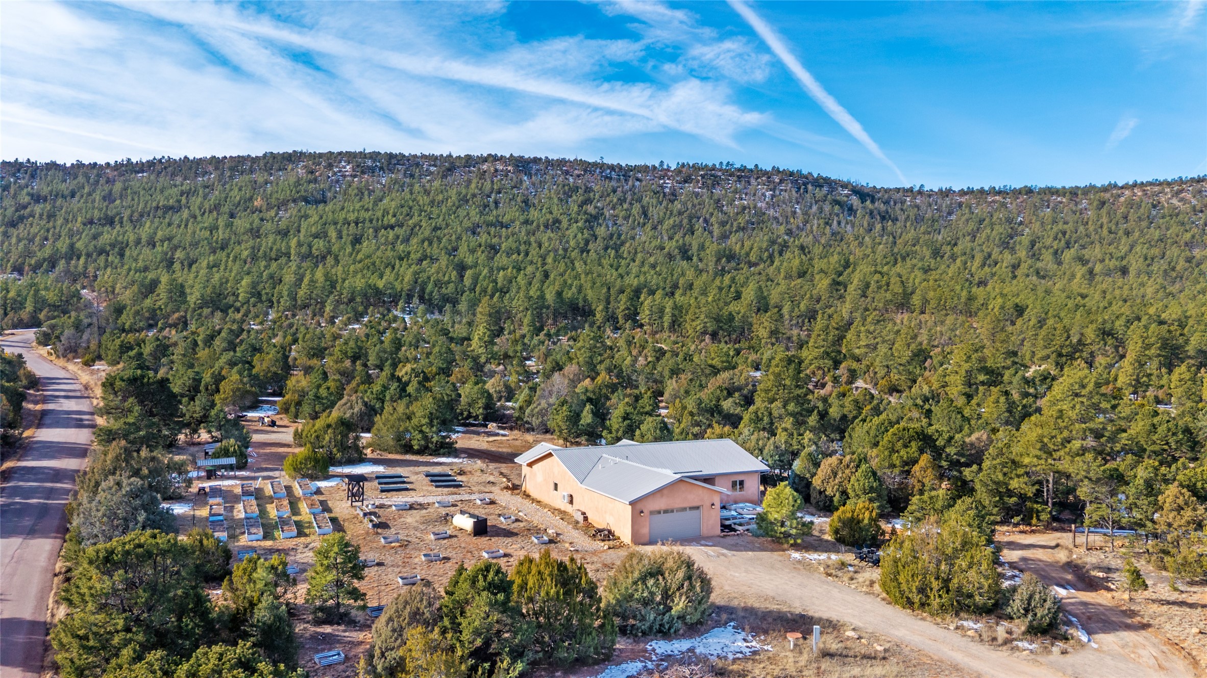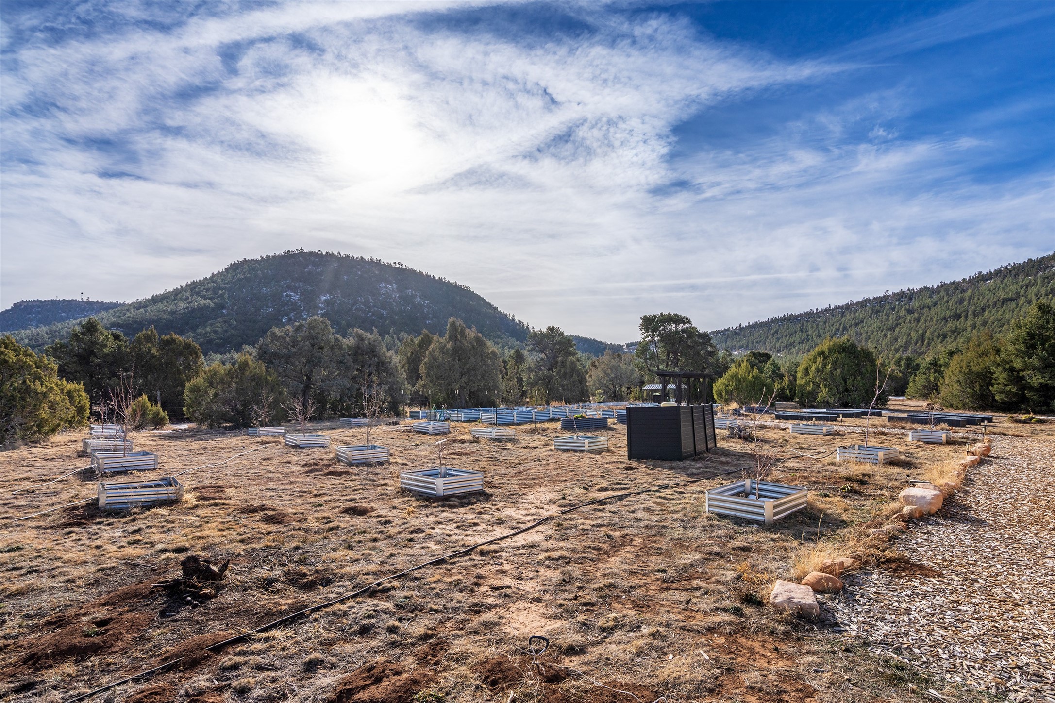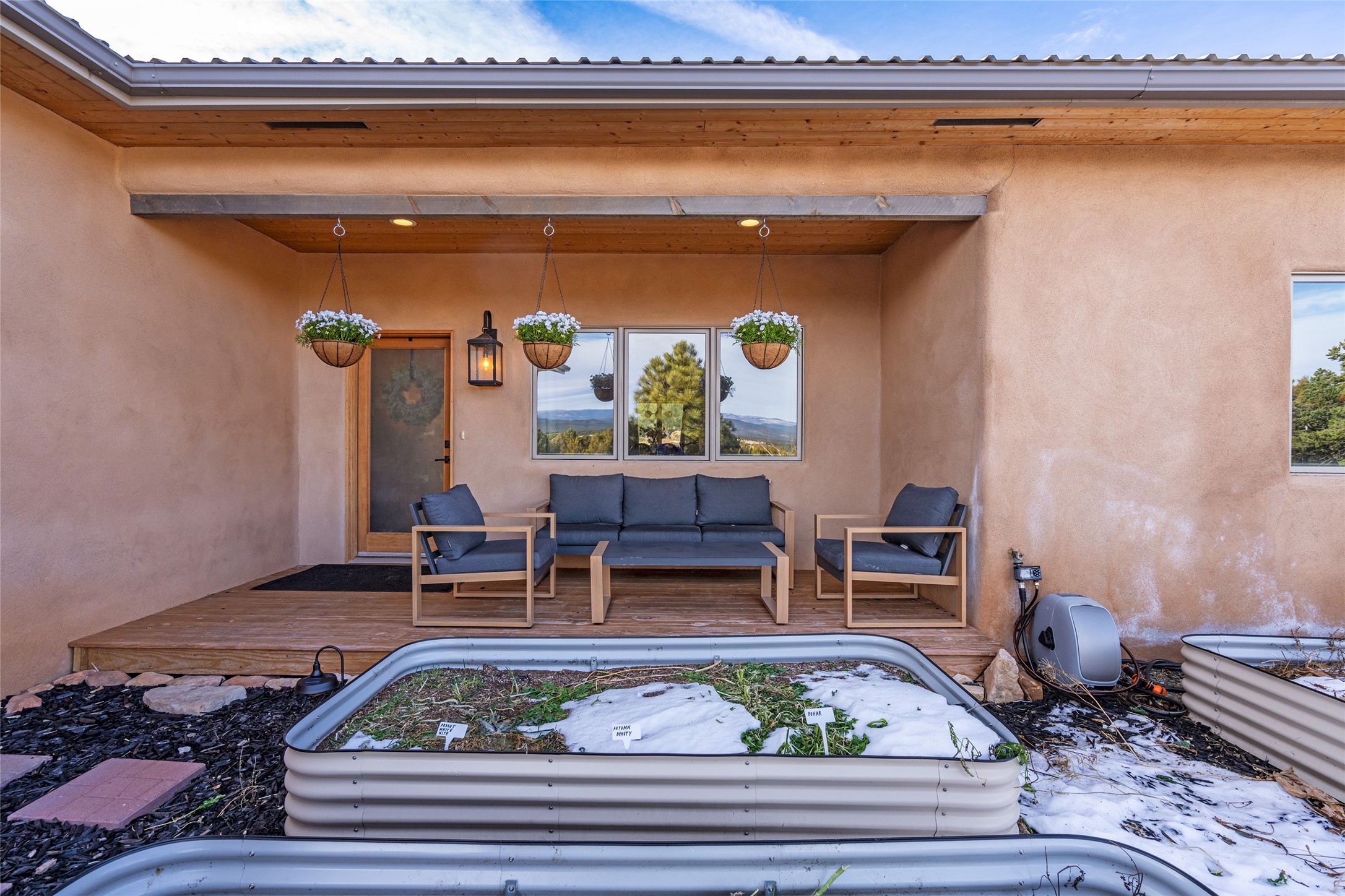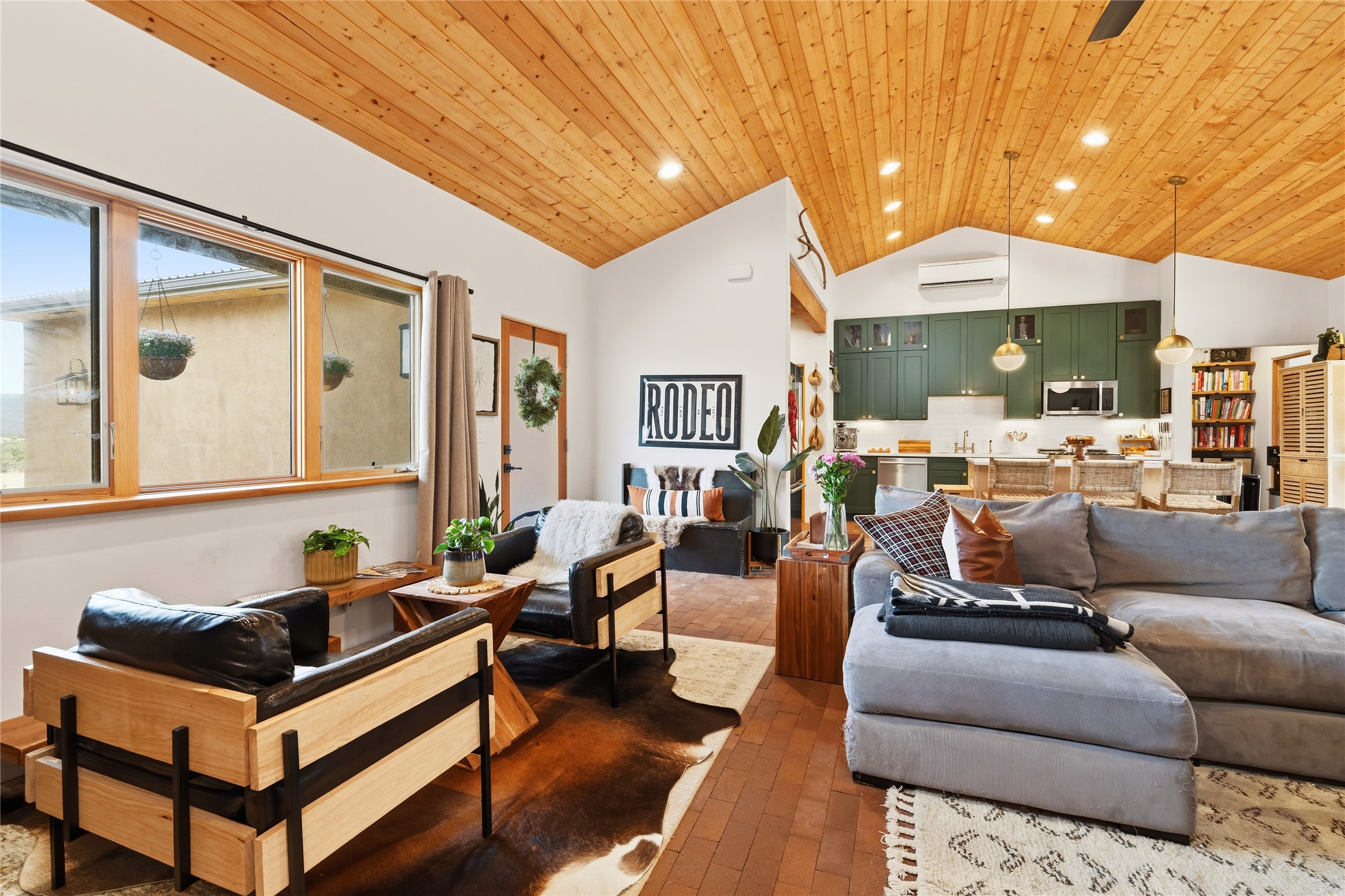 Located at the base of Rowe Mesa, this ranch-style home on nearly 4 Acres of flat useable land, offers wide skies, mountain views, and rural privacy all just 30 minutes from Santa Fe.Built in 2021, the custom residence provides exceptional comfort with a modern ranch style. A pitched propanel roof, classic stucco exterior, and warm natural finishes create an inviting, grounded feel throughout. Inside, the open-concept living and kitchen area is ideal for entertaining, with island seating, a pantry, and easy access to the attached two car garage. Brick floors, wood cabinetry, subway tile accents, and planked wood ceilings add texture and space, while three bedrooms and two baths provide flexible, comfortable living. Radiant heat and mini-splits ensure year-round comfort.Outside, the land truly shines. Mature fruit trees and thoughtfully tended garden beds support a slower, more self-sufficient lifestyle. Bordering the Santa Fe National Forest, the property offers direct access to nature, and unbounded recreation.With usable acreage and newer construction in a serene high-desert setting, this is a place to breathe deeply, spread out, and feel at home.