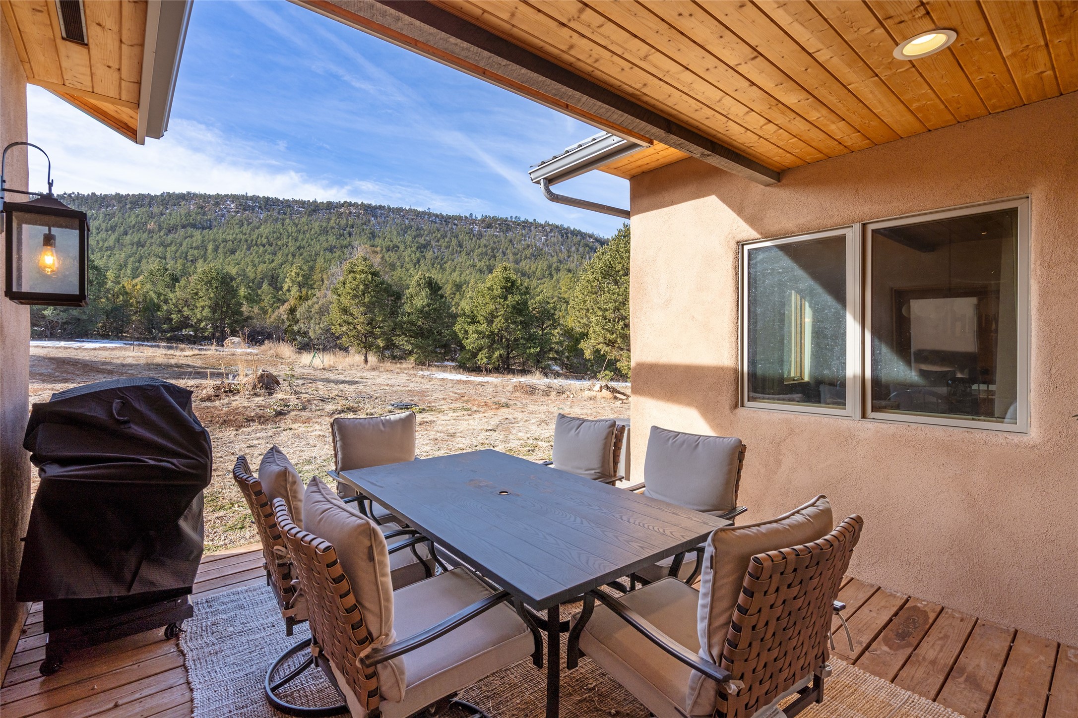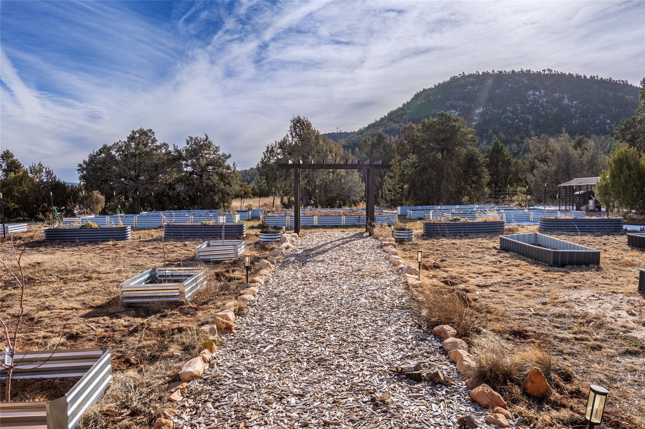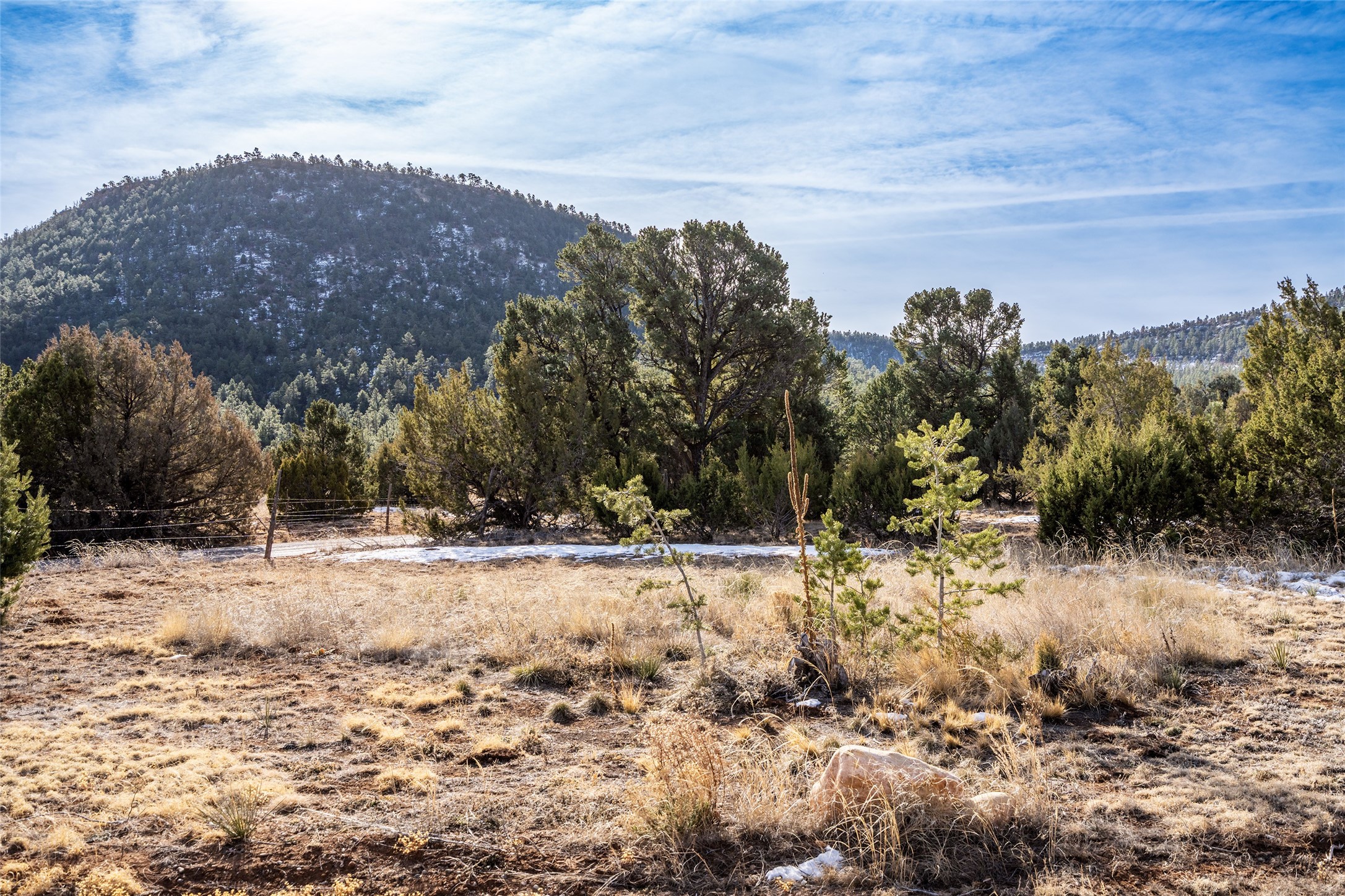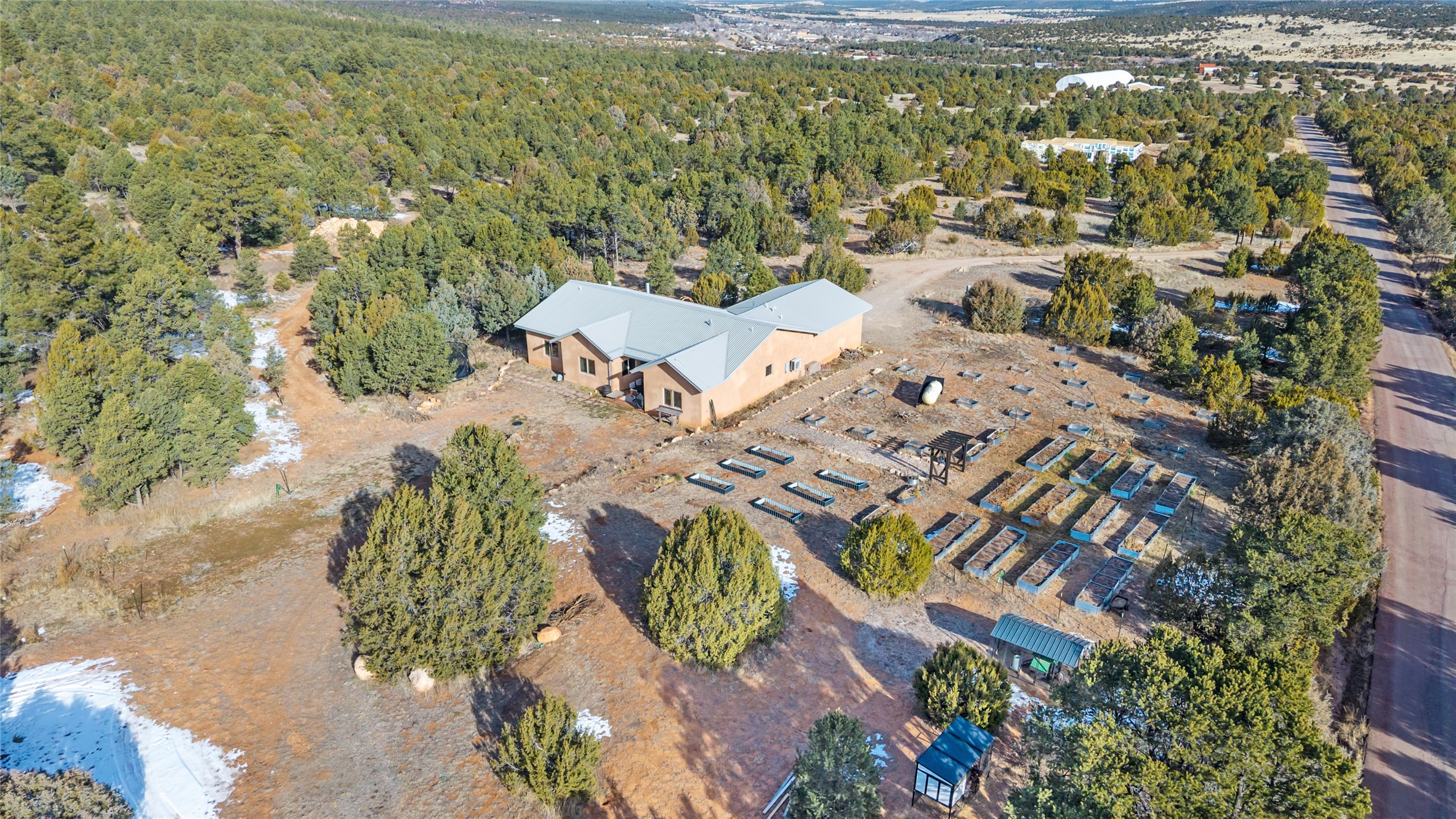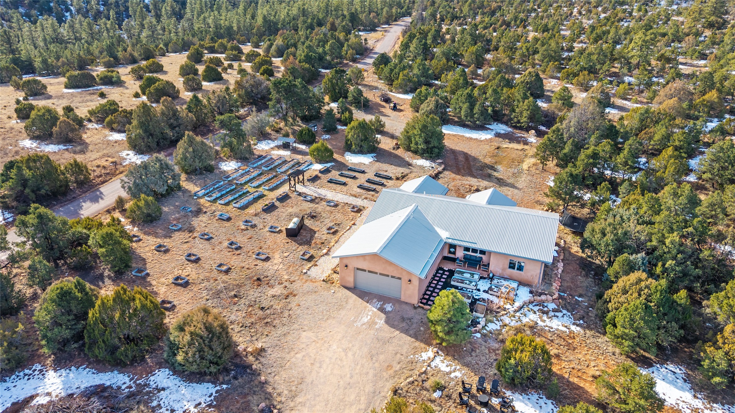 Located at the base of Rowe Mesa, this ranch-style home on nearly 4 Acres of flat useable land, offers wide skies, mountain views, and rural privacy all just 30 minutes from Santa Fe.Built in 2021, the custom residence provides exceptional comfort with a modern ranch style. A pitched propanel roof, classic stucco exterior, and warm natural finishes create an inviting, grounded feel throughout. Inside, the open-concept living and kitchen area is ideal for entertaining, with island seating, a pantry, and easy access to the attached two car garage. Brick floors, wood cabinetry, subway tile accents, and planked wood ceilings add texture and space, while three bedrooms and two baths provide flexible, comfortable living. Radiant heat and mini-splits ensure year-round comfort.Outside, the land truly shines. Mature fruit trees and thoughtfully tended garden beds support a slower, more self-sufficient lifestyle. Bordering the Santa Fe National Forest, the property offers direct access to nature, and unbounded recreation.With usable acreage and newer construction in a serene high-desert setting, this is a place to breathe deeply, spread out, and feel at home.