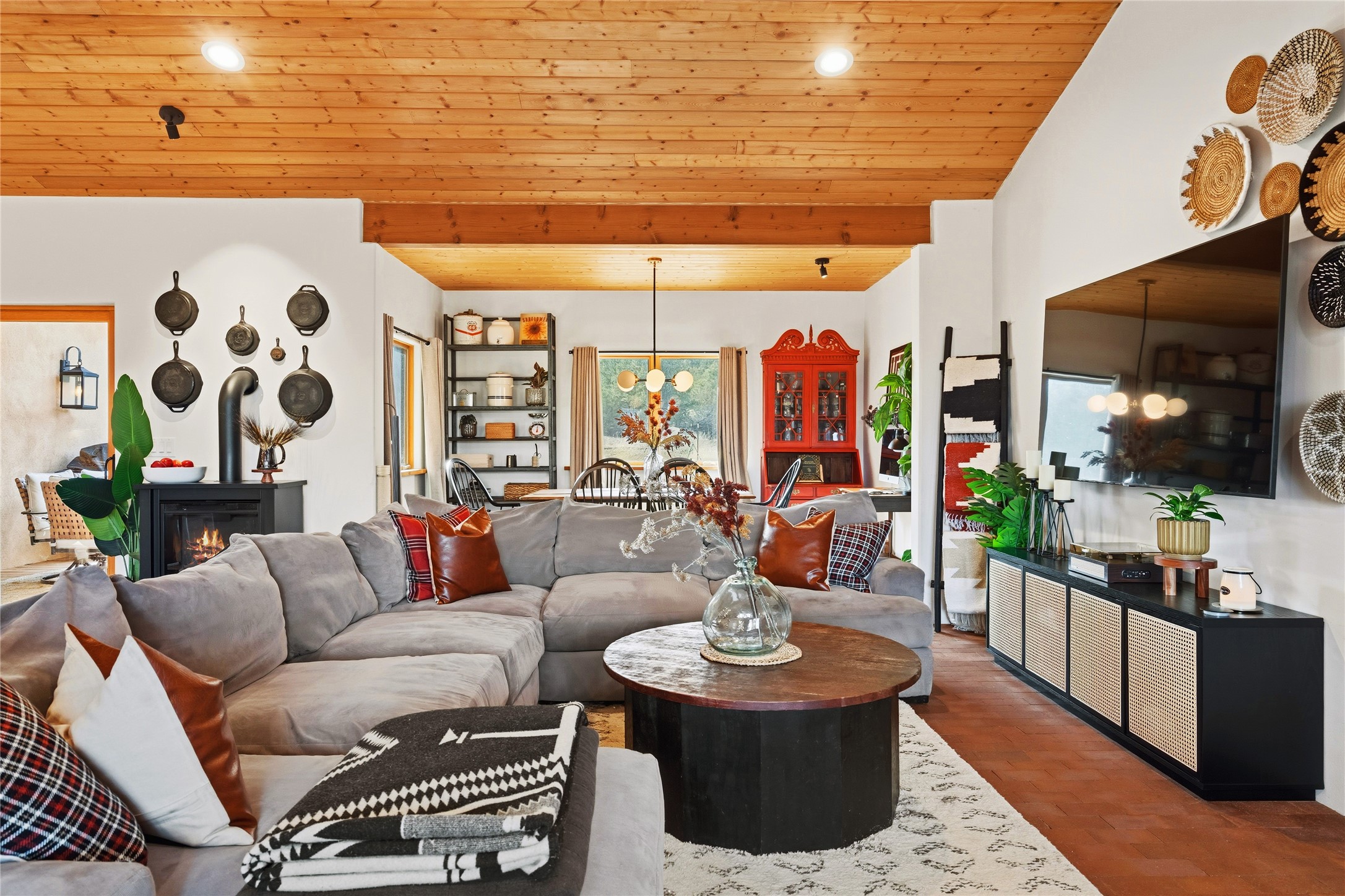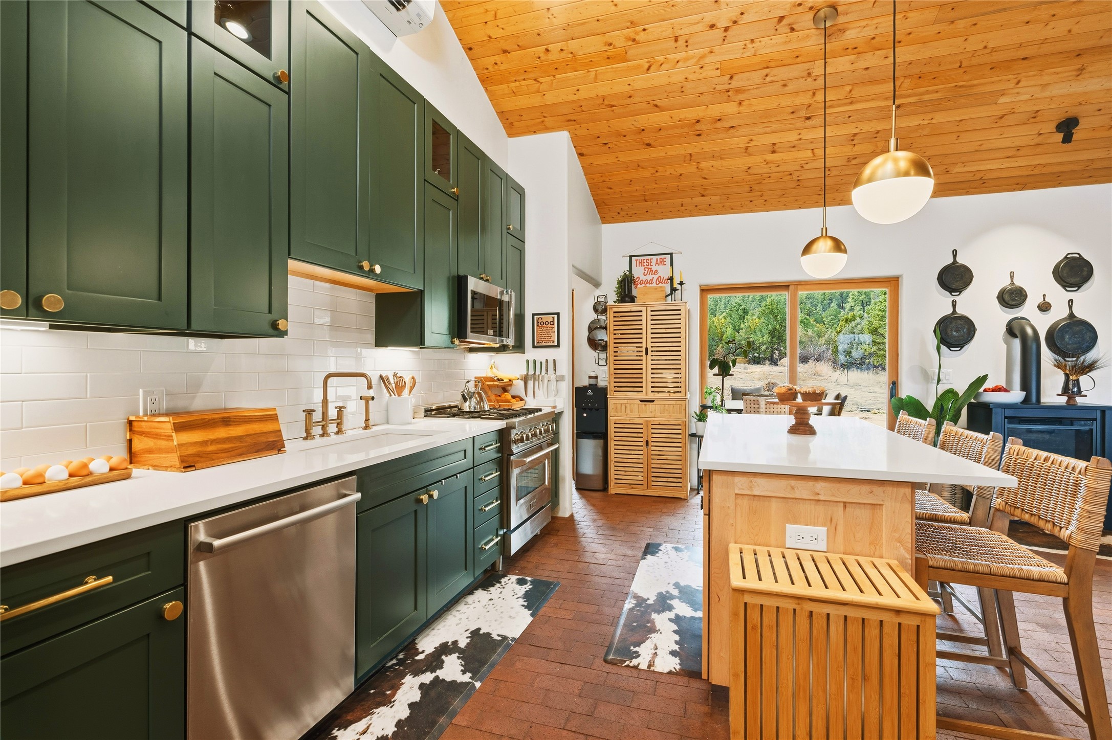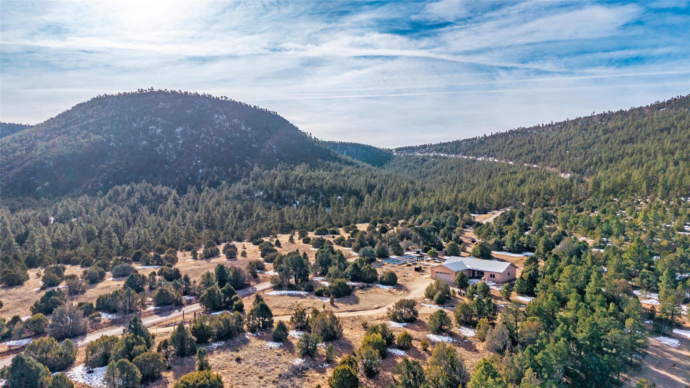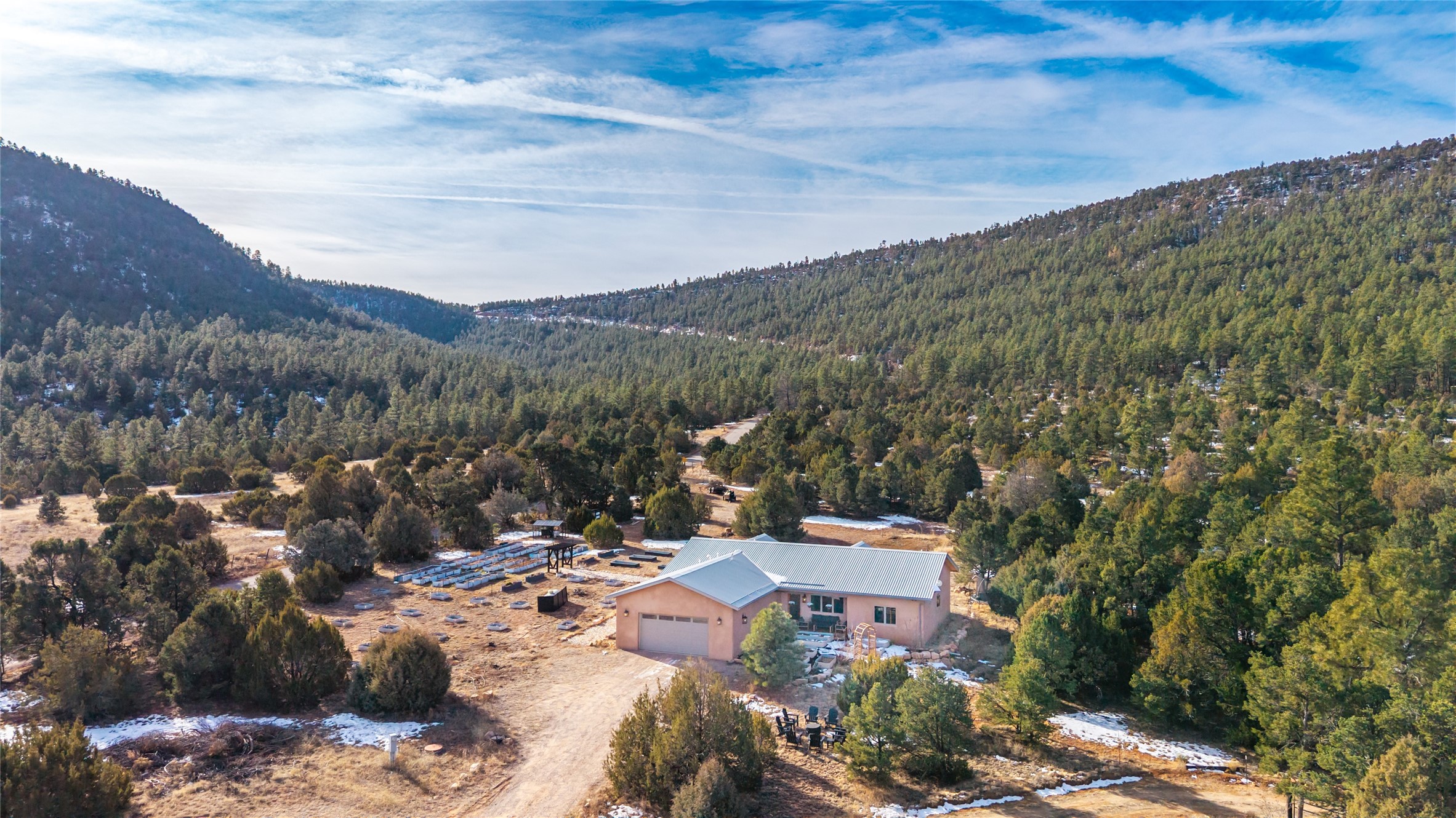 Located at the base of Rowe Mesa, this ranch-style home on nearly 4 Acres of flat useable land, offers wide skies, mountain views, and rural privacy all just 30 minutes from Santa Fe.Built in 2021, the custom residence provides exceptional comfort with a modern ranch style. A pitched propanel roof, classic stucco exterior, and warm natural finishes create an inviting, grounded feel throughout. Inside, the open-concept living and kitchen area is ideal for entertaining, with island seating, a pantry, and easy access to the attached two car garage. Brick floors, wood cabinetry, subway tile accents, and planked wood ceilings add texture and space, while three bedrooms and two baths provide flexible, comfortable living. Radiant heat and mini-splits ensure year-round comfort.Outside, the land truly shines. Mature fruit trees and thoughtfully tended garden beds support a slower, more self-sufficient lifestyle. Bordering the Santa Fe National Forest, the property offers direct access to nature, and unbounded recreation.With usable acreage and newer construction in a serene high-desert setting, this is a place to breathe deeply, spread out, and feel at home.