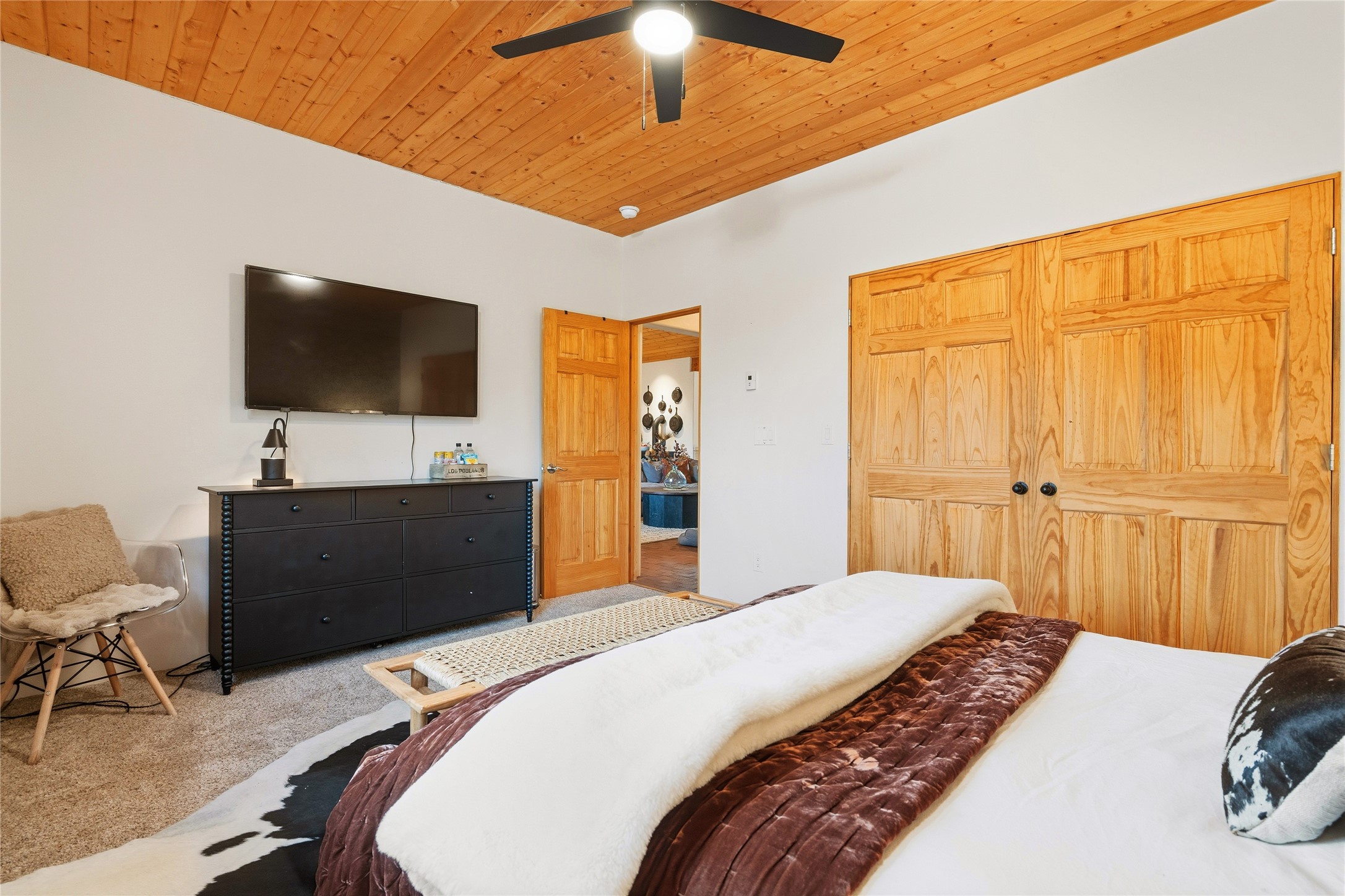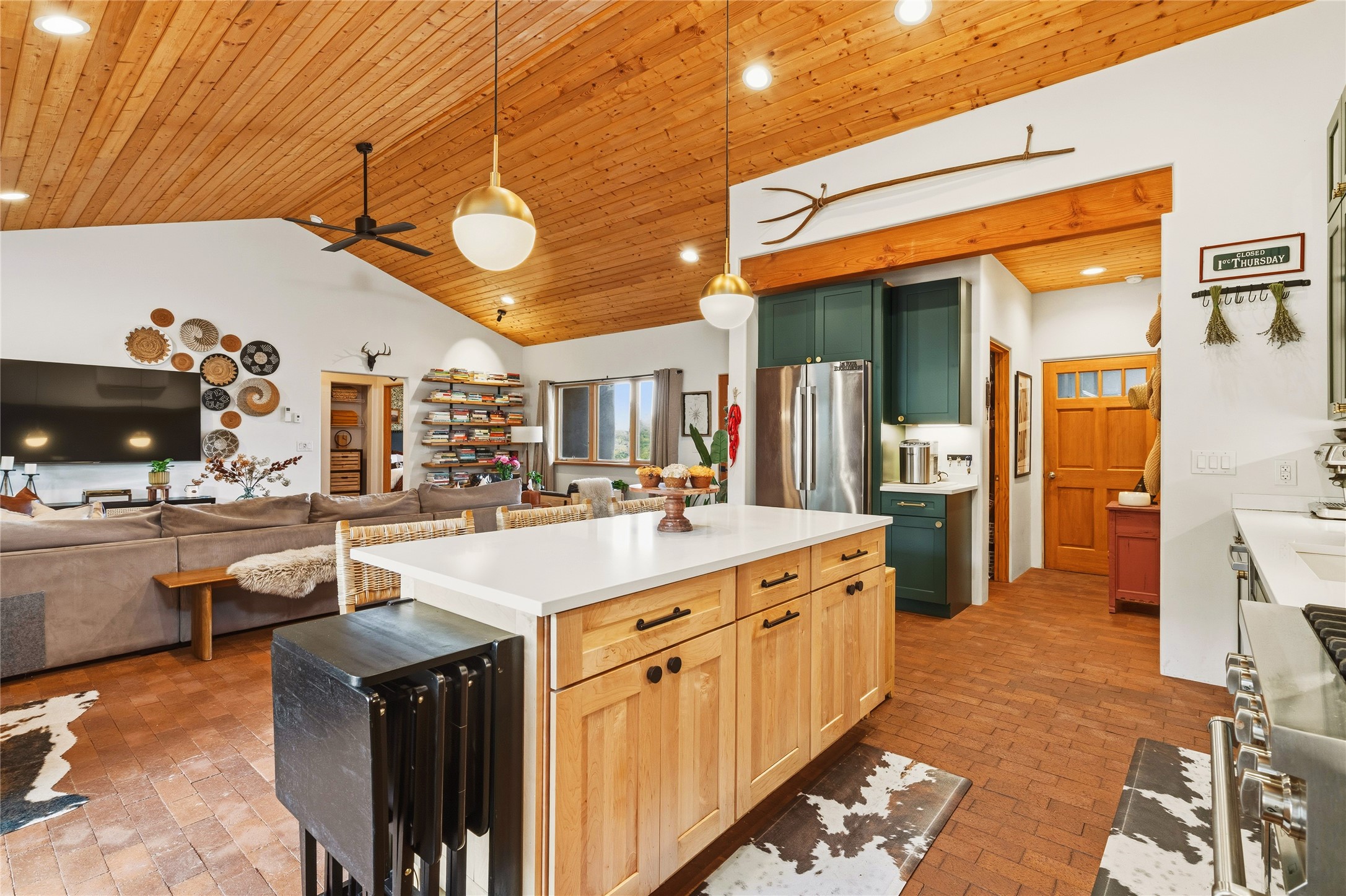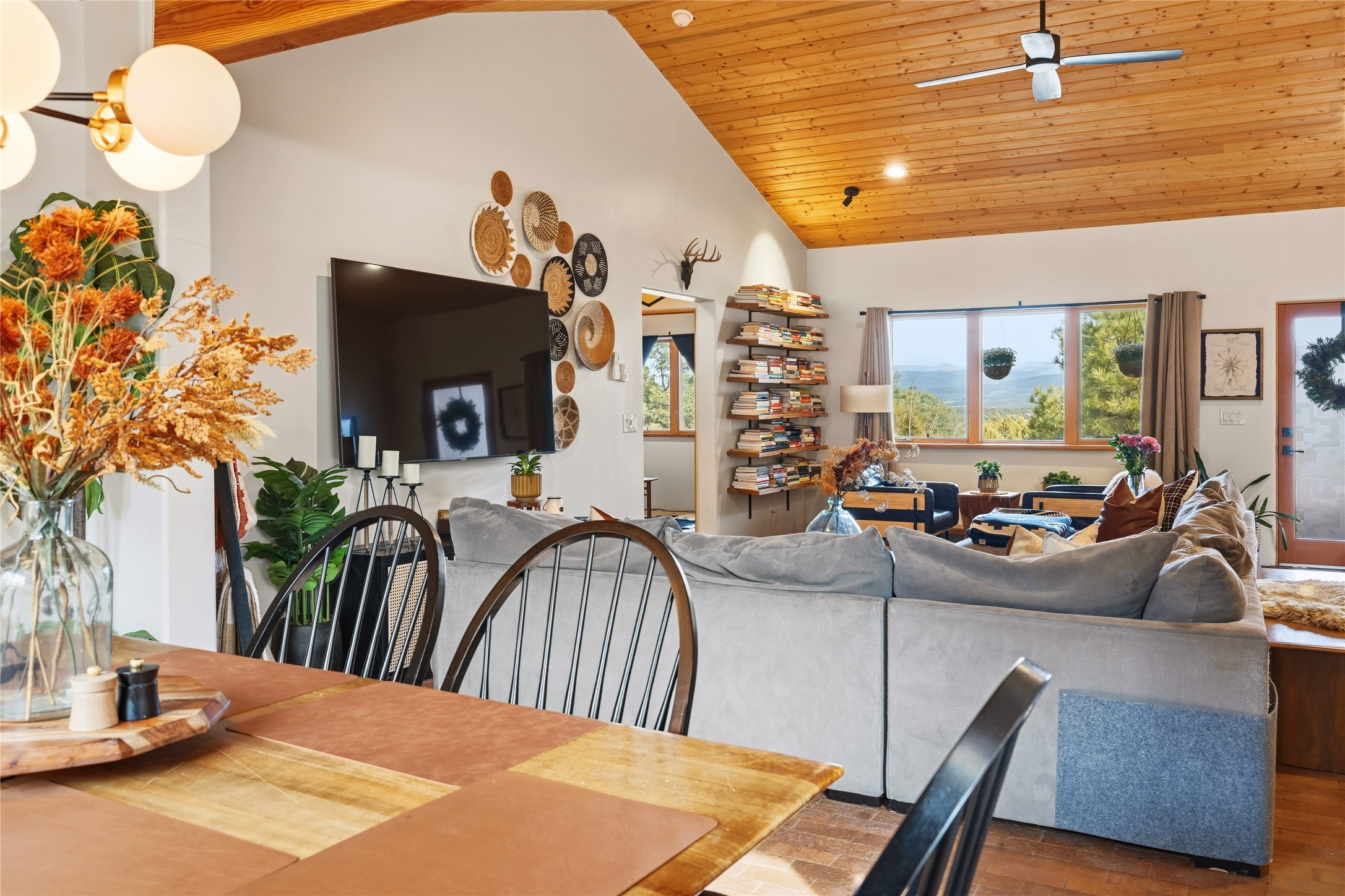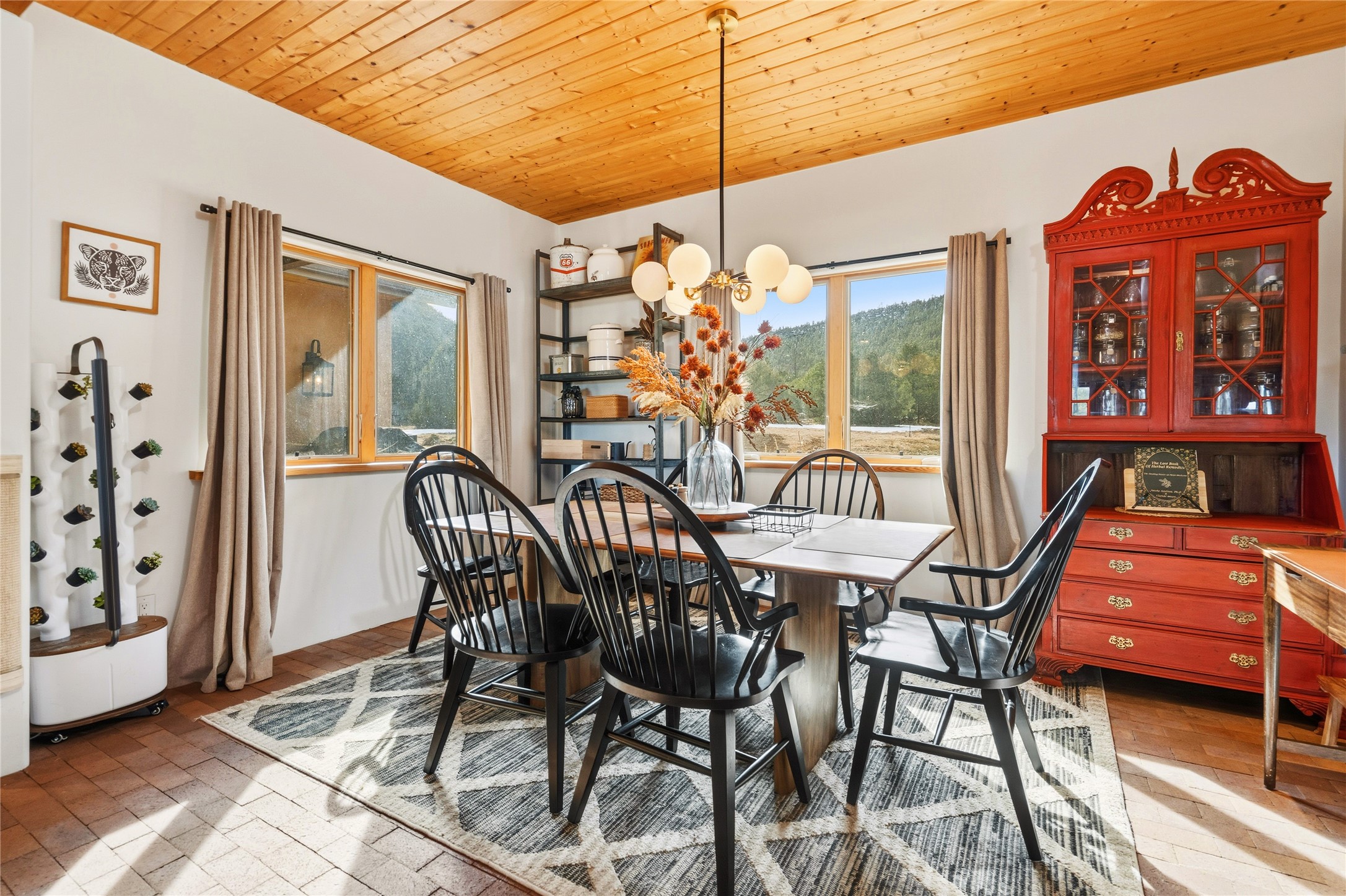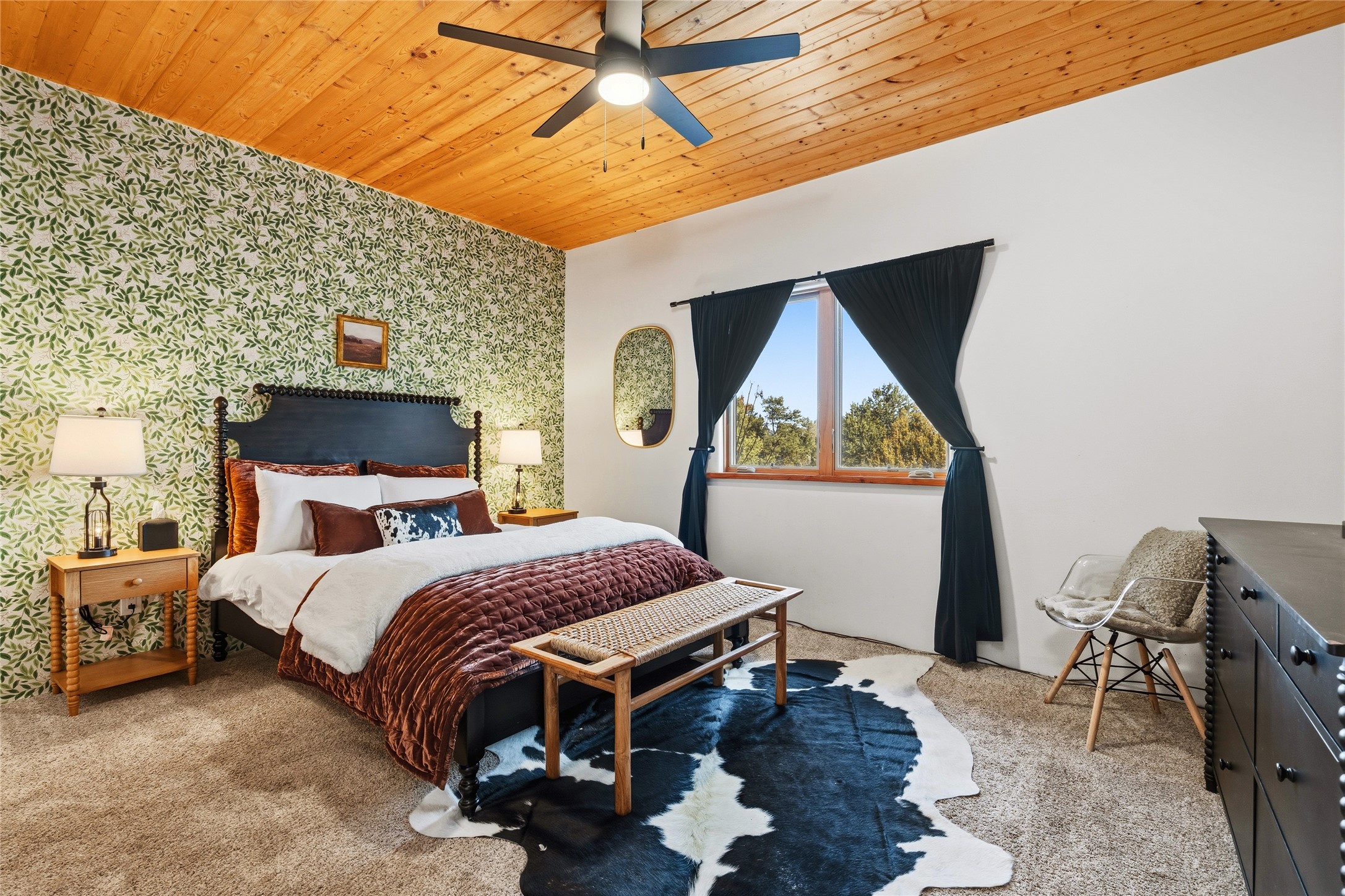 Located at the base of Rowe Mesa, this ranch-style home on nearly 4 Acres of flat useable land, offers wide skies, mountain views, and rural privacy all just 30 minutes from Santa Fe.Built in 2021, the custom residence provides exceptional comfort with a modern ranch style. A pitched propanel roof, classic stucco exterior, and warm natural finishes create an inviting, grounded feel throughout. Inside, the open-concept living and kitchen area is ideal for entertaining, with island seating, a pantry, and easy access to the attached two car garage. Brick floors, wood cabinetry, subway tile accents, and planked wood ceilings add texture and space, while three bedrooms and two baths provide flexible, comfortable living. Radiant heat and mini-splits ensure year-round comfort.Outside, the land truly shines. Mature fruit trees and thoughtfully tended garden beds support a slower, more self-sufficient lifestyle. Bordering the Santa Fe National Forest, the property offers direct access to nature, and unbounded recreation.With usable acreage and newer construction in a serene high-desert setting, this is a place to breathe deeply, spread out, and feel at home.