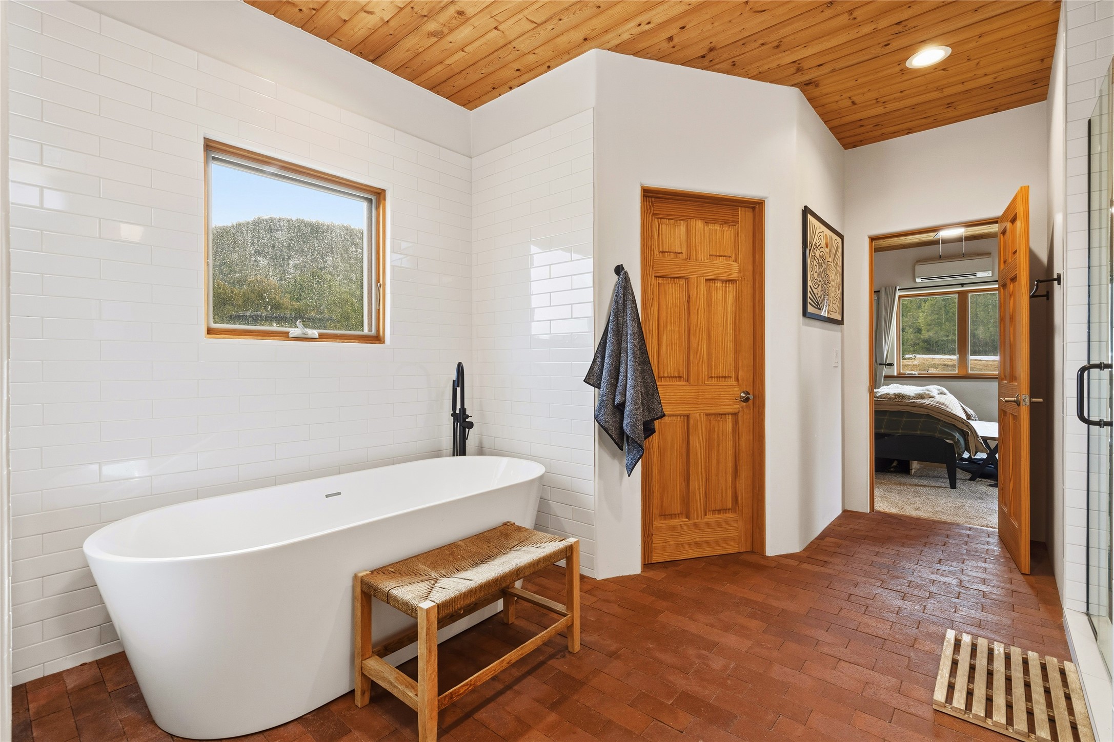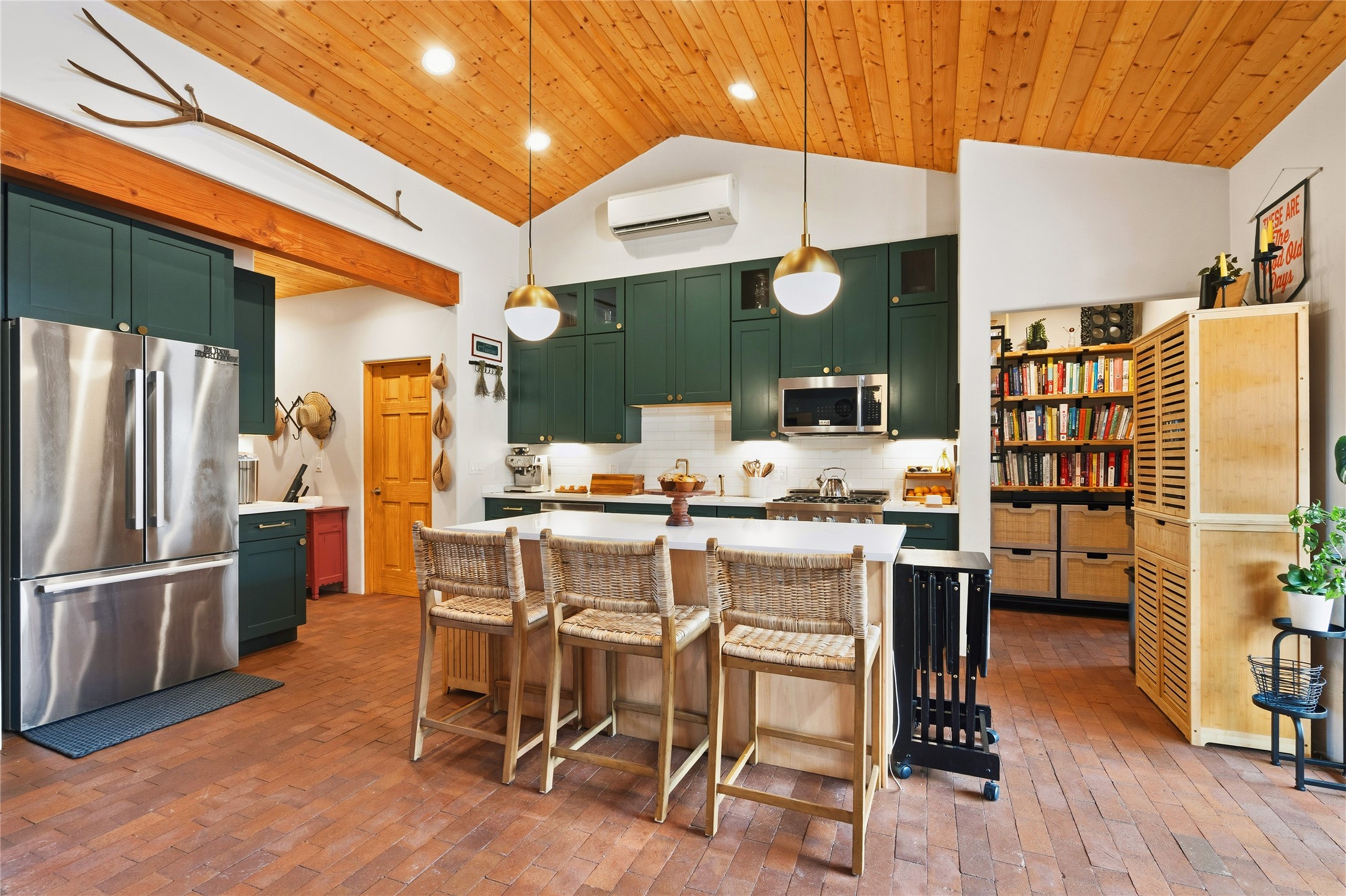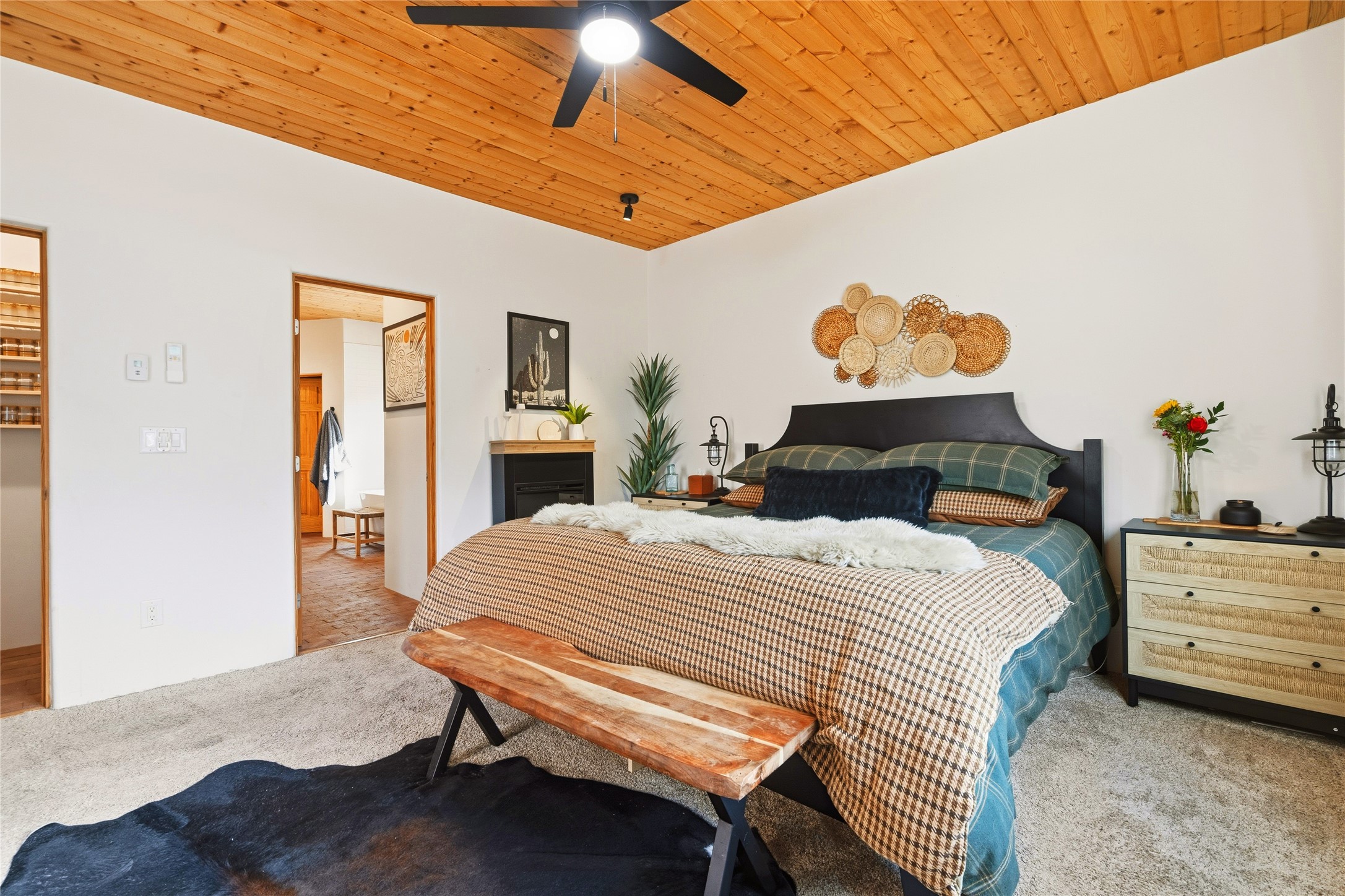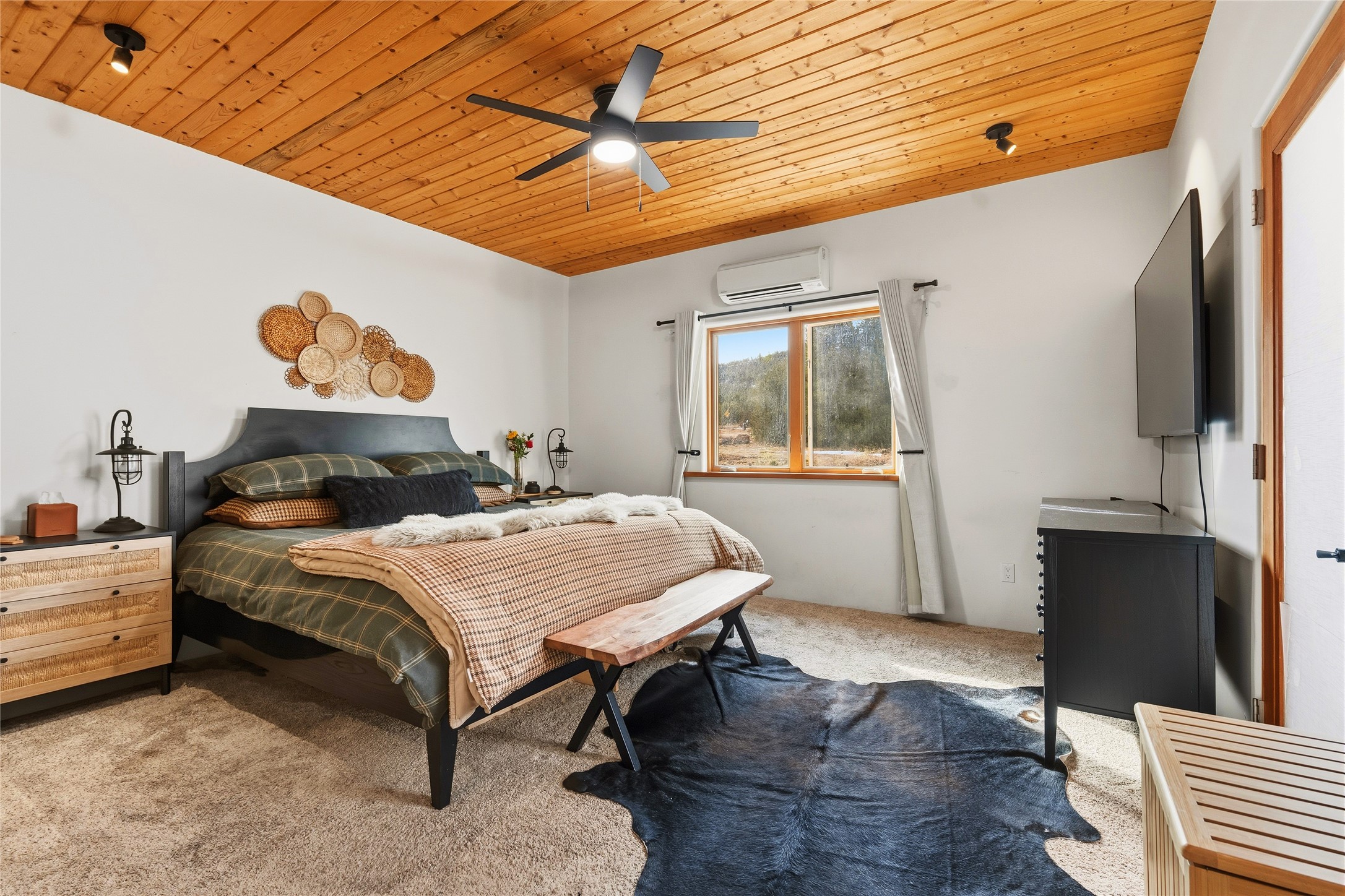 Located at the base of Rowe Mesa, this ranch-style home on nearly 4 Acres of flat useable land, offers wide skies, mountain views, and rural privacy all just 30 minutes from Santa Fe.Built in 2021, the custom residence provides exceptional comfort with a modern ranch style. A pitched propanel roof, classic stucco exterior, and warm natural finishes create an inviting, grounded feel throughout. Inside, the open-concept living and kitchen area is ideal for entertaining, with island seating, a pantry, and easy access to the attached two car garage. Brick floors, wood cabinetry, subway tile accents, and planked wood ceilings add texture and space, while three bedrooms and two baths provide flexible, comfortable living. Radiant heat and mini-splits ensure year-round comfort.Outside, the land truly shines. Mature fruit trees and thoughtfully tended garden beds support a slower, more self-sufficient lifestyle. Bordering the Santa Fe National Forest, the property offers direct access to nature, and unbounded recreation.With usable acreage and newer construction in a serene high-desert setting, this is a place to breathe deeply, spread out, and feel at home.