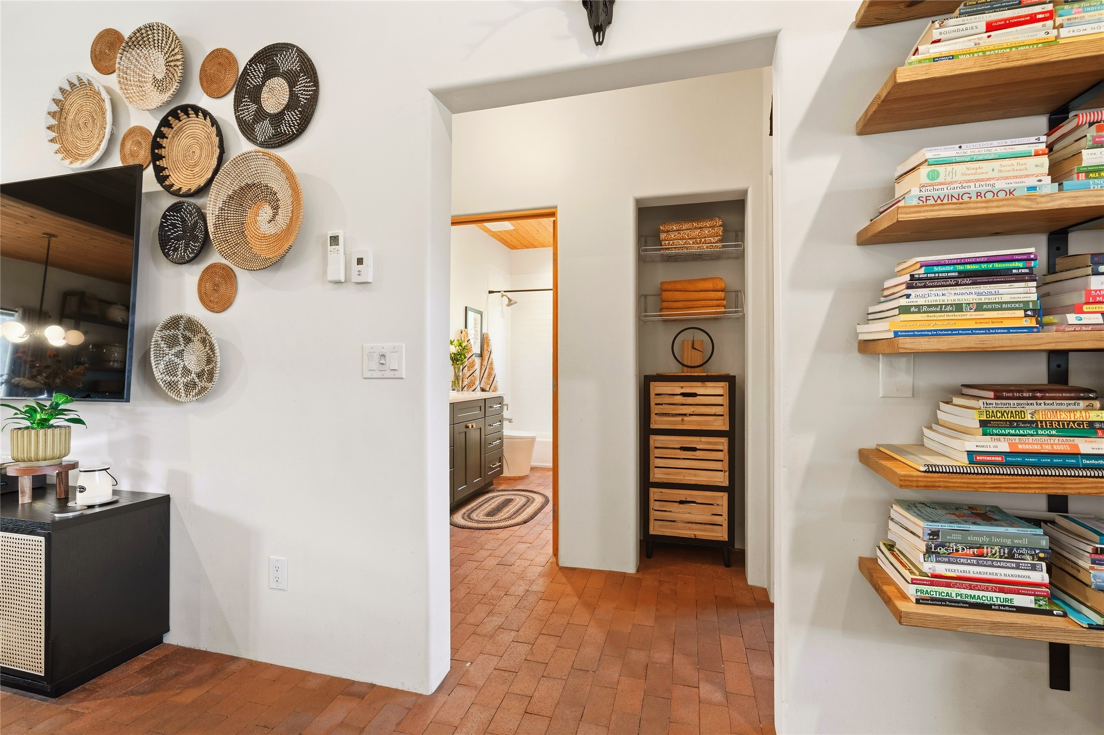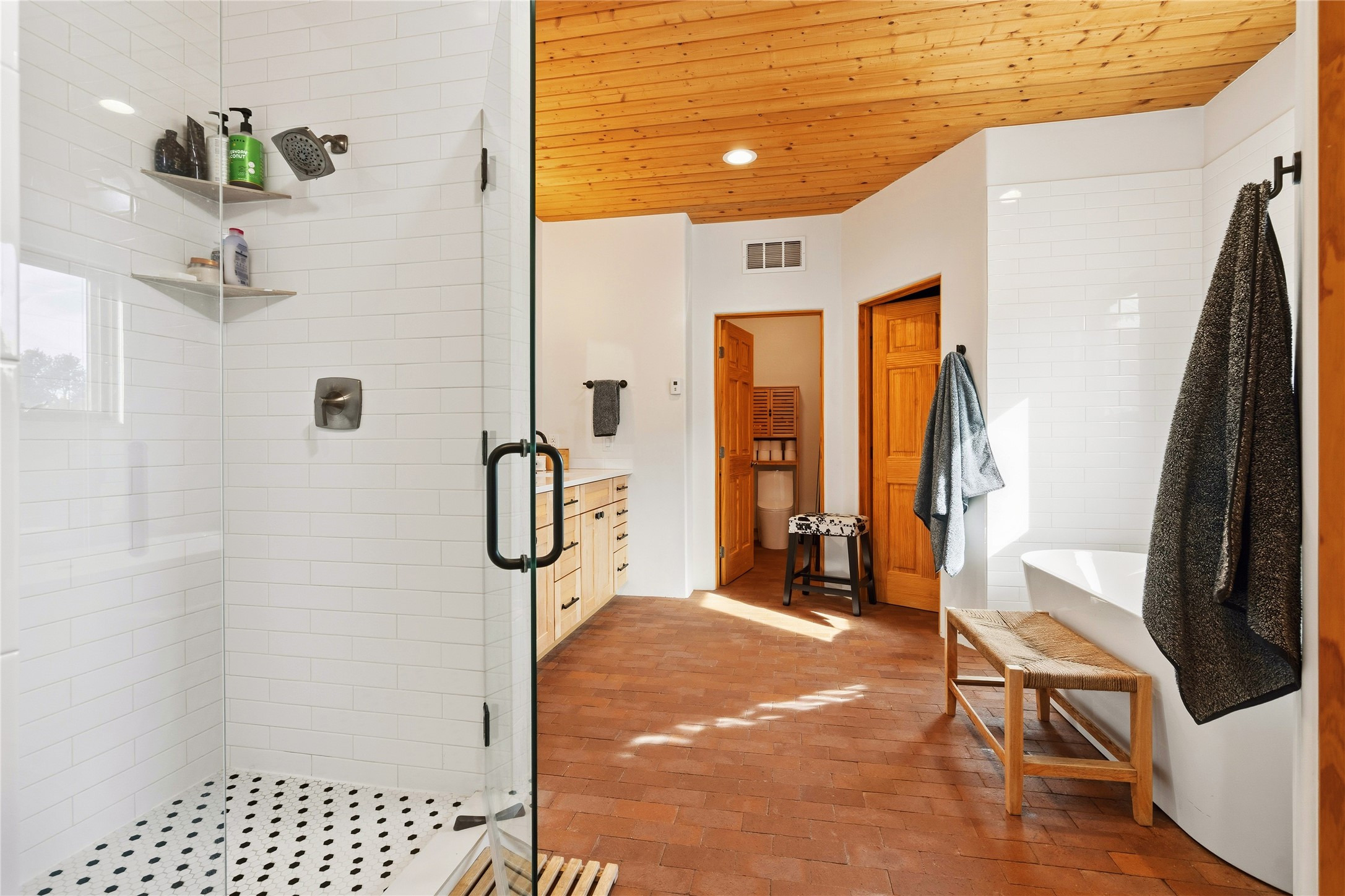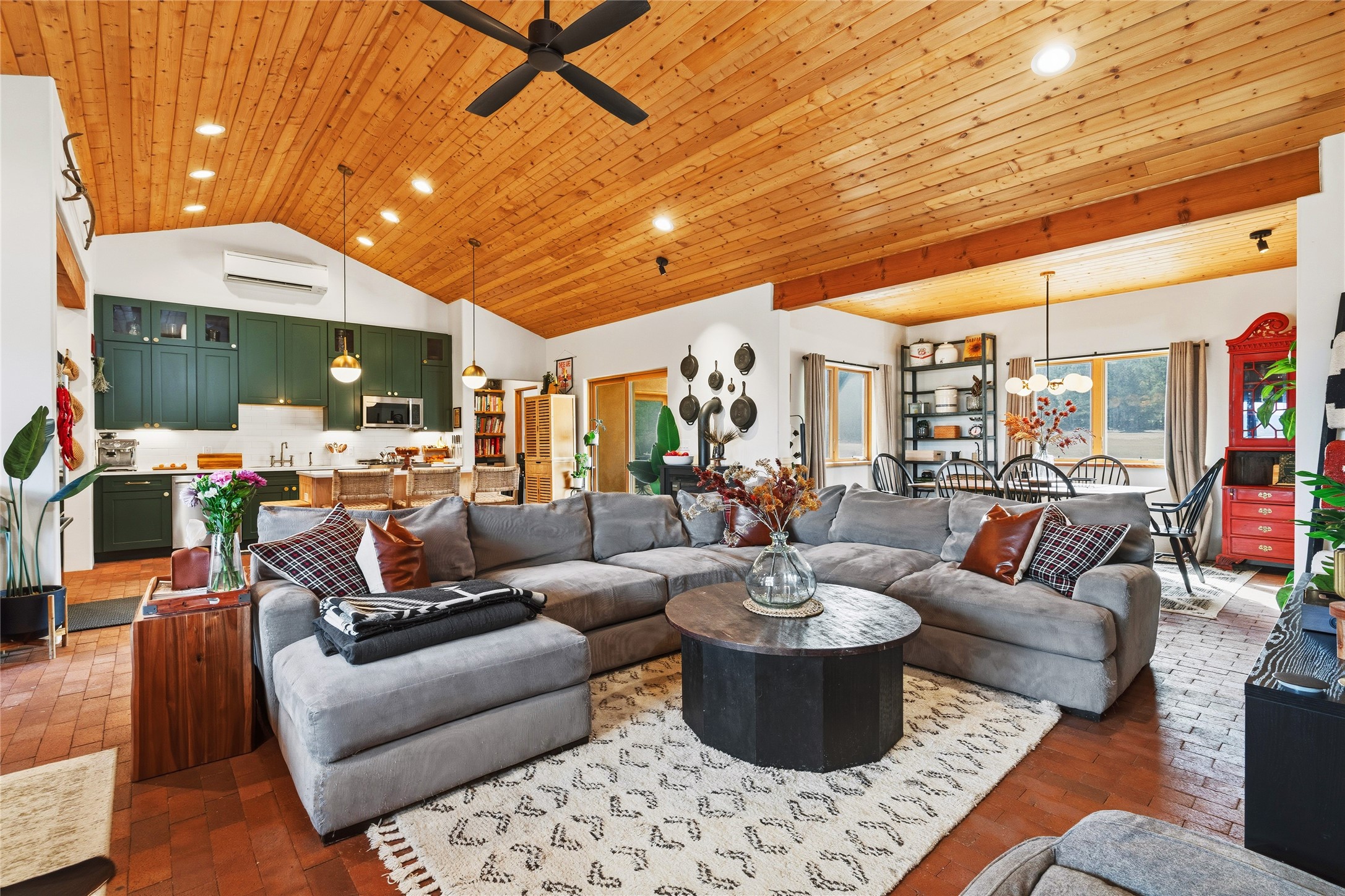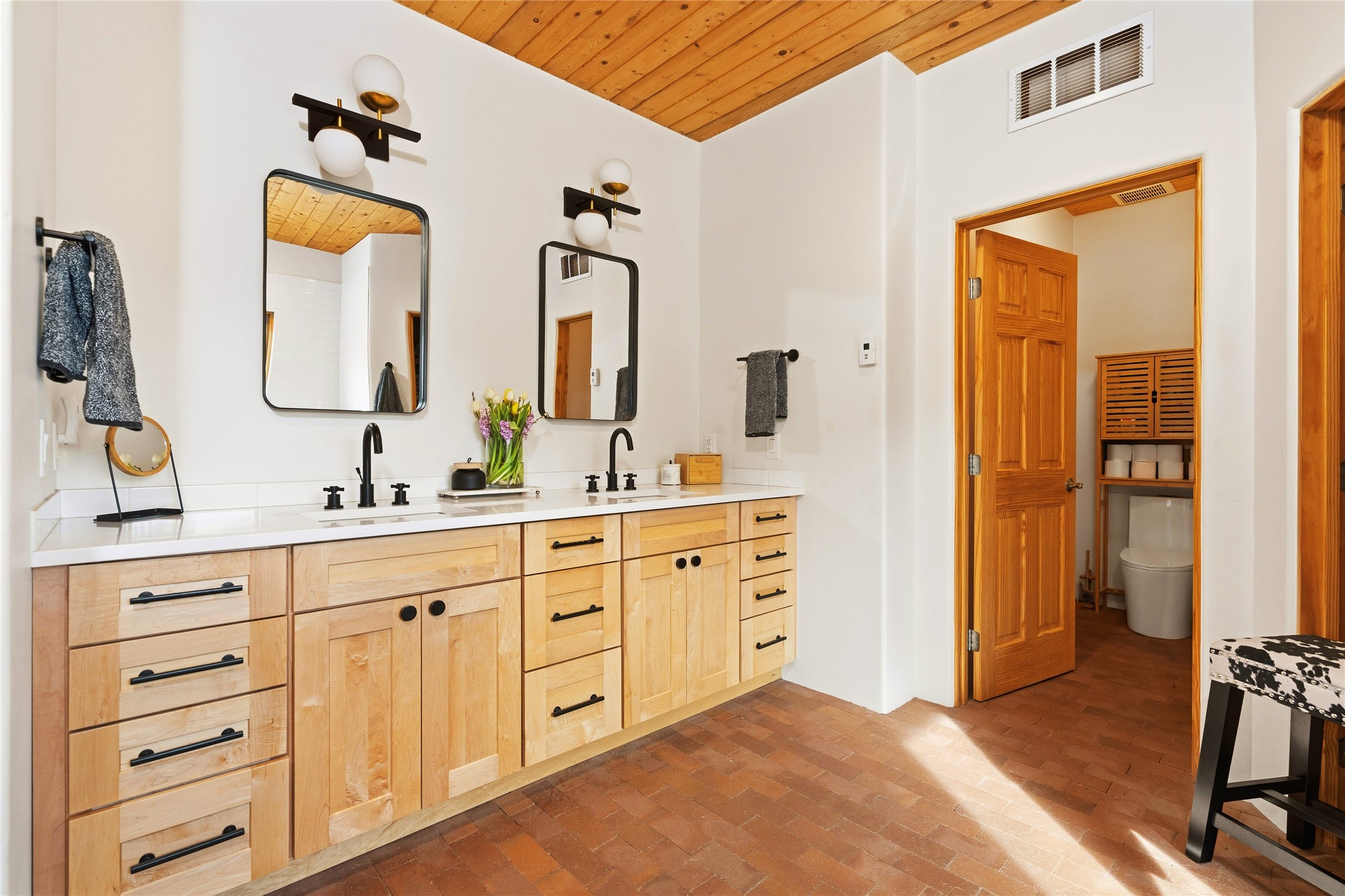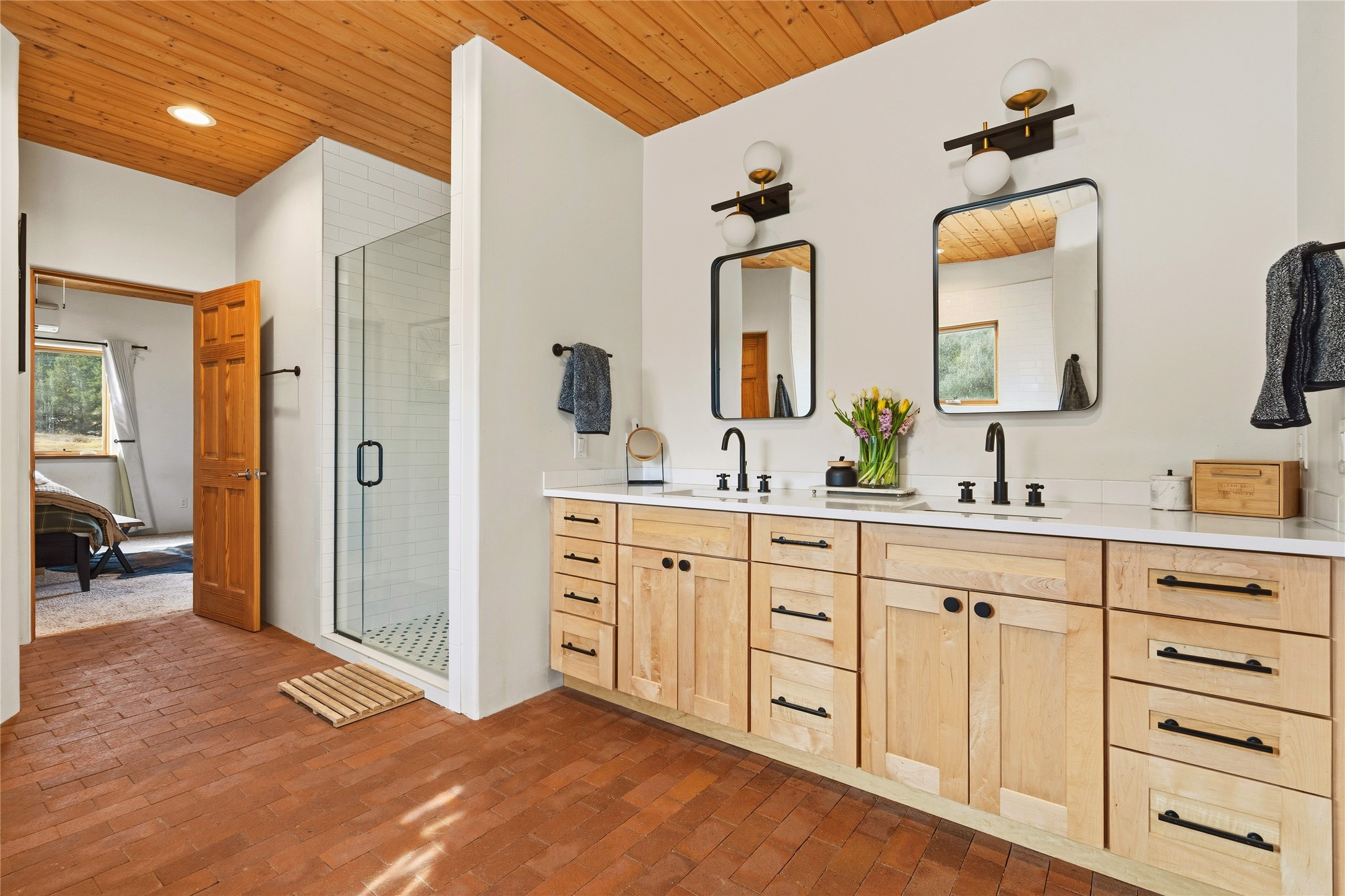 Located at the base of Rowe Mesa, this ranch-style home on nearly 4 Acres of flat useable land, offers wide skies, mountain views, and rural privacy all just 30 minutes from Santa Fe.Built in 2021, the custom residence provides exceptional comfort with a modern ranch style. A pitched propanel roof, classic stucco exterior, and warm natural finishes create an inviting, grounded feel throughout. Inside, the open-concept living and kitchen area is ideal for entertaining, with island seating, a pantry, and easy access to the attached two car garage. Brick floors, wood cabinetry, subway tile accents, and planked wood ceilings add texture and space, while three bedrooms and two baths provide flexible, comfortable living. Radiant heat and mini-splits ensure year-round comfort.Outside, the land truly shines. Mature fruit trees and thoughtfully tended garden beds support a slower, more self-sufficient lifestyle. Bordering the Santa Fe National Forest, the property offers direct access to nature, and unbounded recreation.With usable acreage and newer construction in a serene high-desert setting, this is a place to breathe deeply, spread out, and feel at home.