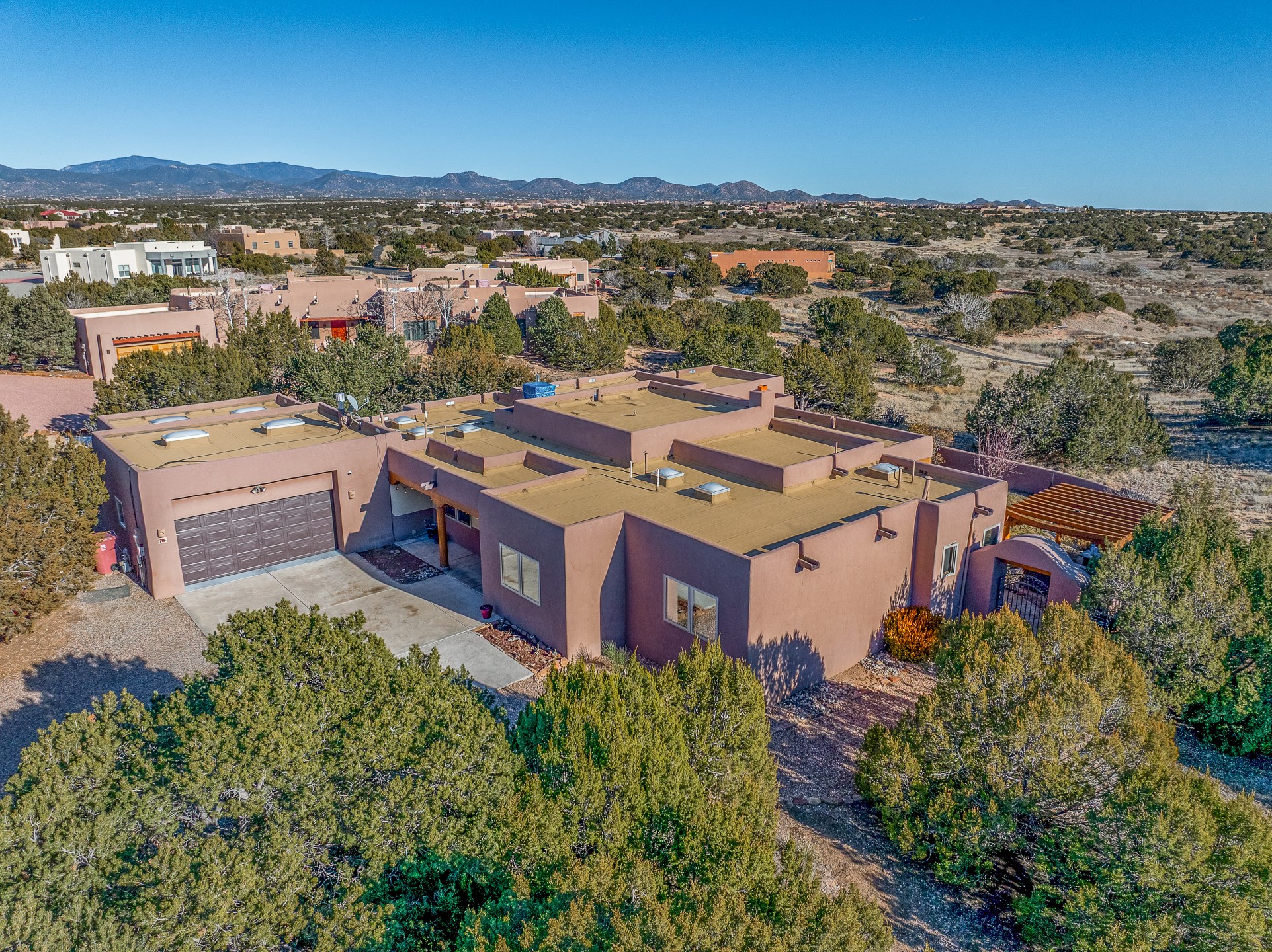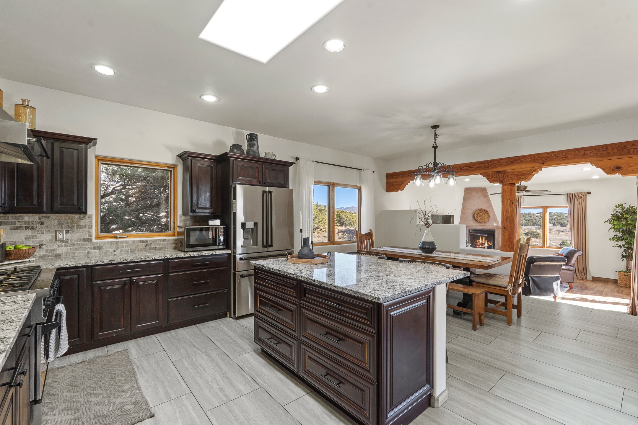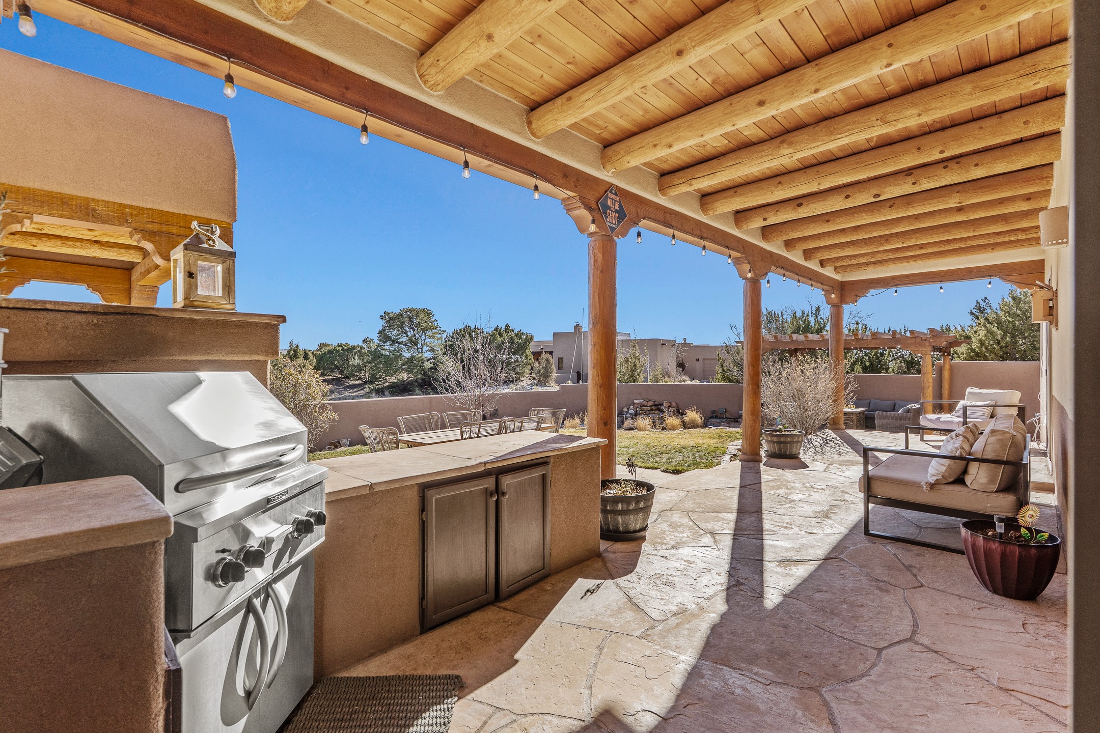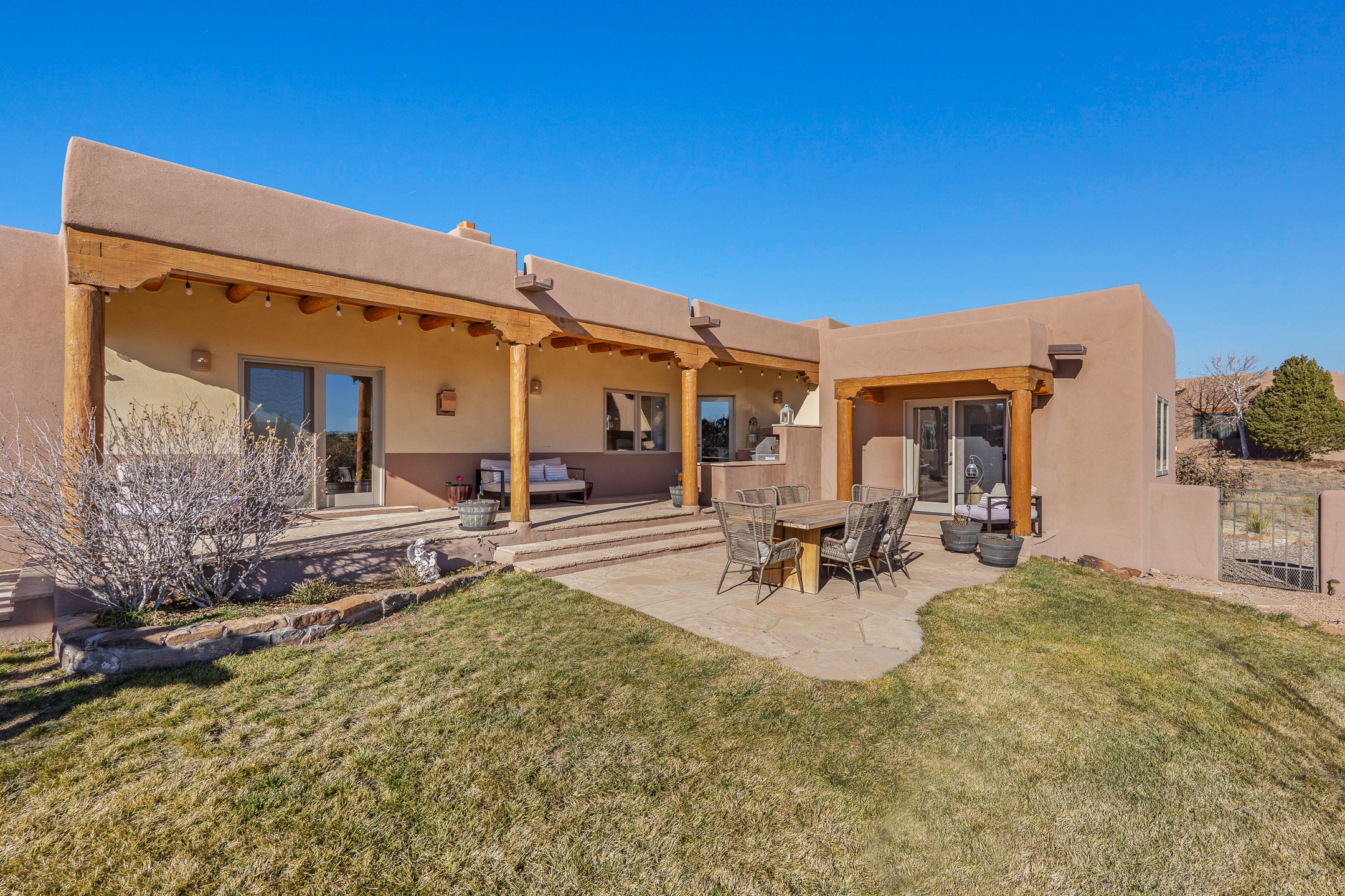 A rare opportunity in Rancho Viejo! This beautifully renovated single-level 4-bedroom, 3-bathroom home was built in 2002 and sits on 1.2 acres with sweeping views of the Sangre de Cristo foothills. Thoughtfully updated from top to bottom, every surface has been touched with care and high-quality craftsmanship.The open-concept floor plan offers effortless flow and versatility. A spacious living room with beautiful viga ceilings and a wood-burning kiva fireplace provides the perfect setting for entertaining. The fully reimagined kitchen features stone countertops, brand-new stainless steel appliances, and two islands--each with bar seating--while the adjacent dining area connects seamlessly to a cozy den with a gas fireplace, creating a warm and inviting gathering space.Step into the backyard and discover a private oasis: a large koi pond with water feature, covered portal with built-in grill, and a separate pergola with a gas firepit--perfect for relaxing or stargazing. The Rancho Viejo trail system is directly accessible from the yard.The primary suite enjoys stunning foothill views, a gas fireplace, direct access to the backyard portal, and the soothing sound of the water feature. The spa-like primary bath includes double vanities, a large walk-in shower, natural light, and garden views. Two guest bedrooms share a full bath in the South wing, while a third guest suite--located privately at the North end--shares a full bath that also serves as the guest powder room. A flexible bonus room near the living area functions beautifully as an office, hobby room, or reading nook.The show-stopper garage can be a 2-car garage with a very large storage area/workshop or a 3-car garage with storage/workshop! On the market for the first time, this home was custom built in 2002 for the current owners, who have lovingly maintained and recently renovated it with exceptional care. This is a rare find and a true Rancho Viejo treasure.