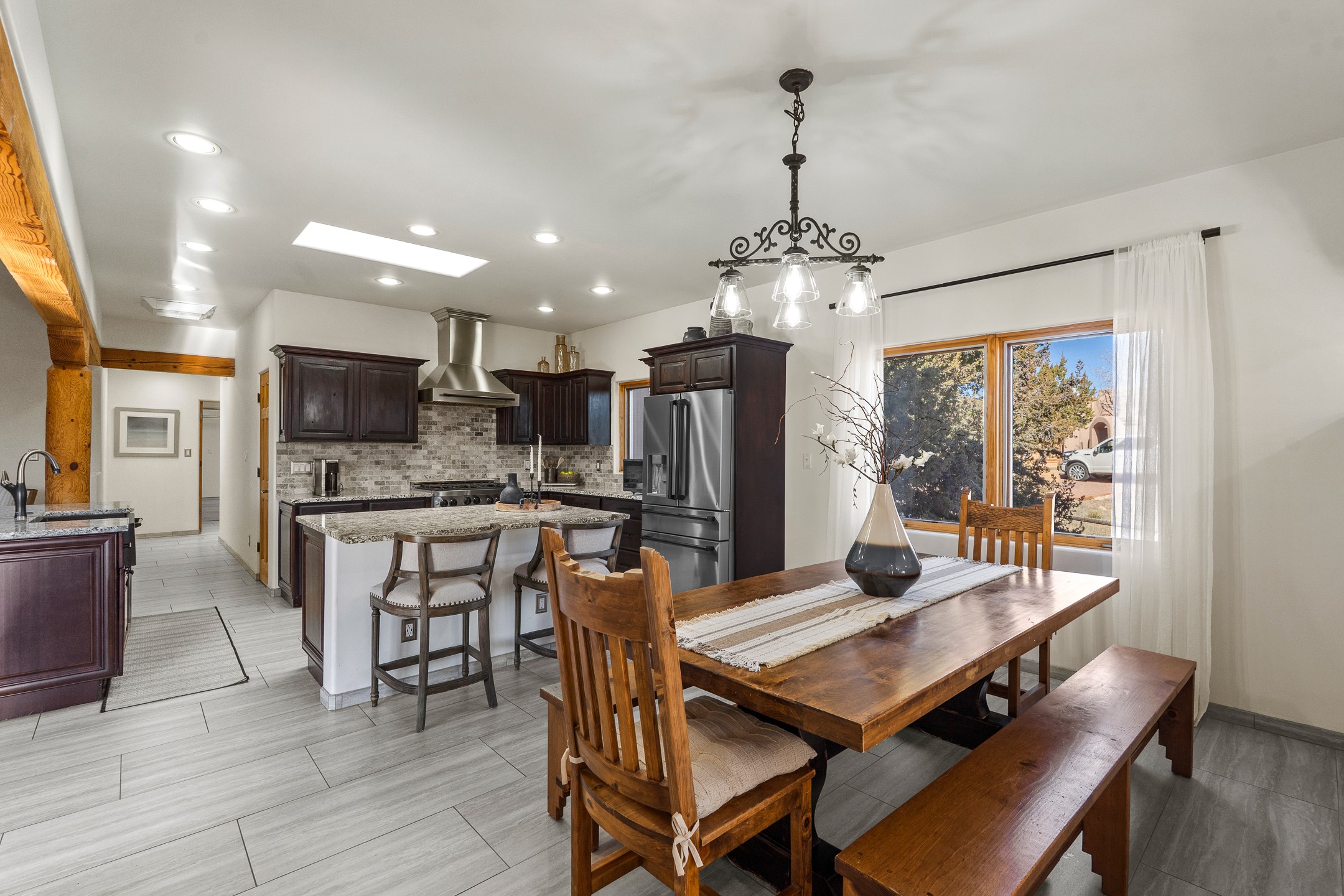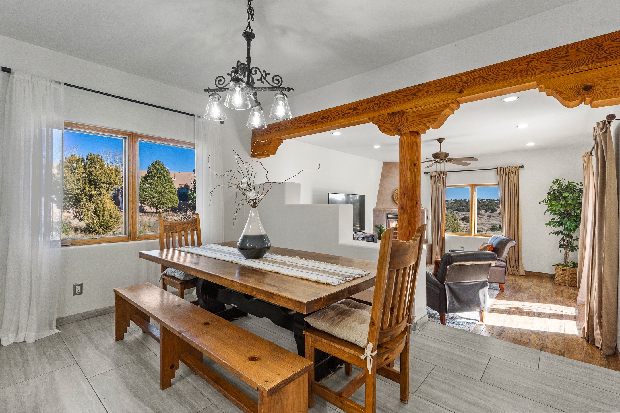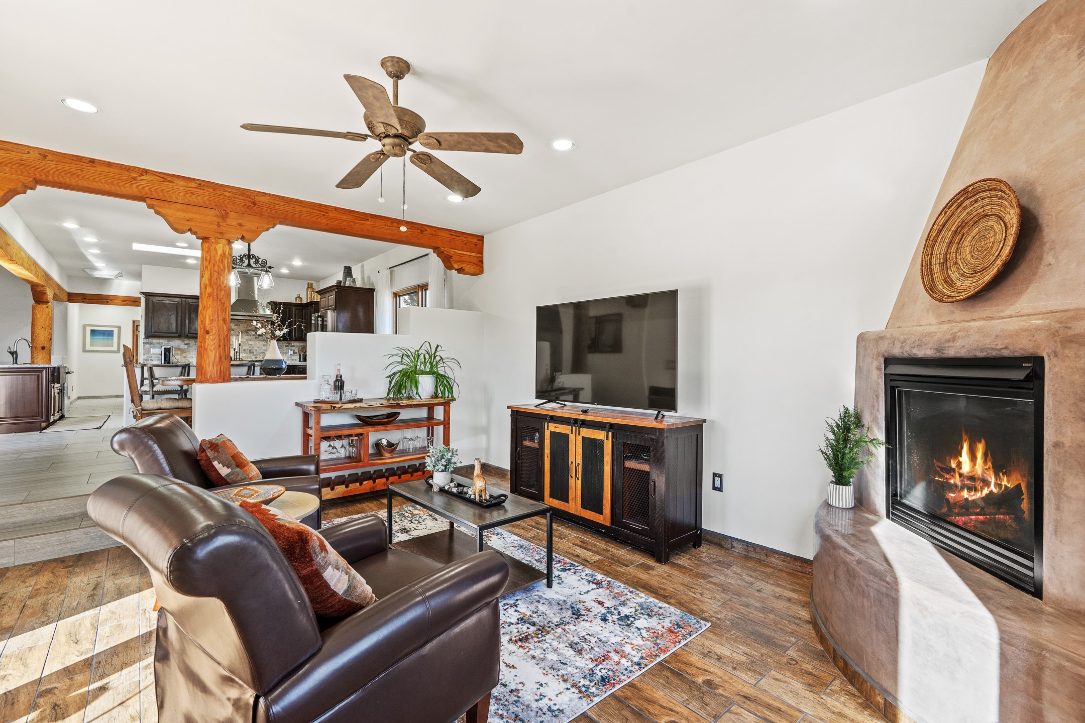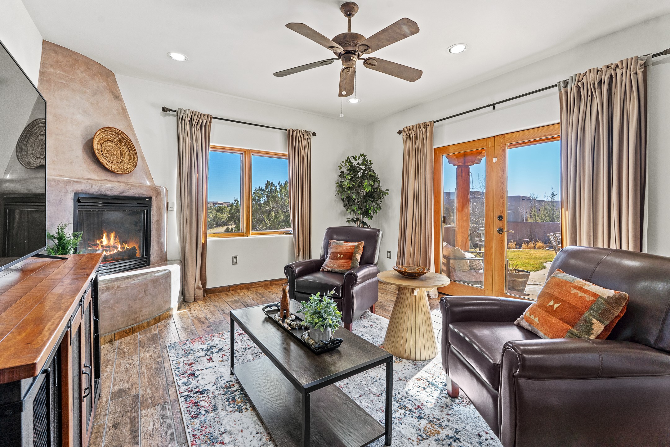 A rare opportunity in Rancho Viejo! This beautifully renovated single-level 4-bedroom, 3-bathroom home was built in 2002 and sits on 1.2 acres with sweeping views of the Sangre de Cristo foothills. Thoughtfully updated from top to bottom, every surface has been touched with care and high-quality craftsmanship.The open-concept floor plan offers effortless flow and versatility. A spacious living room with beautiful viga ceilings and a wood-burning kiva fireplace provides the perfect setting for entertaining. The fully reimagined kitchen features stone countertops, brand-new stainless steel appliances, and two islands--each with bar seating--while the adjacent dining area connects seamlessly to a cozy den with a gas fireplace, creating a warm and inviting gathering space.Step into the backyard and discover a private oasis: a large koi pond with water feature, covered portal with built-in grill, and a separate pergola with a gas firepit--perfect for relaxing or stargazing. The Rancho Viejo trail system is directly accessible from the yard.The primary suite enjoys stunning foothill views, a gas fireplace, direct access to the backyard portal, and the soothing sound of the water feature. The spa-like primary bath includes double vanities, a large walk-in shower, natural light, and garden views. Two guest bedrooms share a full bath in the South wing, while a third guest suite--located privately at the North end--shares a full bath that also serves as the guest powder room. A flexible bonus room near the living area functions beautifully as an office, hobby room, or reading nook.The show-stopper garage can be a 2-car garage with a very large storage area/workshop or a 3-car garage with storage/workshop! On the market for the first time, this home was custom built in 2002 for the current owners, who have lovingly maintained and recently renovated it with exceptional care. This is a rare find and a true Rancho Viejo treasure.