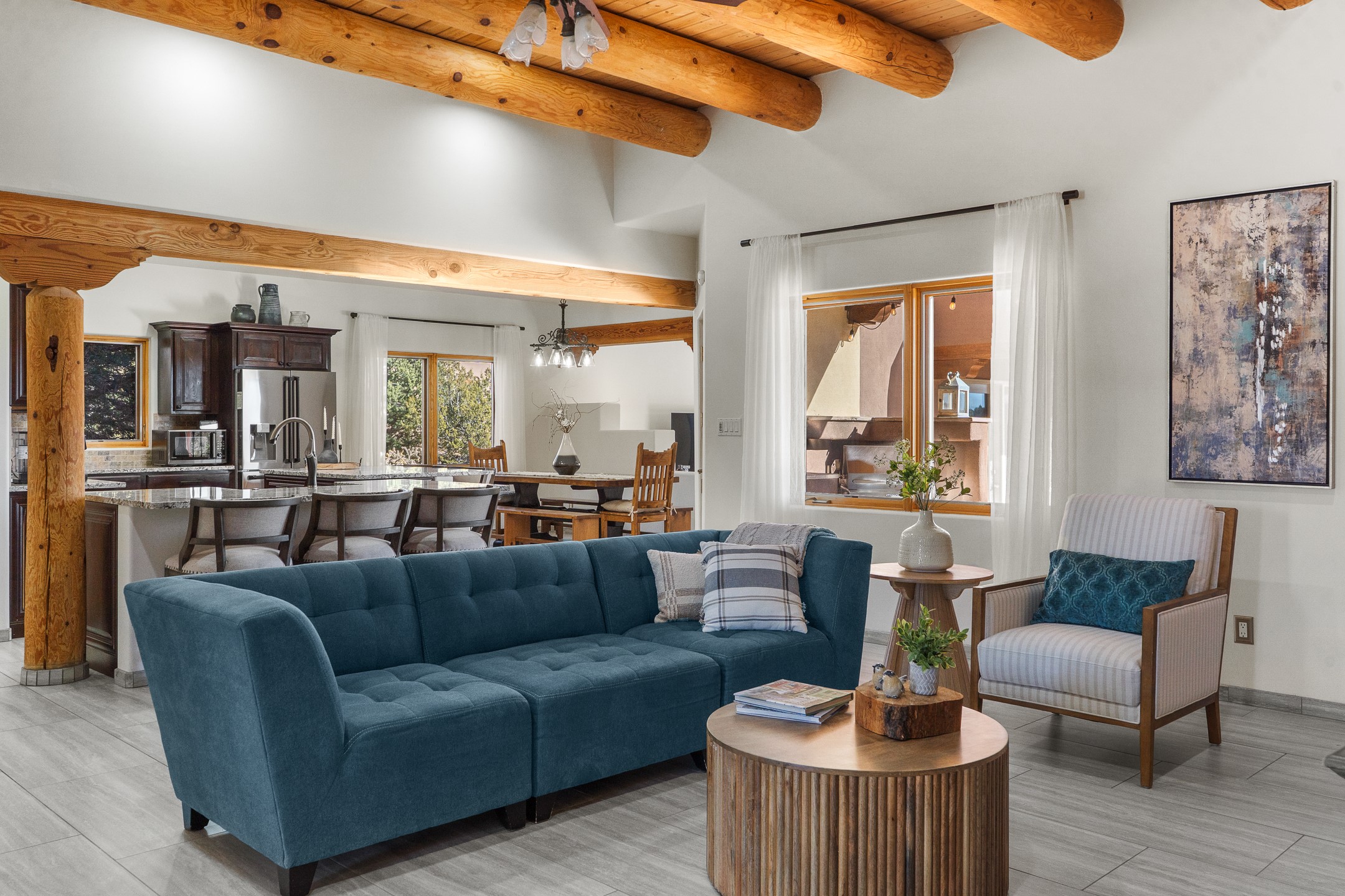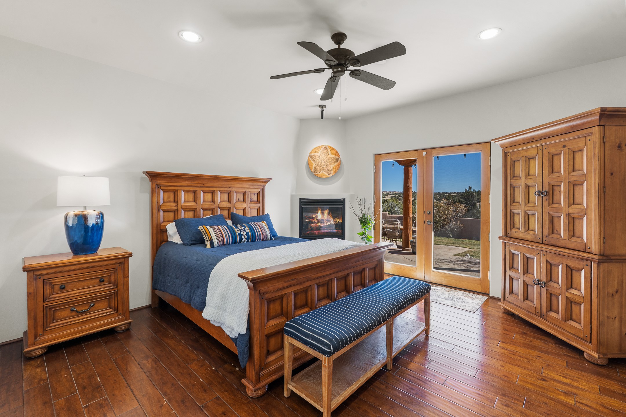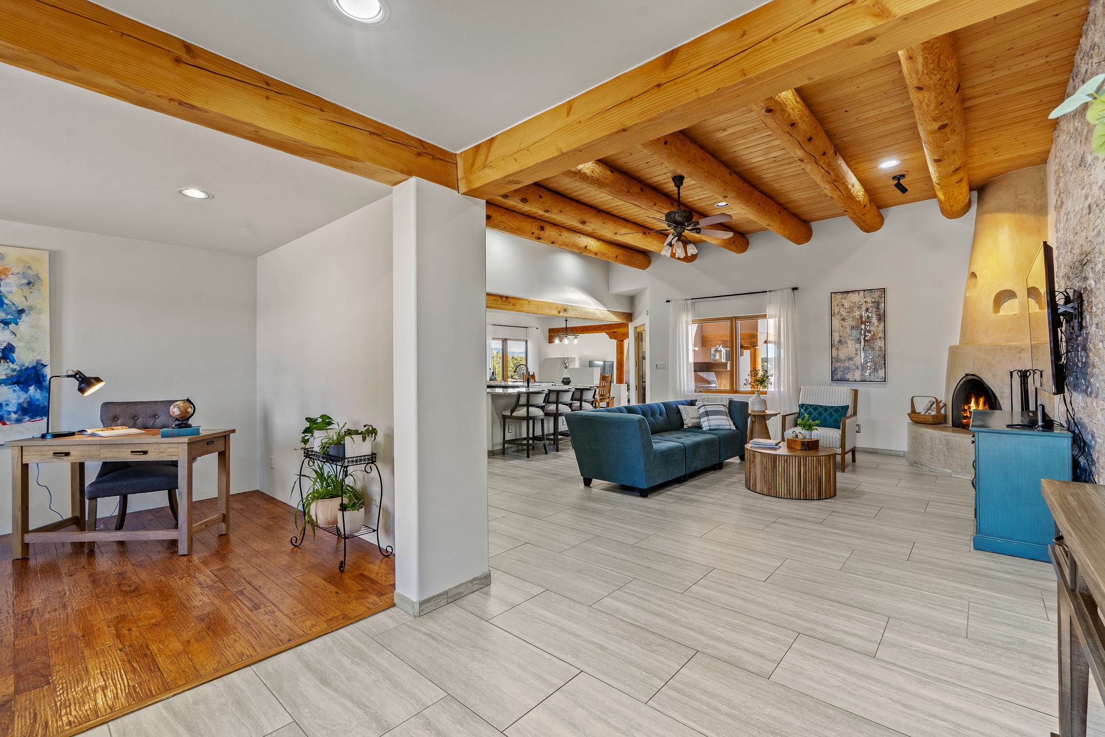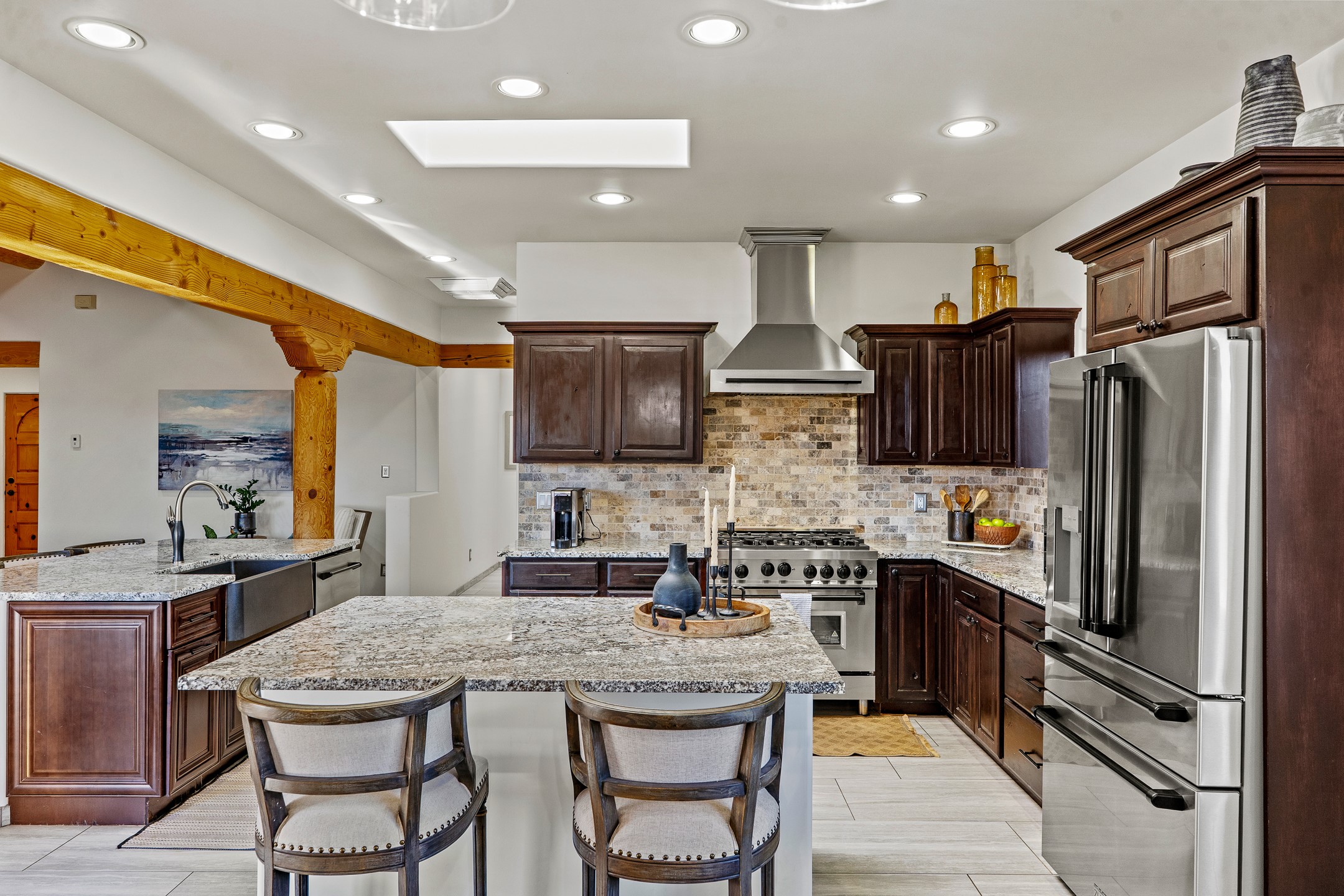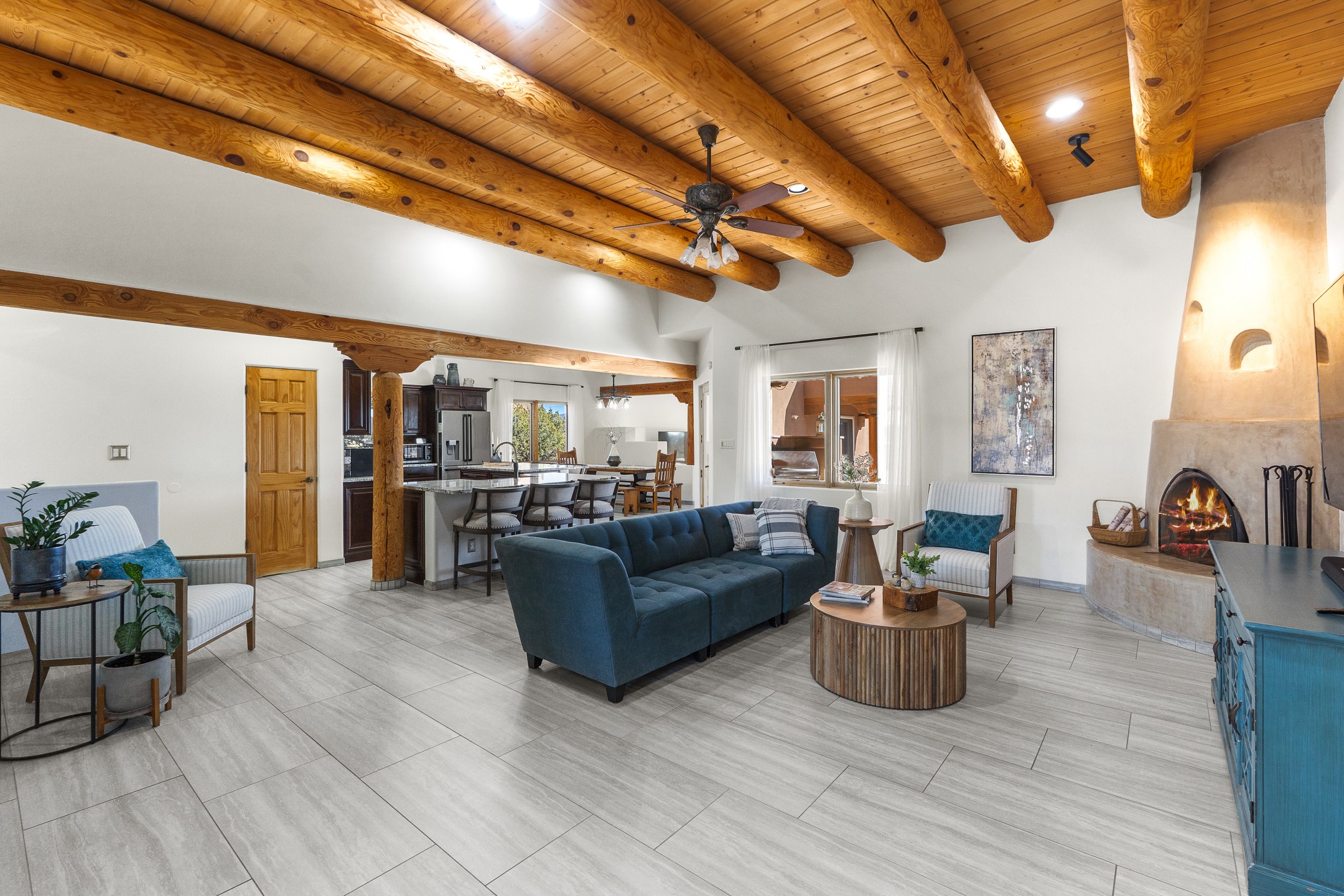 A rare opportunity in Rancho Viejo! This beautifully renovated single-level 4-bedroom, 3-bathroom home was built in 2002 and sits on 1.2 acres with sweeping views of the Sangre de Cristo foothills. Thoughtfully updated from top to bottom, every surface has been touched with care and high-quality craftsmanship.The open-concept floor plan offers effortless flow and versatility. A spacious living room with beautiful viga ceilings and a wood-burning kiva fireplace provides the perfect setting for entertaining. The fully reimagined kitchen features stone countertops, brand-new stainless steel appliances, and two islands--each with bar seating--while the adjacent dining area connects seamlessly to a cozy den with a gas fireplace, creating a warm and inviting gathering space.Step into the backyard and discover a private oasis: a large koi pond with water feature, covered portal with built-in grill, and a separate pergola with a gas firepit--perfect for relaxing or stargazing. The Rancho Viejo trail system is directly accessible from the yard.The primary suite enjoys stunning foothill views, a gas fireplace, direct access to the backyard portal, and the soothing sound of the water feature. The spa-like primary bath includes double vanities, a large walk-in shower, natural light, and garden views. Two guest bedrooms share a full bath in the South wing, while a third guest suite--located privately at the North end--shares a full bath that also serves as the guest powder room. A flexible bonus room near the living area functions beautifully as an office, hobby room, or reading nook.The show-stopper garage can be a 2-car garage with a very large storage area/workshop or a 3-car garage with storage/workshop! On the market for the first time, this home was custom built in 2002 for the current owners, who have lovingly maintained and recently renovated it with exceptional care. This is a rare find and a true Rancho Viejo treasure.