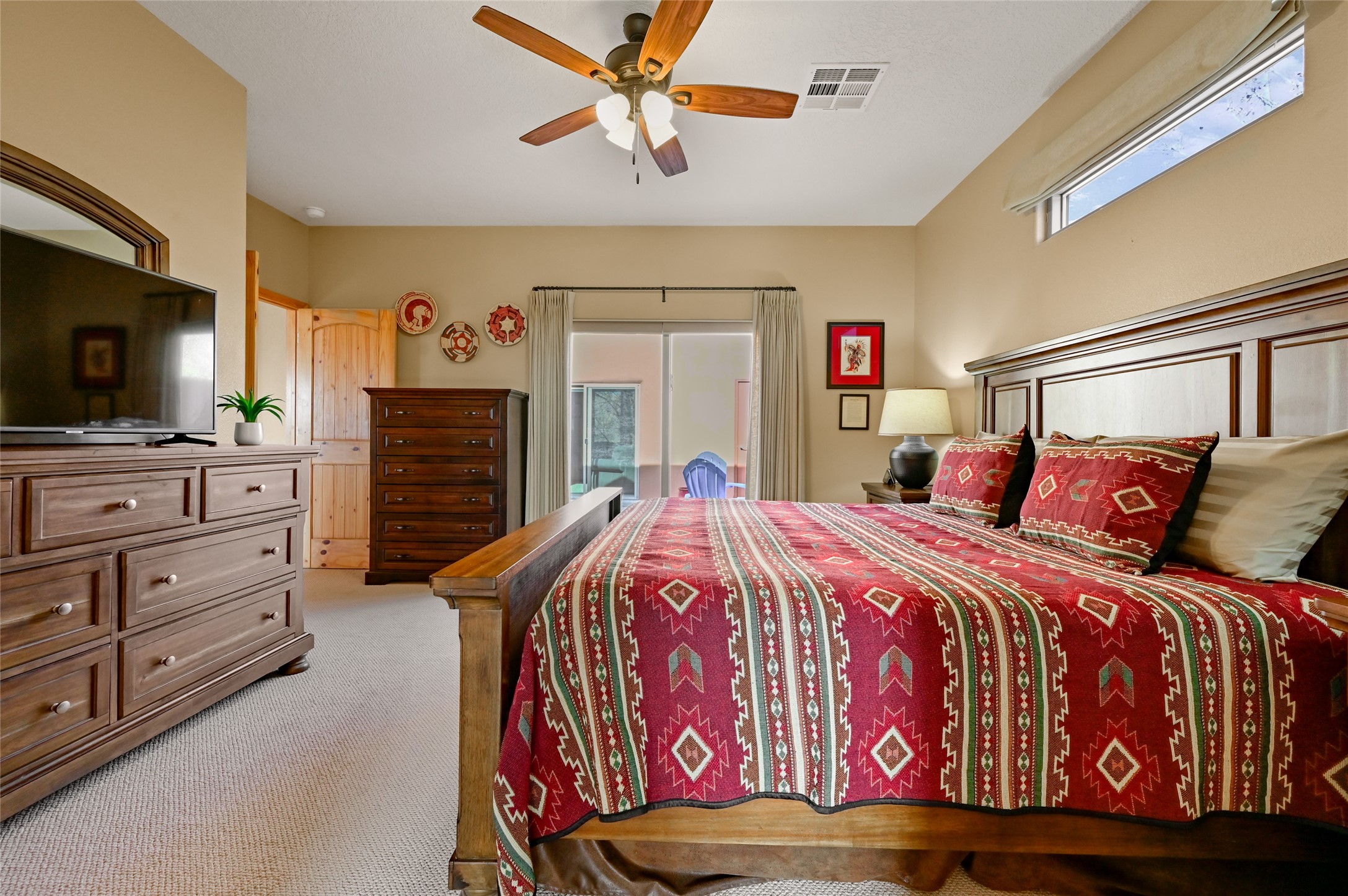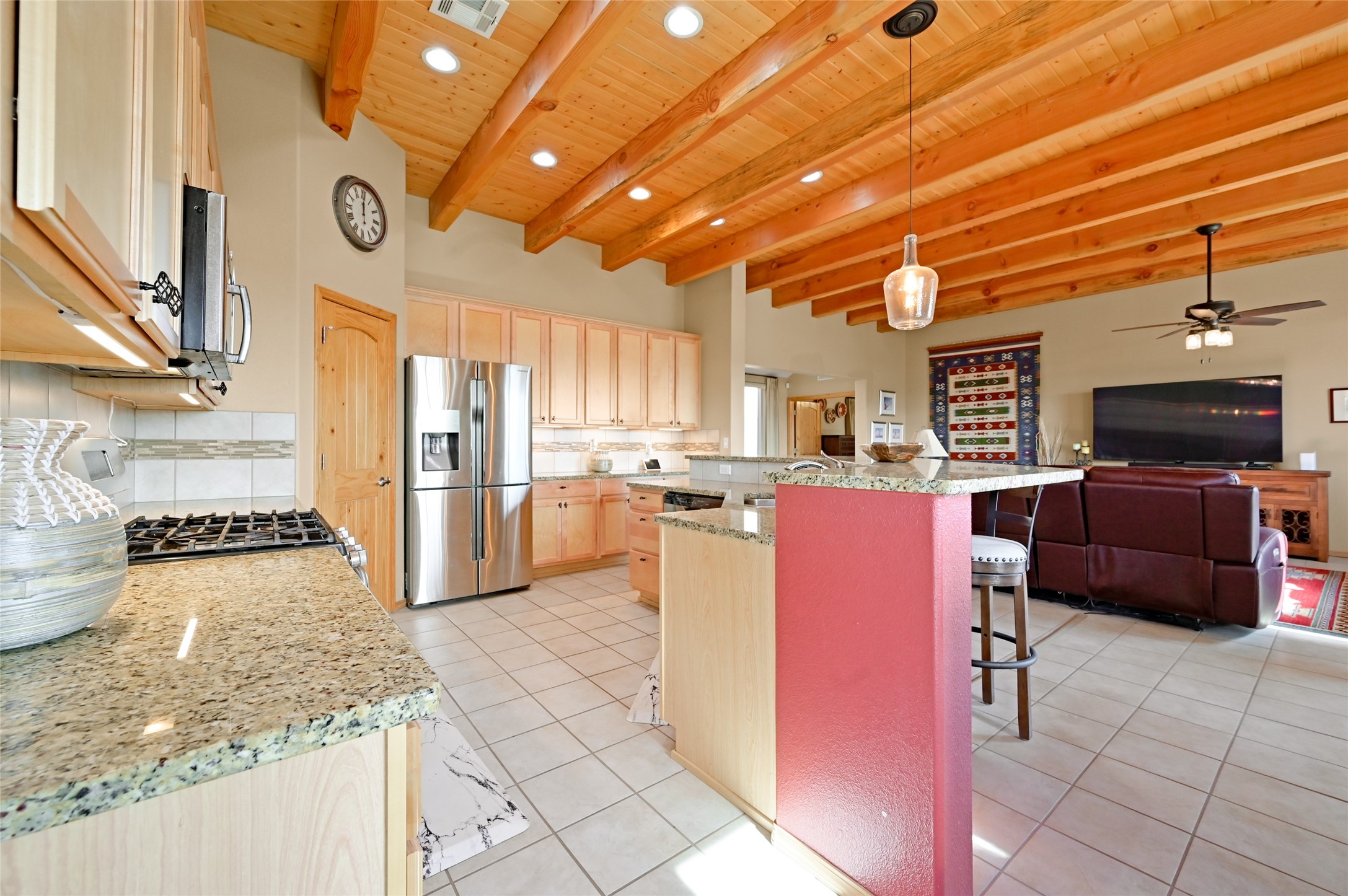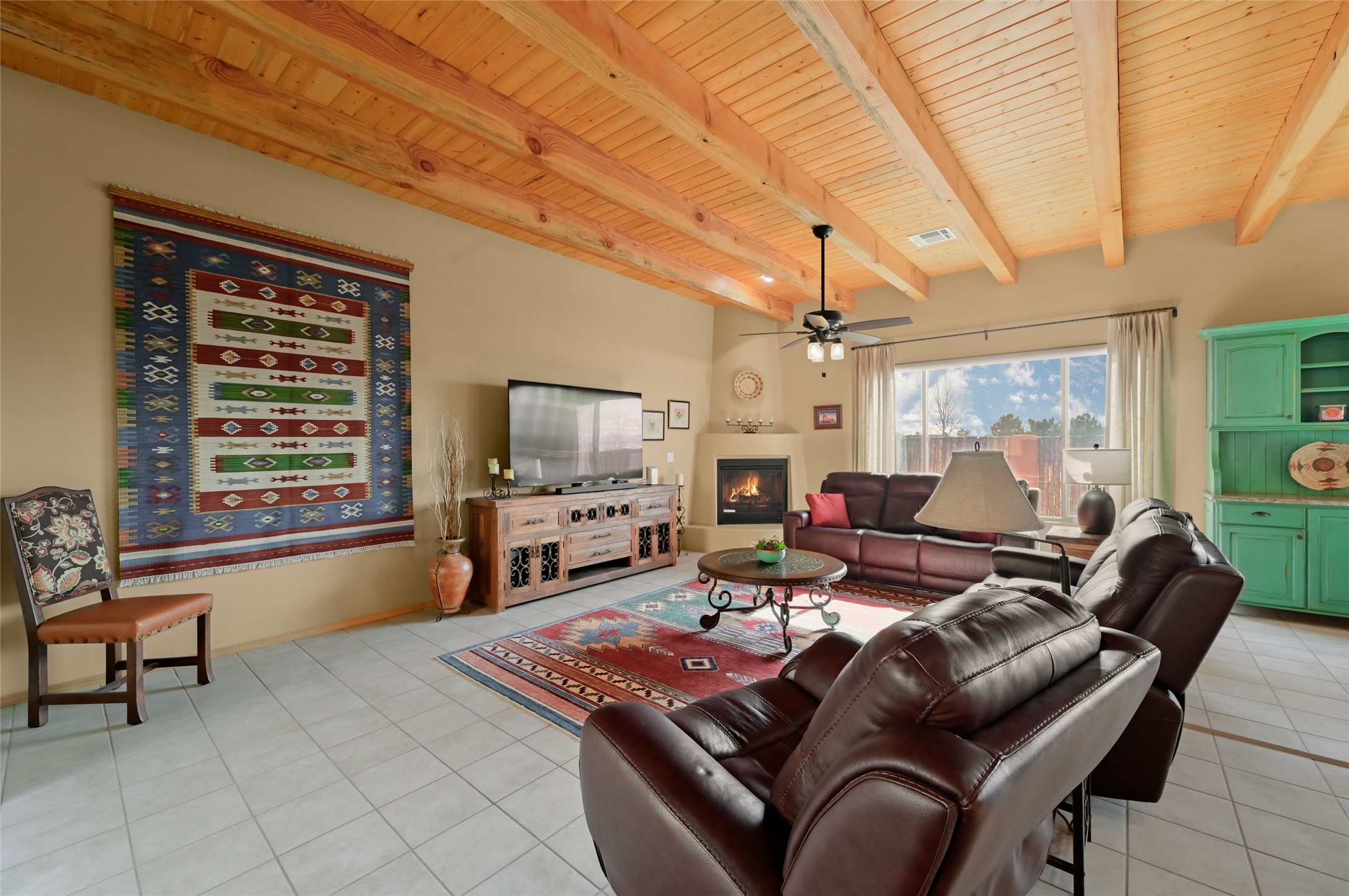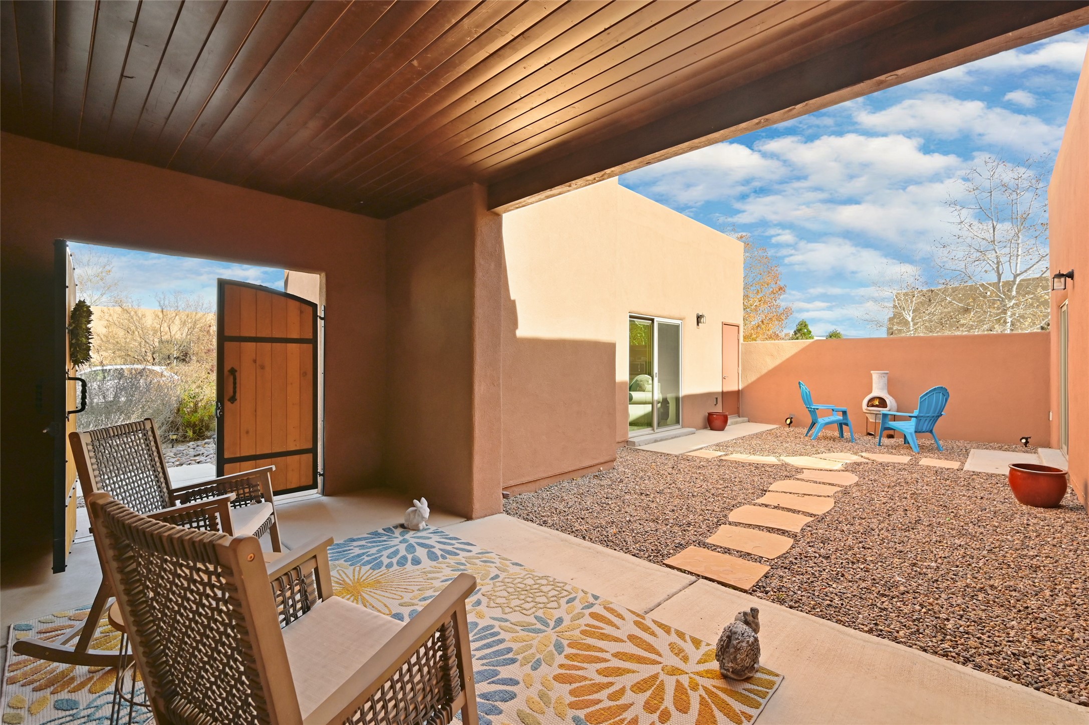 Located in the highly sought-after La Pradera subdivision, this refined Pueblo-style residence embodies the ease and elegance of Santa Fe living. The property features a spacious 1,692 sq ft main home and a charming 394 sq ft casita--ideal for hosting guests, creating a private studio, or generating rental income. The main home welcomes you with an expansive open-concept great room, where the kitchen, dining, and living areas blend seamlessly under warm Southwestern accents and a classic kiva fireplace. A thoughtful floor plan provides excellent bedroom separation, ensuring comfort and privacy for both residents and guests. The luxurious primary suite offers a soaking tub, walk-in shower, and dual walk-in closets, creating a serene retreat. Across a beautifully designed courtyard, the casita offers its own bedroom, 3/4 bath, a cozy living area, and a kitchenette, providing guests with independence and comfort throughout their stay. A rare 3-car garage enhances both convenience and storage. The neighborhood features extensive paved and natural walking trails, as well as a playground, making it ideal for an active lifestyle. The home also backs to protected open space, offering added privacy and unobstructed views. Designed for low-maintenance living, the xeriscaped landscaping makes this an ideal second home or lock-and-leave retreat. Even better, all furniture conveys (excluding art, rugs & TVs), allowing you to step effortlessly into the Santa Fe lifestyle from the moment you arrive. The furniture package is optional.
