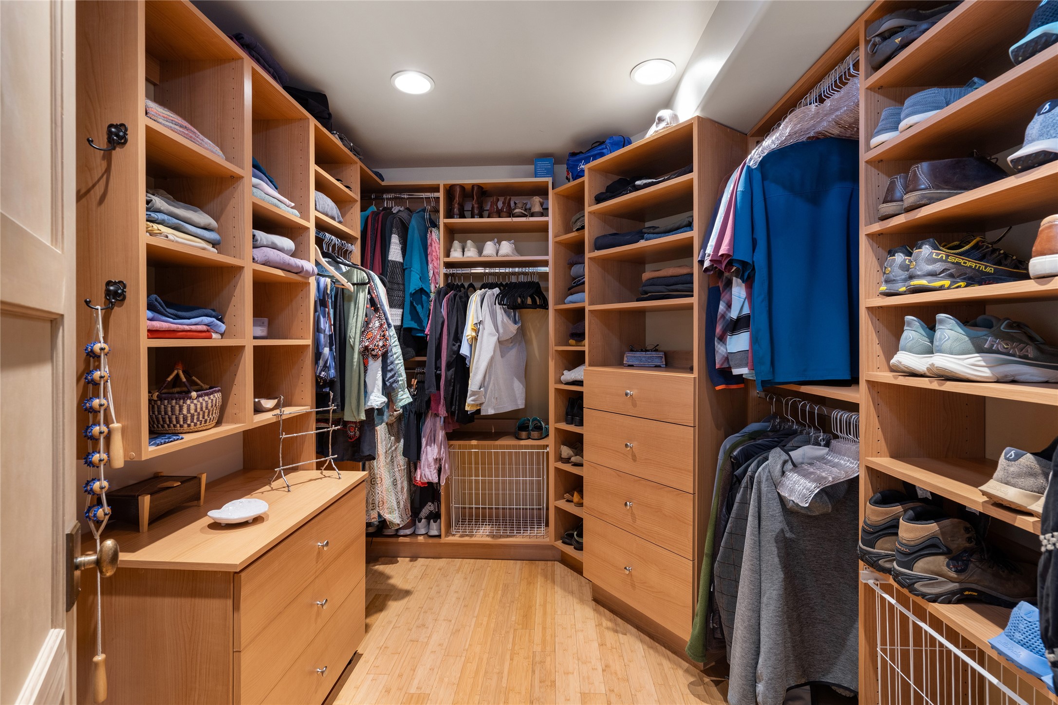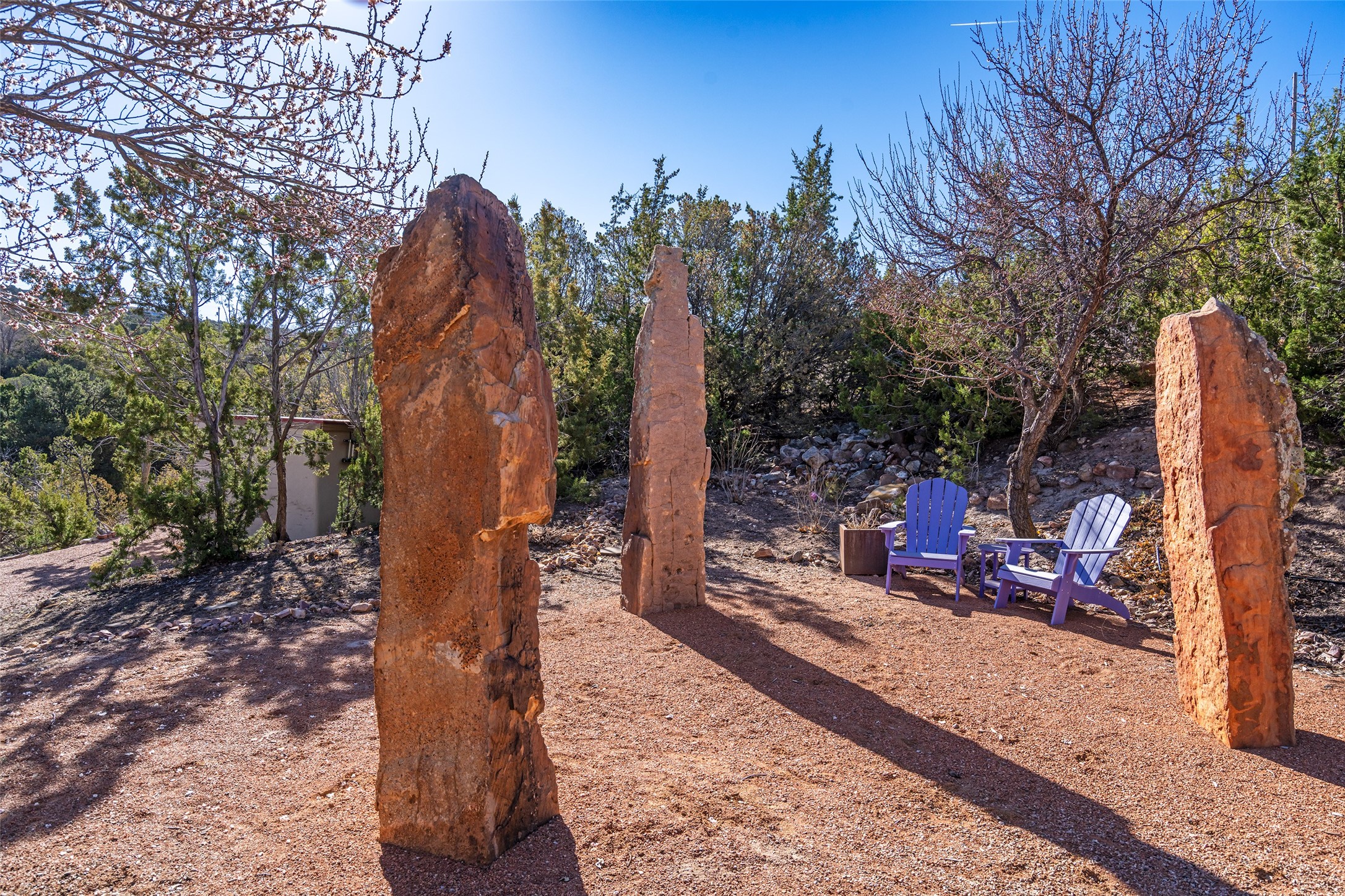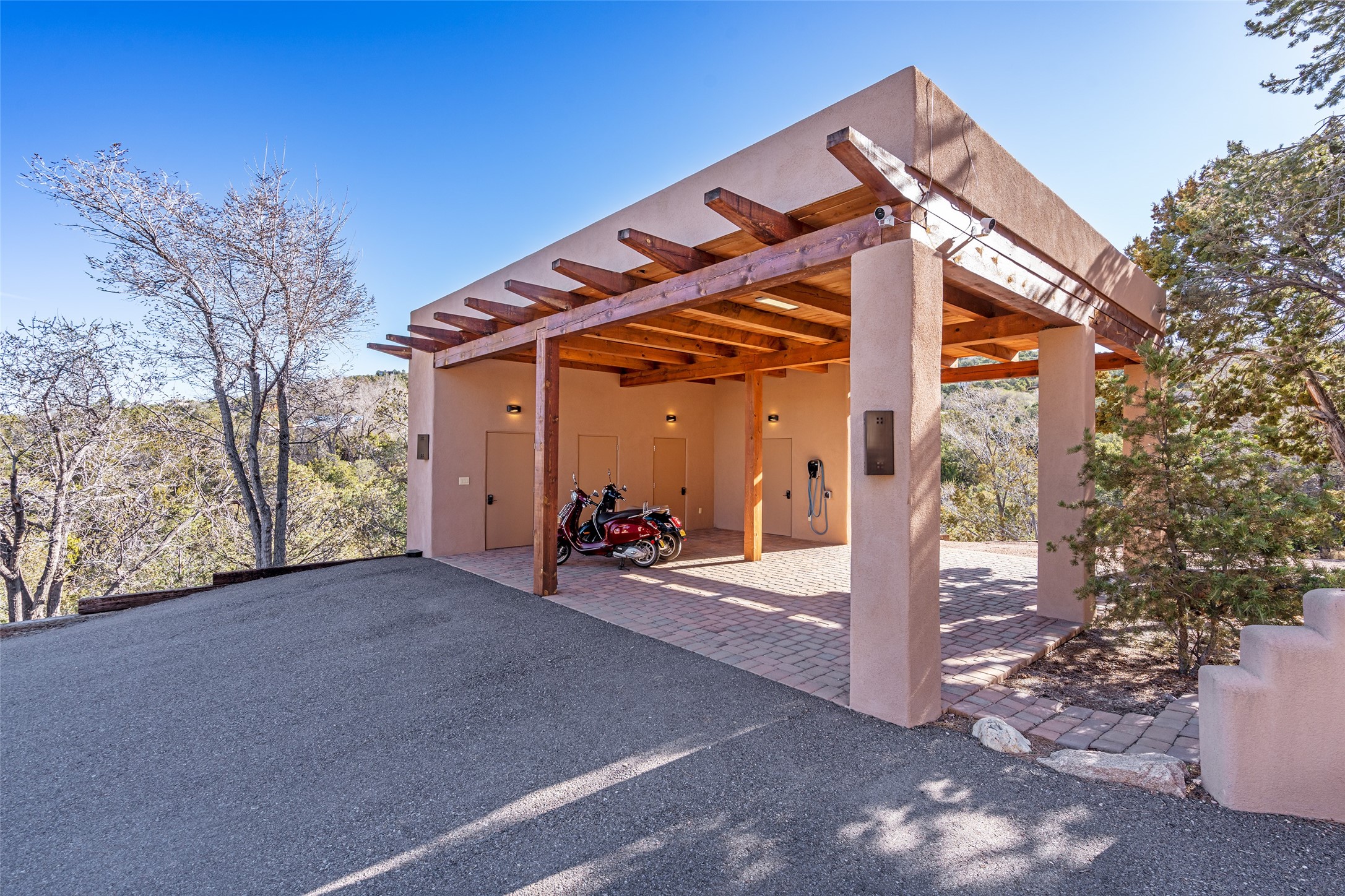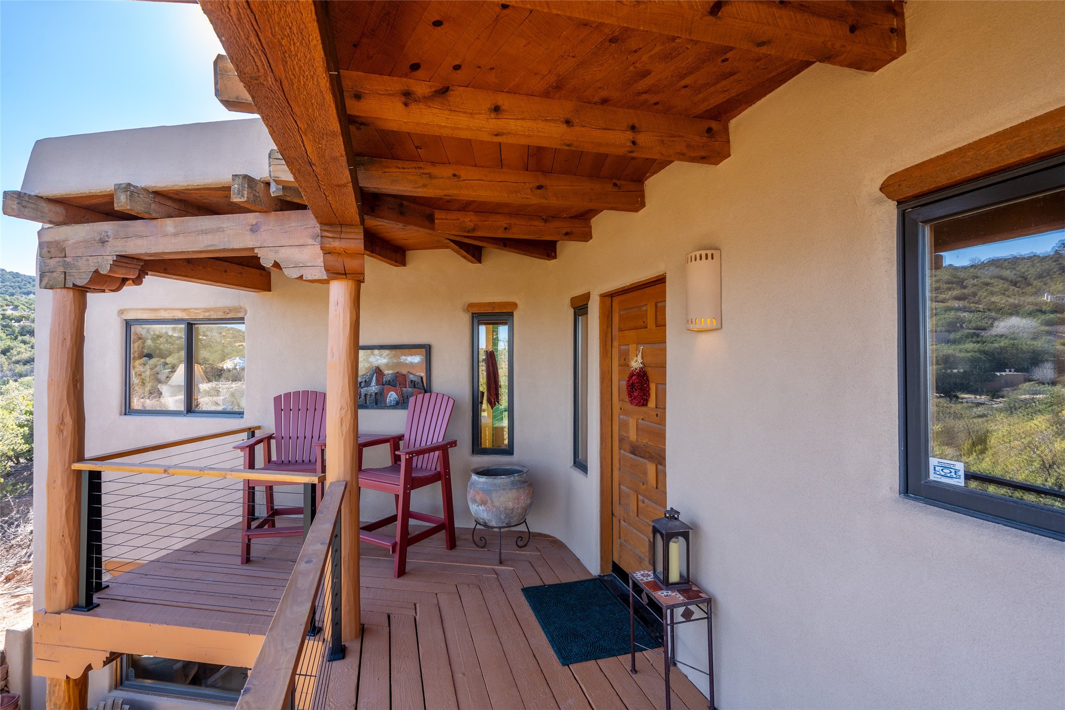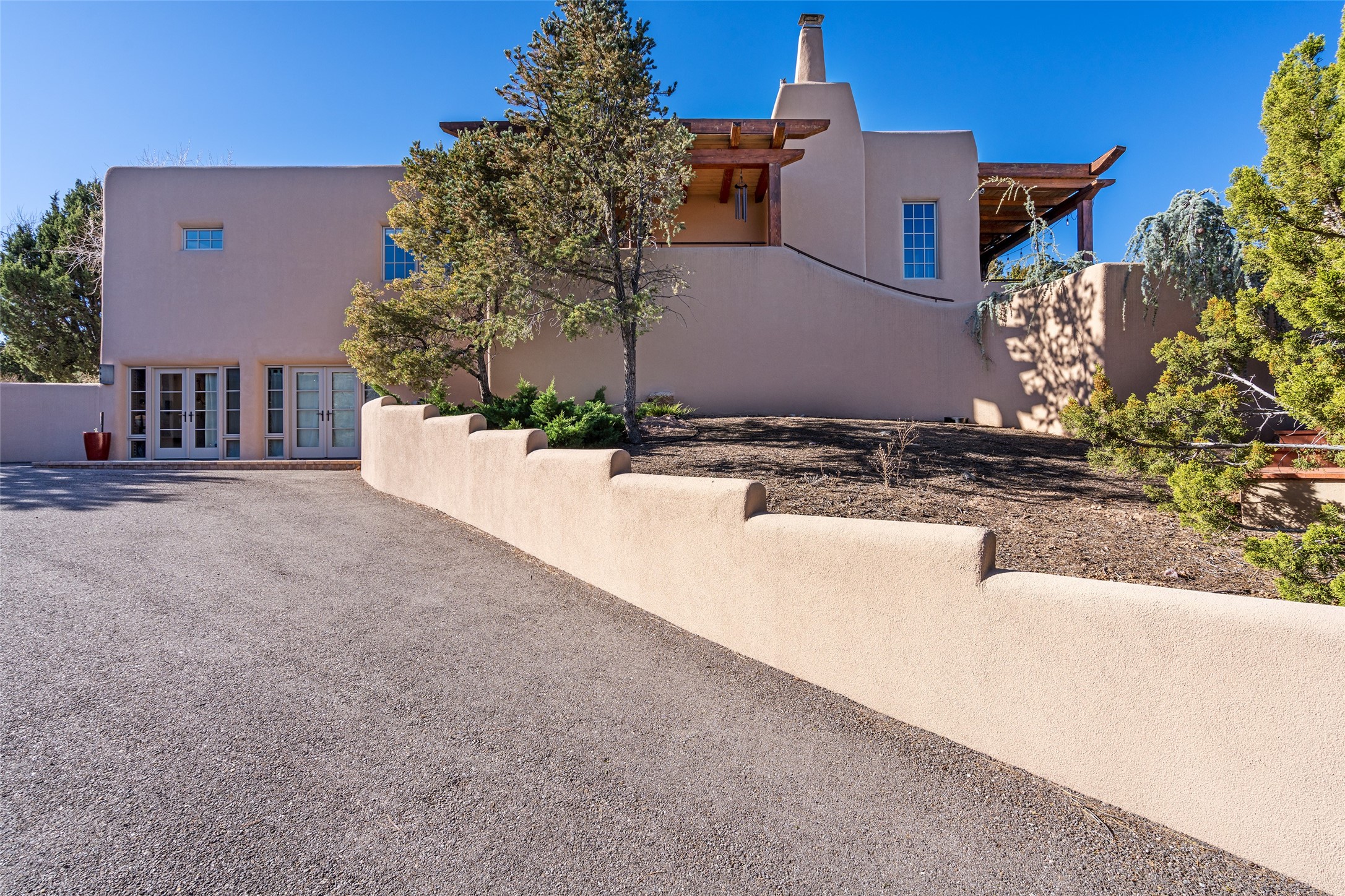 Set in the hills above Santa Fe with spectacular views of the Jemez Mountains, this distinctive 2.5-acre compound pairs privacy with proximity--just minutes from Canyon Road and the Plaza. The property includes a main residence and a separate guest casita, offering flexibility for visitors, creative space, or extended stays.The main home features high ceilings, arched doorways, vigas, bamboo floors, and diamond plaster walls. The open living and dining spaces face the Jemez Mountains through a wall of windows, with double French doors opening to a portal and patio positioned for sunset views.The kitchen is equipped with stainless Wolf and Sub-Zero appliances, granite countertops, a generous walk-in pantry, and a dining nook that opens through French doors to a patio perfect for morning coffee or an evening cookout with friends. The owner's suite sits down a quiet hallway and includes a spacious closet with custom shelving and a luxurious bath with bespoke stone and tile floors. A study completes the upper level, while the lower level offers a guest suite with ensuite bathroom that also works well as a studio or home office.Set apart at the rear of the 2.6 acre property, the guest casita has its own driveway access. The upper level includes a living area opening to a view deck, along with a bedroom, bath, and fully equipped kitchen with dining area. Below is a private second guest suite with bath, adaptable as a studio or workspace. A fully owned 8.3kW solar array provides the majority of the main home's electricity.
