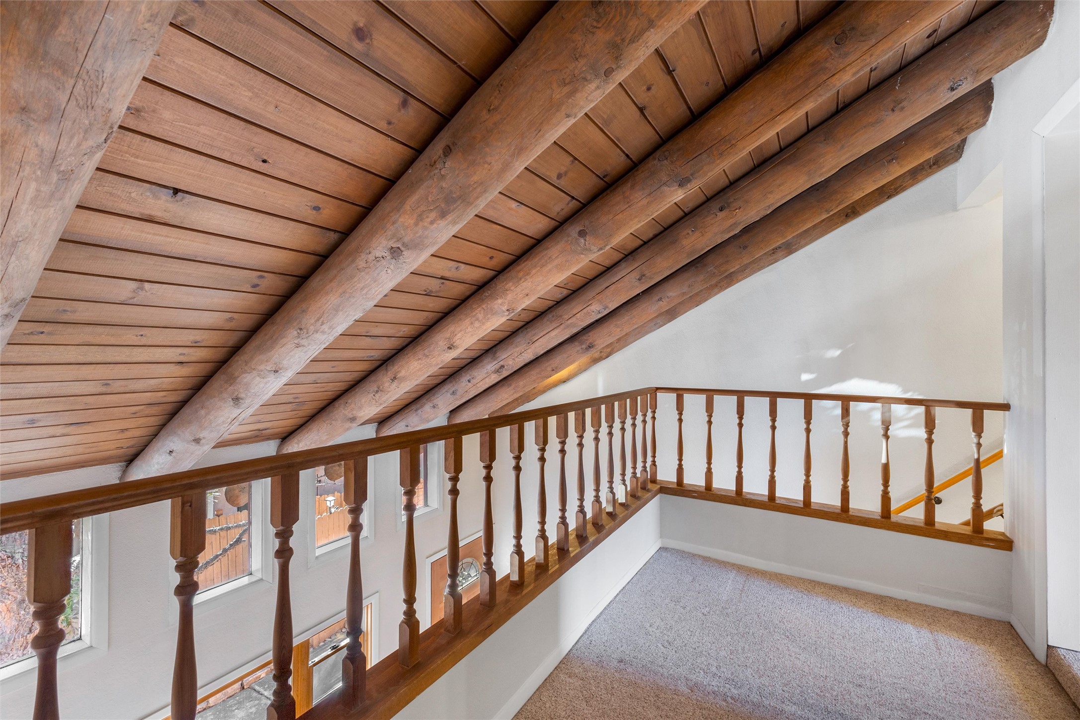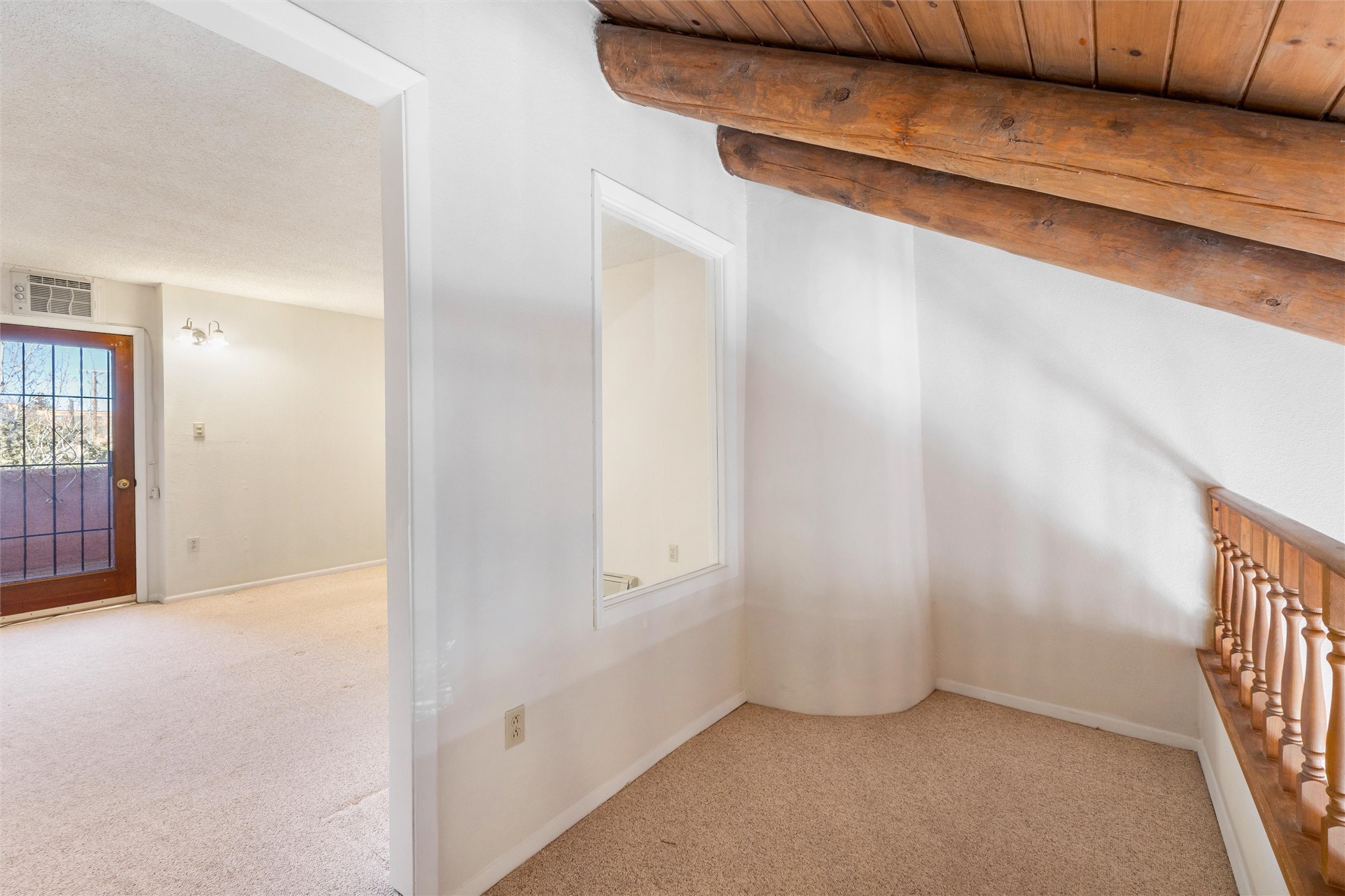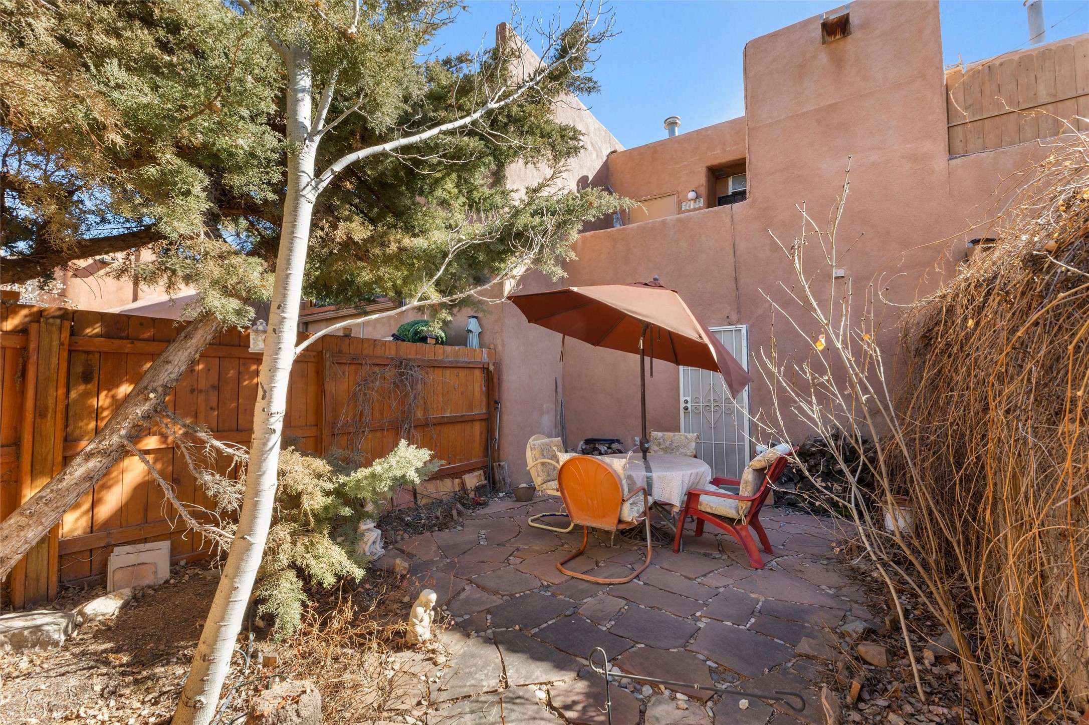 This inviting 2-bedroom, 2-bath residence at Avenida de las Americas blends classic Santa Fe style with thoughtful updates and a comfortable, well-designed floor plan. Upon entry, the home feels open and spacious, enhanced by clerestory windows that fill the living area with natural light. Traditional Southwest details include vigas, a kiva-style fireplace, Saltillo tile flooring, and a charming loft that adds character and flexible living space.The living room serves as the heart of the home, offering warm morning light, a cozy fireplace, and an easy flow for everyday living. A full bedroom and bathroom on the lower level provide convenience for guests or main-level living, while the large primary bedroom and bathroom upstairs offers privacy and comfort. The back yard extends the living space outdoors, featuring mature landscaping, gardens, and a flagstone patio ideal for relaxing or entertaining.Recent improvements include fresh interior paint completed in January 2026, Saltillo tile installed throughout the lower level and upstairs bathroom, a remodeled stairway with natural wood and Mexican tile, an updated kitchen sink and faucet, and added security doors at the rear of the home. Ample storage, including generous space beneath the stairway, adds everyday functionality.Las Americas offers a quiet, community-oriented setting with a strong sense of privacy, while remaining close to shopping, dining, and entertainment. With well-lit parking and a peaceful atmosphere, this home offers comfort, charm, and convenient Santa Fe living. It also includes two designated parking spaces labeled 1559.
