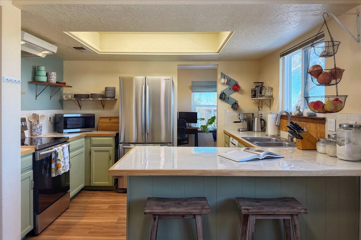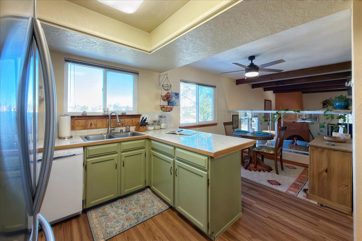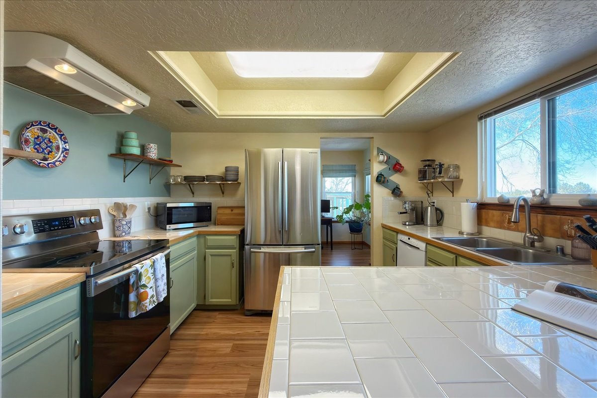 The ultimate move-in-ready home awaits in this desirable close-in neighborhood. Thoughtfully updated throughout, the home features new energy-efficient Pella windows, a new TPO roof with transferable warranty, luxury vinyl plank flooring, updated forced central air heating and cooling, and an attached two-car garage--making it truly turnkey.The main level offers an open and inviting floor plan with kitchen, dining, and living areas anchored by a cozy kiva fireplace. A convenient powder room, laundry room, and direct access to the two-car garage (with EV charging) are all located just off the living space for everyday ease.Upstairs, three bedrooms enjoy lovely views and generous reach-in closets. Two bedrooms share an updated full bath, while the primary suite offers its own en-suite bath and a large closet.Situated on approximately .24 acres in a sought-after neighborhood off Zia Road, the back of the property opens to nearby trails and open land with beautiful Sangre de Cristo views. The front features a charming courtyard and landscaped yard, perfect for relaxing or entertaining. Shopping, dining, and recreation are conveniently close, with easy access to St. Francis Drive, Zafarano, and the Genoveva Chavez Community Center.
