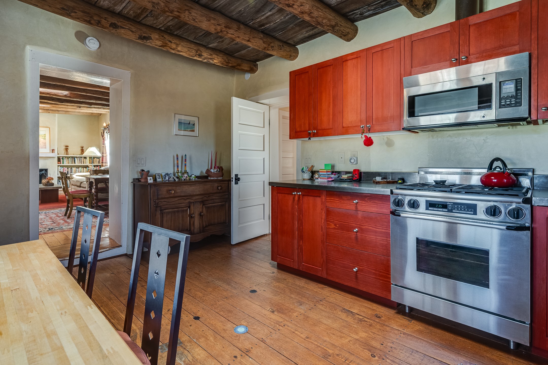 Historically Significant Home in The Don Gaspar Historic District! Step through the gate and discover a piece of Santa Fe history waiting to become your next chapter. This enchanting two-bedroom residence captures the authentic spirit of the Southwest. Traditional vigas stretch across the ceiling, skylights paint golden patterns across wide plank wood flooring, deep window sills hint at adobe behind the polished plaster walls, and a central wood burning fireplace summons you to sit and stay a while. The thoughtfully updated kitchen and bathroom blend modern convenience with timeless character, honoring the home's heritage while embracing contemporary comfort. Every corner whispers stories of generations past. Outside, a private courtyard beckons with sturdy brick pavers and tall walls creating your personal sanctuary. With 2 off-street parking spots and PV solar, this jewel nestled into a corner lot in the charming South Capital neighborhood, this retreat offers the peaceful solitude you crave while keeping downtown's galleries, restaurants, and cultural treasures within easy reach. This is more than a home; it is a lifestyle rooted in artistic tradition and Southwestern soul.