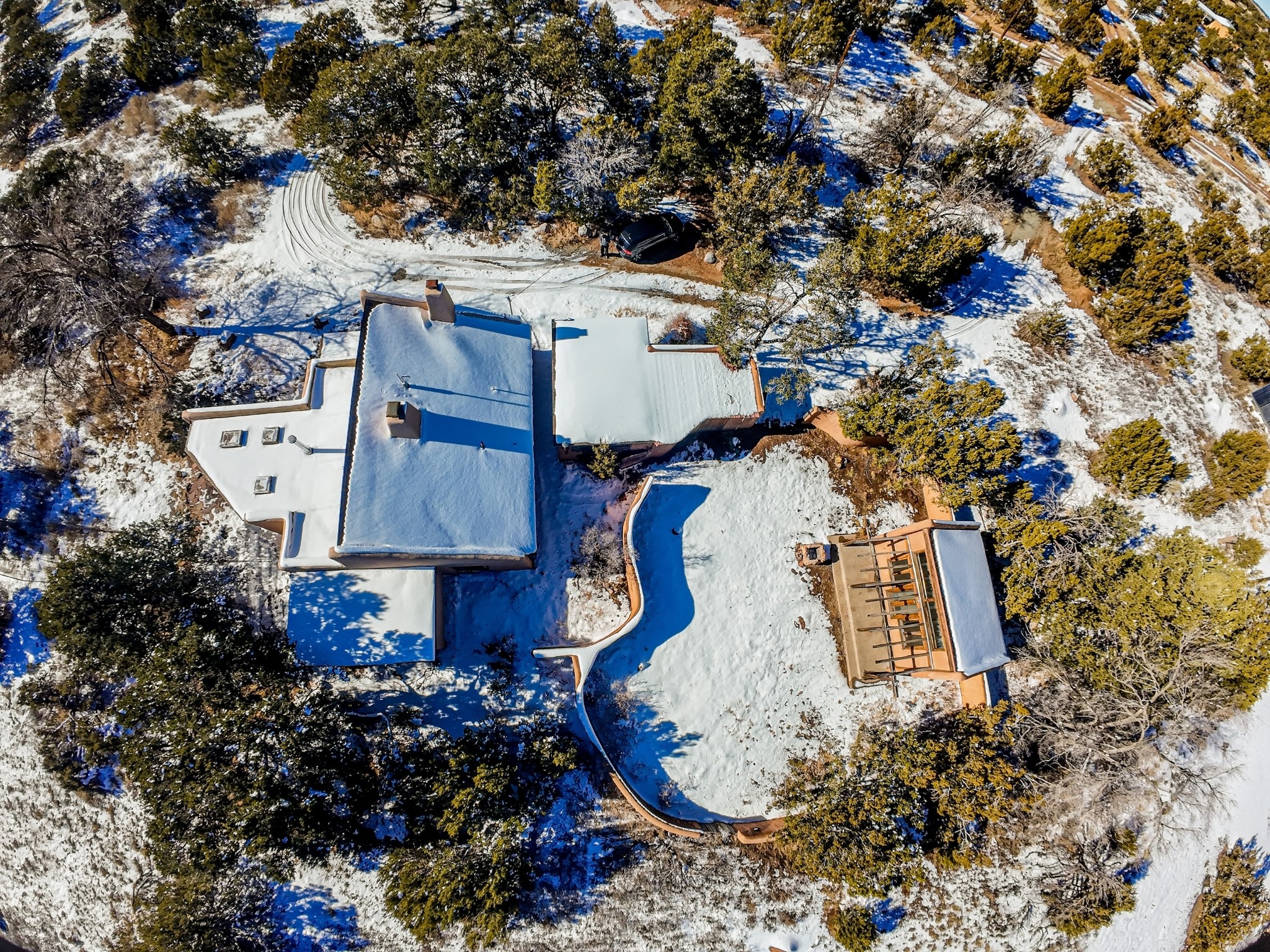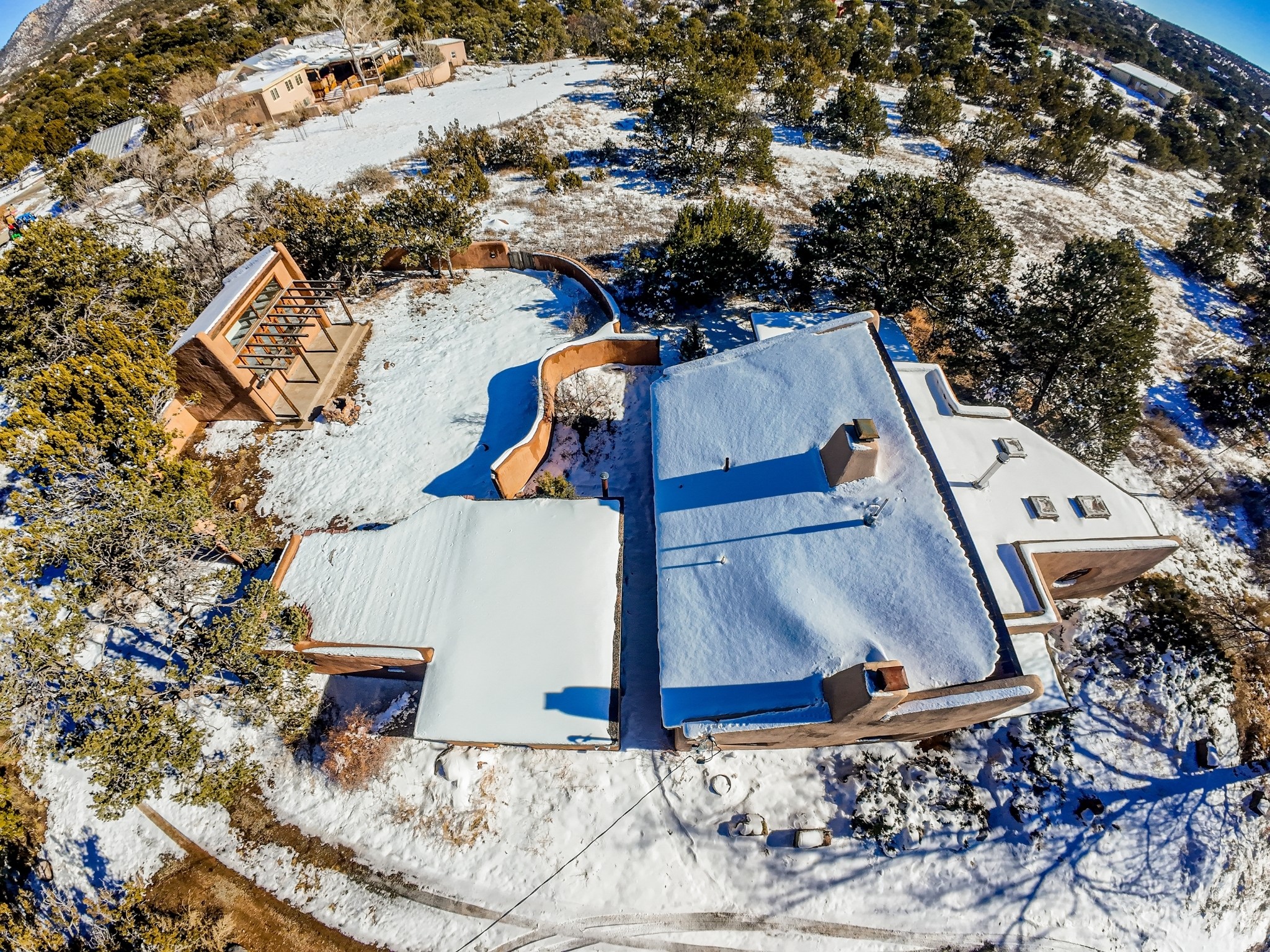 Nestled on 5 quiet, wooded acres, this 1523 sq. ft. passive solar home is bathed in natural light. A circular driveway makes coming and going a breeze. Inside you will find plenty of character, from the high clerestory windows to the rustic flagstone floors. Cozy up on chilly nights by the fireplace or the wood stove and read a book in the sun room in the afternoons. Primary bedroom features a loft, perfect for storage while a flexible den or hobby room could easily serve as a bedroom with addition of a closet. Creatives and artists will love the 240 sq. ft. separate studio and workshop area, both surrounded by a beautiful adobe wall.