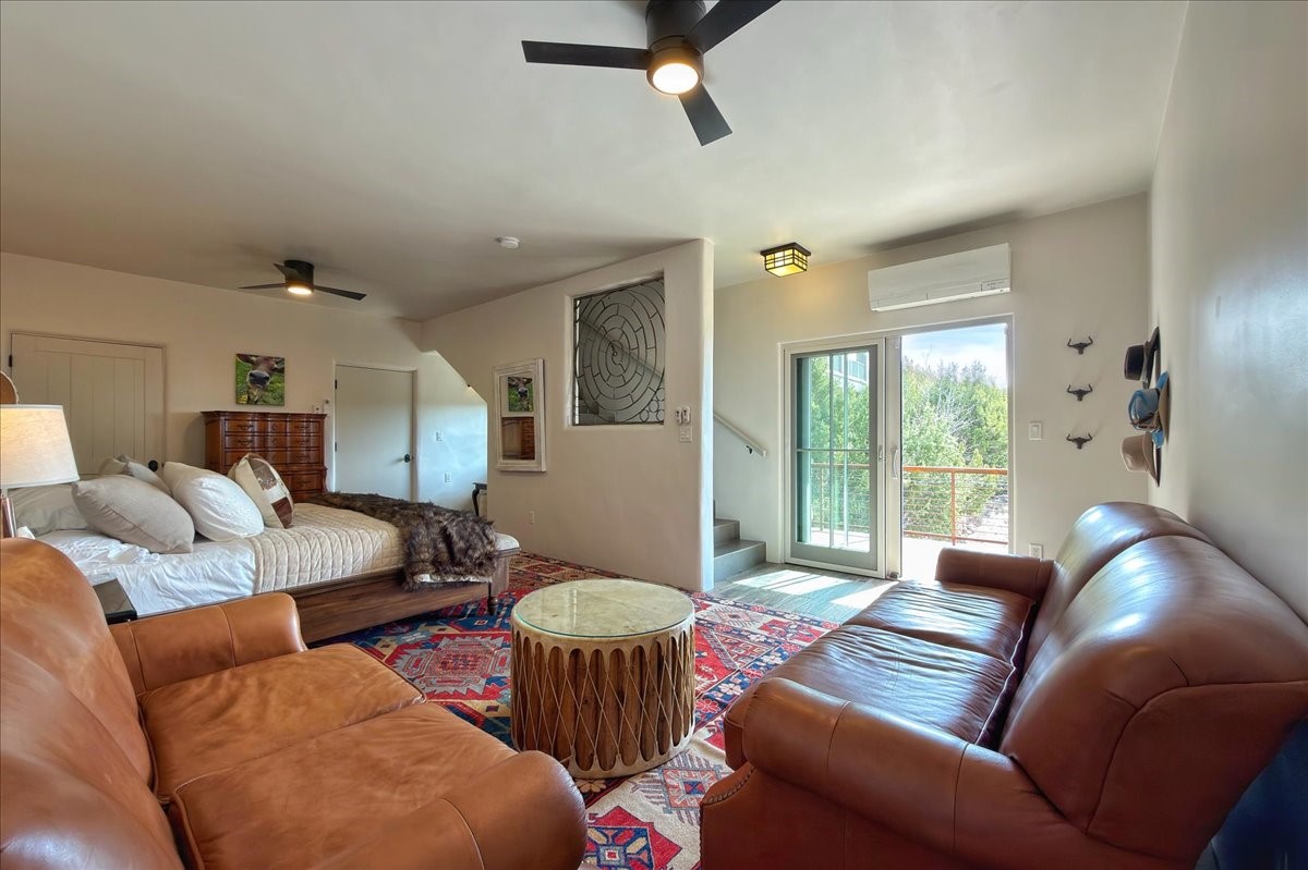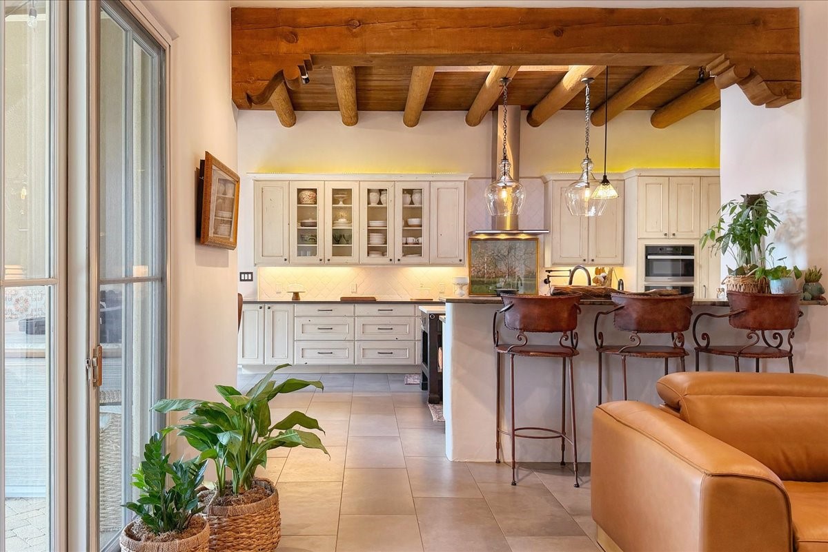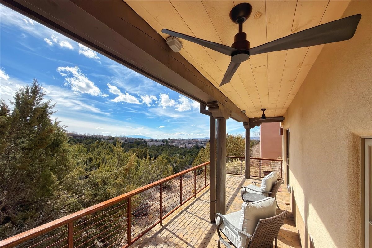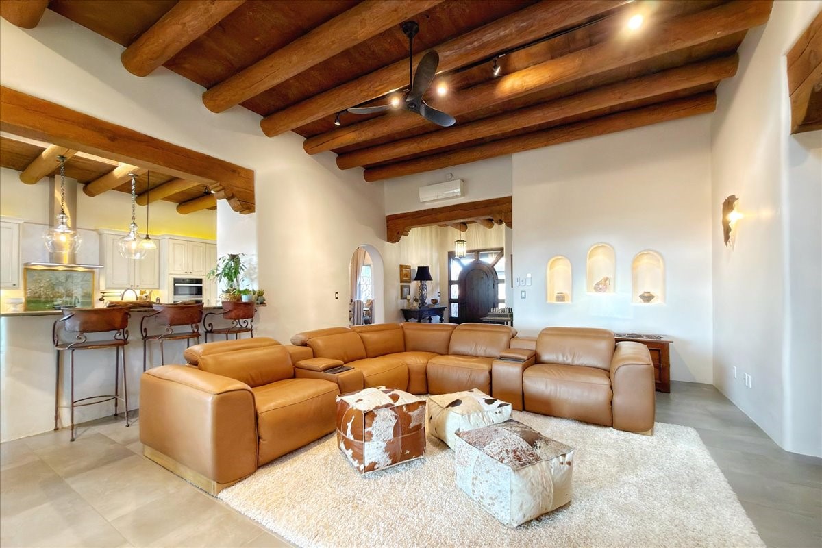 Set within the serene landscape of Aldea de Santa Fe, 46 E. Via Plaza Nueva embodies the essence of refined Pueblo-style architecture and elevated high-desert living. Encompassing approximately 3,947 square feet--with nearly all living spaces thoughtfully arranged on a single level--this residence offers both architectural presence and effortless livability just minutes from the historic Santa Fe Plaza.Wrought-iron gates open to a wraparound garden and sculpted courtyard. Beyond the custom front door, a welcoming foyer reveals expansive open-concept living and entertaining spaces defined by soaring ceilings, softly burnished plaster walls, hand-hewn vigas, and artisan tilework. The living room centers on a classic kiva fireplace, flowing seamlessly to the dining area and chef's kitchen--each space oriented toward sweeping Sangre de Cristo Mountain views and a generous covered portal with built-in grilling for effortless indoor-outdoor gatherings.The private bedroom wing includes three spacious suites on the main level, each with its own bath and tranquil separation from the public rooms. The primary suite is a true retreat, offering a sitting area, direct terrace access, and mountain vistas. Its spa-inspired bath features a sculptural soaking tub, expansive walk-in shower, and substantial dressing closet.Supporting spaces on the main level include a well-appointed laundry/utility room, oversized two-car garage, and a substantial dedicated workshop--ideal for studio, hobby, or storage needs. A single lower-level flex room--suited for guest quarters, media room, or office--opens to a sheltered terrace, providing privacy and versatility.Outdoors, layered portals, patios, and garden rooms capture Aldea's celebrated connection to sky and landscape--perfect for sunrise coffee, sunset dining, or quiet contemplation beneath Santa Fe's luminous light. The fully fenced and gated grounds enhance both privacy and ease of living.Aldea is cherished for its peaceful ambiance, architectural integrity, and exceptional amenities, including approximately 205 acres of preserved open space, tennis courts, walking trails, and neighborhood parks. With immediate access to NM-599, DeVargas Center, downtown galleries, and the Plaza are all within a convenient 15-minute drive.