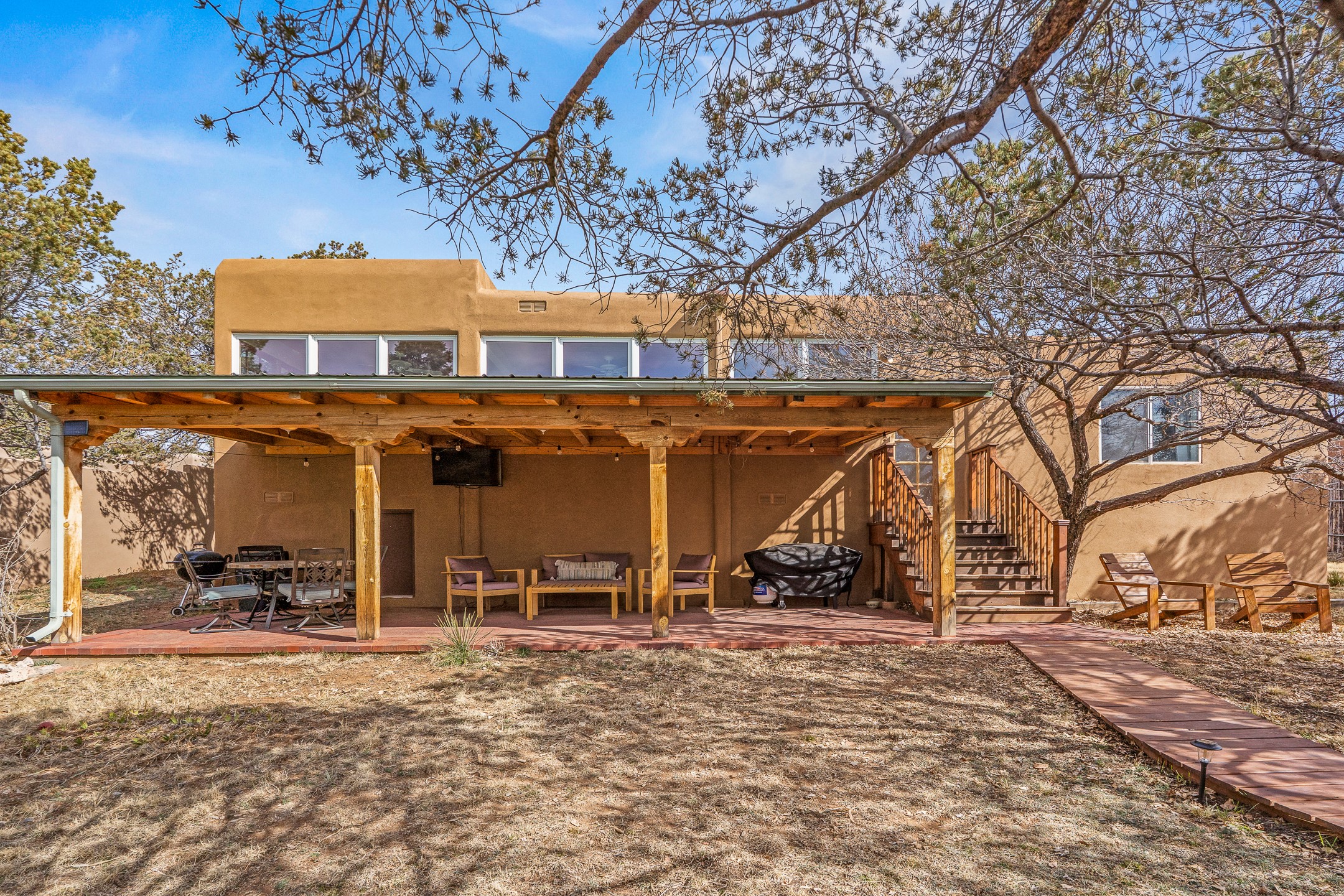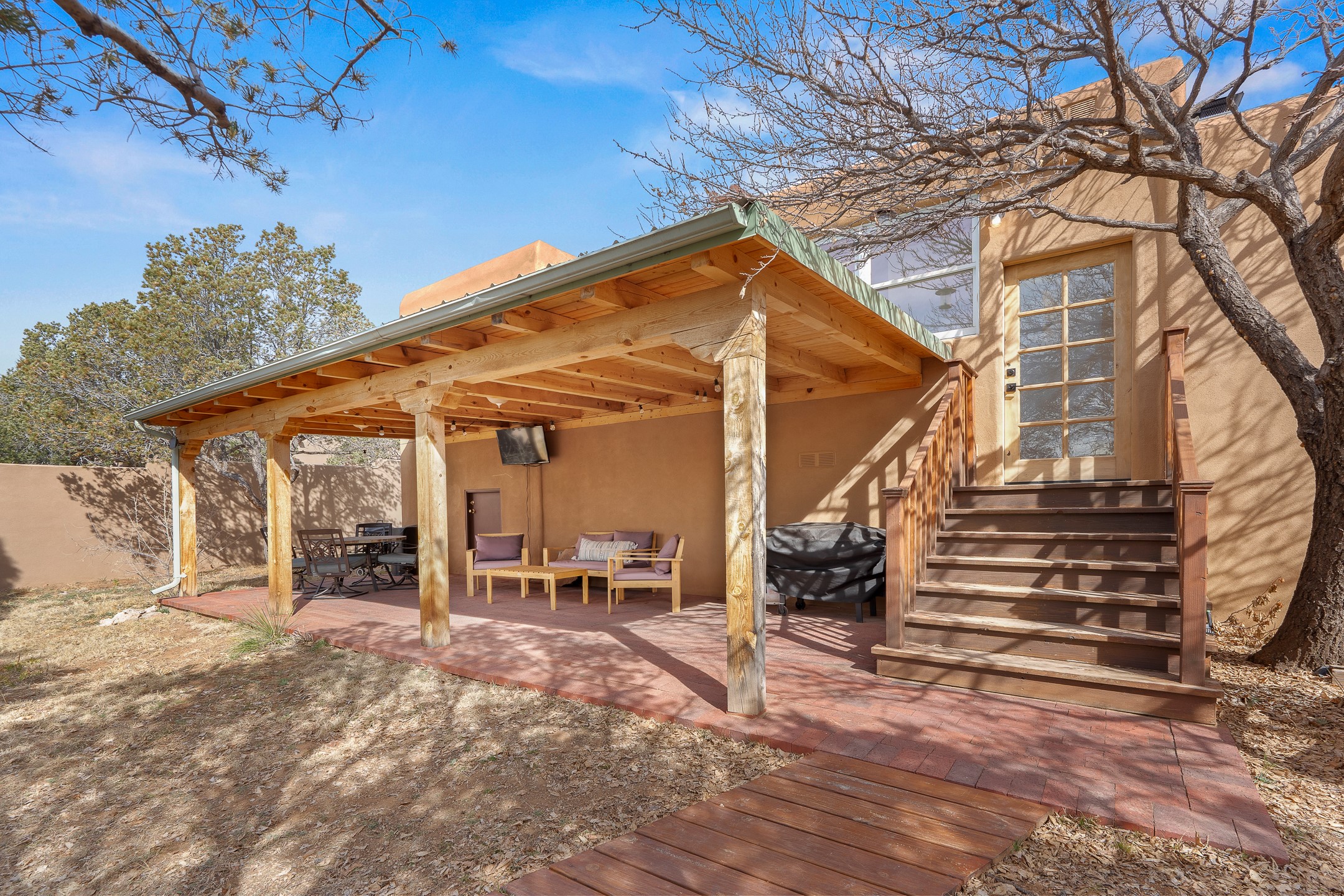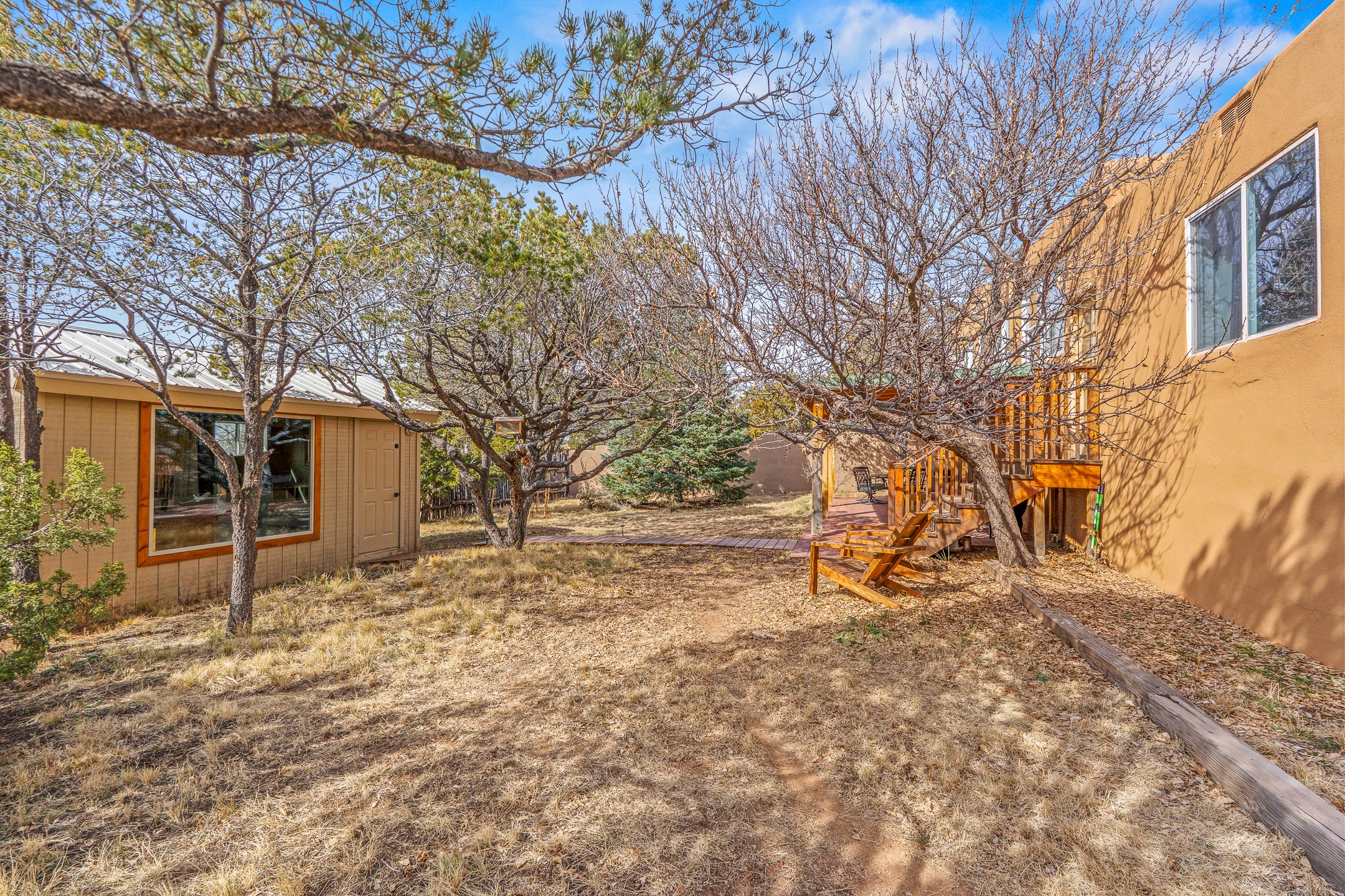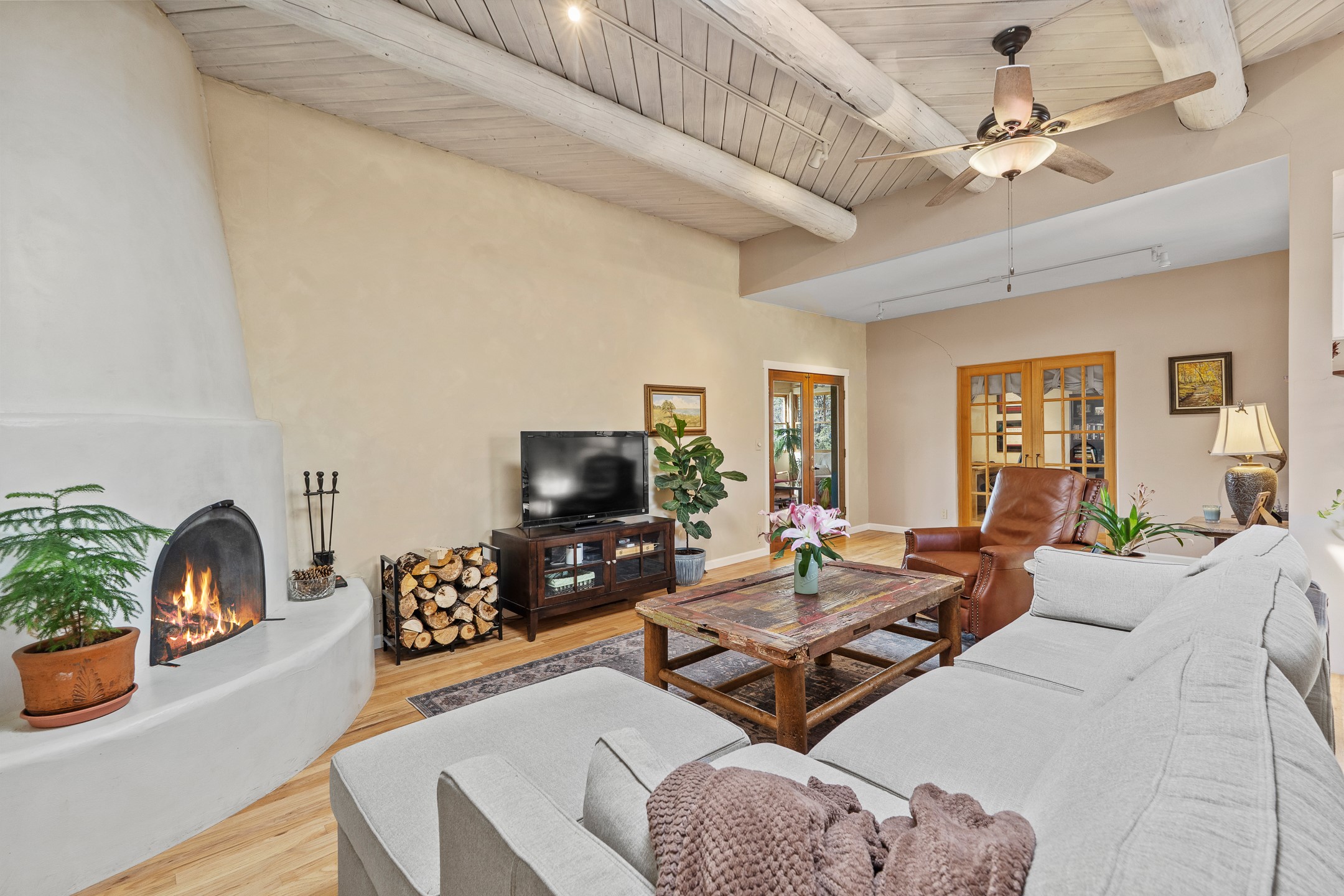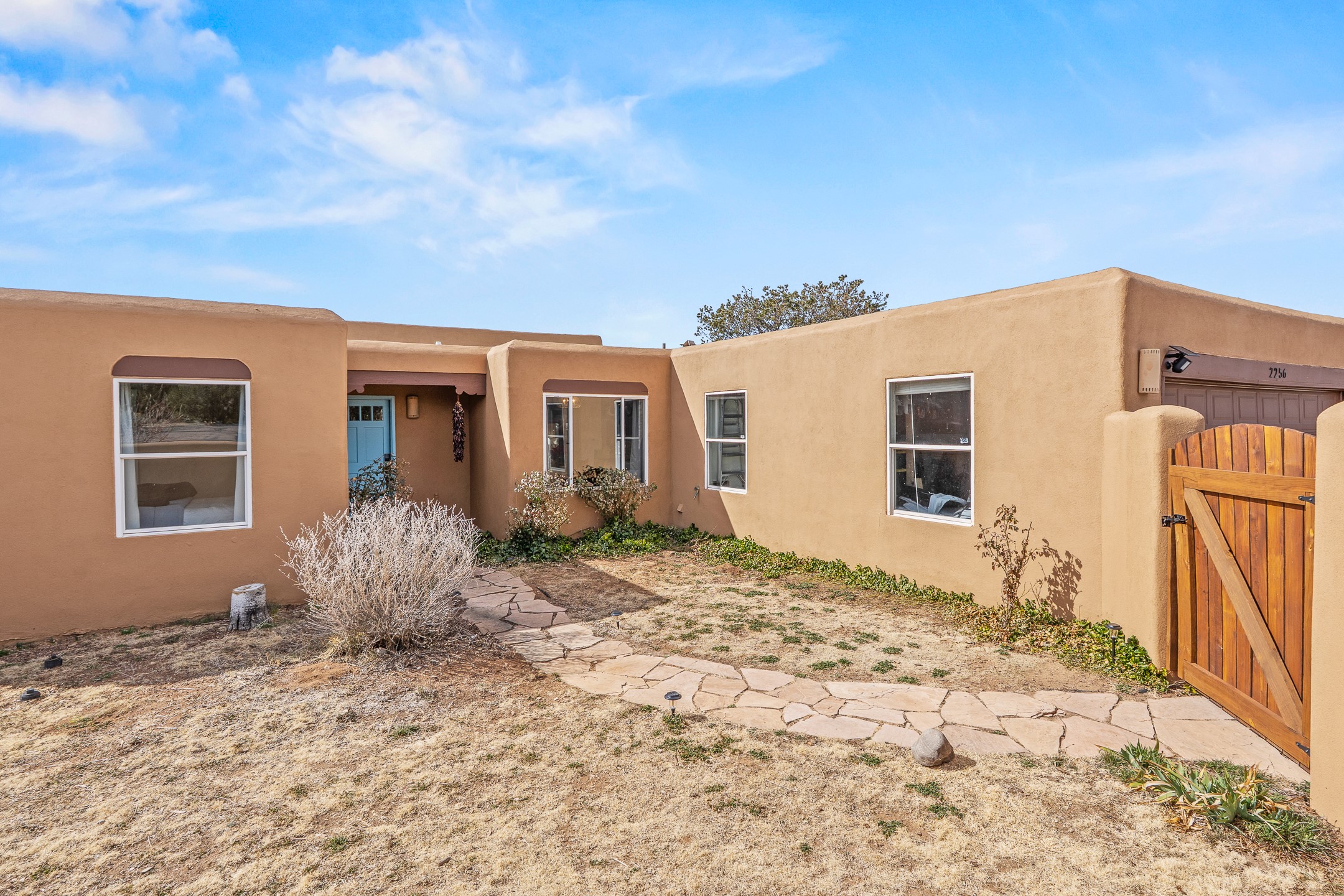 This beautifully renovated 2,025 sq. ft. home in Devargas Heights, just off Old Pecos Trail, is warm, inviting, and exceptionally versatile. Offering 2 bedrooms, 2 full baths, a dedicated office/bonus room within the main house, and a separate 140 sq. ft. detached studio currently used as an office, the layout supports today's flexible lifestyles with ease.The living room is filled with natural light, accented by classic vigas and a charming corner kiva fireplace. The kitchen features beautifully tiled countertops and white cabinetry, and the open-concept design seamlessly connects the kitchen, dining, and living areas. From the dining room, enjoy lovely views of Sun Mountain. An unexpected bonus is the approximately 300 sq. ft. west-facing secondary living area--bathed in light and perfect for relaxing, reading, or entertaining.The primary bath has been completely reimagined with double vanities, a glass-enclosed walk-in shower, and a sculptural vessel soaking tub. The guest bedroom and completely renovated guest bath are thoughtfully separated from the primary suite and reflect the same level of care and quality in the renovation. Outside, the large fenced backyard has beautifully manicured pions, an apricot tree, a large spruce tree and feels private and serene. A deep covered portal extends the living space outdoors, while a winding path leads to the detached studio, adding a touch of whimsy to this already special property.Located in the coveted Devargas Heights neighborhood and within the Wood Gormley school district, this renovated home offers comfort, flexibility, and exceptional value.
