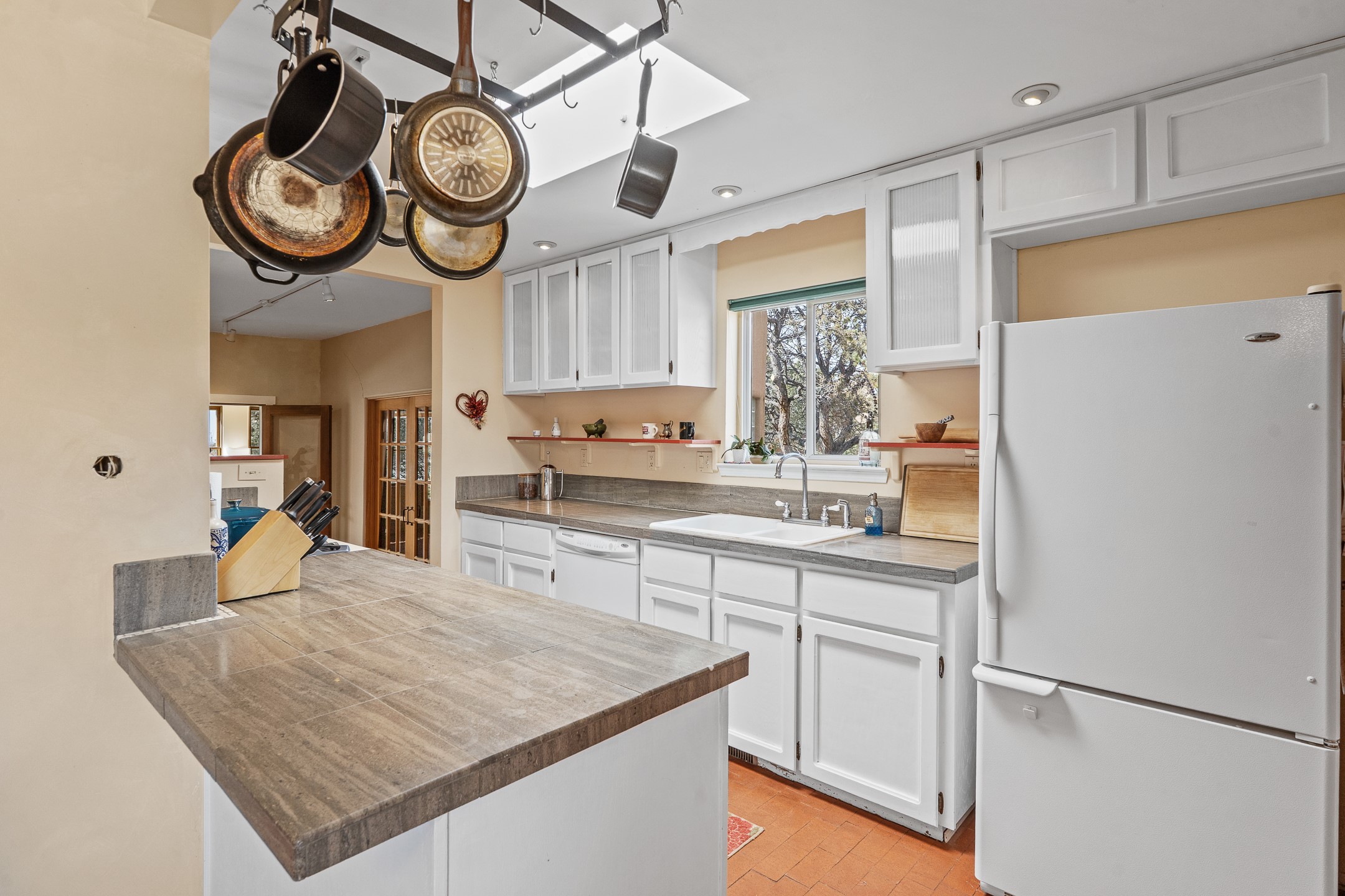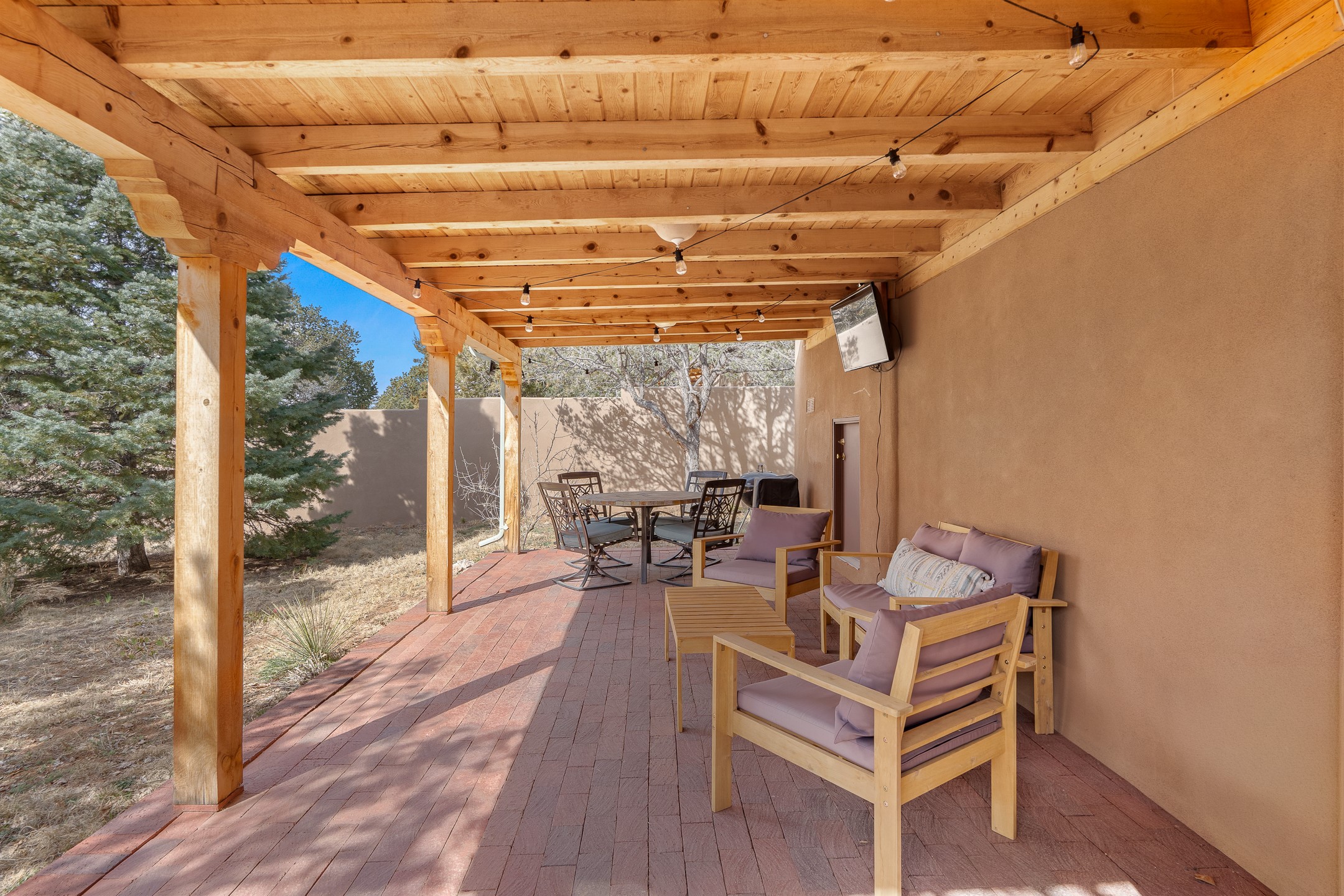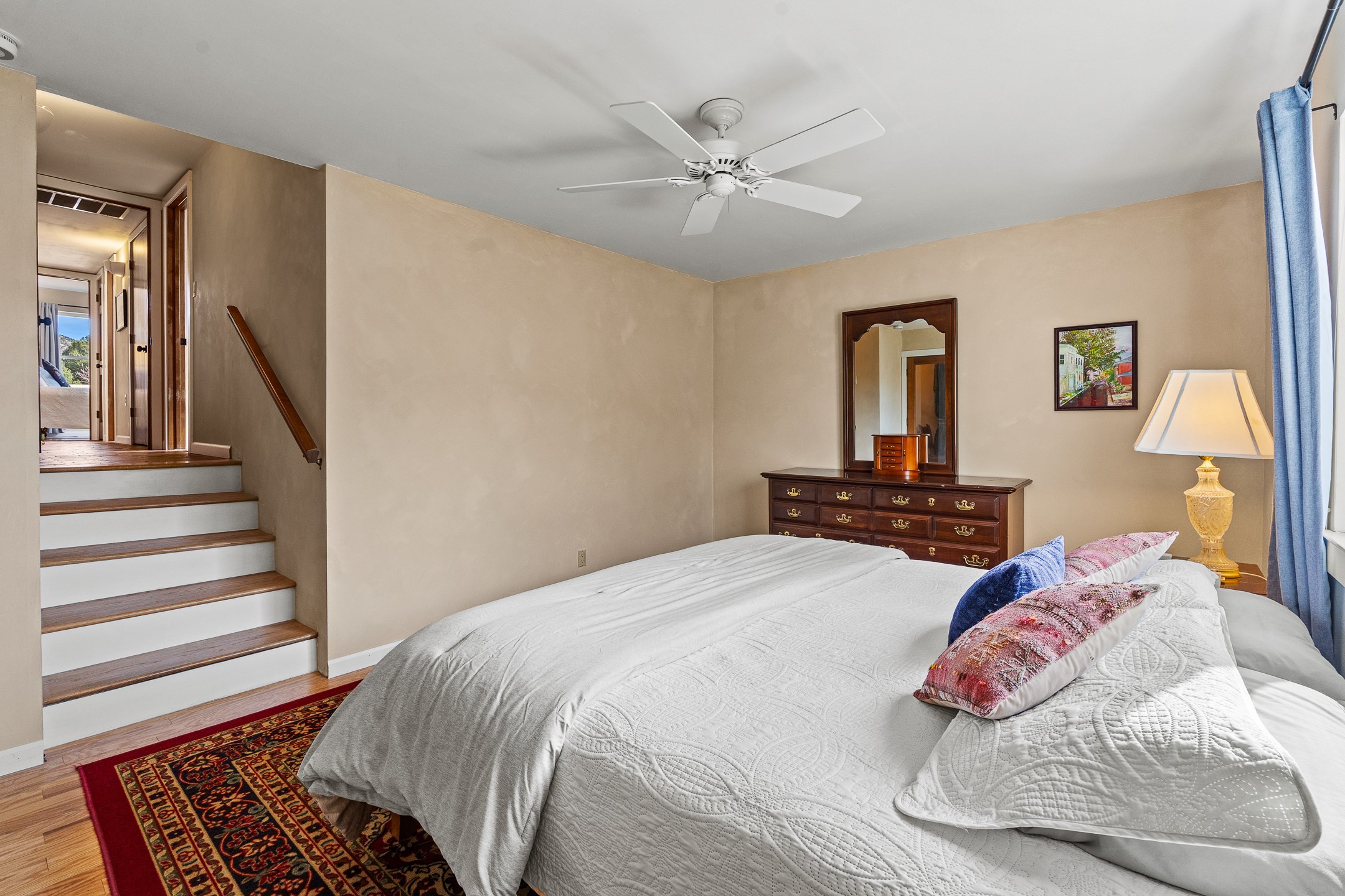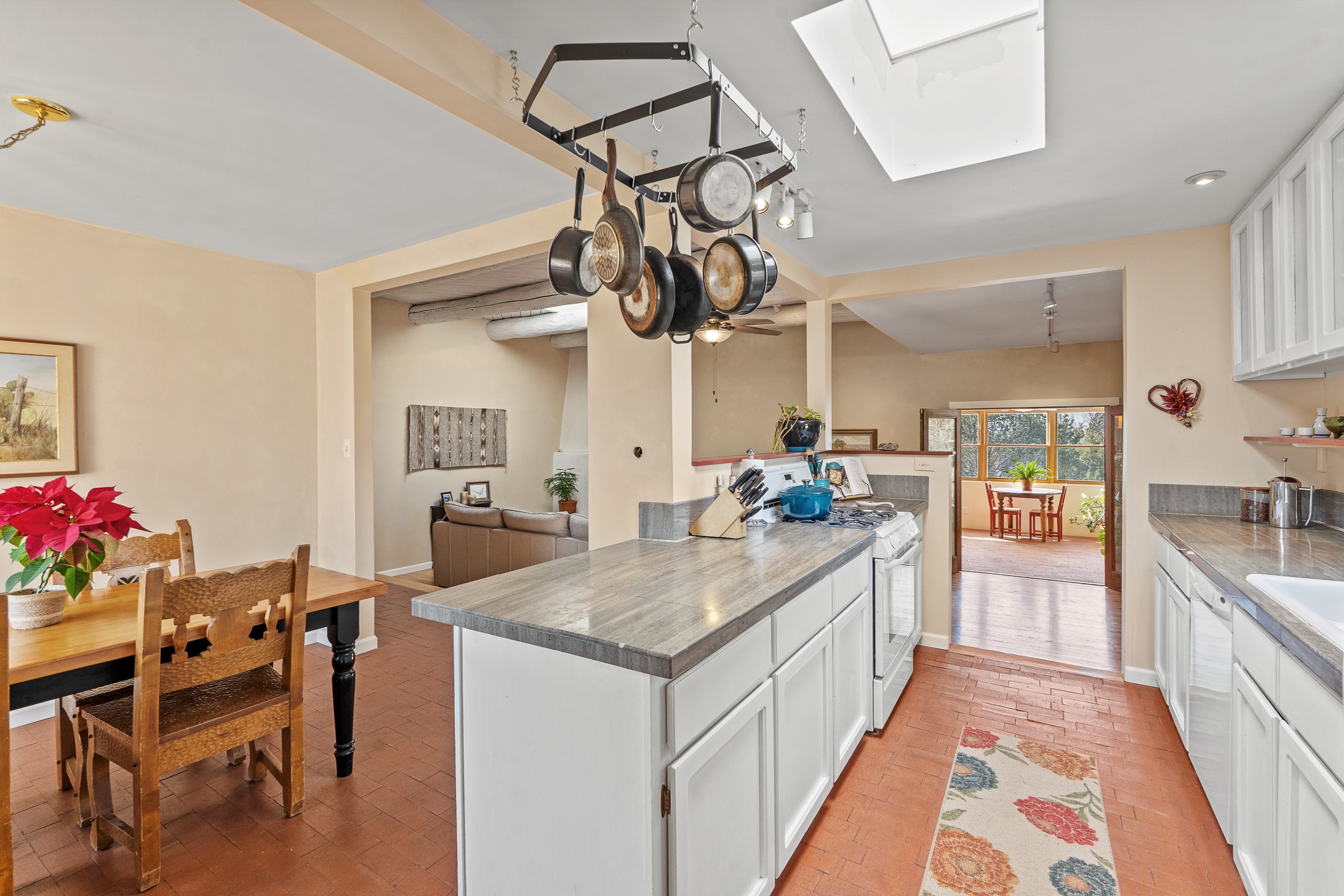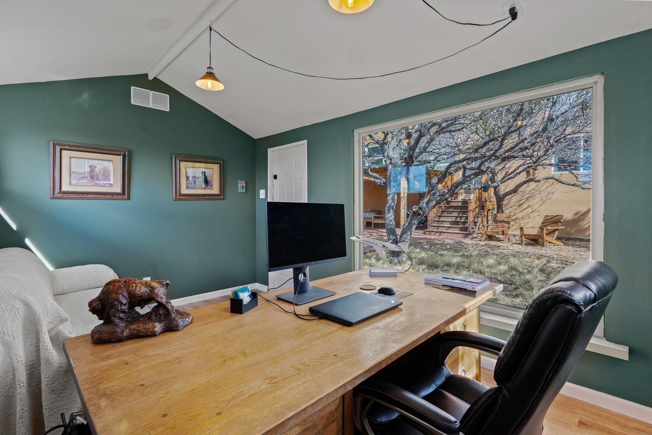 This beautifully renovated 2,025 sq. ft. home in Devargas Heights, just off Old Pecos Trail, is warm, inviting, and exceptionally versatile. Offering 2 bedrooms, 2 full baths, a dedicated office/bonus room within the main house, and a separate 140 sq. ft. detached studio currently used as an office, the layout supports today's flexible lifestyles with ease.The living room is filled with natural light, accented by classic vigas and a charming corner kiva fireplace. The kitchen features beautifully tiled countertops and white cabinetry, and the open-concept design seamlessly connects the kitchen, dining, and living areas. From the dining room, enjoy lovely views of Sun Mountain. An unexpected bonus is the approximately 300 sq. ft. west-facing secondary living area--bathed in light and perfect for relaxing, reading, or entertaining.The primary bath has been completely reimagined with double vanities, a glass-enclosed walk-in shower, and a sculptural vessel soaking tub. The guest bedroom and completely renovated guest bath are thoughtfully separated from the primary suite and reflect the same level of care and quality in the renovation. Outside, the large fenced backyard has beautifully manicured pions, an apricot tree, a large spruce tree and feels private and serene. A deep covered portal extends the living space outdoors, while a winding path leads to the detached studio, adding a touch of whimsy to this already special property.Located in the coveted Devargas Heights neighborhood and within the Wood Gormley school district, this renovated home offers comfort, flexibility, and exceptional value.