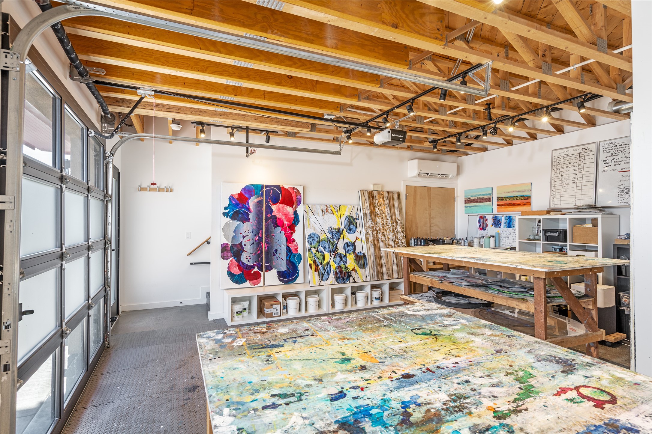 Corner unit with a wraparound balcony and mountain views in central Santa Fe, built in 2022 and lightly used, offering modern loft living and an ideal work-from-home setup. Approximately 1,126 square feet across two levels with an even split between floors, the east- and south-facing orientation fills the space with natural light throughout the day. Upstairs features an open studio-style living area, a luxury bathroom, and access to a private balcony to take in the mountain views. The kitchen is well-appointed with quartz countertops, subway tile backsplash, full-size appliances, and ample space for cooking. Downstairs showcases concrete floors, an ADA-compliant bathroom, large glass roll-up garage door, and useful storage closets, creating flexible space for work, studio, or showroom use. Both floors are equipped with mini-splits, blinds, ceiling fans, track lighting, and smooth drywall. Energy-efficient features include an on-demand water heater and two dedicated grid-tied solar panels. Washer and dryer hookups are in place (existing washer and dryer do not convey), and the Murphy bed conveys, yet mattress does not. Hardwired for high-speed cable. HOA dues are $225 per month and include dumpster service, parking, landscaping, exterior building maintenance, and insurance, with an estimated $700 HOA sign-up fee.