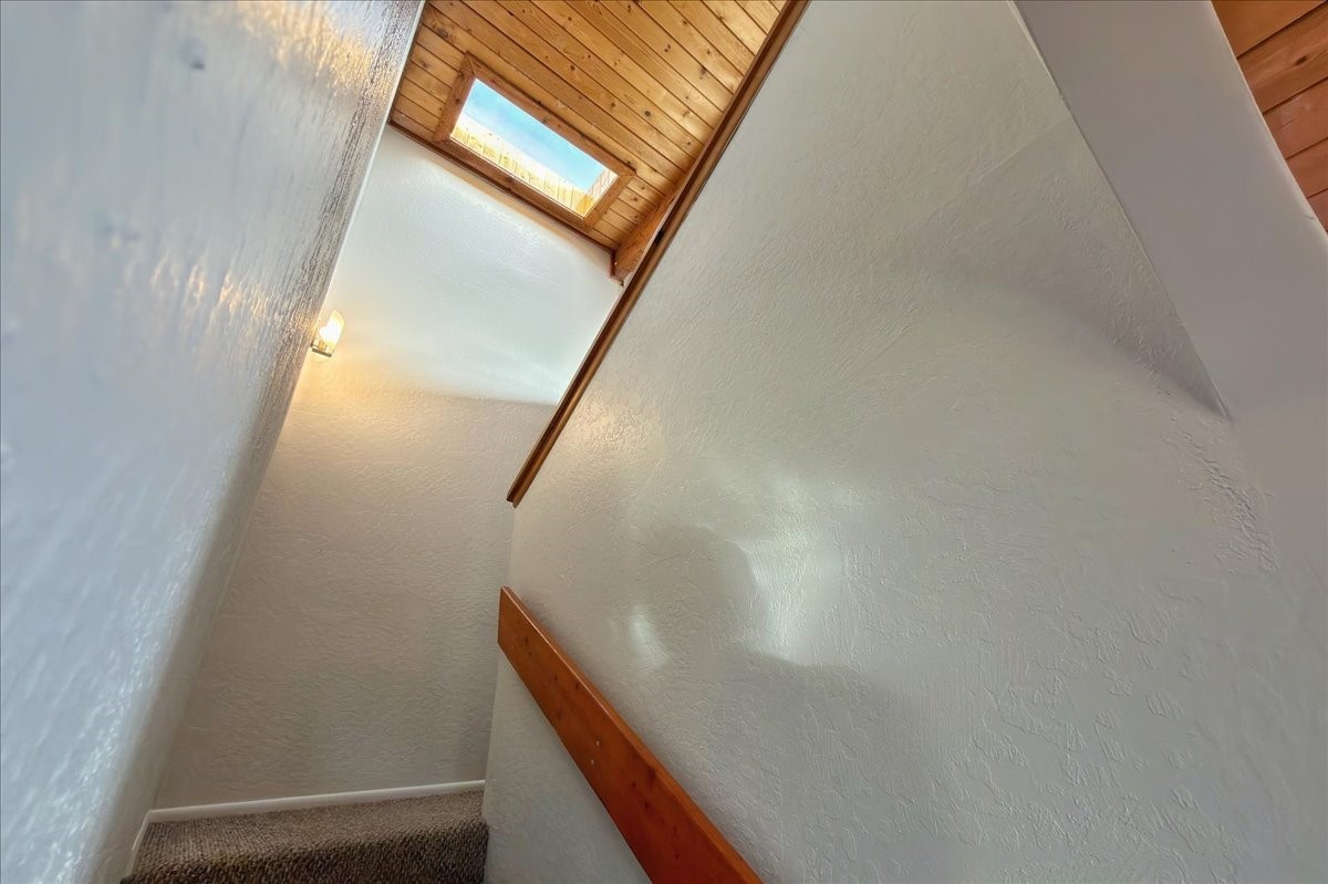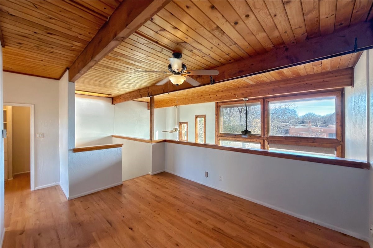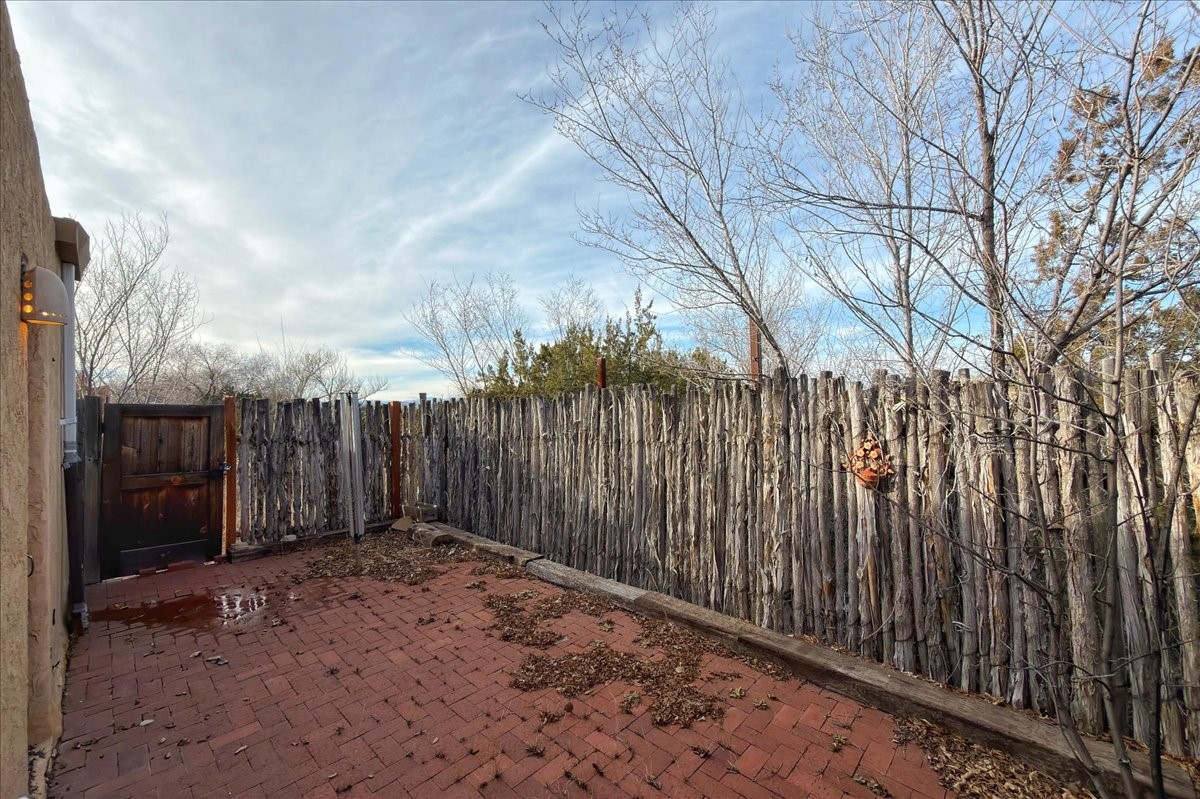 Beautifully remodeled end-unit townhome filled with warmth, light, and classic Santa Fe character. Designed with passive solar orientation, the open and inviting home is bathed in natural light, seamlessly connecting the kitchen, dining, and living areas--perfect for everyday living or entertaining.Two bedrooms and a fully remodeled bath are conveniently located on the main floor, while the private upstairs primary suite features a walk-in closet and hardwood oak flooring. Brick floors on the main level add charm and easy maintenance, complemented by wood beams and tongue-and-groove ceilings that create a timeless Southwestern feel.The thoughtfully redesigned kitchen showcases rich hardwood cabinetry, granite countertops, and a spacious island with added storage. Upgraded Andersen wood windows enhance energy efficiency while framing stunning sunset and Jemez Mountain views from the kitchen.A detached, fully finished two-car garage with built-in cabinetry provides exceptional storage and functionality. Whether you're seeking a primary residence or a Santa Fe retreat, this inviting home offers comfort, style, and unforgettable views.