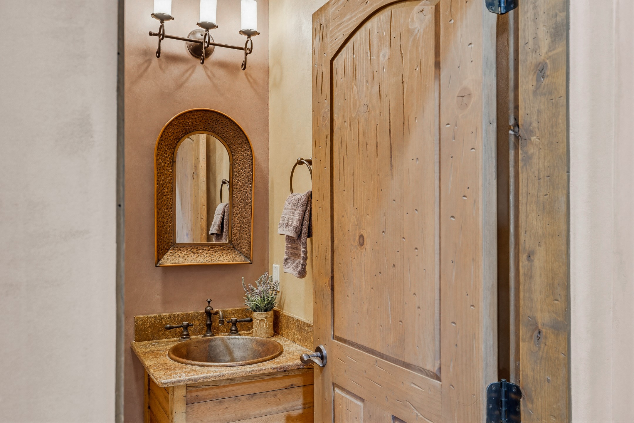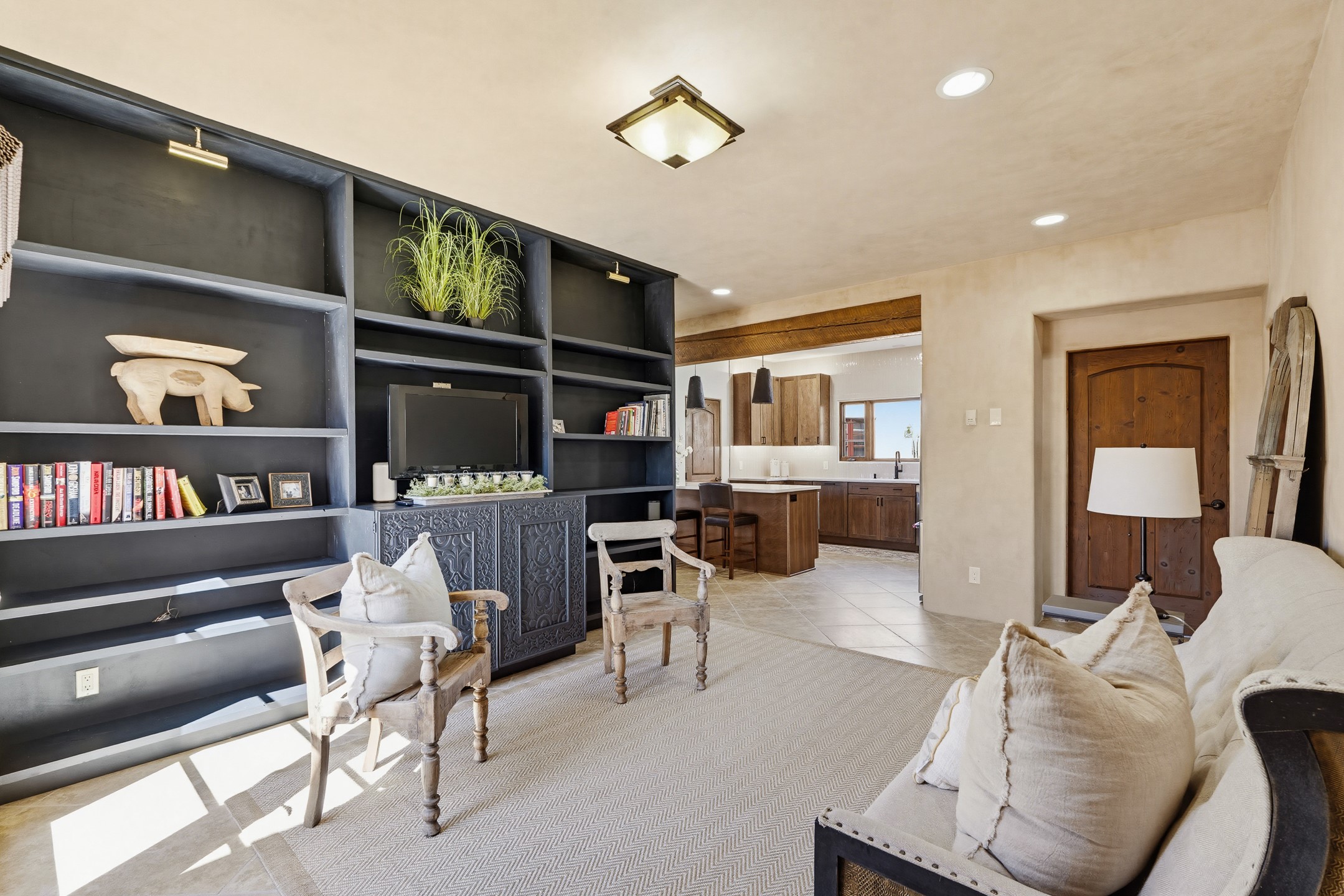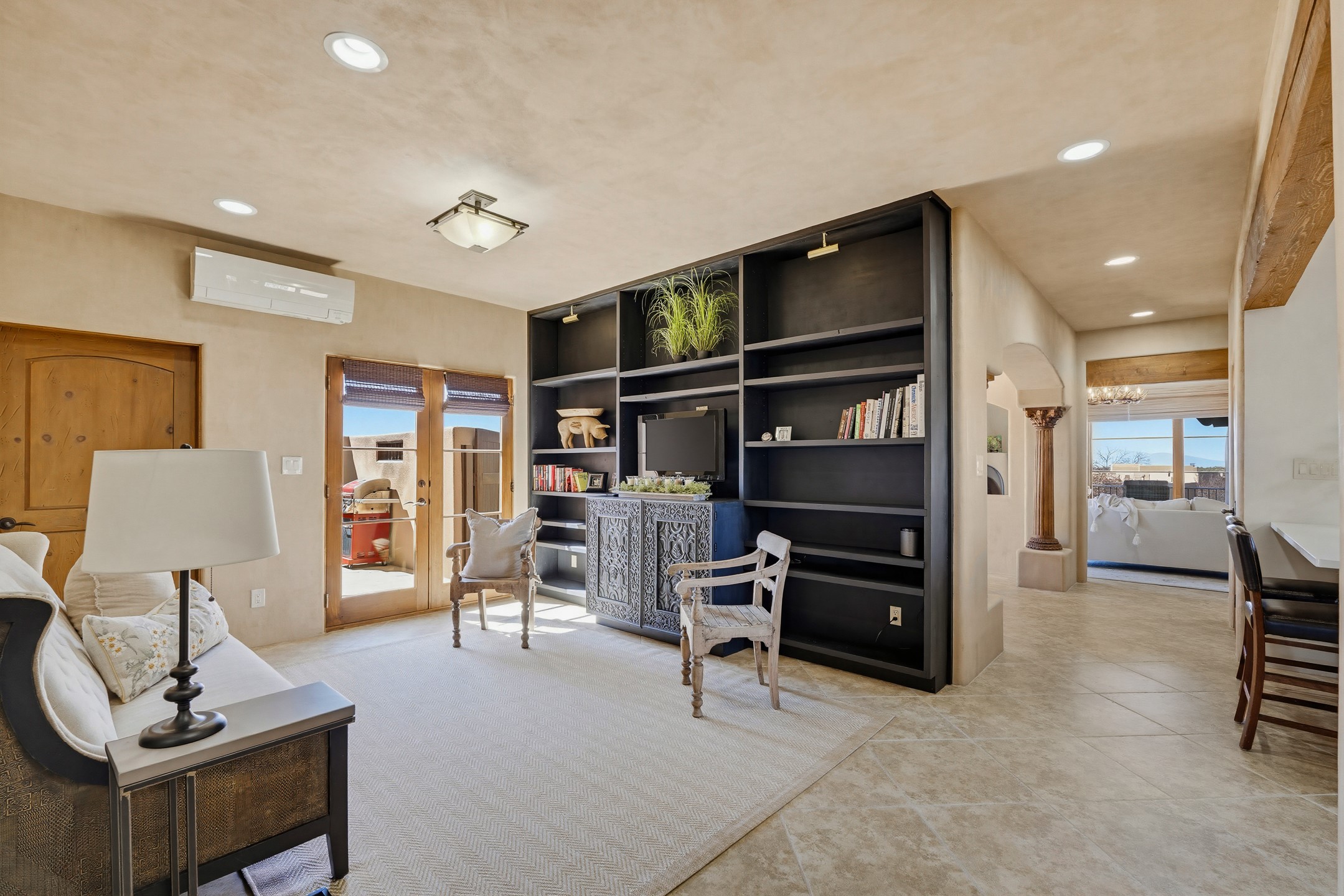 Experience refined Santa Fe living in this beautifully updated 3-bedroom, 2.5-bath Pueblo-style home in Aldea de Santa Fe. Perfectly positioned to capture sweeping views of the Jemez, Sangre de Cristo, and Sandia Mountains, this home offers a warm and sophisticated atmosphere with classic viga ceilings, lovely earth-colored plastered walls, and view-filled windows throughout. The welcoming living room is anchored by a corner kiva fireplace, creating an inviting space to relax and entertain.The reimagined and fully remodeled kitchen features new cabinetry, countertops, appliances, tile, and fixtures, blending style and functionality. It opens to a cozy library/media room with built-in bookcases and an entertainment center--an ideal space for gathering or quiet evenings at home.The entire second floor is dedicated to the spacious primary suite, complete with a spa-like bathroom featuring a soaking tub, walk-in shower, and French doors that open to a private balcony with breathtaking mountain views.Recent upgrades throughout the home enhance both beauty and comfort, including refreshed interior doors finished with a modern stain, updated lighting, and thoughtful aesthetic improvements. Outdoor living spaces are equally inviting, featuring a remodeled patio and refreshed landscaping with a flagstone patio and raised flower beds, perfect for enjoying Santa Fe's spectacular sunsets and outdoor lifestyle. The front portal features an outdoor kiva fireplace for cozy evenings.Additional features include radiant floor heating, mini-split AC for year-round comfort, a new 2024 GacoFlex silicone membrane roof, freshly painted elastomeric stucco exterior, and a spacious two-car attached garage with ample storage.Located in the desirable Aldea community, residents enjoy walking trails, parks, tennis, pickleball and basketball courts, and abundant open space in this peaceful, nature-filled setting just minutes from downtown Santa Fe.
