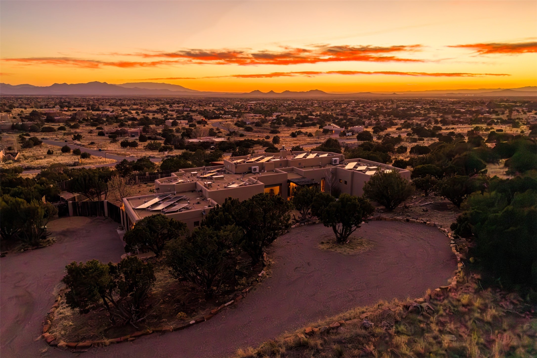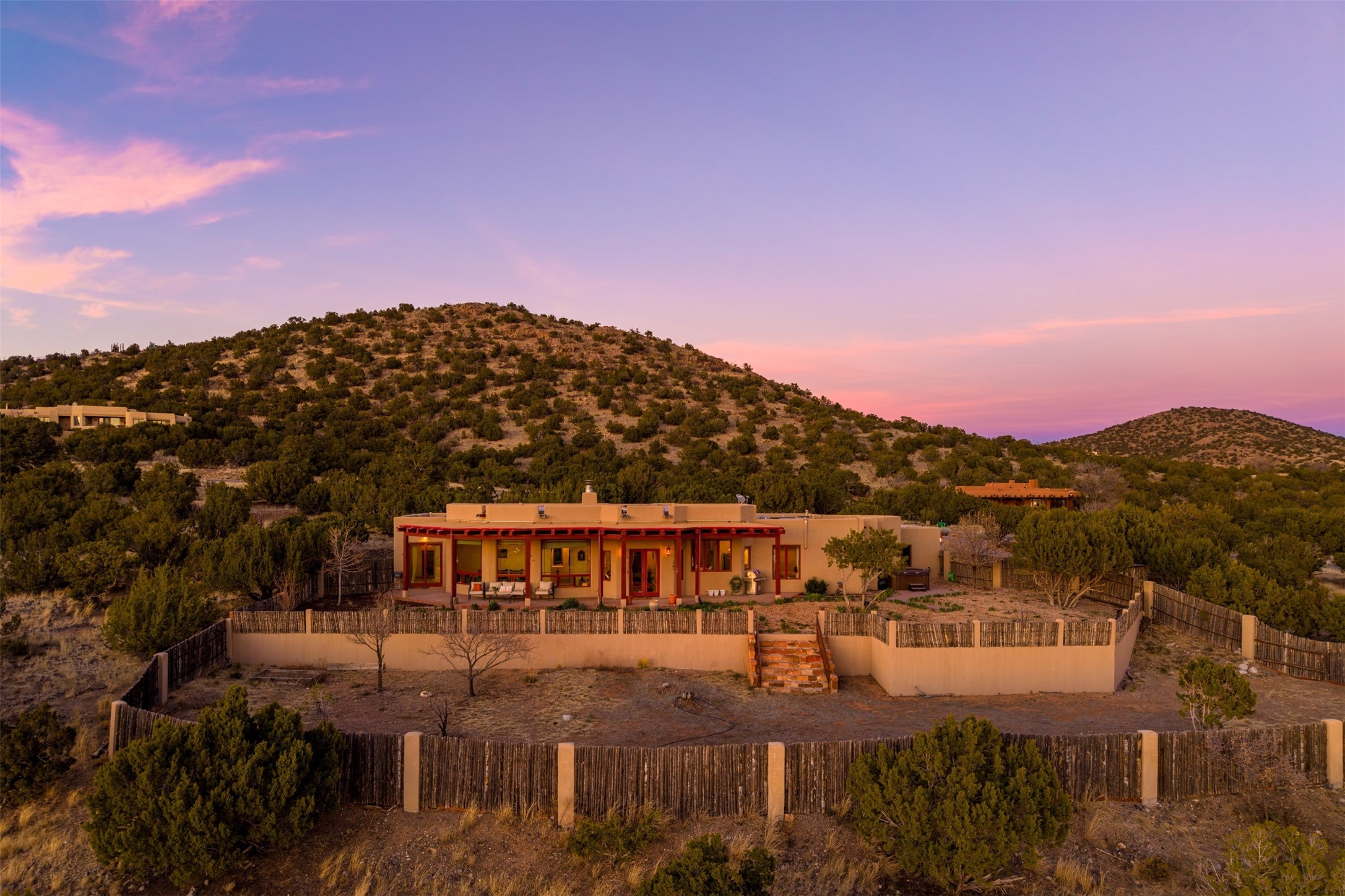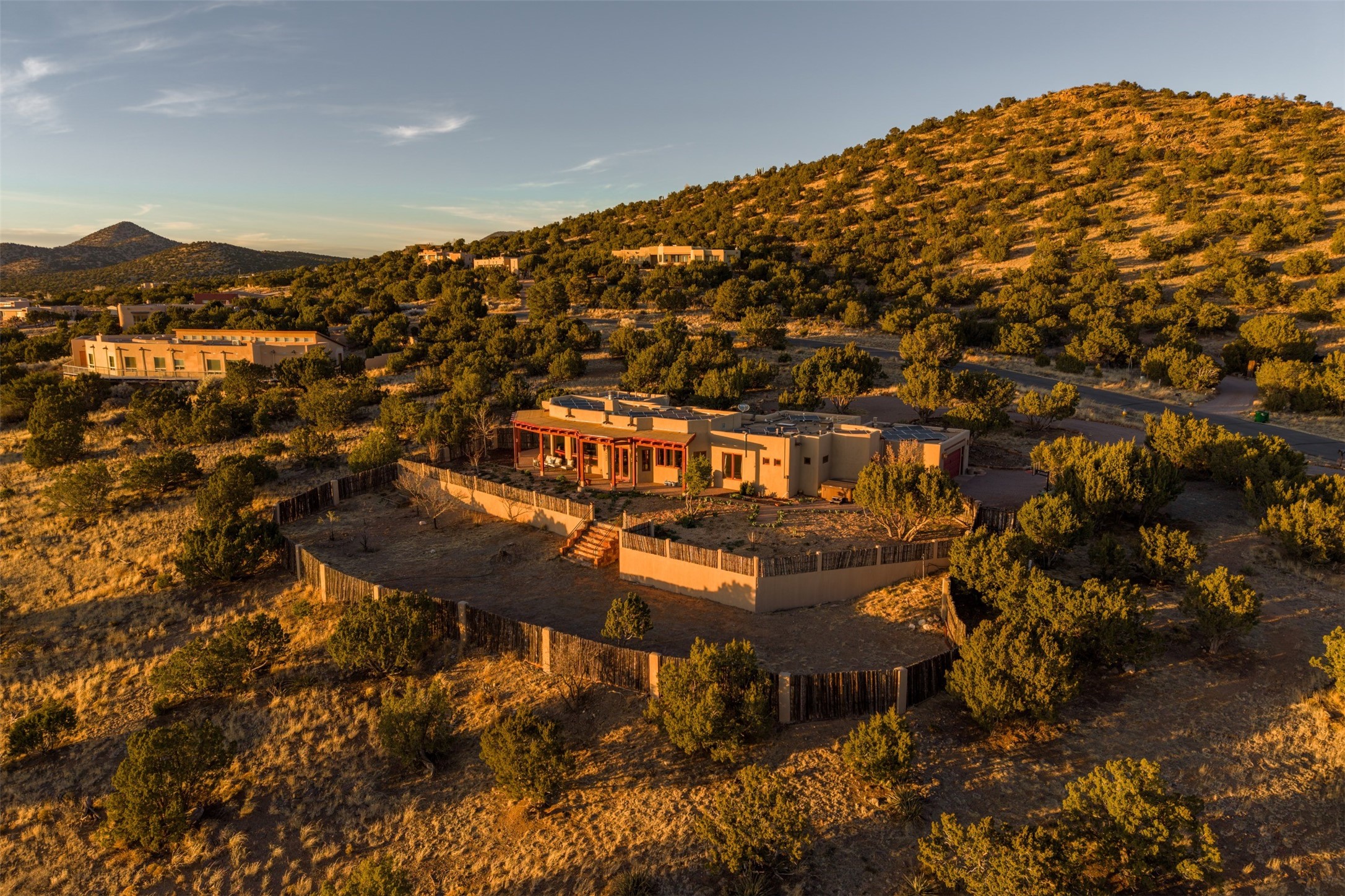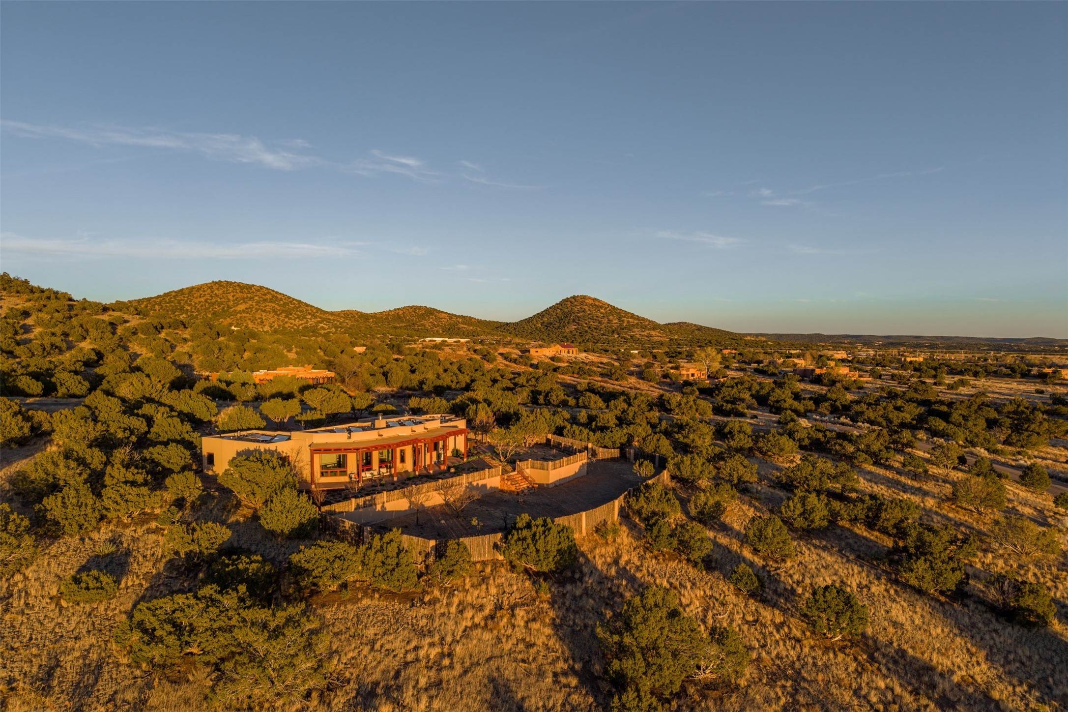 Immaculate and soulful, this single-level residence is beautifully finished with a timeless old-world aesthetic, offering a refined interpretation of Santa Fe living. Featuring 3 bedrooms and 3 baths (one full, one three-quarter, and one half), along with two versatile flex spaces, the home is set on a private and expansive 3.93-acre lot. Thoughtfully designed for both comfort and privacy, the well-conceived floor plan separates the guest suites and the primary suite into distinct wings. Tucked away on a quiet street in the coveted Los Griegos subdivision--just 20 minutes from downtown Santa Fe--this 2007 Archetypes Homescapes residence is perfectly sited to capture sweeping, unobstructed views. Inside, authentic craftsmanship and rich character define the interiors, with hand-troweled plaster walls, warm tile flooring, and striking wood-beamed ceilings throughout. Mesquite Mexican doors and custom cabinetry add depth and artistry. The open-concept living space is anchored by a dramatic fireplace, creating an inviting yet sophisticated focal point. The kitchen is both functional and elegant, featuring granite countertops, stainless steel appliances, and a wine refrigerator. The primary suite offers a serene, private retreat with a spacious walk-in closet and a spa-like bath complete with a deep soaking tub. Modern comforts are seamlessly integrated, including radiant floor heating and mini-split cooling systems for year-round climate control. Sustainability is enhanced by a 24-panel photovoltaic solar array and energy-efficient Rastra construction. Outdoors, an expansive wraparound rear portal invites relaxed living and unforgettable sunset views across the surrounding landscape. The fully coyote-fenced backyard provides both privacy and security, completing this exceptional offering that blends timeless elegance with the natural beauty of Northern New Mexico.