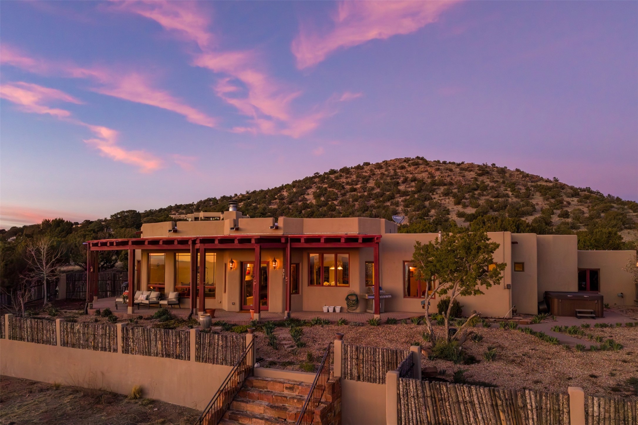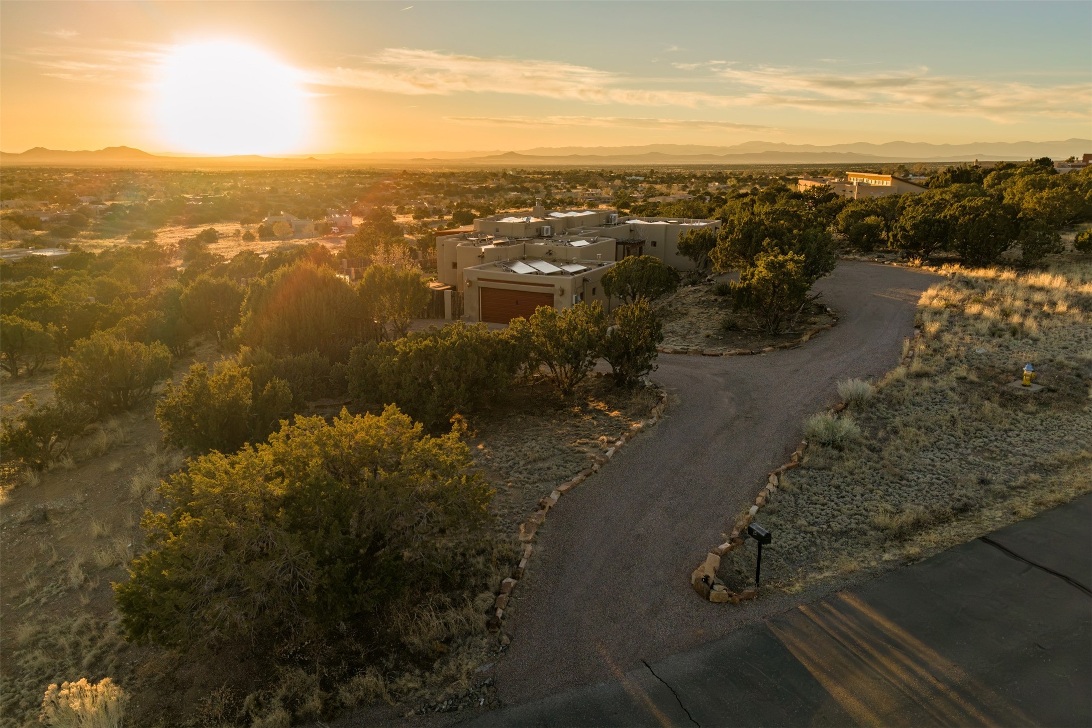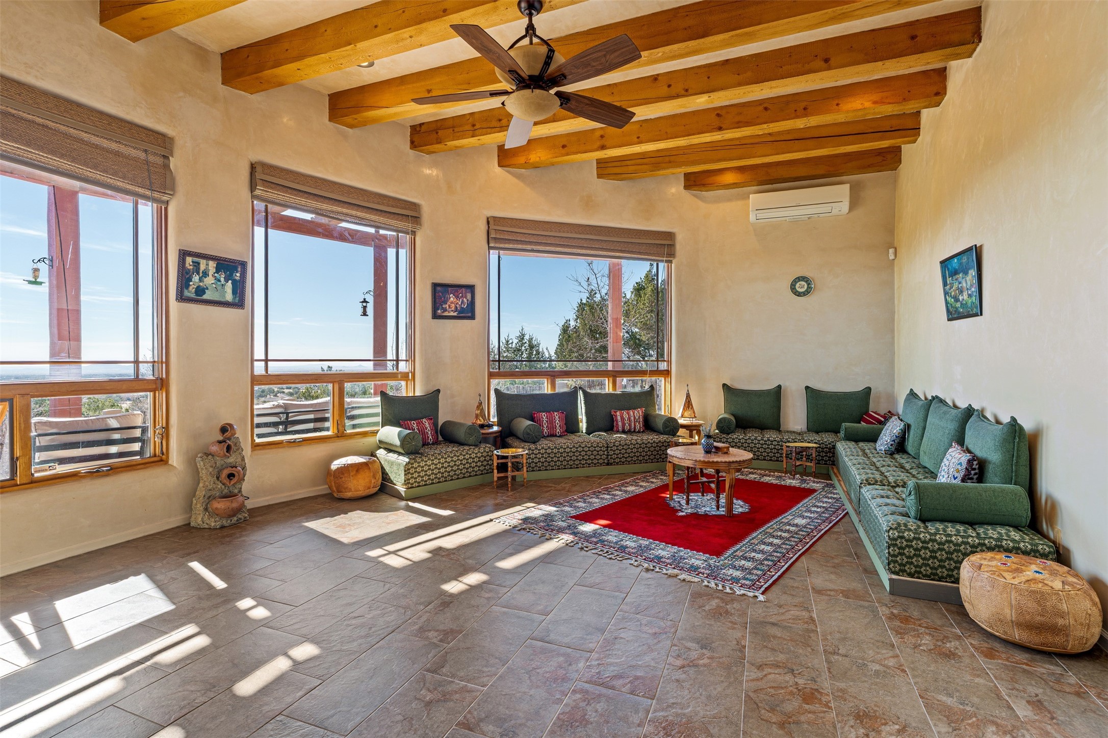 Immaculate and soulful, this single-level residence is beautifully finished with a timeless old-world aesthetic, offering a refined interpretation of Santa Fe living. Featuring 3 bedrooms and 3 baths (one full, one three-quarter, and one half), along with two versatile flex spaces, the home is set on a private and expansive 3.93-acre lot. Thoughtfully designed for both comfort and privacy, the well-conceived floor plan separates the guest suites and the primary suite into distinct wings. Tucked away on a quiet street in the coveted Los Griegos subdivision--just 20 minutes from downtown Santa Fe--this 2007 Archetypes Homescapes residence is perfectly sited to capture sweeping, unobstructed views. Inside, authentic craftsmanship and rich character define the interiors, with hand-troweled plaster walls, warm tile flooring, and striking wood-beamed ceilings throughout. Mesquite Mexican doors and custom cabinetry add depth and artistry. The open-concept living space is anchored by a dramatic fireplace, creating an inviting yet sophisticated focal point. The kitchen is both functional and elegant, featuring granite countertops, stainless steel appliances, and a wine refrigerator. The primary suite offers a serene, private retreat with a spacious walk-in closet and a spa-like bath complete with a deep soaking tub. Modern comforts are seamlessly integrated, including radiant floor heating and mini-split cooling systems for year-round climate control. Sustainability is enhanced by a 24-panel photovoltaic solar array and energy-efficient Rastra construction. Outdoors, an expansive wraparound rear portal invites relaxed living and unforgettable sunset views across the surrounding landscape. The fully coyote-fenced backyard provides both privacy and security, completing this exceptional offering that blends timeless elegance with the natural beauty of Northern New Mexico.