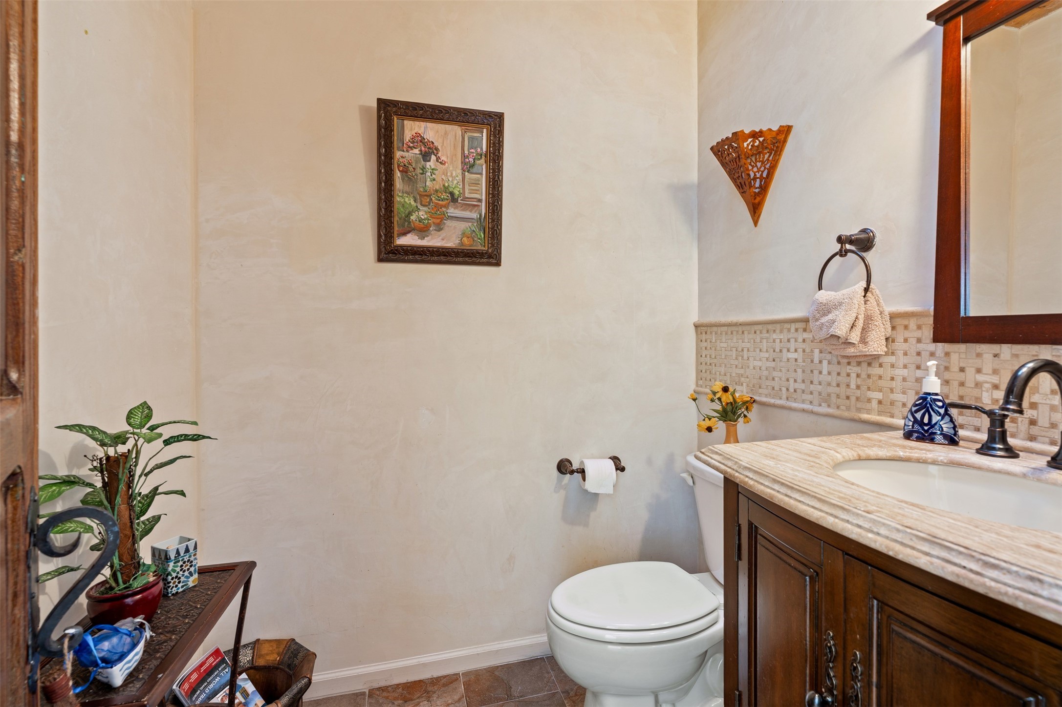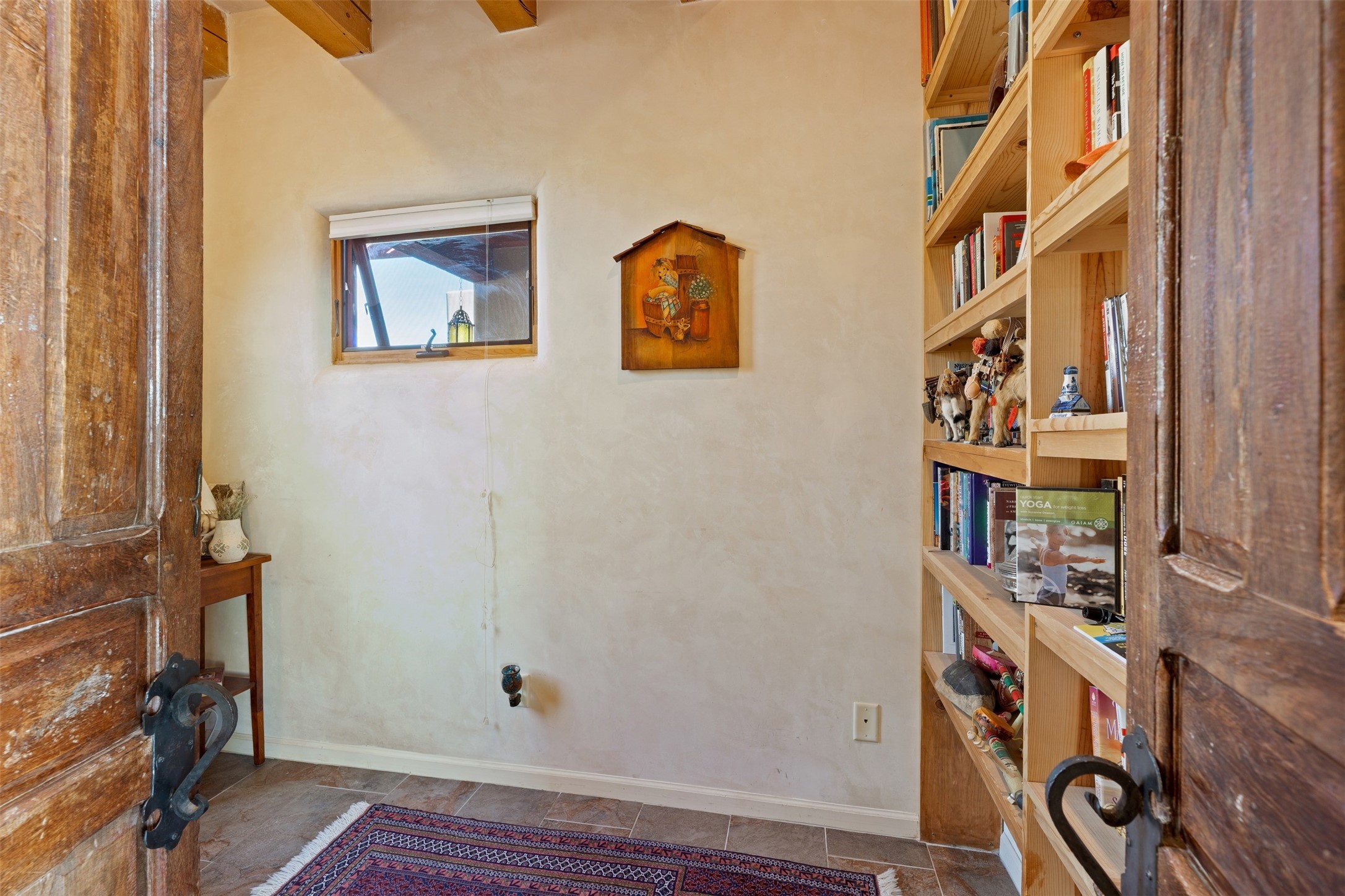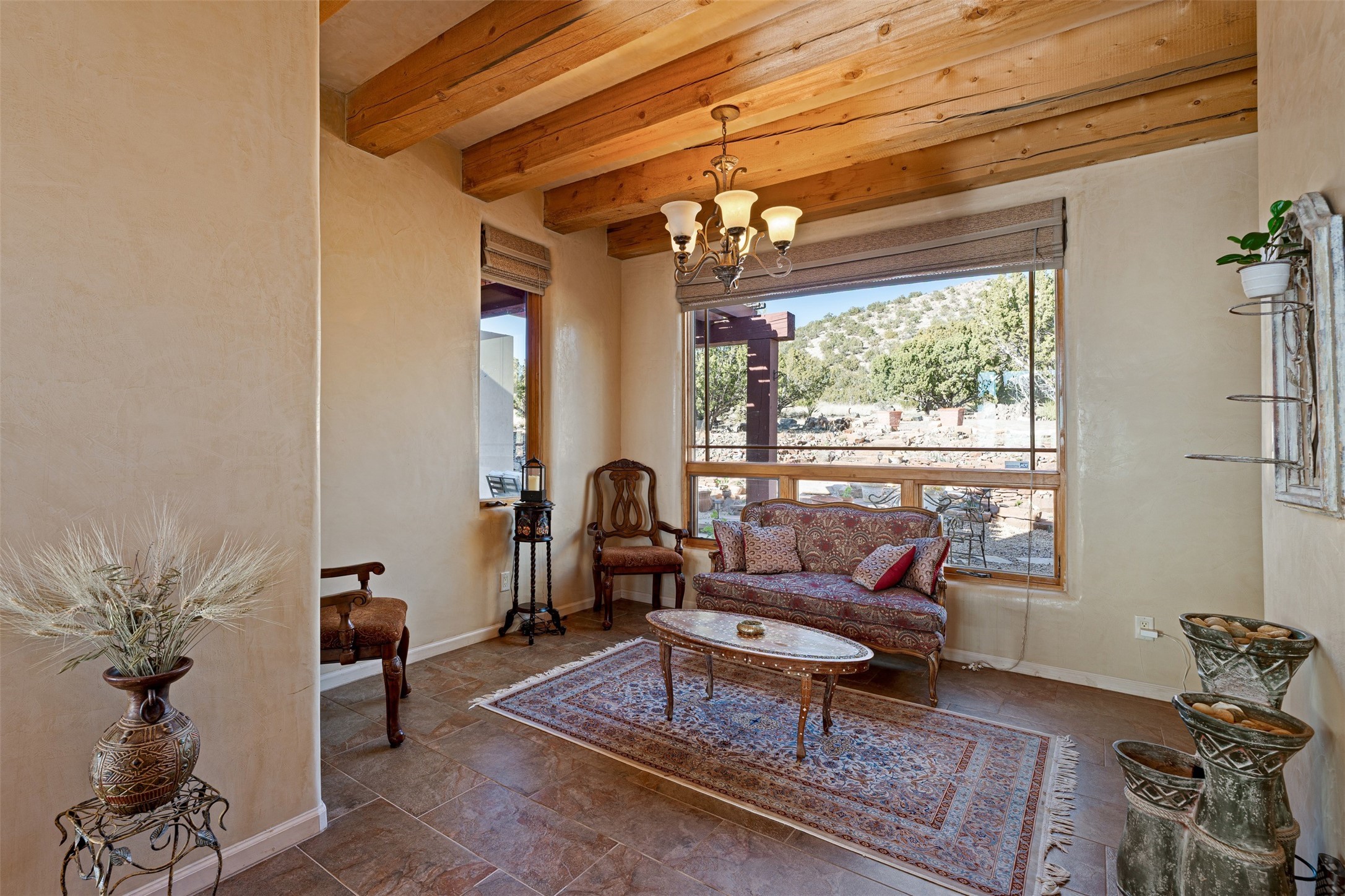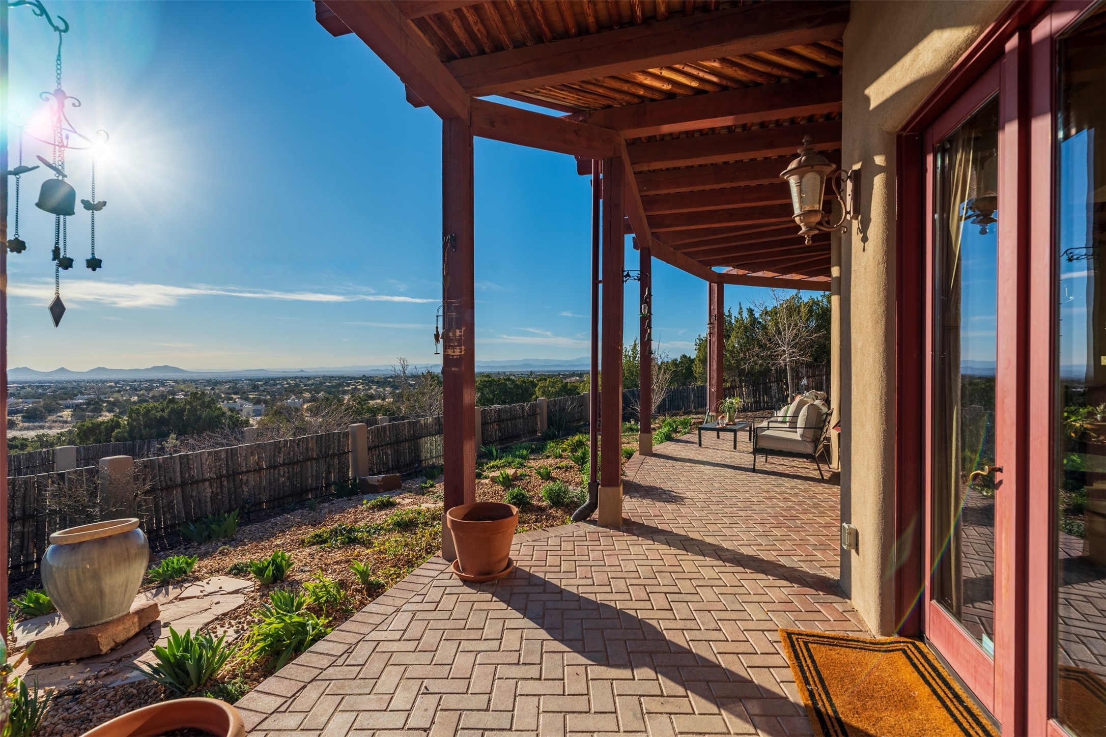 Immaculate and soulful, this single-level residence is beautifully finished with a timeless old-world aesthetic, offering a refined interpretation of Santa Fe living. Featuring 3 bedrooms and 3 baths (one full, one three-quarter, and one half), along with two versatile flex spaces, the home is set on a private and expansive 3.93-acre lot. Thoughtfully designed for both comfort and privacy, the well-conceived floor plan separates the guest suites and the primary suite into distinct wings. Tucked away on a quiet street in the coveted Los Griegos subdivision--just 20 minutes from downtown Santa Fe--this 2007 Archetypes Homescapes residence is perfectly sited to capture sweeping, unobstructed views. Inside, authentic craftsmanship and rich character define the interiors, with hand-troweled plaster walls, warm tile flooring, and striking wood-beamed ceilings throughout. Mesquite Mexican doors and custom cabinetry add depth and artistry. The open-concept living space is anchored by a dramatic fireplace, creating an inviting yet sophisticated focal point. The kitchen is both functional and elegant, featuring granite countertops, stainless steel appliances, and a wine refrigerator. The primary suite offers a serene, private retreat with a spacious walk-in closet and a spa-like bath complete with a deep soaking tub. Modern comforts are seamlessly integrated, including radiant floor heating and mini-split cooling systems for year-round climate control. Sustainability is enhanced by a 24-panel photovoltaic solar array and energy-efficient Rastra construction. Outdoors, an expansive wraparound rear portal invites relaxed living and unforgettable sunset views across the surrounding landscape. The fully coyote-fenced backyard provides both privacy and security, completing this exceptional offering that blends timeless elegance with the natural beauty of Northern New Mexico.