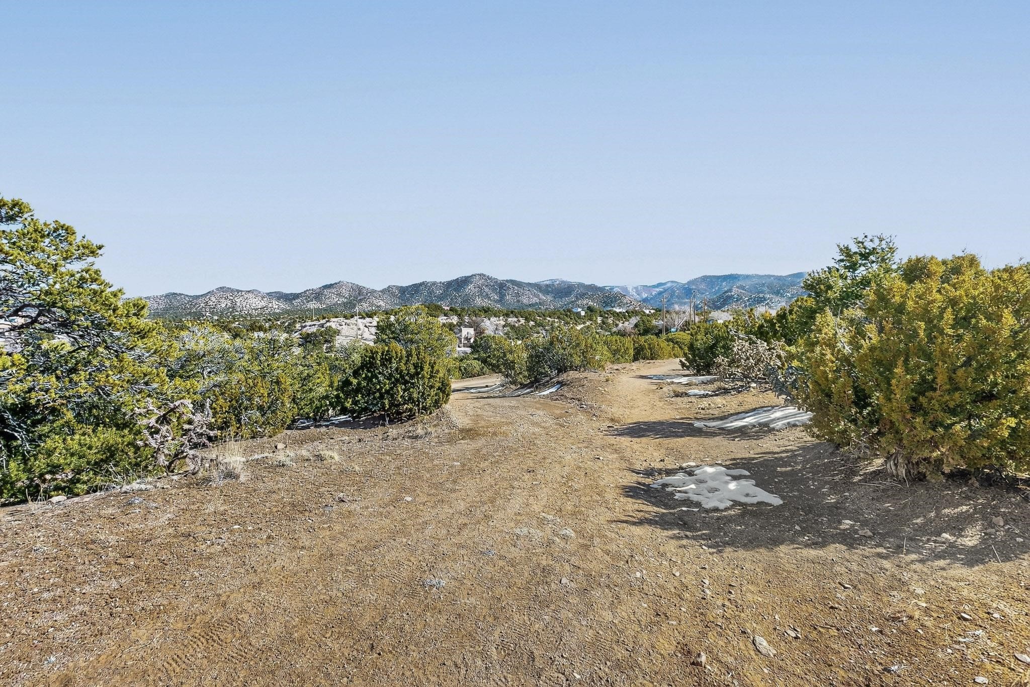 Breathtaking views from this astonishing 5.6 acre ridge top lot in a small private and gated subdivision moments from the village of Rio En Medio, which offers access to a trail head into the mountains of the National Forest and a nearby waterfall. A deep, sandy bottomed, canyon cuts through the lot. On Rio en medio community water. Power available. First lot inside the gate with a large flat building site . Minimal CC&Rs. All 5 lots can be purchased as a package. 2 minutes drive to fine dining at the Four Seasons Encantado Resort. Tesuque Village Market is 5 minutes and Santa Fe itself another 10.