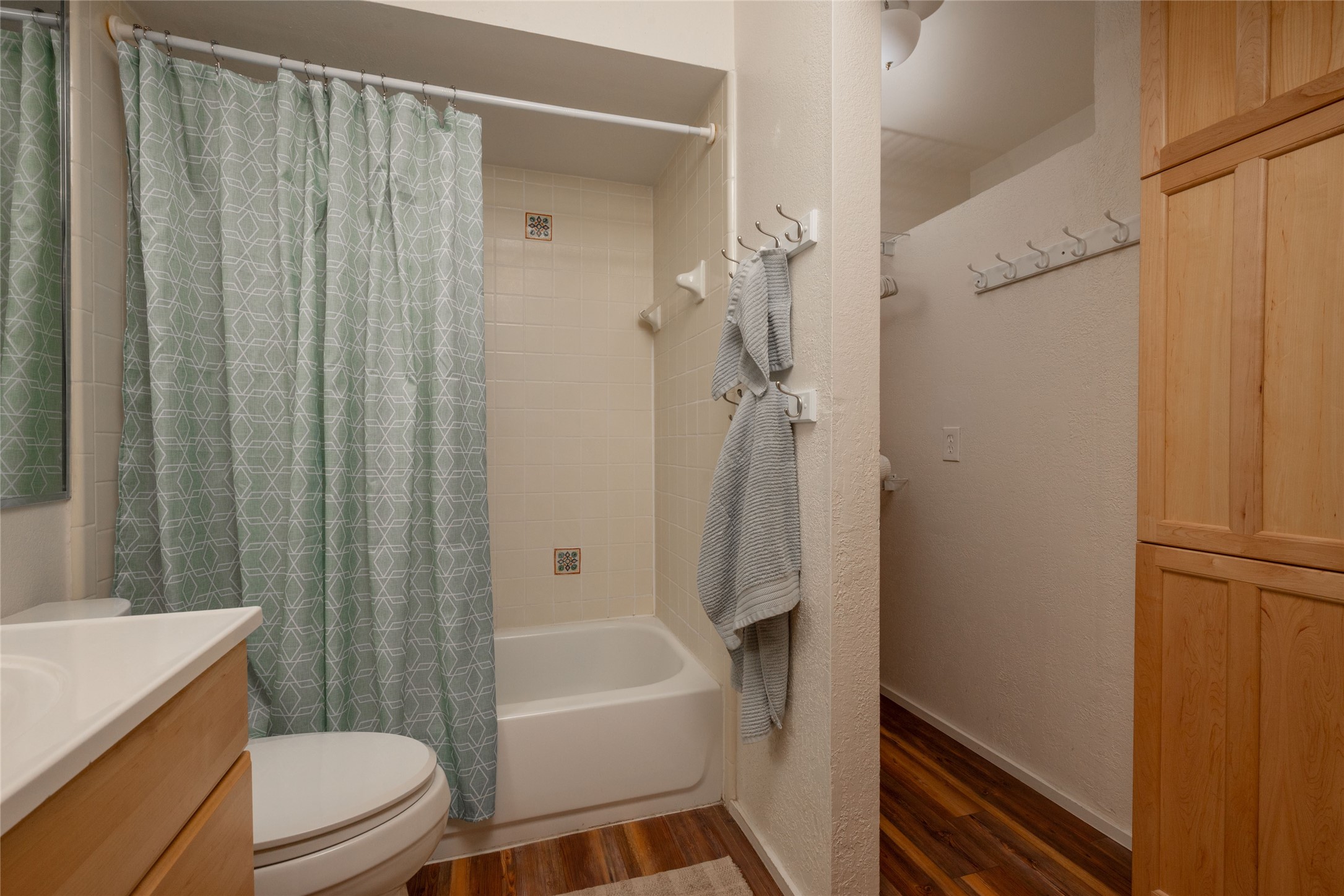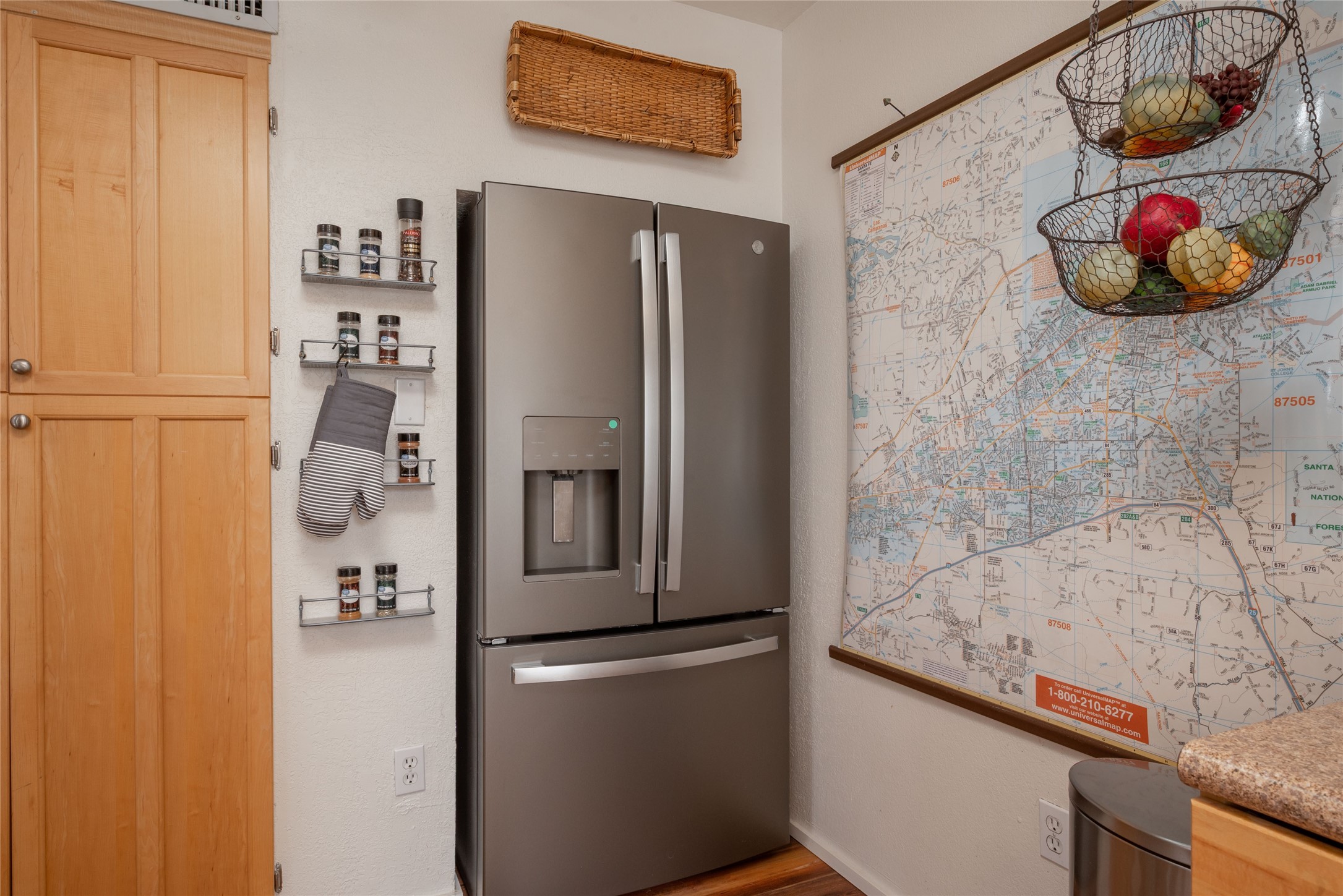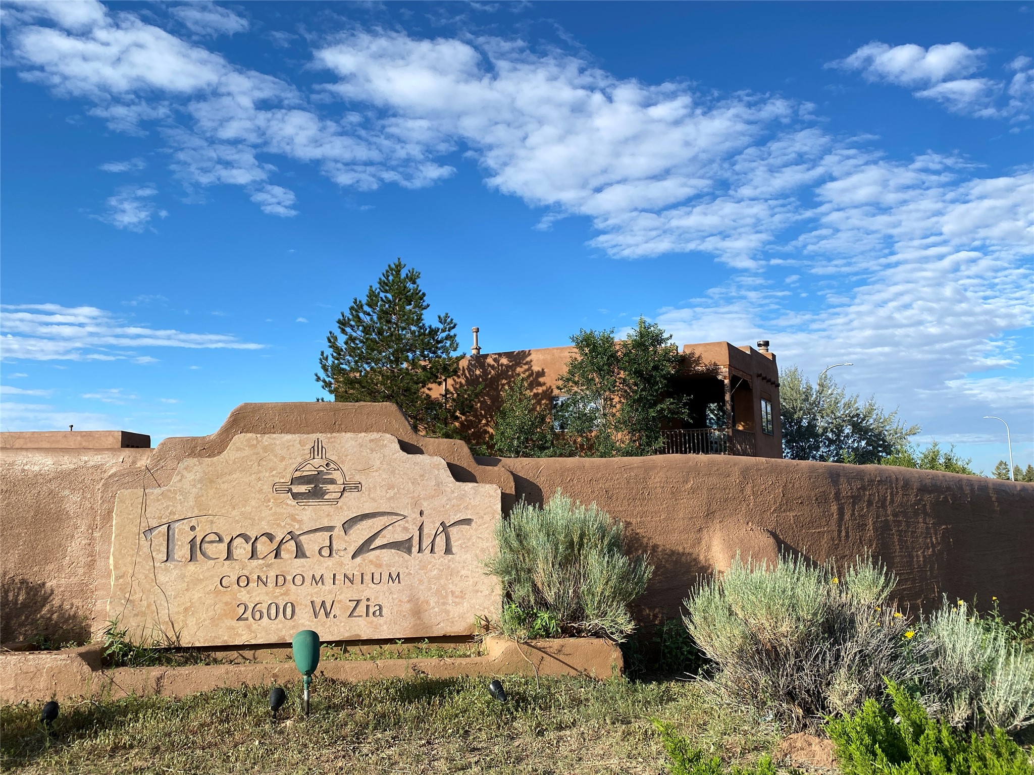 TURNKEY! Are you looking for the perfect condo to live full time, as a pied-a-terre, or an investment property? Here it is, completely furnished, at the sought after Tierra de Zia condo gated community in mid-town Santa Fe! A corner, ground level unit with a beautiful private deck, patio and gardens. Living room with french doors, lots of light, and a kiva fireplace. Kitchen complete with washer and dryer and double door refrigerator with ice and water dispenser. Maple cabinetry. Ensuite bedroom with walk-in closet off the bathroom. Wood/vinyl wide plank flooring throughout. Designated parking directly in front of the unit. Sunset views! Beautiful grounds with ponds, fountains and walking trails through a natural setting. On-site management.