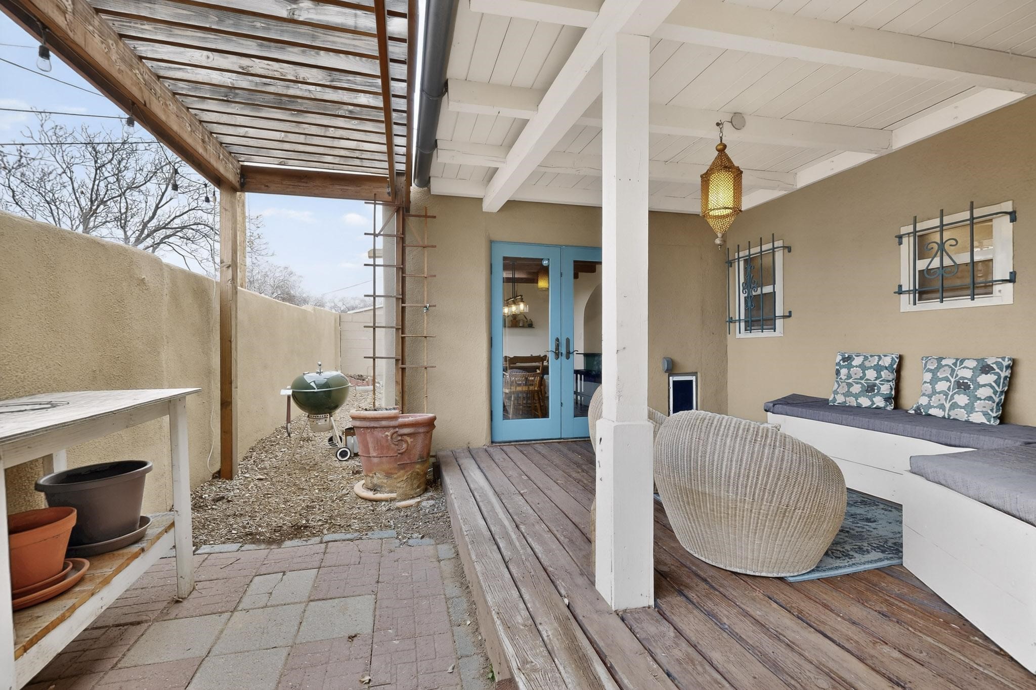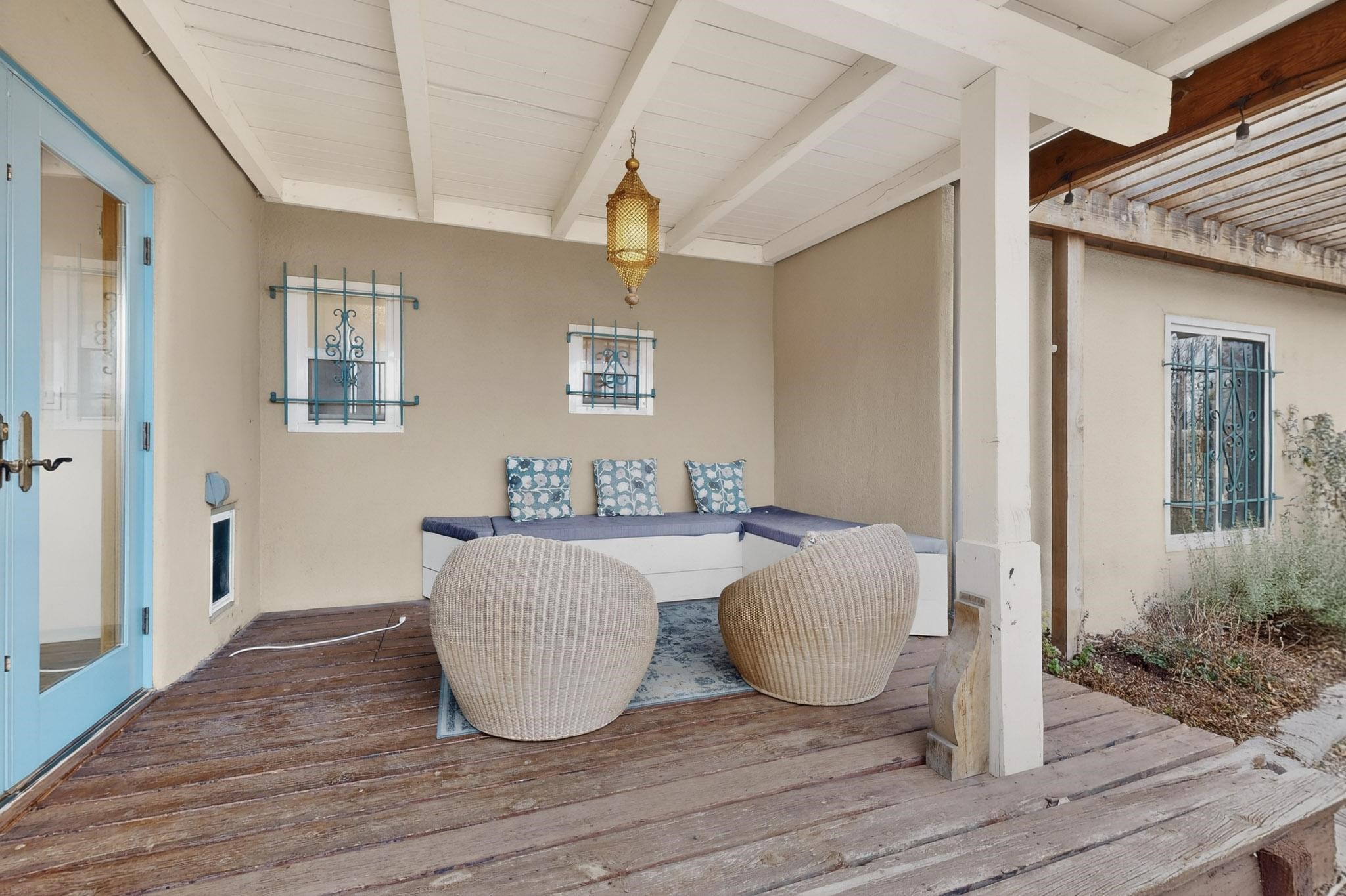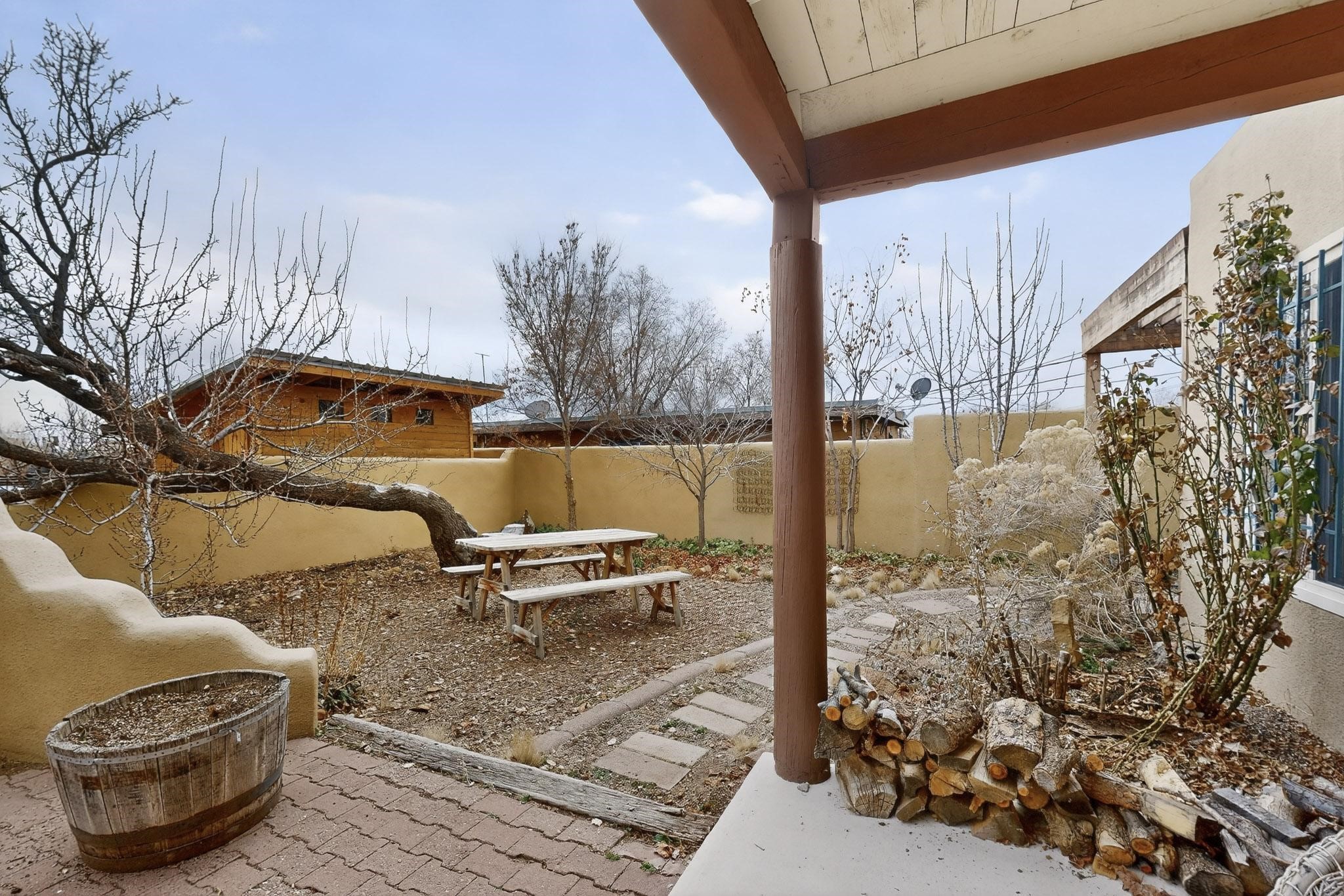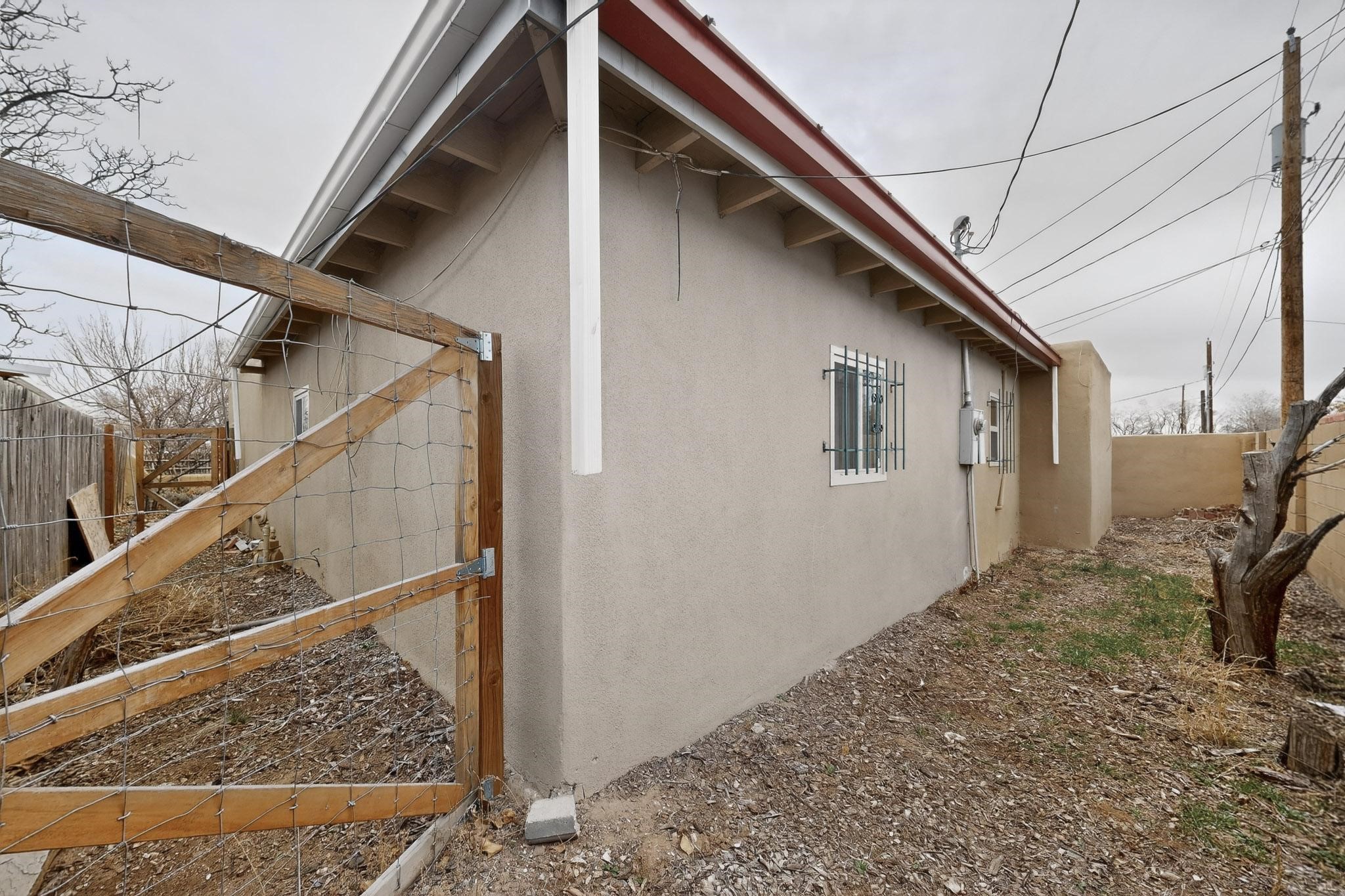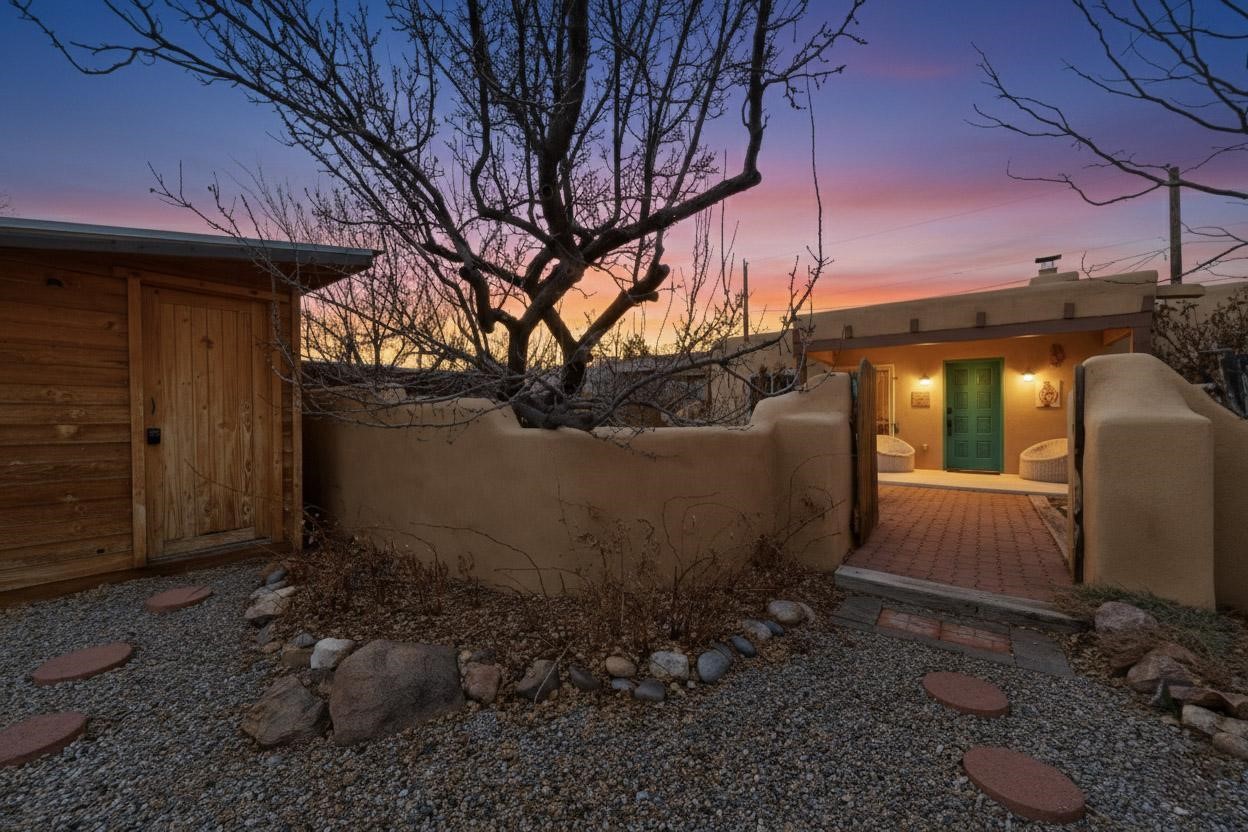 Beautifully updated, authentic Southwest home in the heart of midtown, blending timeless character with thoughtful modern upgrades. The charming 1950s original dwelling was expanded to include a light-filled dining room, creating the perfect space for gatherings. French doors open to a covered outdoor living area--ideal for slow mornings with coffee and a good book.The spacious kitchen, tastefully remodeled by the previous owners, features an eat-in bar and a dedicated wine and cold drink fridge. High ceilings with wood beams and tongue-and-groove detailing enhance the sense of openness, while luxury vinyl plank flooring runs seamlessly throughout the home.A welcoming front gate opens to your own private sanctuary. The generous lot provides ample off-street parking, multiple garden beds with drip irrigation, a well-built storage shed, and a traditional horno--perfect for wood-fired pizza nights. Lush landscaping makes this property a gardener's dream, complete with fruit trees, flowering shrubs, and fragrant herbs (see the owner's plant diagram in the photos).Ideally located near the redeveloping Midtown District--formerly the College of Santa Fe--this vibrant area is undergoing major transformation, including the newest Sky Cinema location and Tender Fire Pizza's new brick-and-mortar restaurant. This home truly offers the best of character, comfort, and convenience.