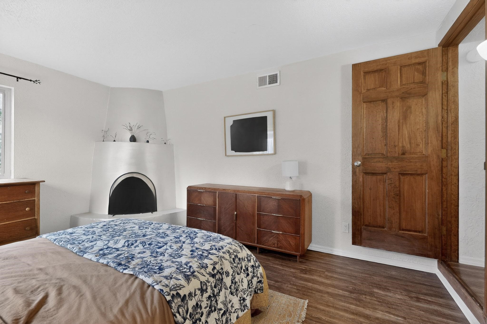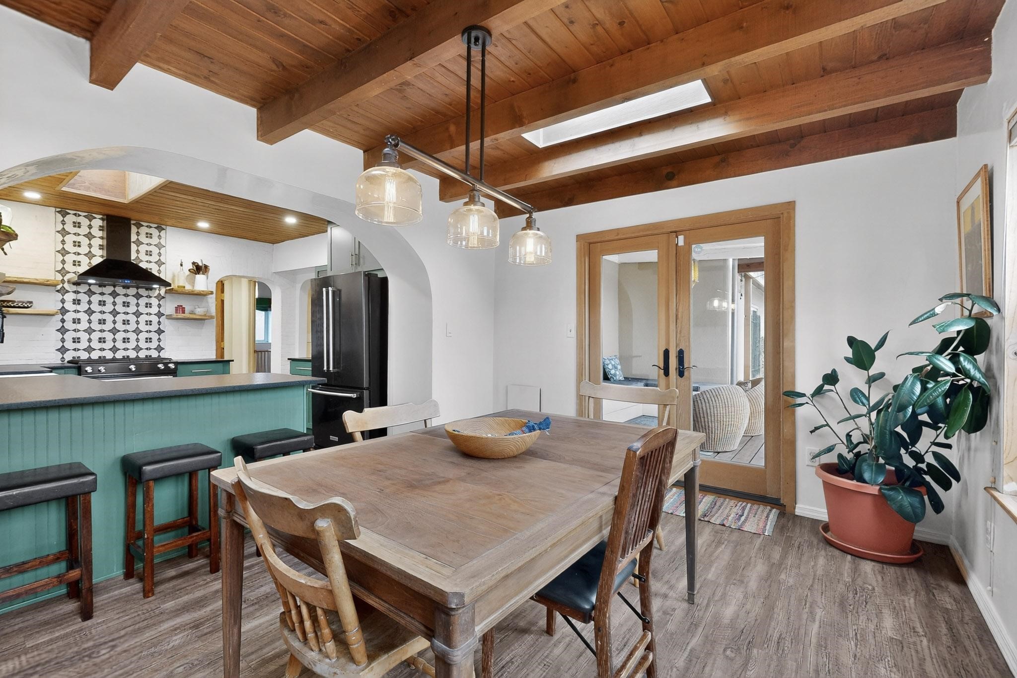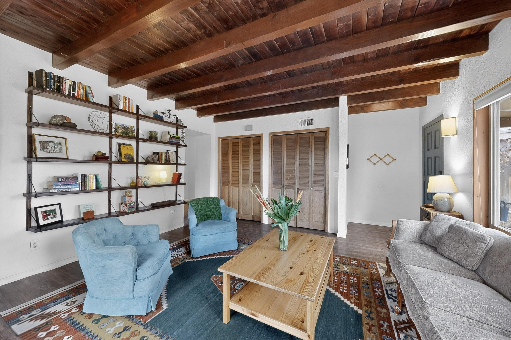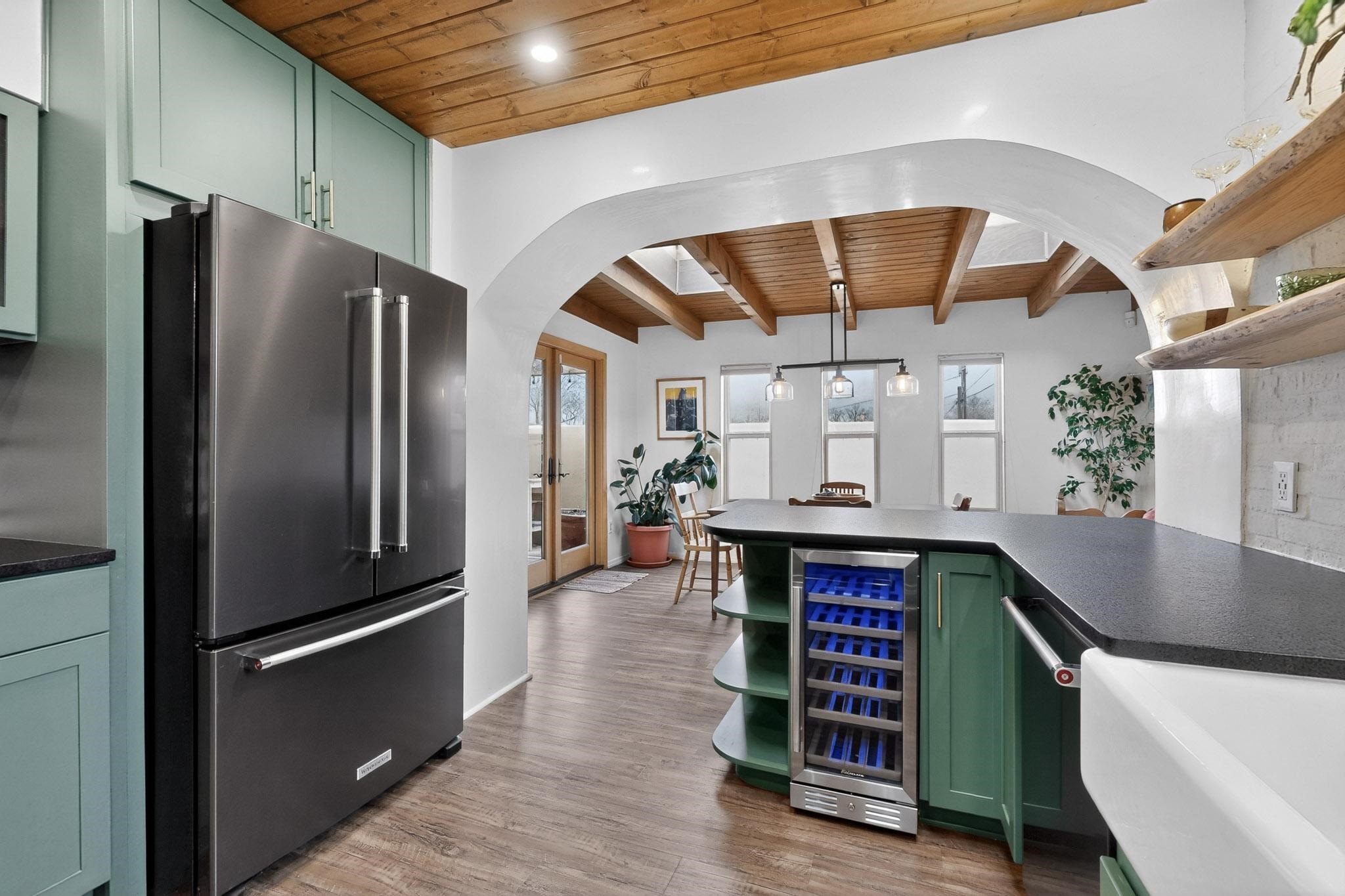 Beautifully updated, authentic Southwest home in the heart of midtown, blending timeless character with thoughtful modern upgrades. The charming 1950s original dwelling was expanded to include a light-filled dining room, creating the perfect space for gatherings. French doors open to a covered outdoor living area--ideal for slow mornings with coffee and a good book.The spacious kitchen, tastefully remodeled by the previous owners, features an eat-in bar and a dedicated wine and cold drink fridge. High ceilings with wood beams and tongue-and-groove detailing enhance the sense of openness, while luxury vinyl plank flooring runs seamlessly throughout the home.A welcoming front gate opens to your own private sanctuary. The generous lot provides ample off-street parking, multiple garden beds with drip irrigation, a well-built storage shed, and a traditional horno--perfect for wood-fired pizza nights. Lush landscaping makes this property a gardener's dream, complete with fruit trees, flowering shrubs, and fragrant herbs (see the owner's plant diagram in the photos).Ideally located near the redeveloping Midtown District--formerly the College of Santa Fe--this vibrant area is undergoing major transformation, including the newest Sky Cinema location and Tender Fire Pizza's new brick-and-mortar restaurant. This home truly offers the best of character, comfort, and convenience.