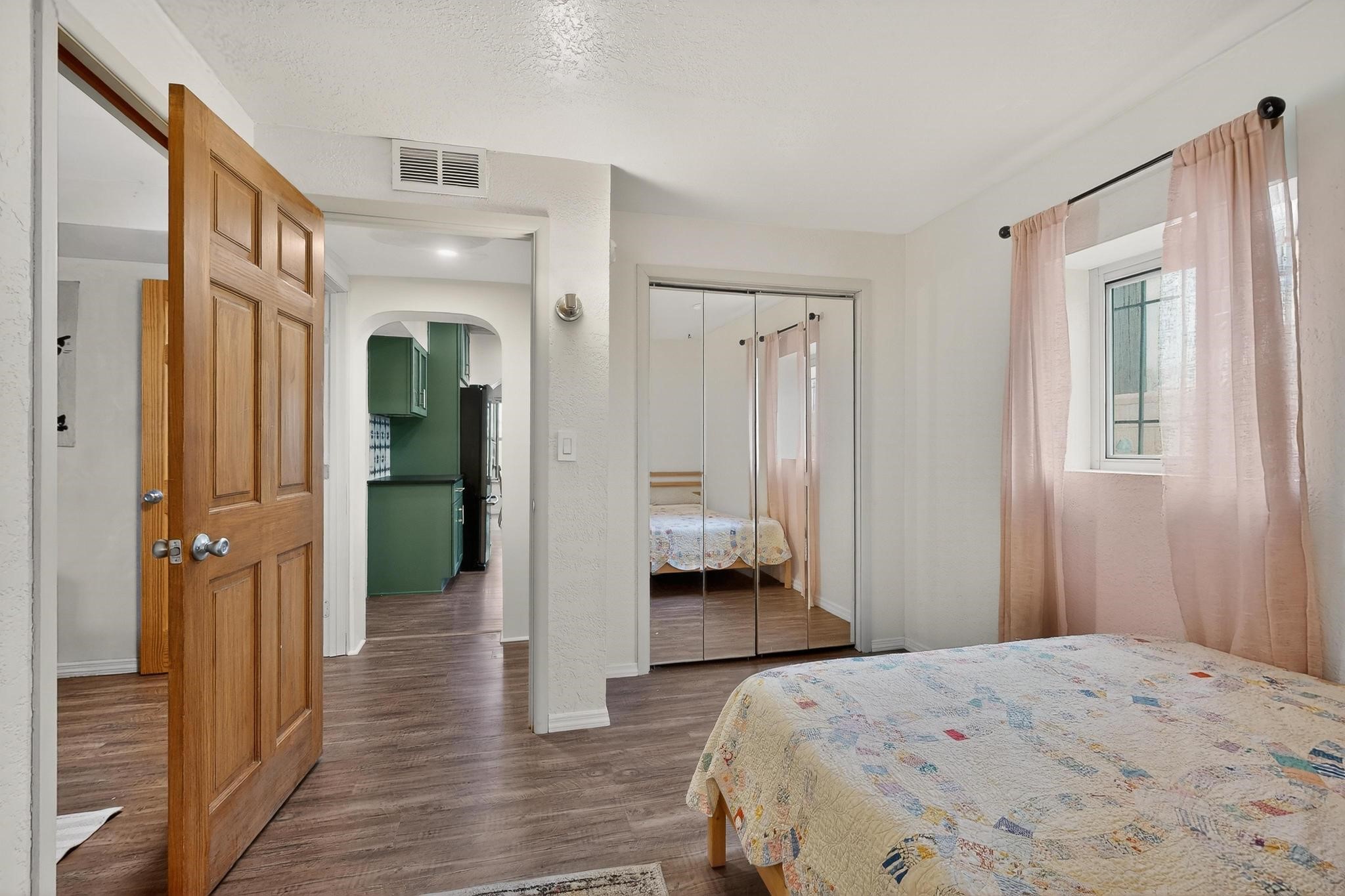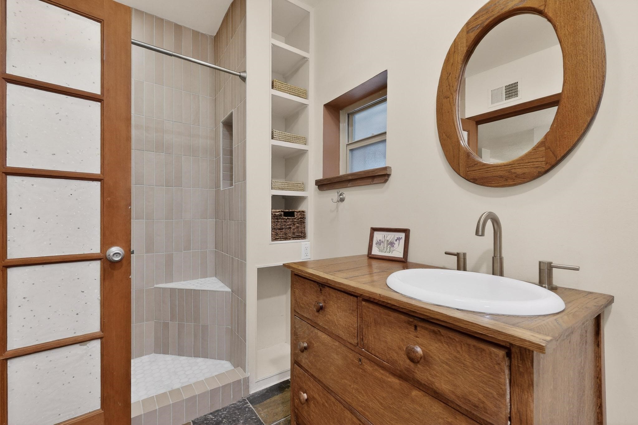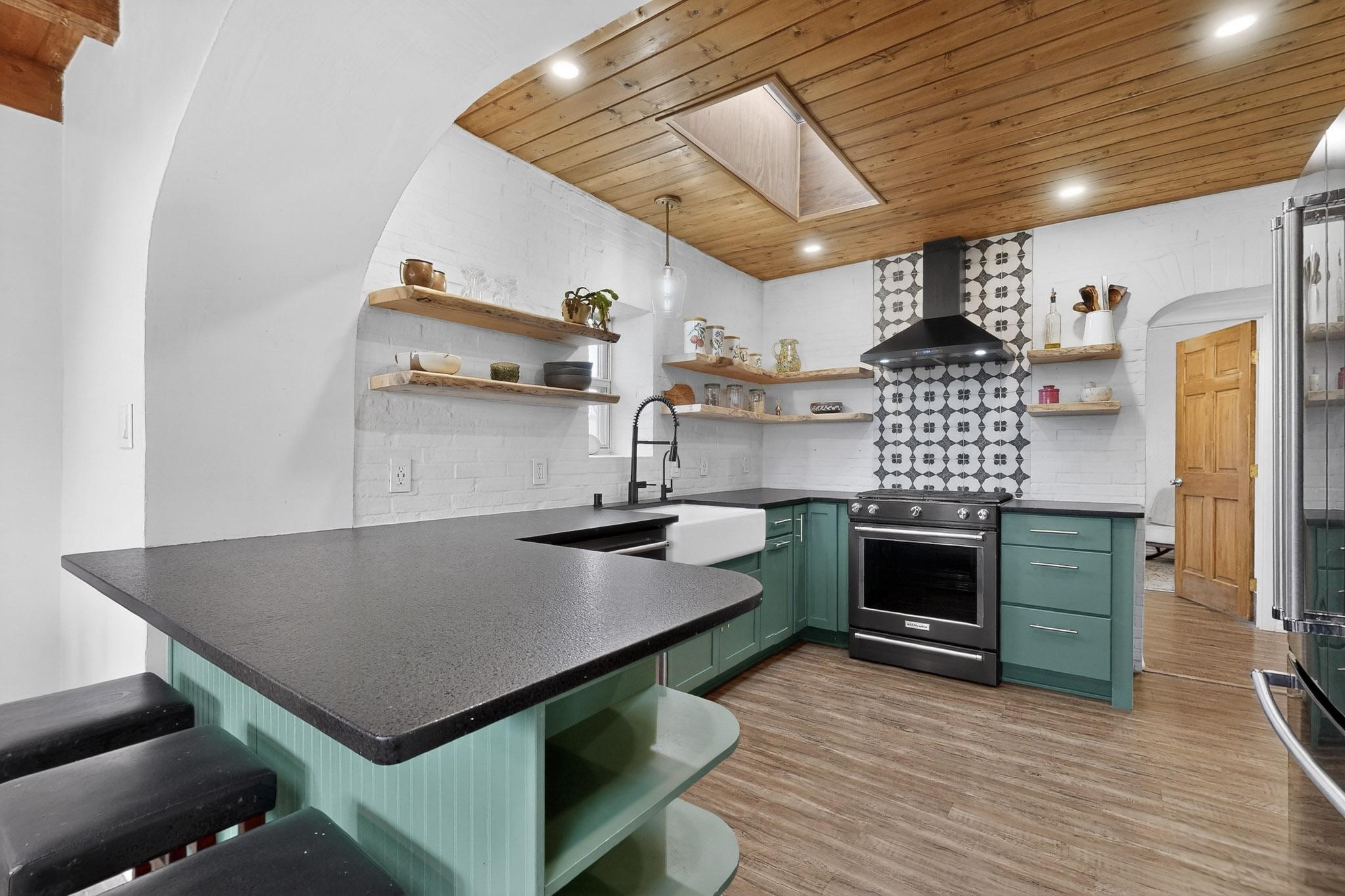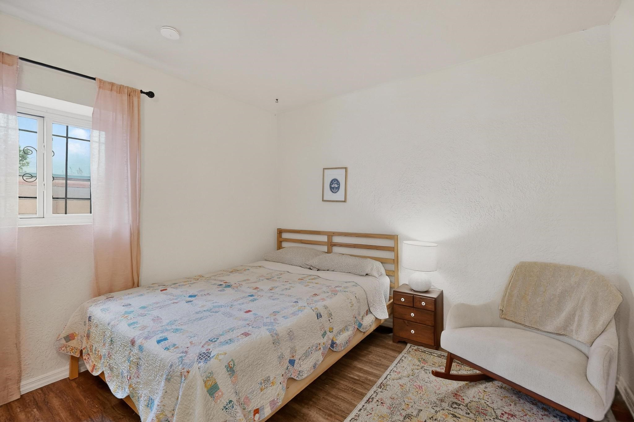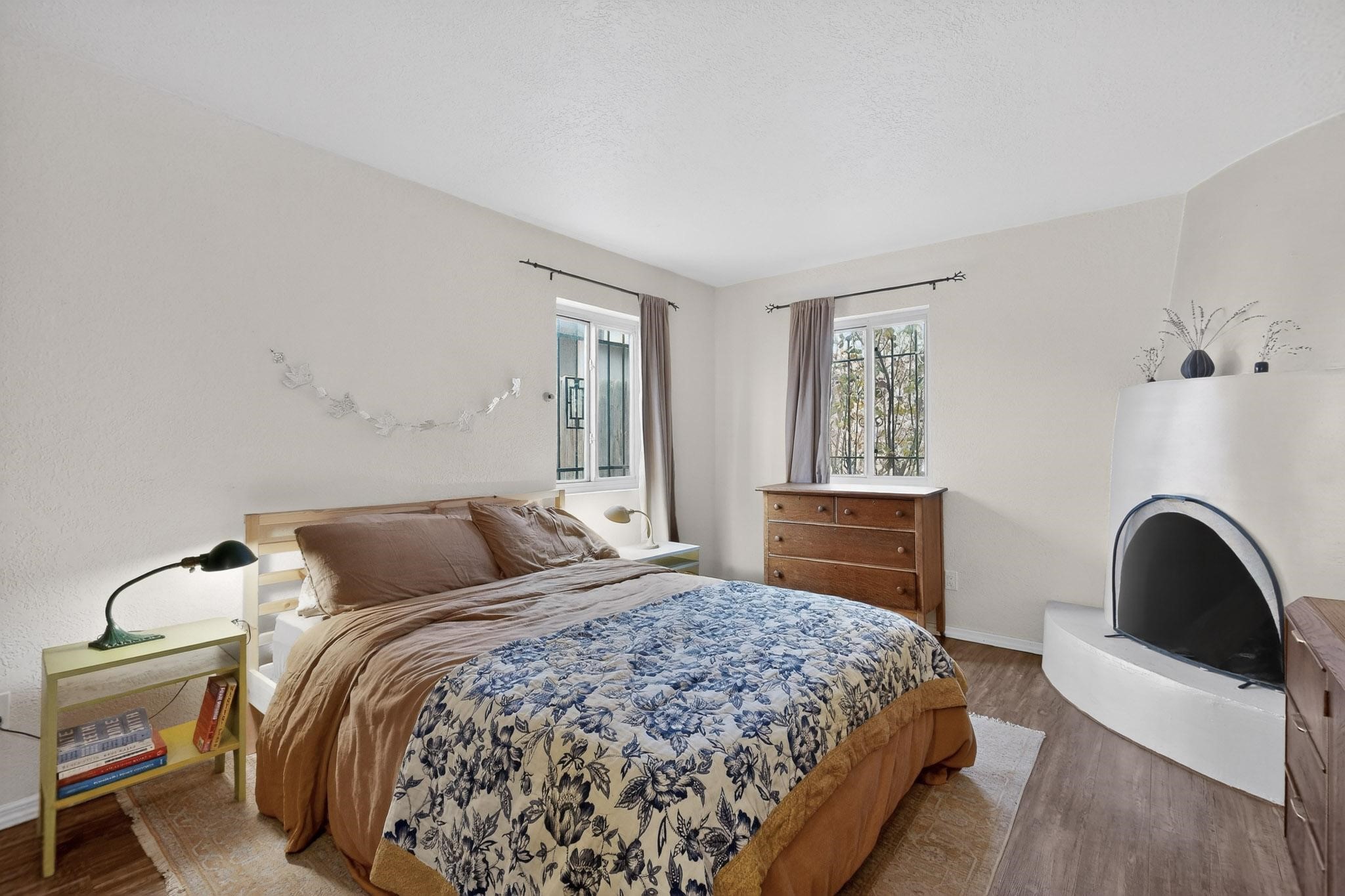 Beautifully updated, authentic Southwest home in the heart of midtown, blending timeless character with thoughtful modern upgrades. The charming 1950s original dwelling was expanded to include a light-filled dining room, creating the perfect space for gatherings. French doors open to a covered outdoor living area--ideal for slow mornings with coffee and a good book.The spacious kitchen, tastefully remodeled by the previous owners, features an eat-in bar and a dedicated wine and cold drink fridge. High ceilings with wood beams and tongue-and-groove detailing enhance the sense of openness, while luxury vinyl plank flooring runs seamlessly throughout the home.A welcoming front gate opens to your own private sanctuary. The generous lot provides ample off-street parking, multiple garden beds with drip irrigation, a well-built storage shed, and a traditional horno--perfect for wood-fired pizza nights. Lush landscaping makes this property a gardener's dream, complete with fruit trees, flowering shrubs, and fragrant herbs (see the owner's plant diagram in the photos).Ideally located near the redeveloping Midtown District--formerly the College of Santa Fe--this vibrant area is undergoing major transformation, including the newest Sky Cinema location and Tender Fire Pizza's new brick-and-mortar restaurant. This home truly offers the best of character, comfort, and convenience.