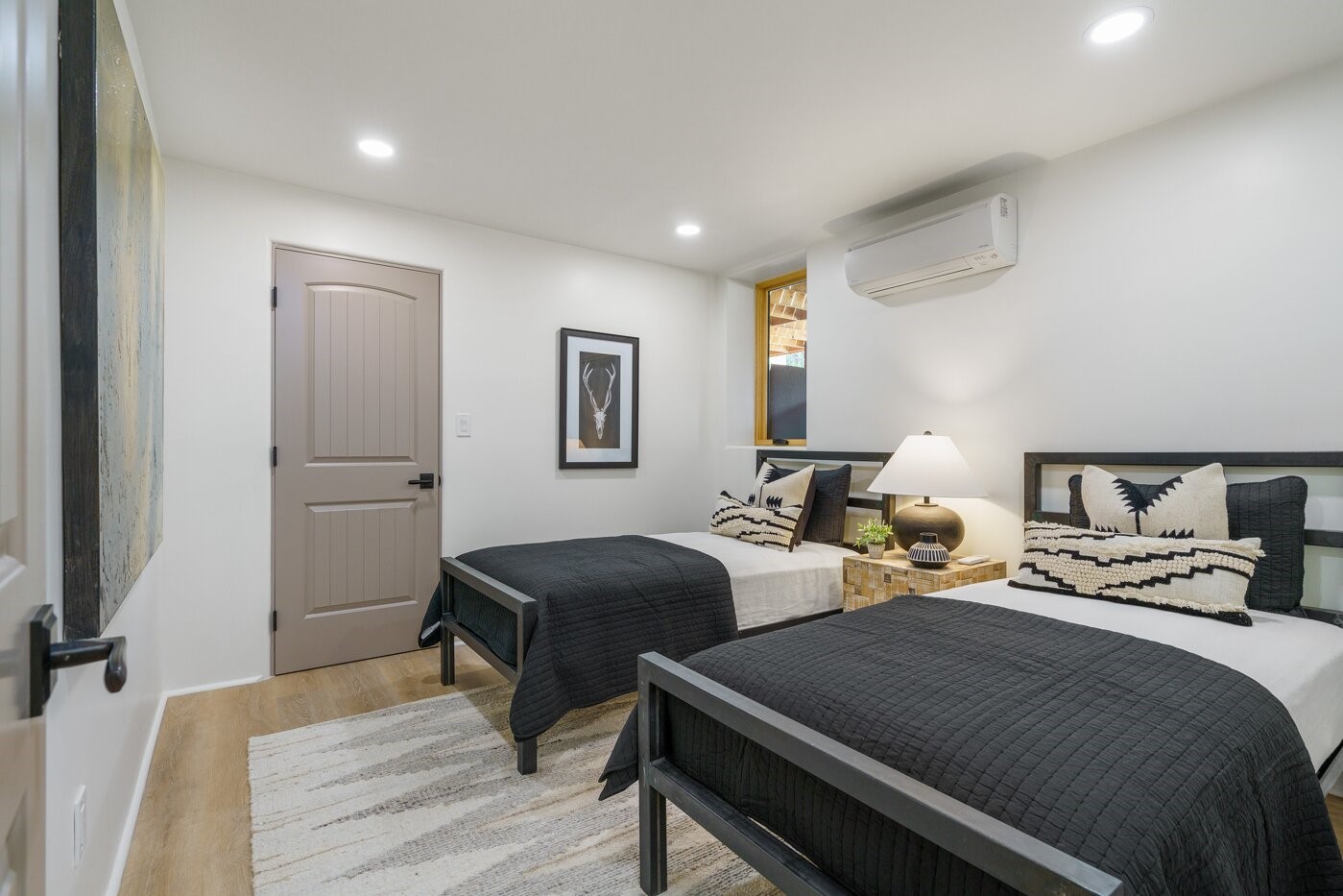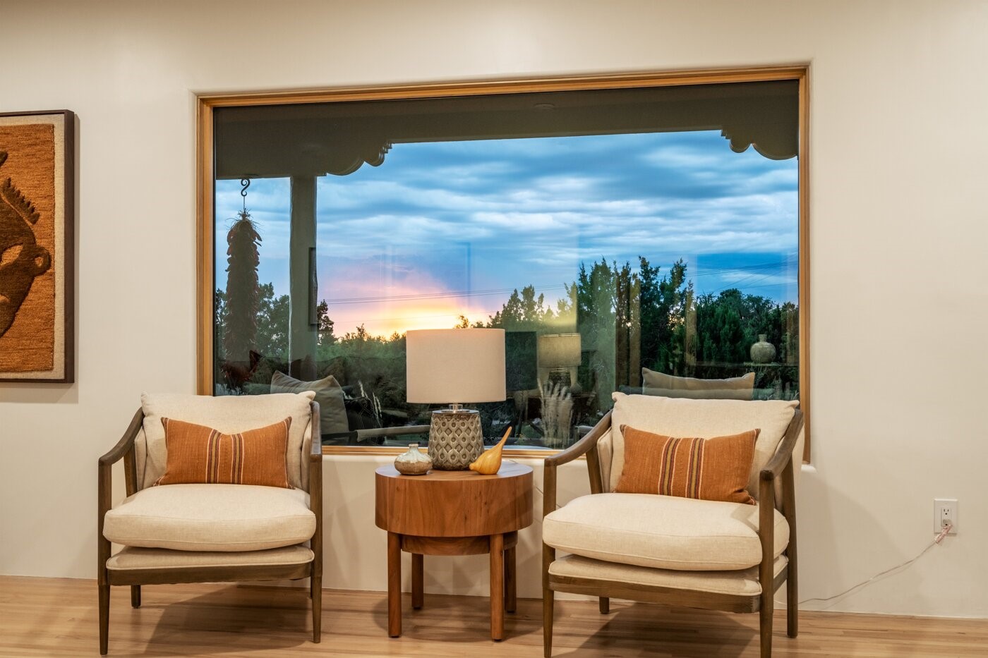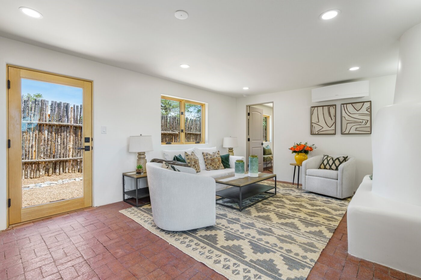 Extensively renovated and reimagined, this light and bright sanctuary sits on just over one acre, offering a rare walled and gated in-town oasis in a prime location near the Historic Santa Fe Plaza. Custom appointments and luxury finishes abound, while expansive windows capture breathtaking sunrise and sunset views of the Sangre de Cristo and Jemez mountains.Beautifully landscaped grounds with native pion and juniper create a private, park-like haven enjoyed from multiple decks, a flagstone patio, and the welcoming entry portal. Designed with flexibility in mind, the property offers exceptional multi-family or guest potential. The main level includes three bedrooms and a full kitchen, while the lower-level features two bedrooms, a media room, and a second kitchen. A separate, fully fenced one-bedroom casita provides additional privacy and independence.Natural light fills the living and informal dining areas, flowing into a well-appointed chef's kitchen with a single-basin farmhouse sink, Bosch appliance package, and custom appliance cabinet. The primary suite is a serene retreat with a spa-inspired bath, custom walk-in closet, and private deck for enjoying mountain views. The charming casita features a kiva fireplace, kitchen, and bedroom with en-suite bath with its own entrance. Parking is abundant with a two-car garage, deep carport, and additional guest parking.