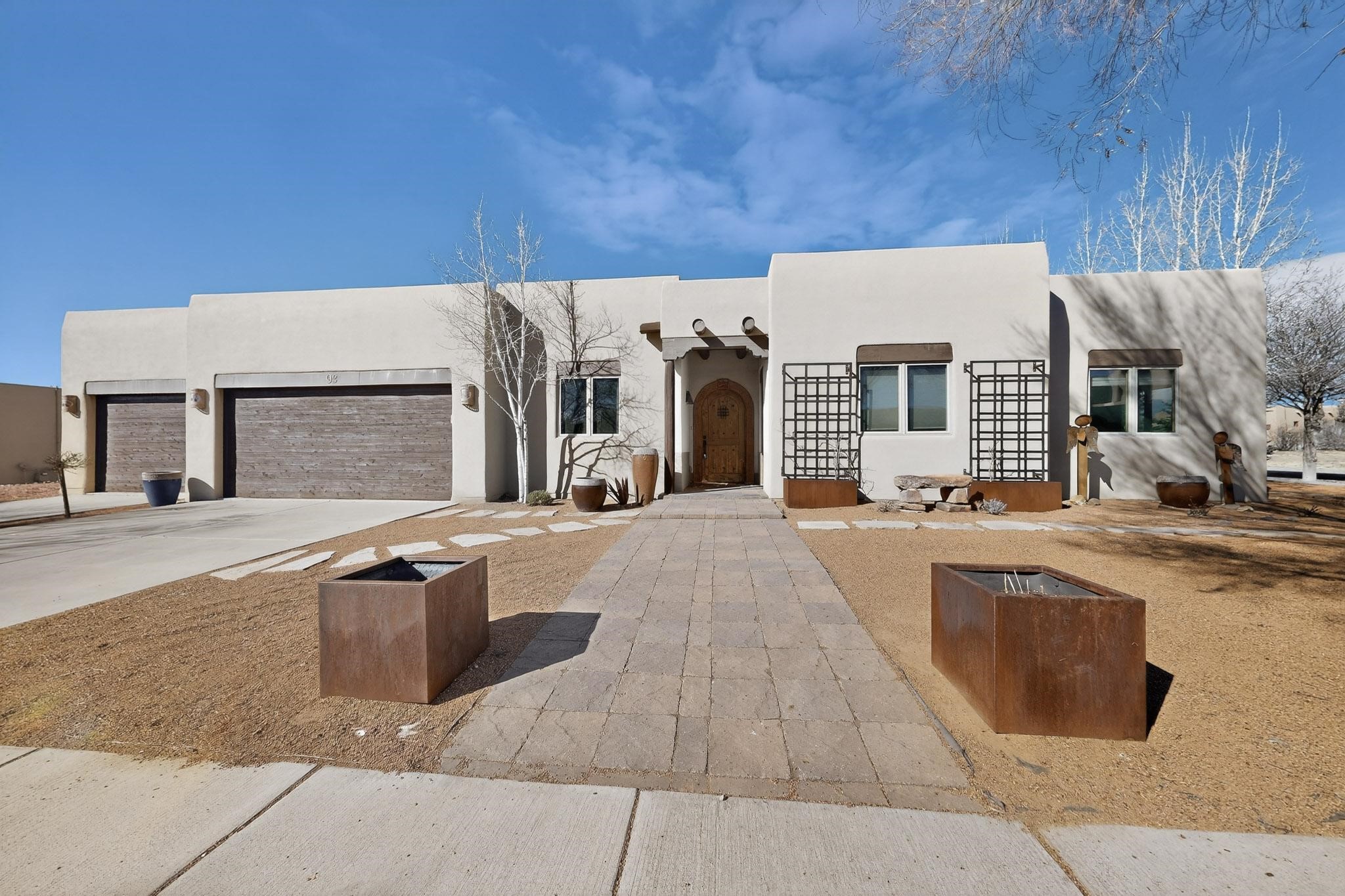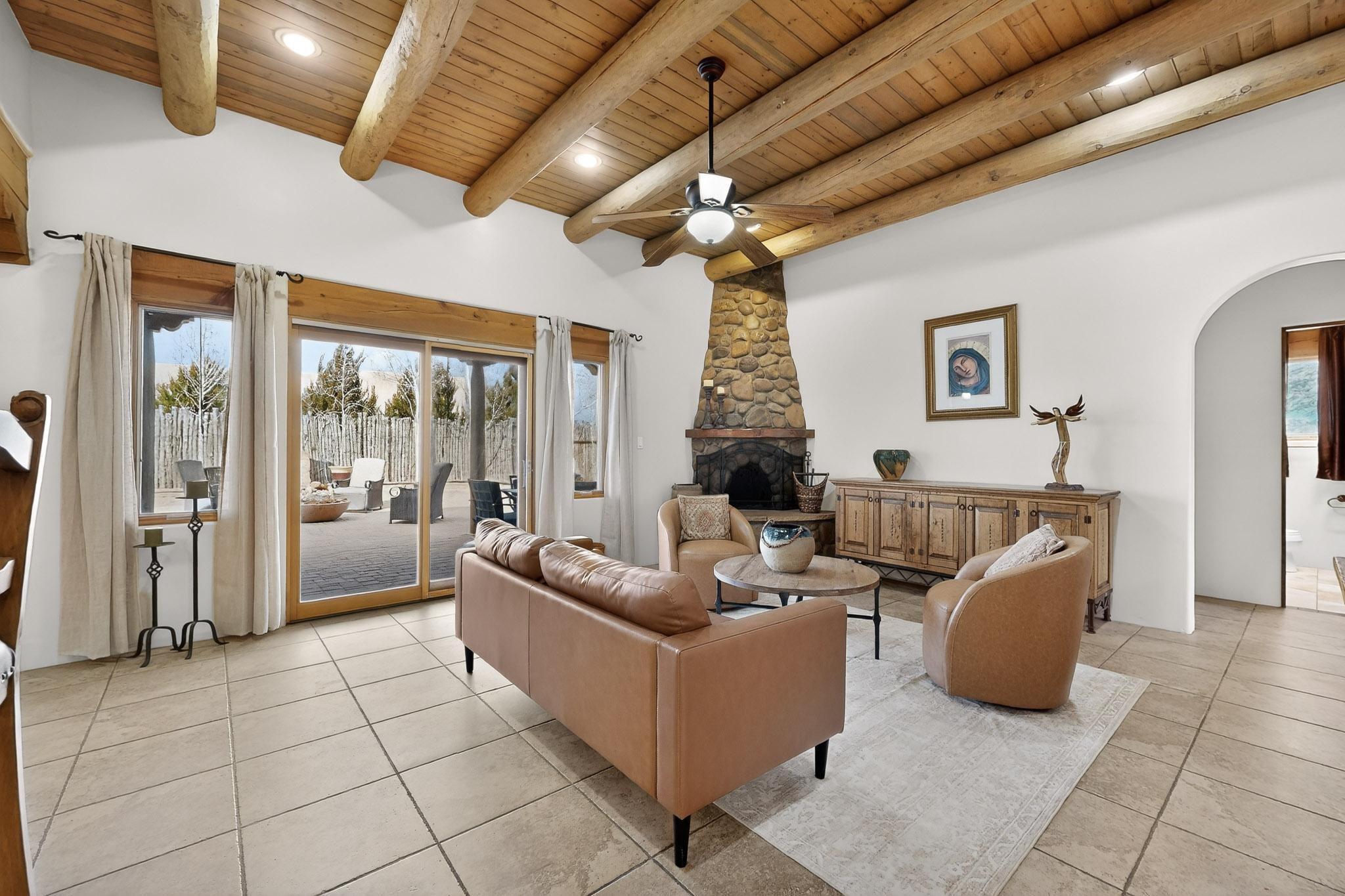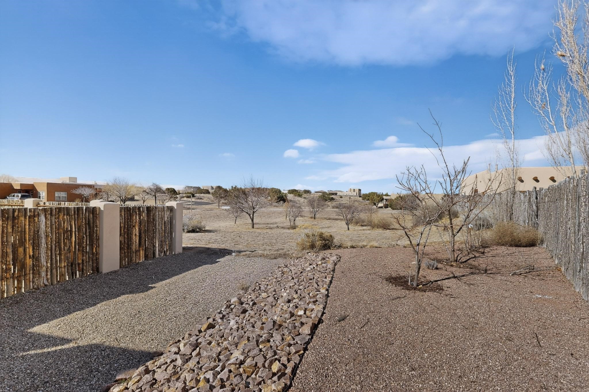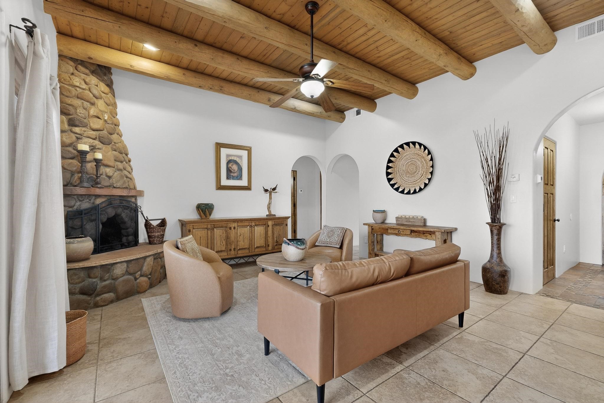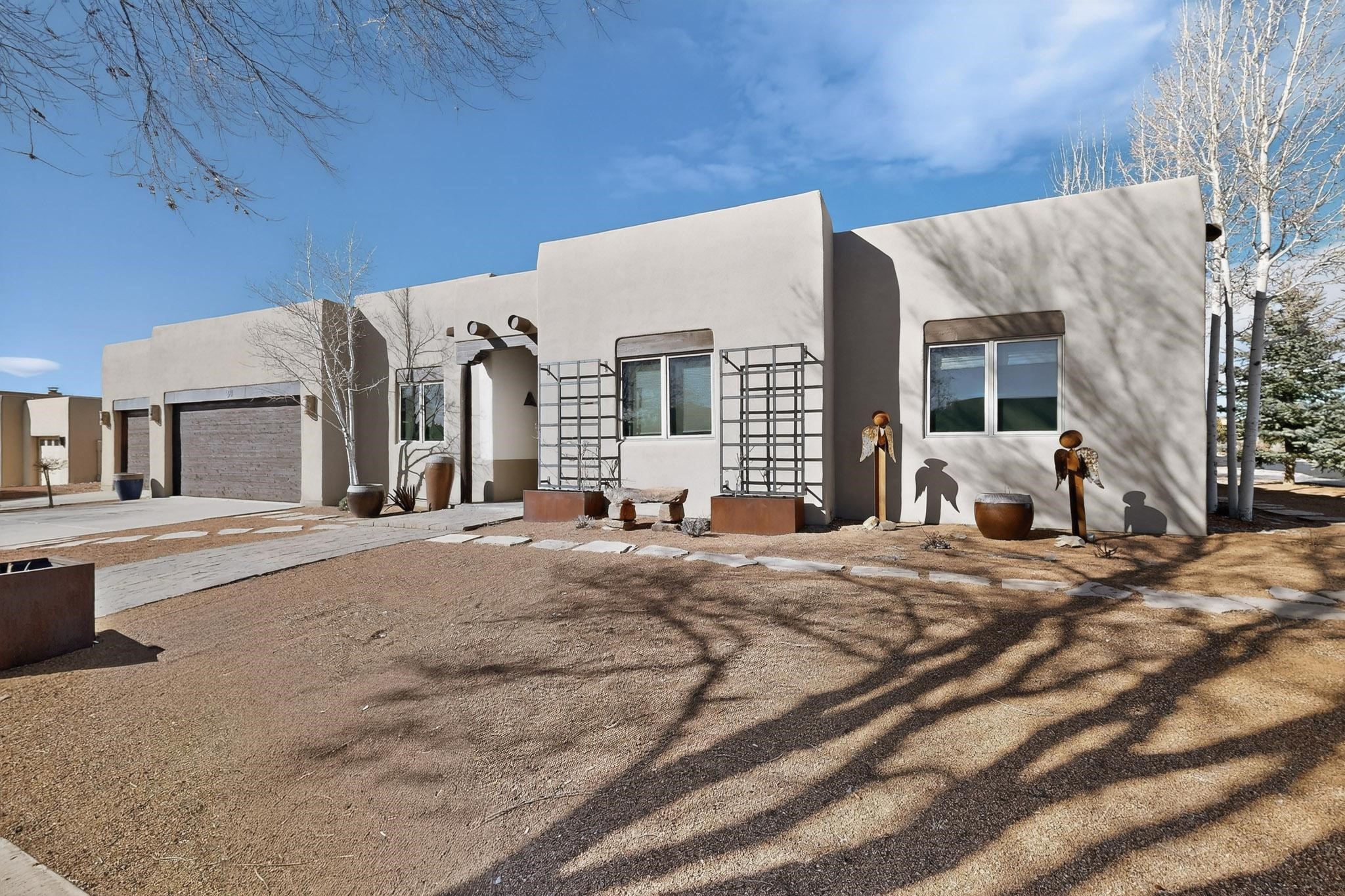 This stunning home in La Pradera is one of the few custom-built homes in the neighborhood with upgraded southwestern finishes. This open-concept gem features authentic vigas and a magnificent handcrafted river rock wood-burning fireplace. The exquisite custom cabinetry and doors are meticulously handcrafted by a local Santa Fe artisan. The chef's kitchen boasts stone countertops, a skylight, a gas stove, a new fridge, and double smart ovens. Year-round comfort is guaranteed with radiant floor heat, central heating/cooling, and upgraded electrical panels. The smart layout offers great primary/guest separation from the 3 additional bedrooms, one of which has a private exterior entrance, perfect for an office or flex space. The 2 full bathrooms and one bathroom perfectly serve the home. Premium Pella windows let in tons of natural light. Step outside to a private backyard surrounded by beautiful trees perfect for entertaining, with traditional coyote fencing, mature aspens, and a dog run. Included is a 3-car finished garage. The home sits on an extra-large corner lot, which offers additional parking for your guests and unbeatable access to trails, shopping, and I-25!