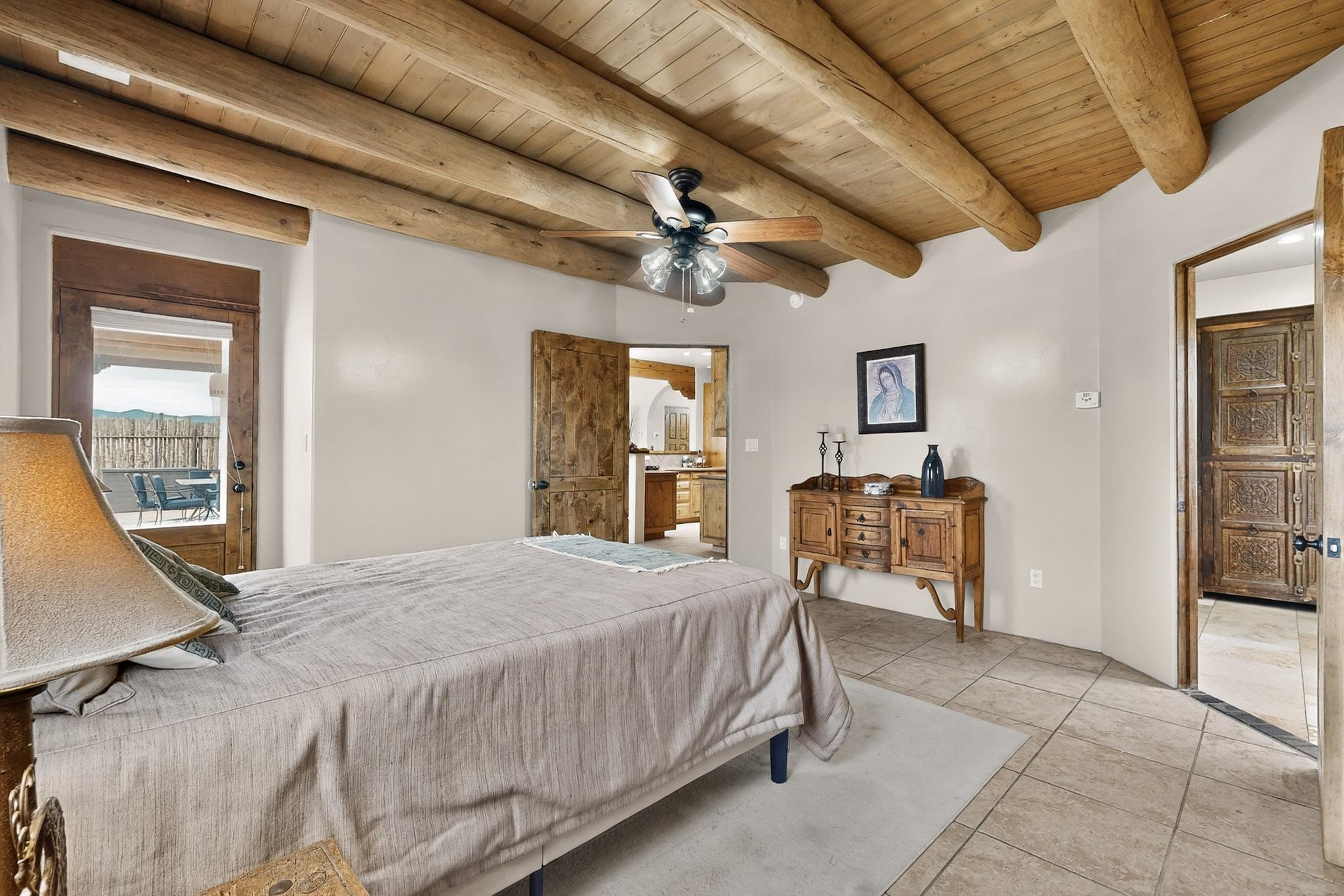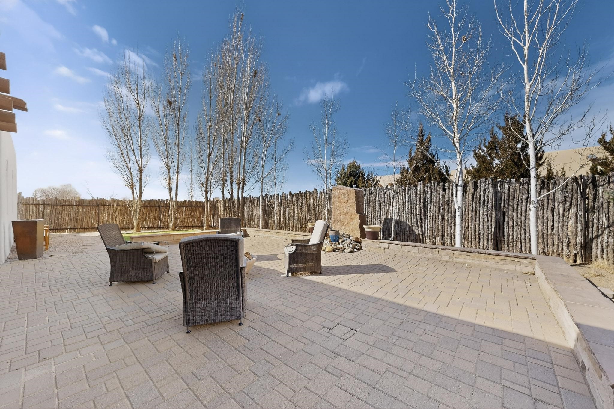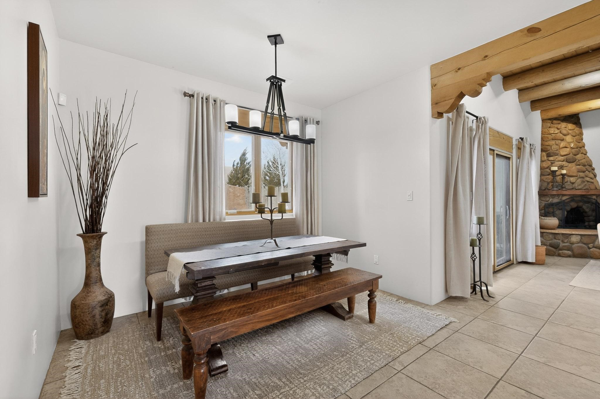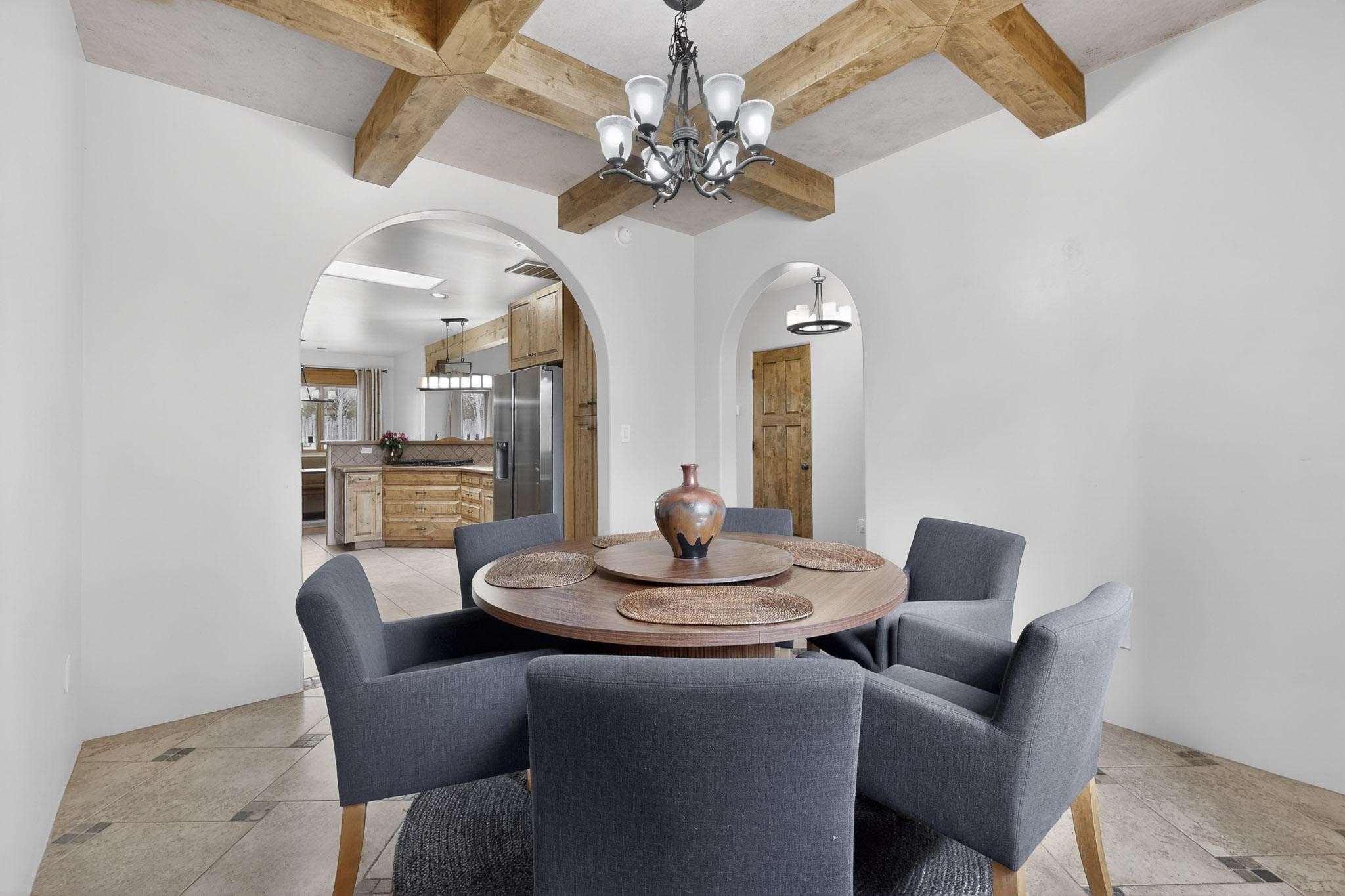This stunning home in La Pradera is one of the few custom-built homes in the neighborhood with upgraded southwestern finishes. This open-concept gem features authentic vigas and a magnificent handcrafted river rock wood-burning fireplace. The exquisite custom cabinetry and doors are meticulously handcrafted by a local Santa Fe artisan. The chef's kitchen boasts stone countertops, a skylight, a gas stove, a new fridge, and double smart ovens. Year-round comfort is guaranteed with radiant floor heat, central heating/cooling, and upgraded electrical panels. The smart layout offers great primary/guest separation from the 3 additional bedrooms, one of which has a private exterior entrance, perfect for an office or flex space. The 2 full bathrooms and one bathroom perfectly serve the home. Premium Pella windows let in tons of natural light. Step outside to a private backyard surrounded by beautiful trees perfect for entertaining, with traditional coyote fencing, mature aspens, and a dog run. Included is a 3-car finished garage. The home sits on an extra-large corner lot, which offers additional parking for your guests and unbeatable access to trails, shopping, and I-25!