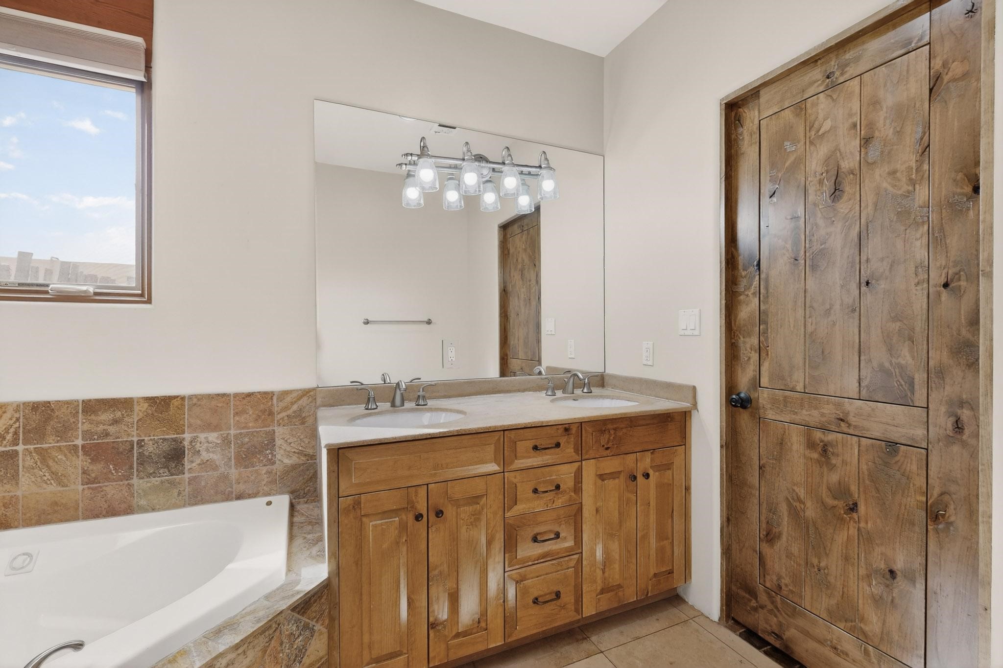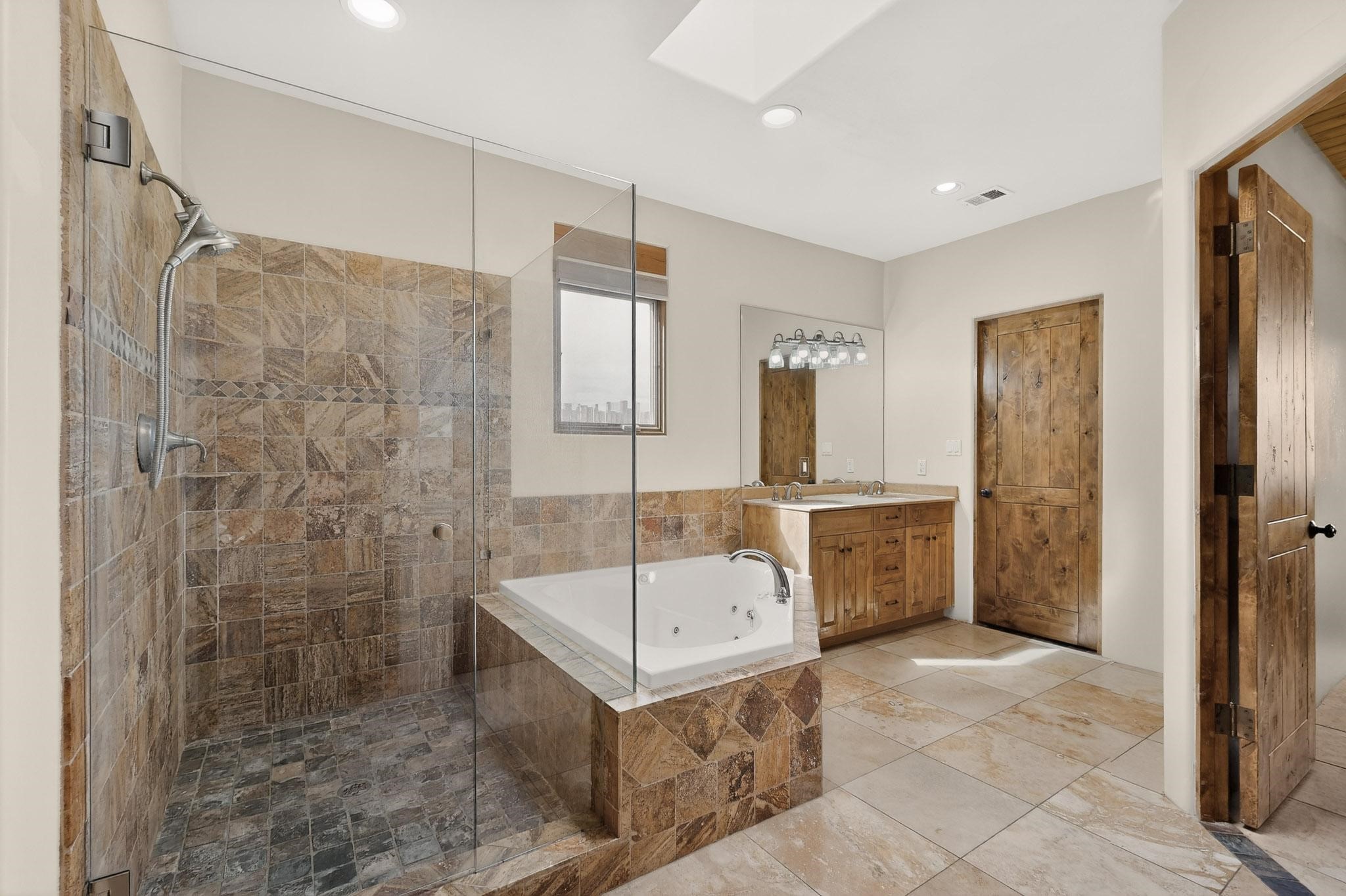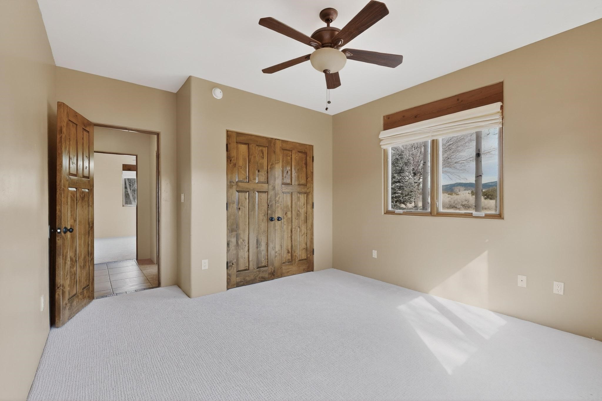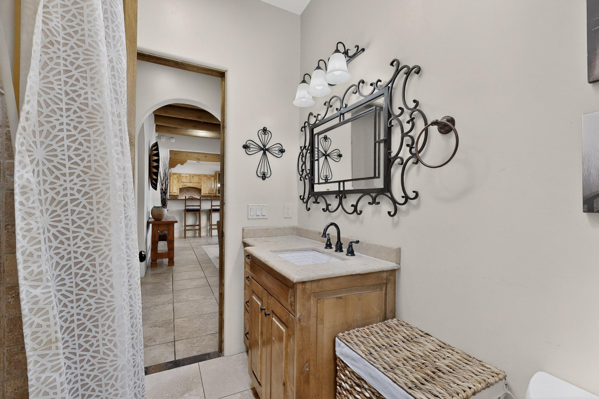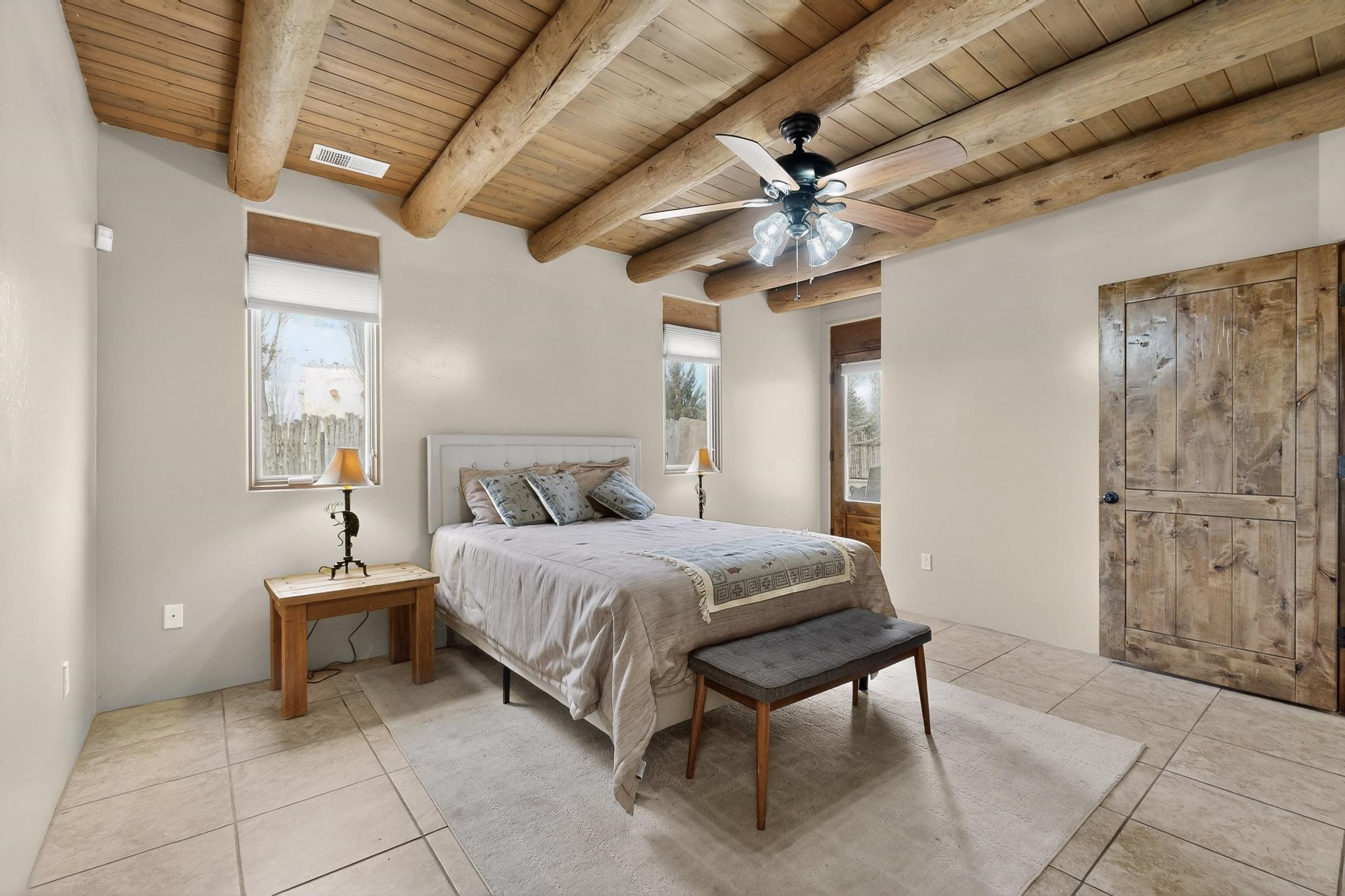 This stunning home in La Pradera is one of the few custom-built homes in the neighborhood with upgraded southwestern finishes. This open-concept gem features authentic vigas and a magnificent handcrafted river rock wood-burning fireplace. The exquisite custom cabinetry and doors are meticulously handcrafted by a local Santa Fe artisan. The chef's kitchen boasts stone countertops, a skylight, a gas stove, a new fridge, and double smart ovens. Year-round comfort is guaranteed with radiant floor heat, central heating/cooling, and upgraded electrical panels. The smart layout offers great primary/guest separation from the 3 additional bedrooms, one of which has a private exterior entrance, perfect for an office or flex space. The 2 full bathrooms and one bathroom perfectly serve the home. Premium Pella windows let in tons of natural light. Step outside to a private backyard surrounded by beautiful trees perfect for entertaining, with traditional coyote fencing, mature aspens, and a dog run. Included is a 3-car finished garage. The home sits on an extra-large corner lot, which offers additional parking for your guests and unbeatable access to trails, shopping, and I-25!