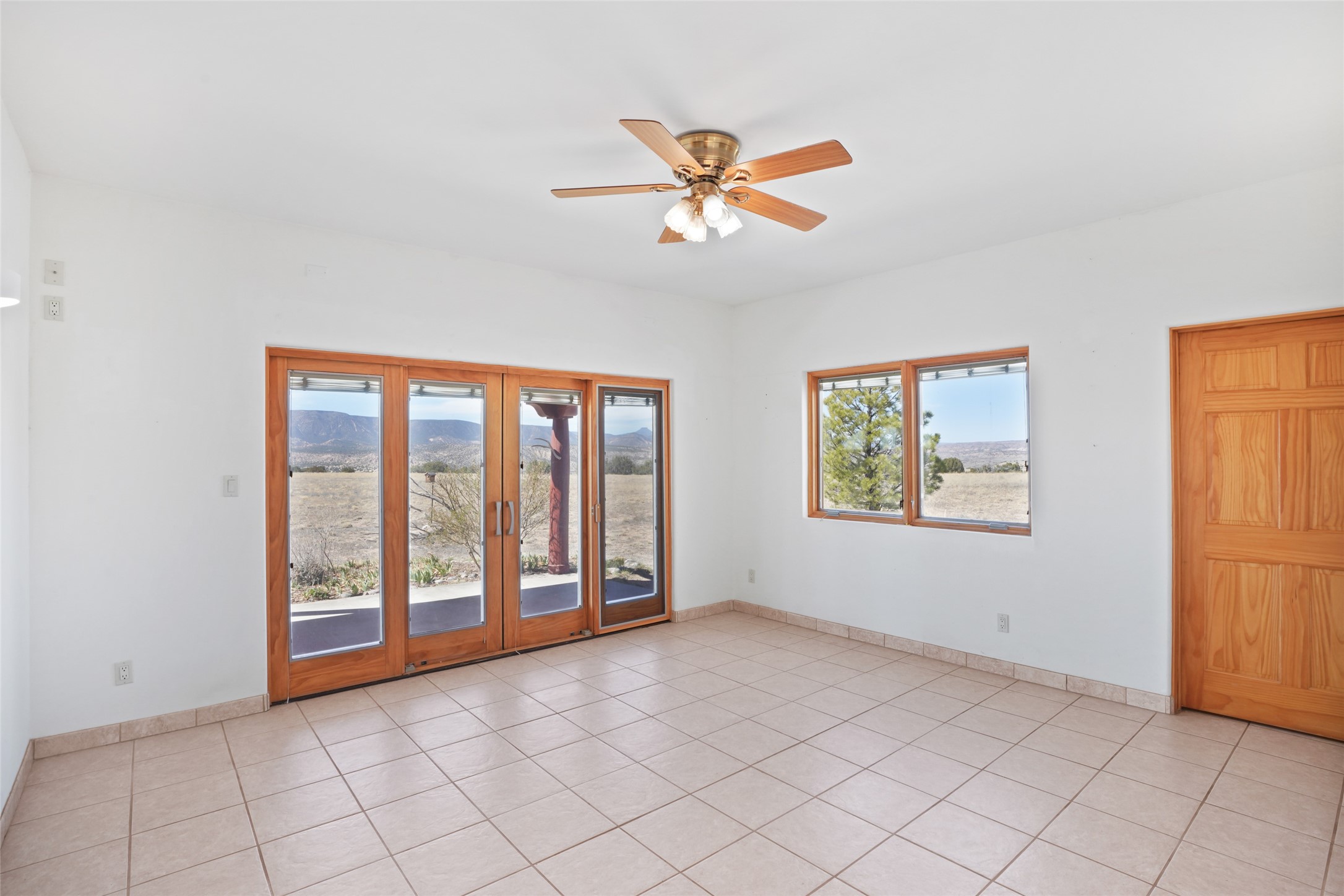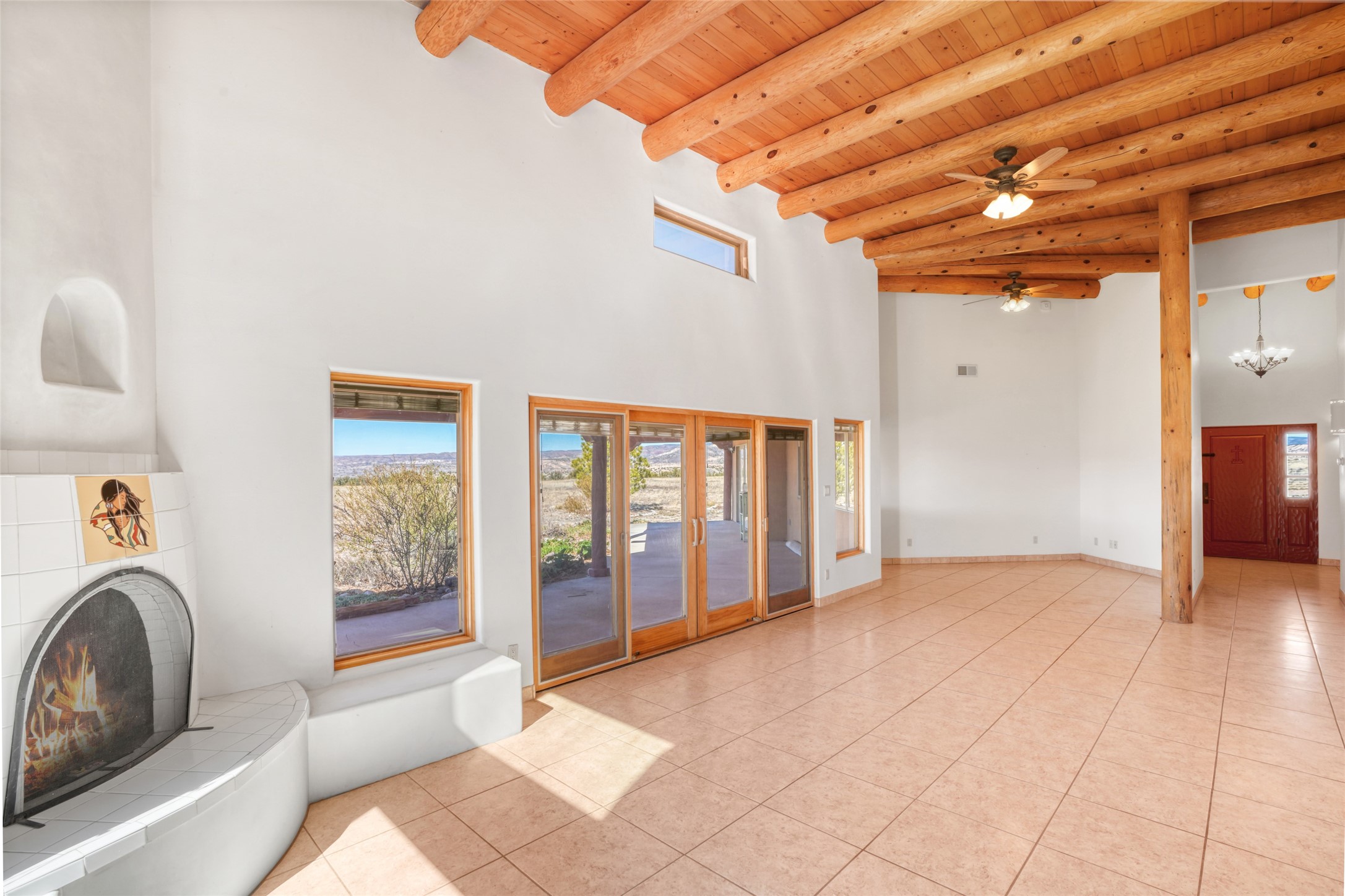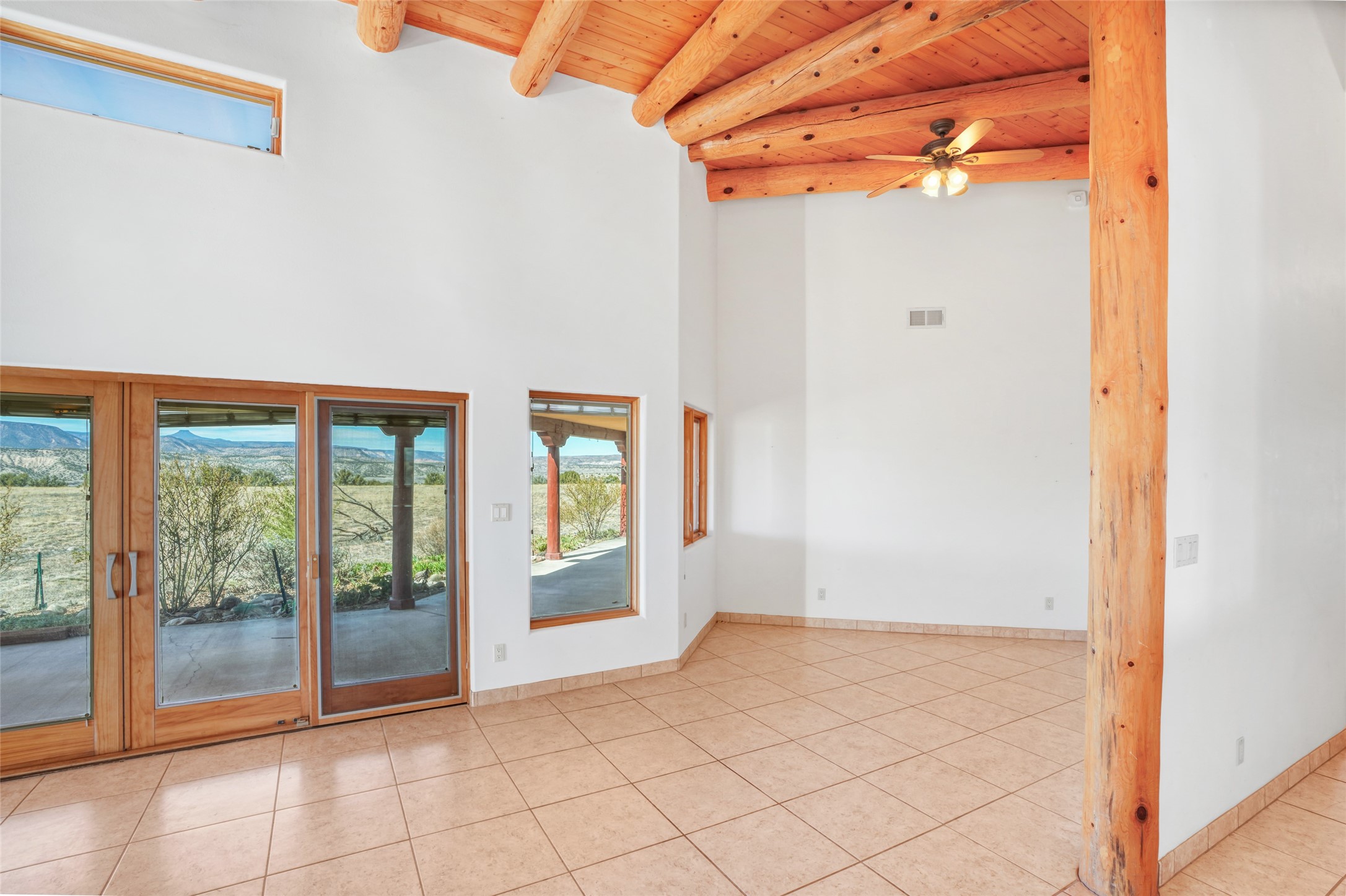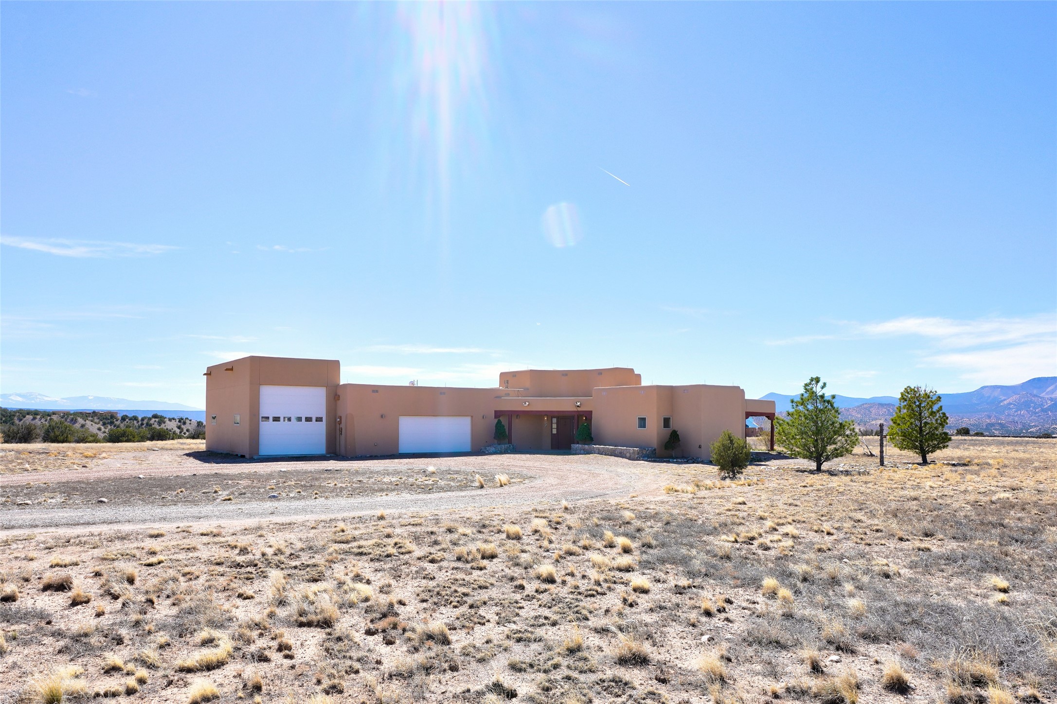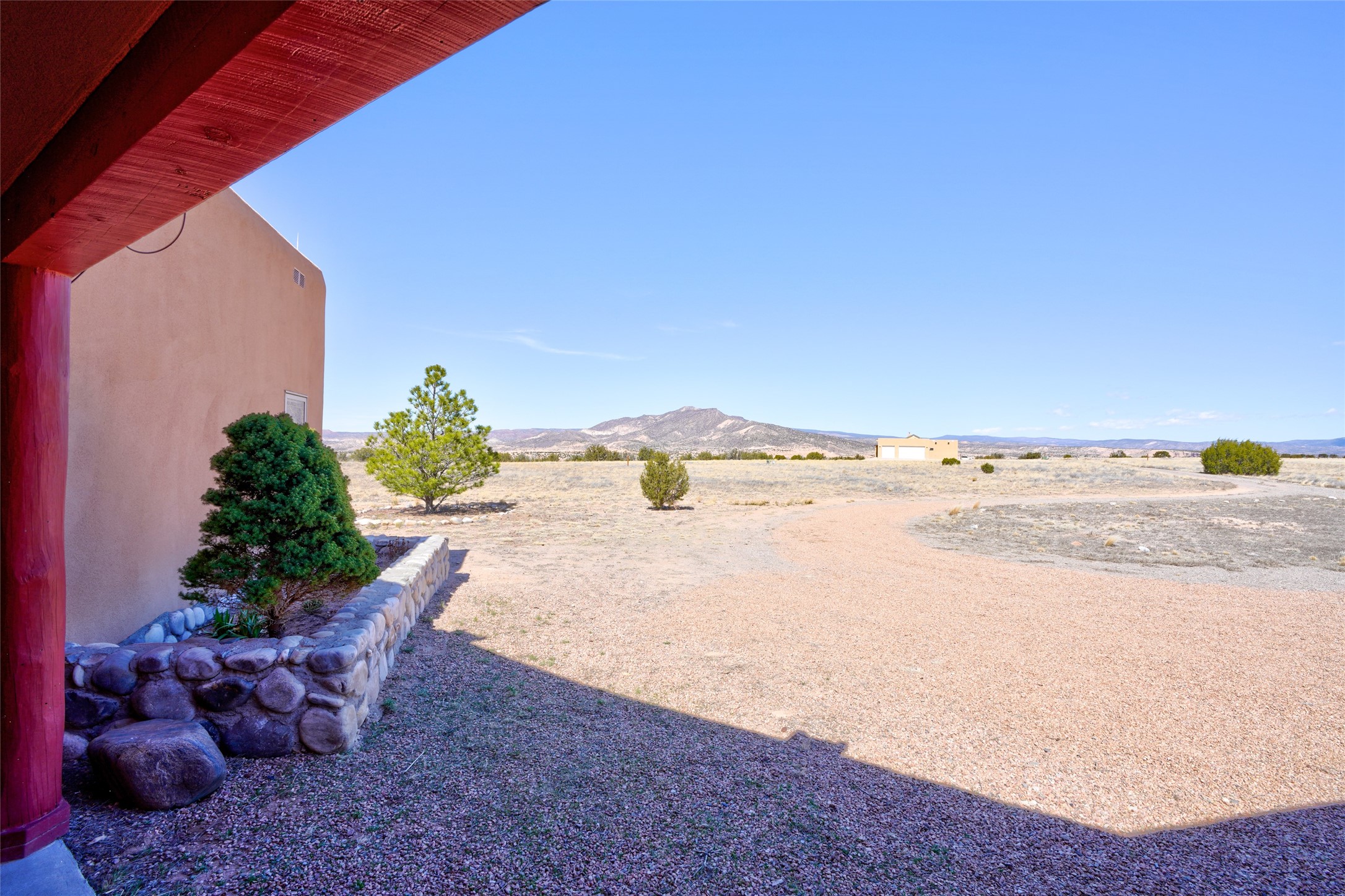 24 Hunter Drive is a pueblo style home in the Vista de Pedernal subdivision near Abiquiu. The home offers three bedrooms and two bathrooms and sits on approximately ten acres with open views across the Rio Chama Valley.The living room features viga ceilings and a wood burning kiva fireplace and opens to a large west facing portal with long views toward Pedernal. The kitchen is open and functional with generous counter space and natural morning light looking east toward the Sangre de Cristo Mountains.There are three garage spaces, including an oversized bay suitable for an RV or large equipment. The land is mostly flat and usable with room for a barn or additional outbuildings. Reasonable covenants are in place to help protect property values while still allowing flexibility for land use.The location provides a manageable drive to Espanola, Santa Fe, and Los Alamos.