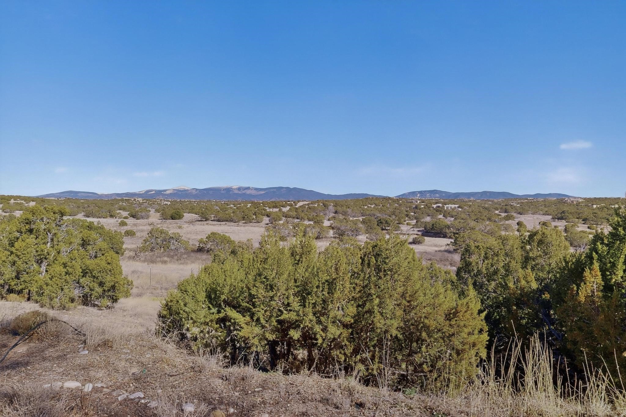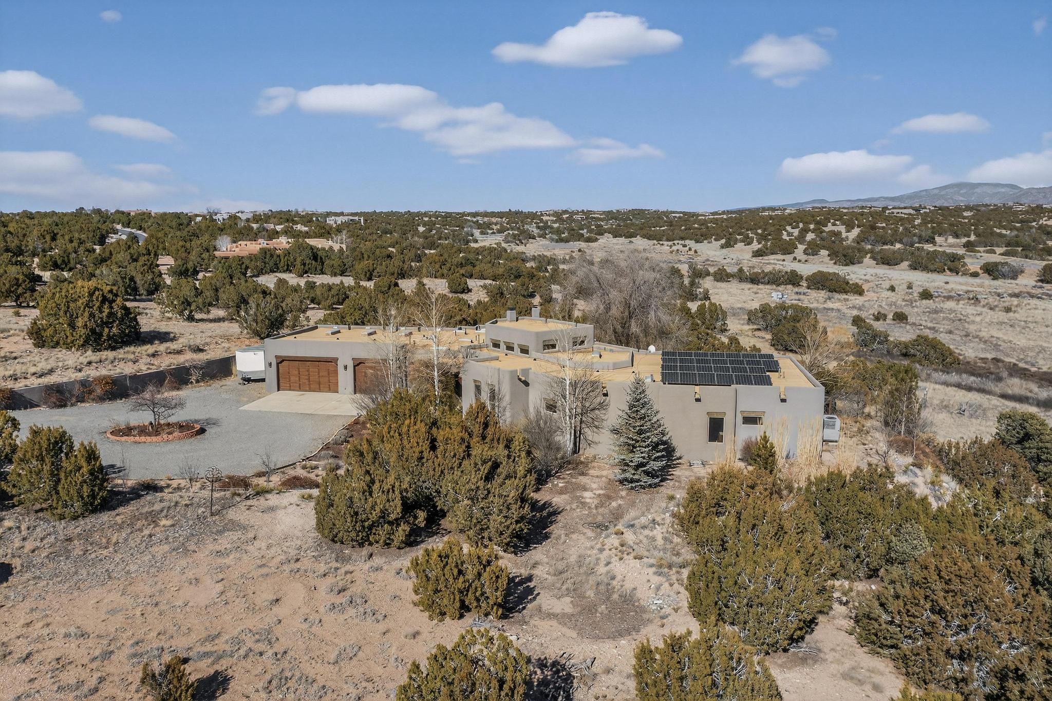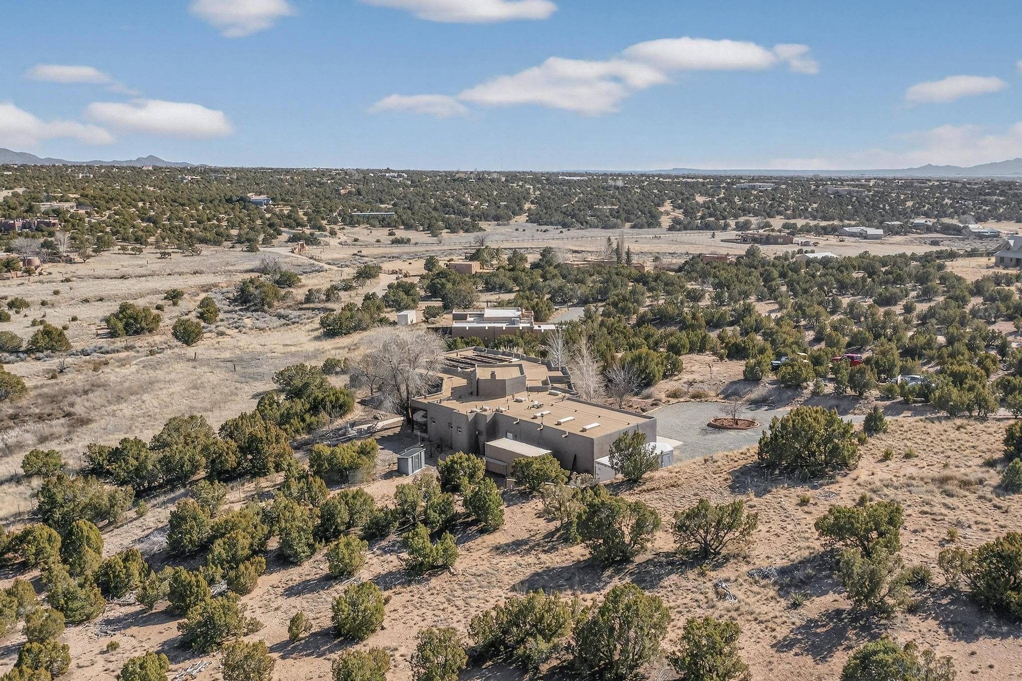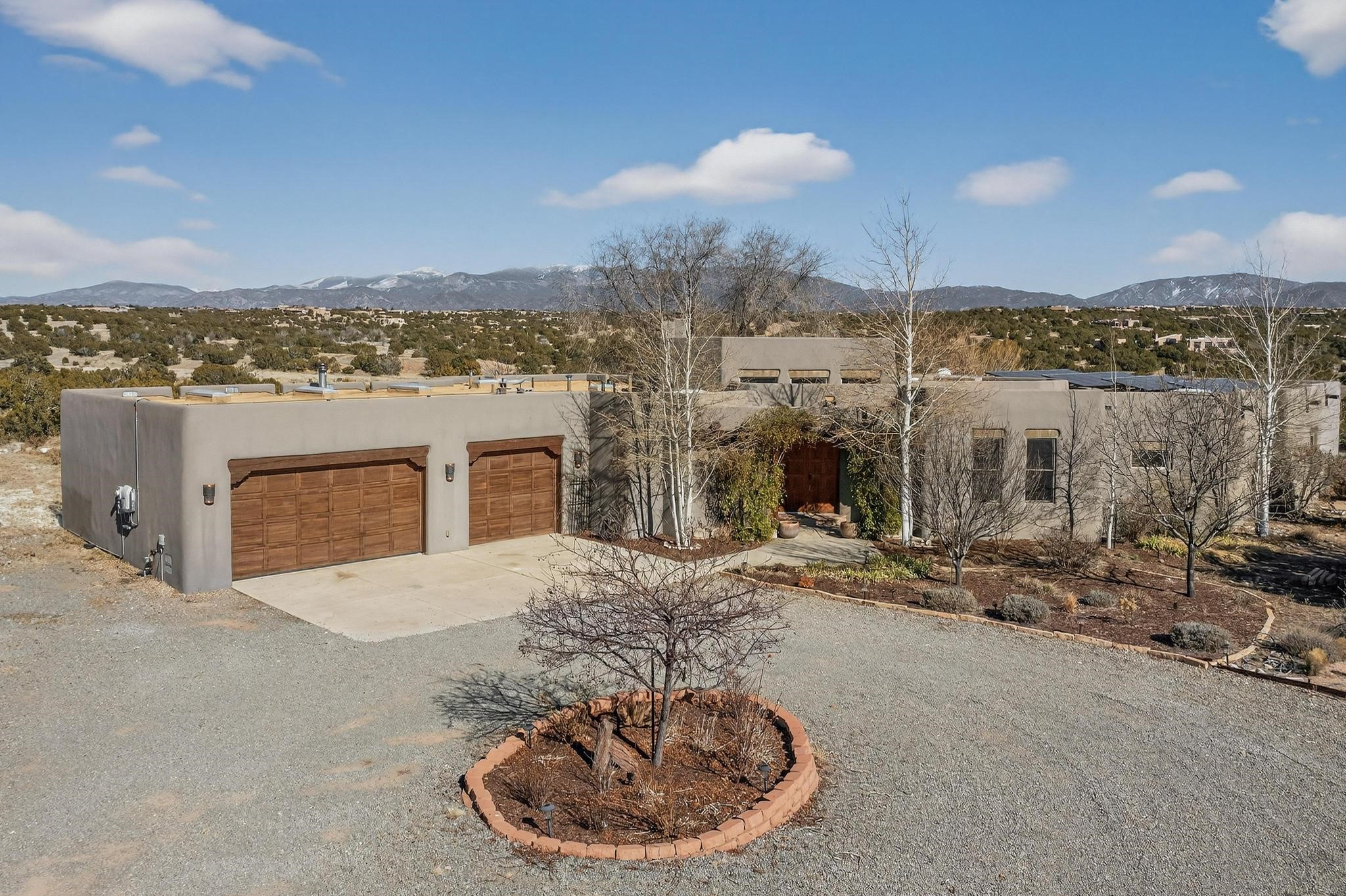 Welcome to 20 Vista Calabasas where Santa Fe style and luxury meet! This incredible home sitting on 5.5 acres of serene high desert landscape, offers 3491 square feet of elegance. Walk into the stunning front door to a grand great room with high ceilings and a direct view of mountain vistas. Continue down the hall enjoying exposed vigas, wood ceilings, diamond finished plaster walls, and tile and wood flooring throughout the home. You'll love preparing meals in the beautiful and large chefs kitchen, equipped with stunning granite countertops and an incredible Wolf range/oven that will make cooking a dream! This 4 bedroom home is cleverly designed with the primary suite on the other side of the home from the other bedrooms with a bonus/possible additional 5th bedroom. In the primary suite you will be charmed by a beautiful diamond finish plaster wood burning fireplace and a private patio door allowing for ample light and views of the Sangre de Cristo mountains. The primary bath has incredible finishes including a large free soaking tub, a large walk in steam shower, and beautiful and large granite countertops. The primary closet is cedar lined with ample space for all your belongings. This home is an entertainers delight! The large living room opens out onto a massive outdoor patio with wide open space stretching far into the distance with stunning views in all directions. This is the perfect place to hold all your upcoming summer gatherings on the cool Santa Fe evenings or wake up and enjoy the peaceful sound of the birds chirping while watching the sun rise in the distance. This home will not disappoint! Schedule your private showing today!