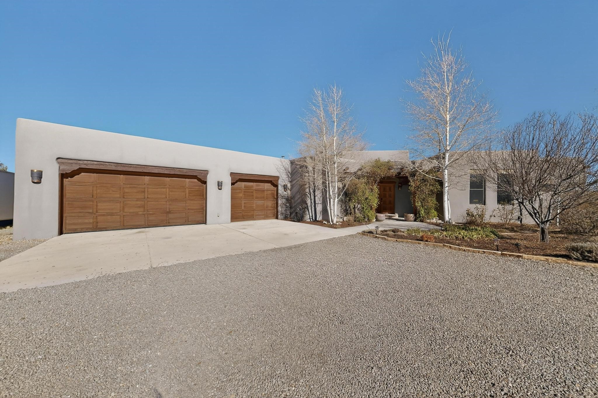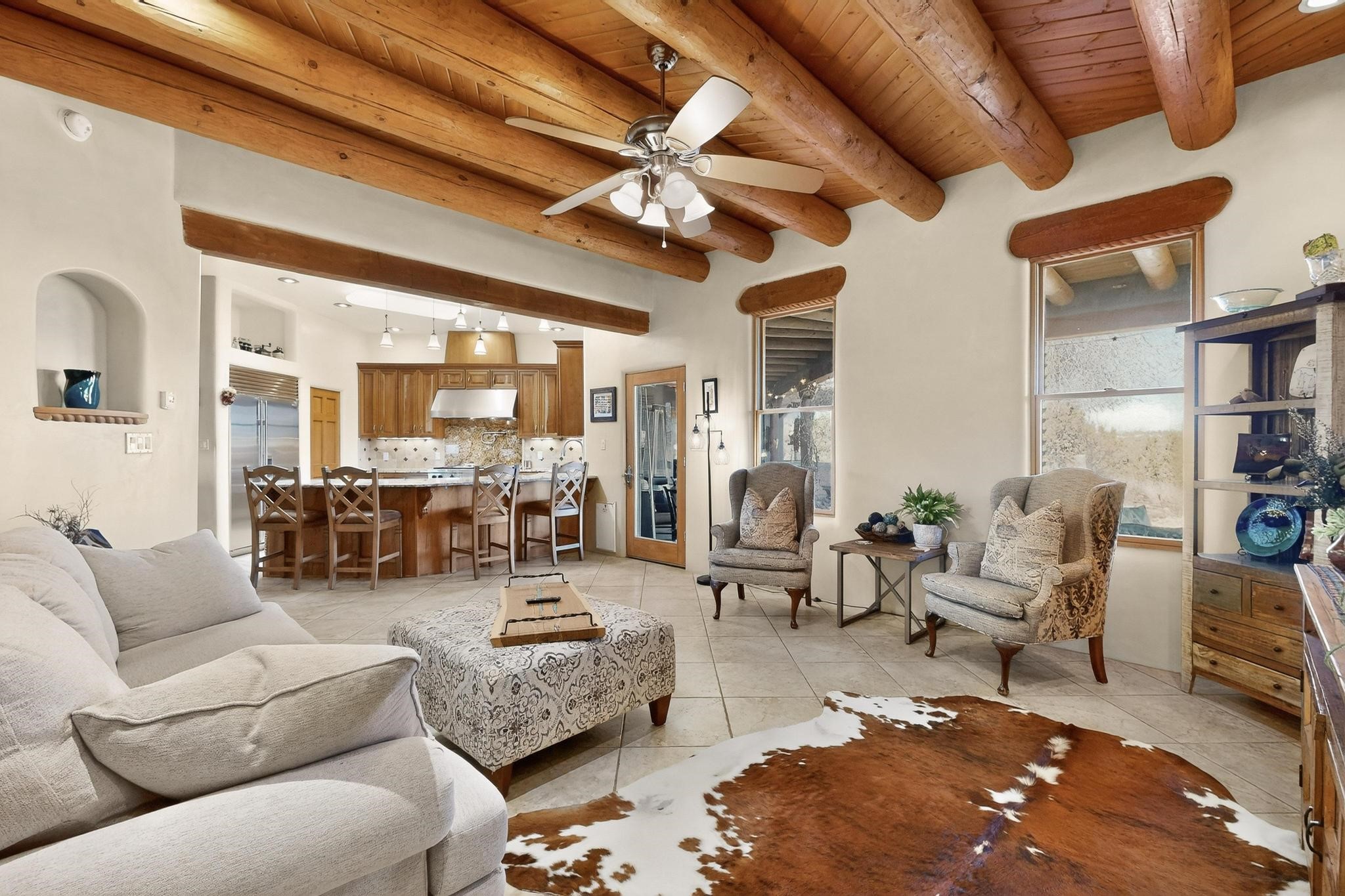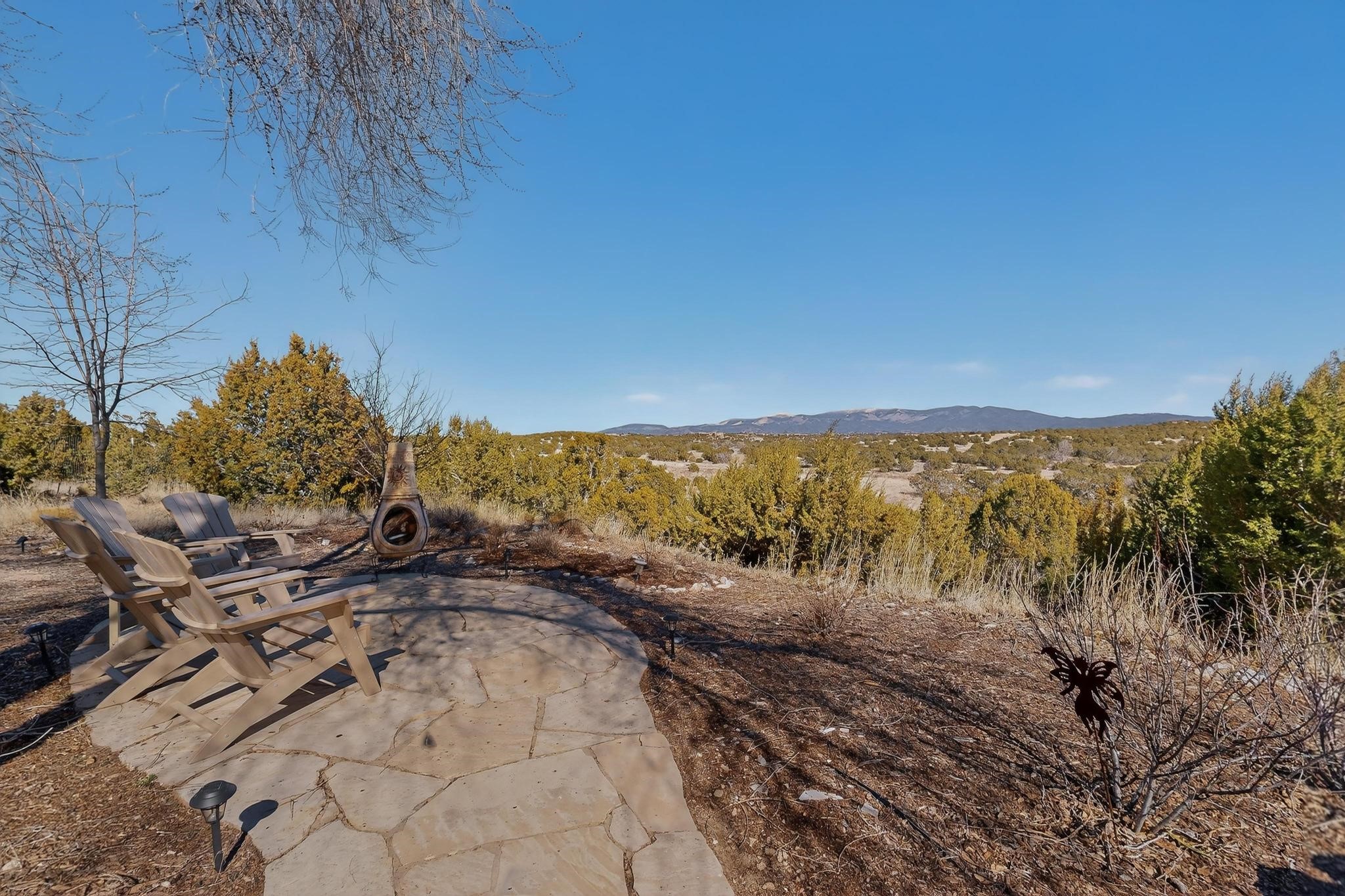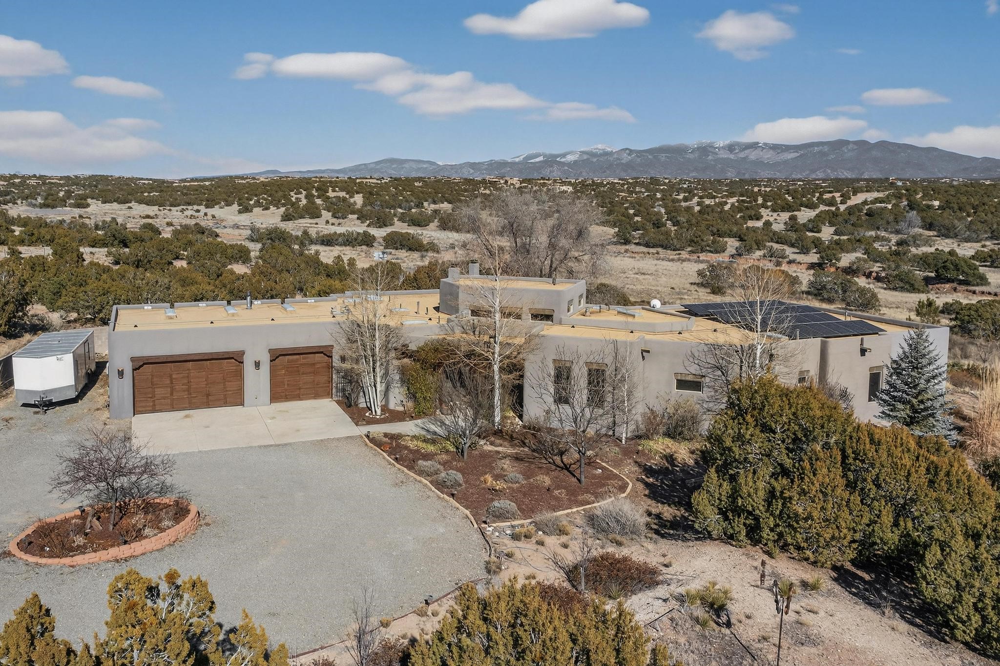 Welcome to 20 Vista Calabasas where Santa Fe style and luxury meet! This incredible home sitting on 5.5 acres of serene high desert landscape, offers 3491 square feet of elegance. Walk into the stunning front door to a grand great room with high ceilings and a direct view of mountain vistas. Continue down the hall enjoying exposed vigas, wood ceilings, diamond finished plaster walls, and tile and wood flooring throughout the home. You'll love preparing meals in the beautiful and large chefs kitchen, equipped with stunning granite countertops and an incredible Wolf range/oven that will make cooking a dream! This 4 bedroom home is cleverly designed with the primary suite on the other side of the home from the other bedrooms with a bonus/possible additional 5th bedroom. In the primary suite you will be charmed by a beautiful diamond finish plaster wood burning fireplace and a private patio door allowing for ample light and views of the Sangre de Cristo mountains. The primary bath has incredible finishes including a large free soaking tub, a large walk in steam shower, and beautiful and large granite countertops. The primary closet is cedar lined with ample space for all your belongings. This home is an entertainers delight! The large living room opens out onto a massive outdoor patio with wide open space stretching far into the distance with stunning views in all directions. This is the perfect place to hold all your upcoming summer gatherings on the cool Santa Fe evenings or wake up and enjoy the peaceful sound of the birds chirping while watching the sun rise in the distance. This home will not disappoint! Schedule your private showing today!
