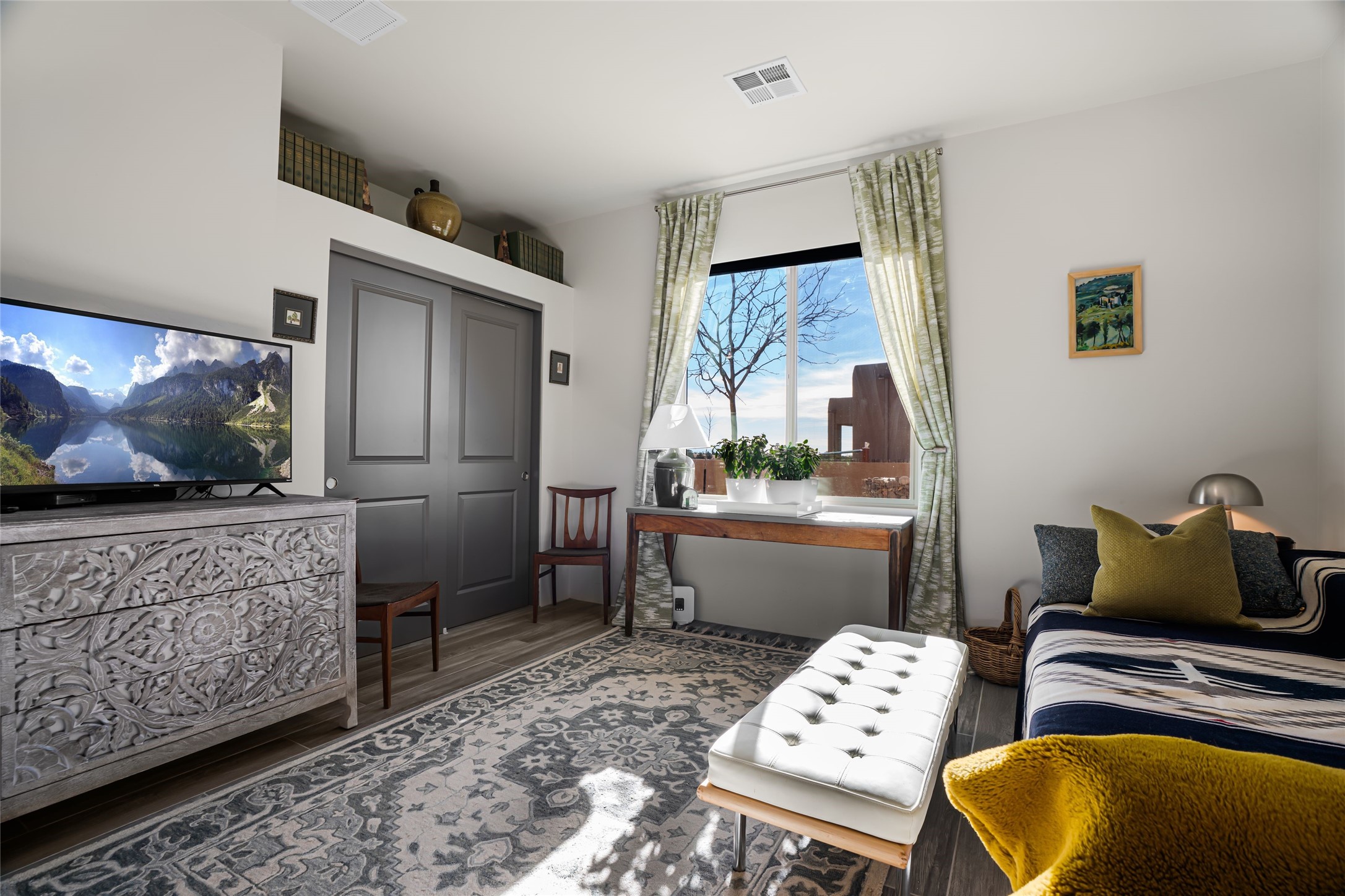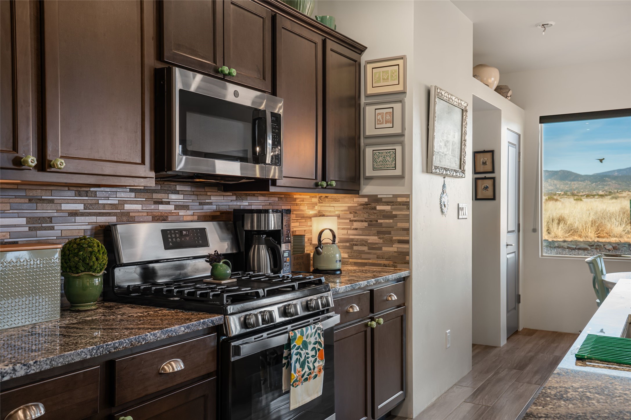 Located on one of the premier Oshara Village estate lots overlooking the green space to the South and the Sangre de Cristo Mountains to the East, this almost new 3 bedroom, 2 bath home was completed spring of 2022 and is a HERS-rated green home through energy efficiency including AC, healthy materials, durability and sustainability. With clean soft contemporary lines, the main living space is open and enjoys a kiva gas fireplace, high ceilings, fantastic light, mountain views and easy access to the outdoor covered portal from which to enjoy sunrises, sunset colors and moonrises over the Sangres. The kitchen has excellent storage in the solid wood cabinets, plenty of prep room on generous granite counters and upgraded stainless appliances, including gas stove and farm sink. The laundry room offers good storage and leads directly into the two car garage. Excellent bedroom separation, the main bedroom is graciously sized, also looks out to the Sangres and has an enormous walk-in closet with plenty of hanging and shelving space. En suite bath with two sinks, granite counters and large walk-in shower. On the other side of the house, the second bedroom has more big mountain vistas, full guest bath adjacent and linen closet. The third bedroom's view is to the south with Sandia views and barn doors to close it off from the main living area, and makes a super media room, office or overflow guest room. The outdoor landscaping includes stone gabions to sculpturally define the space, easy to maintain perennials and conifers and invites the quail, hawks, ravens and roadrunners who live in the adjacent green space. Minutes to the community college, trails and shopping yet just about 15 minutes to the Plaza, this is a very special home, beautifully maintained and lovingly cared for.