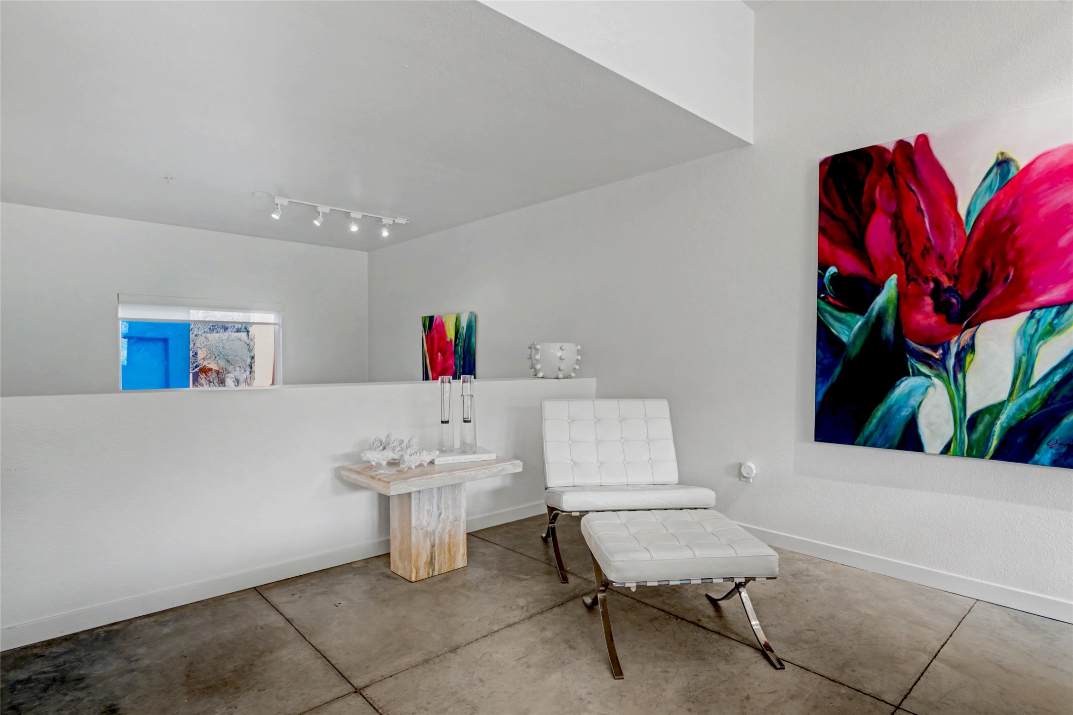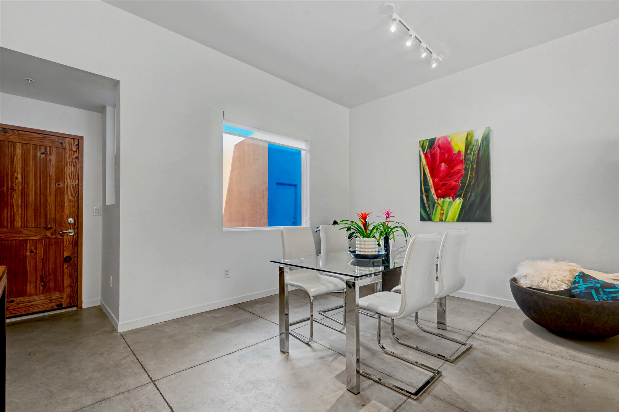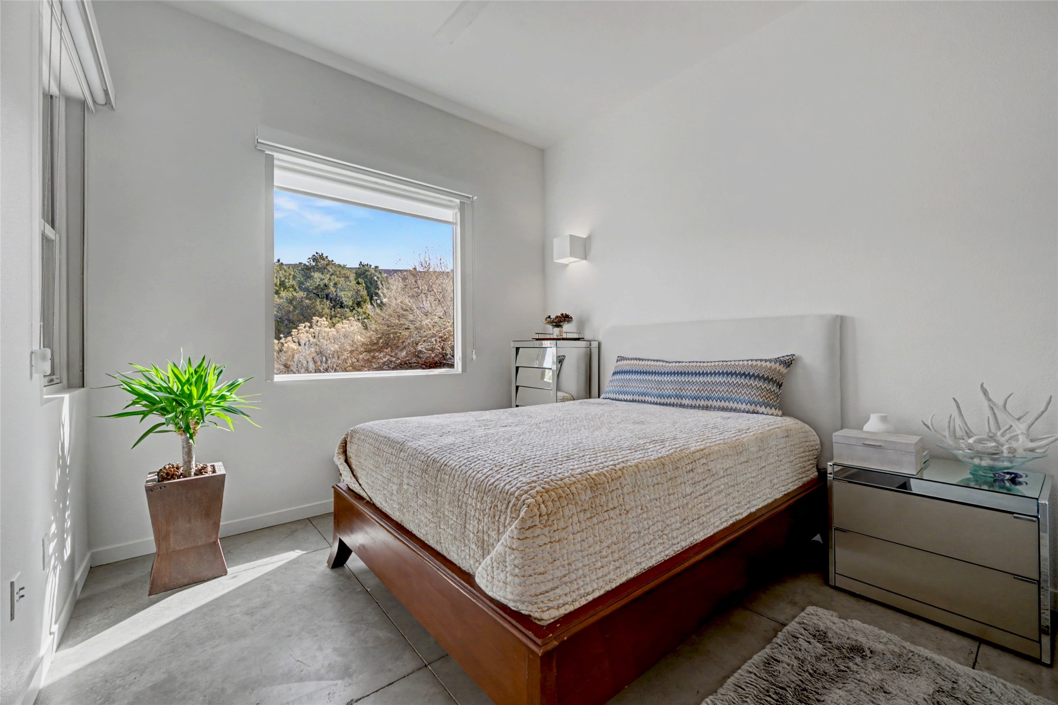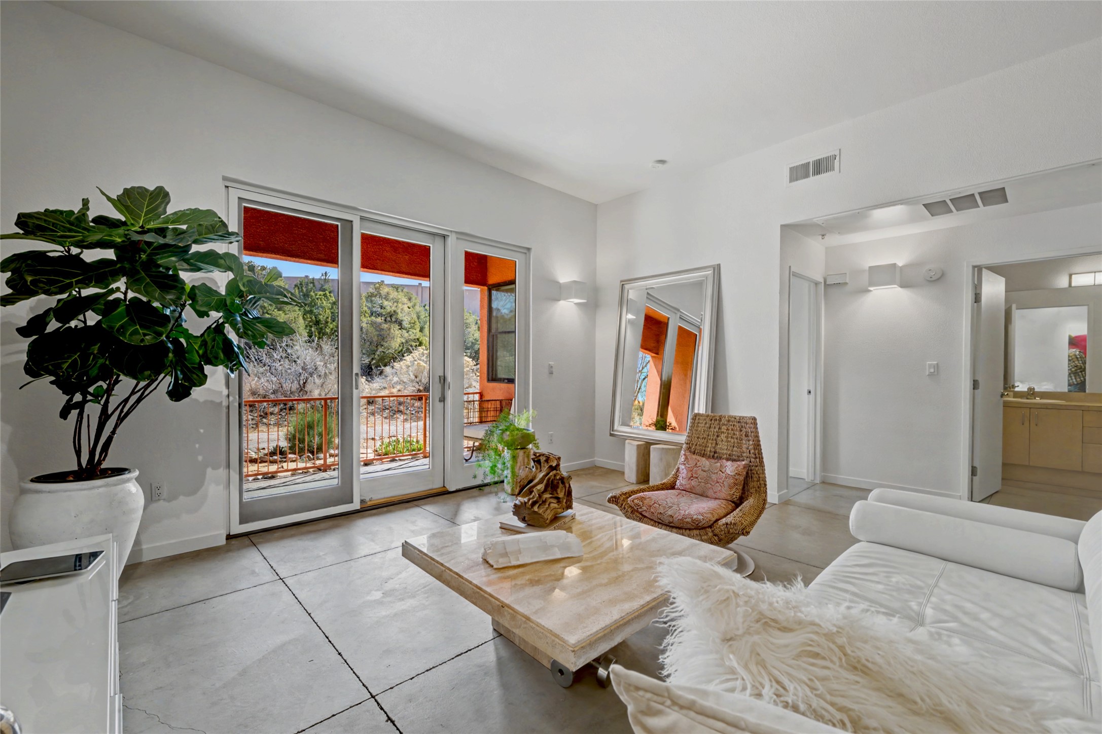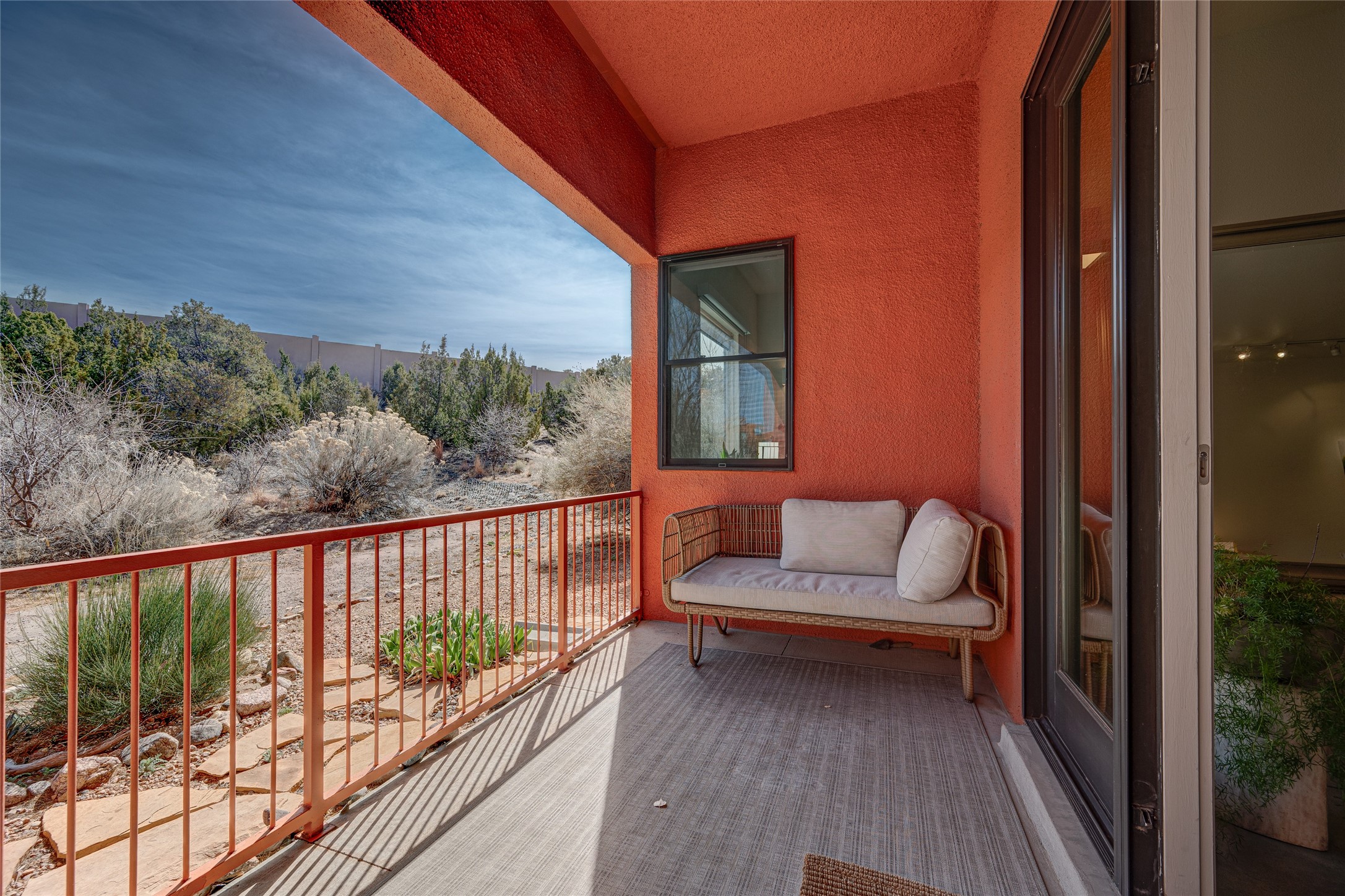 Situated within the architecturally celebrated Zocalo community, this refined ground-floor residence embodies the bold Mexican-modern aesthetic that defines one of Santa Fe's most distinctive neighborhoods. Clean lines, polished concrete floors, high ceilings, and walls of natural light create a sophisticated yet welcoming atmosphere.Morning sun pours into the living spaces, highlighting the home's open-concept design and seamless indoor-outdoor flow. The thoughtfully curated 1,039 square-foot floor plan offers effortless single-level living, enhanced by central air conditioning, travertine tile bathroom, quartz kitchen countertop, stainless steel appliances, laundry, and one-car garage with generous storage -- a rare and valuable amenity.Step outside to your private patio, an intimate setting for morning coffee or evening wine beneath the Santa Fe sky. Just beyond your door, scenic hiking trails connect you to nature, while a pedestrian and bike path provides easy access toward downtown.Zocalo residents enjoy resort-style amenities including a clubhouse, pool, spa, bbq grills, and two fitness facilities - all within a community known for its architectural integrity and strong sense of place.Ideally located near the Santa Fe Plaza, Los Alamos, Santa Fe Opera, premier shopping, and the Santa Fe Airport, this residence offers accessibility.For the discerning buyer seeking design, convenience, and a lock-and-leave lifestyle in one of Santa Fe's iconic communities, this is an exceptional opportunity.