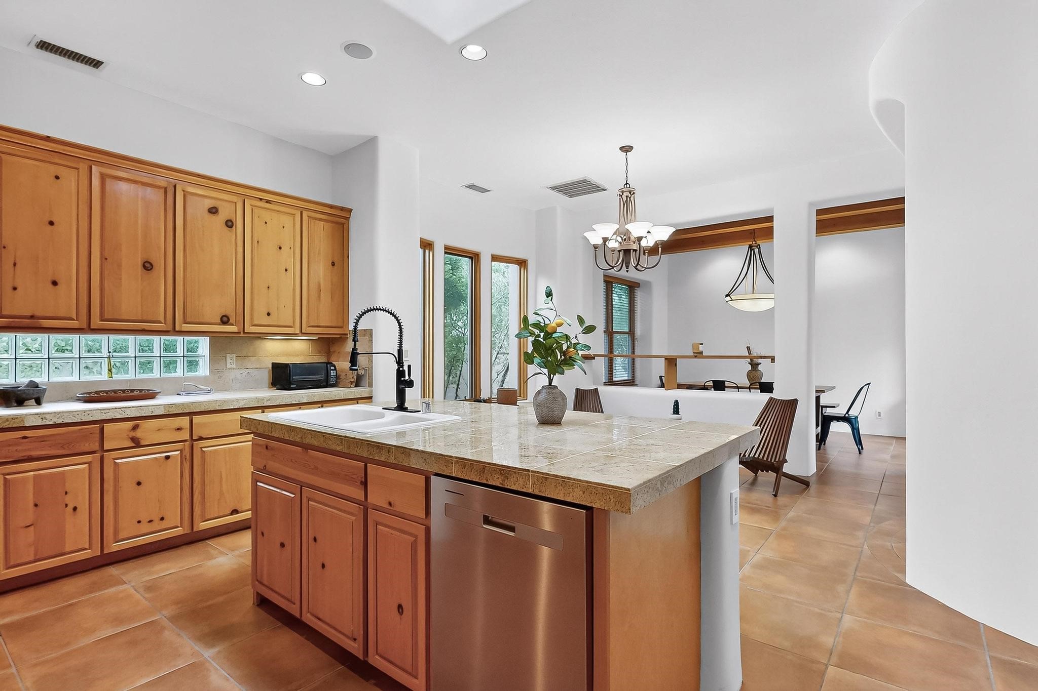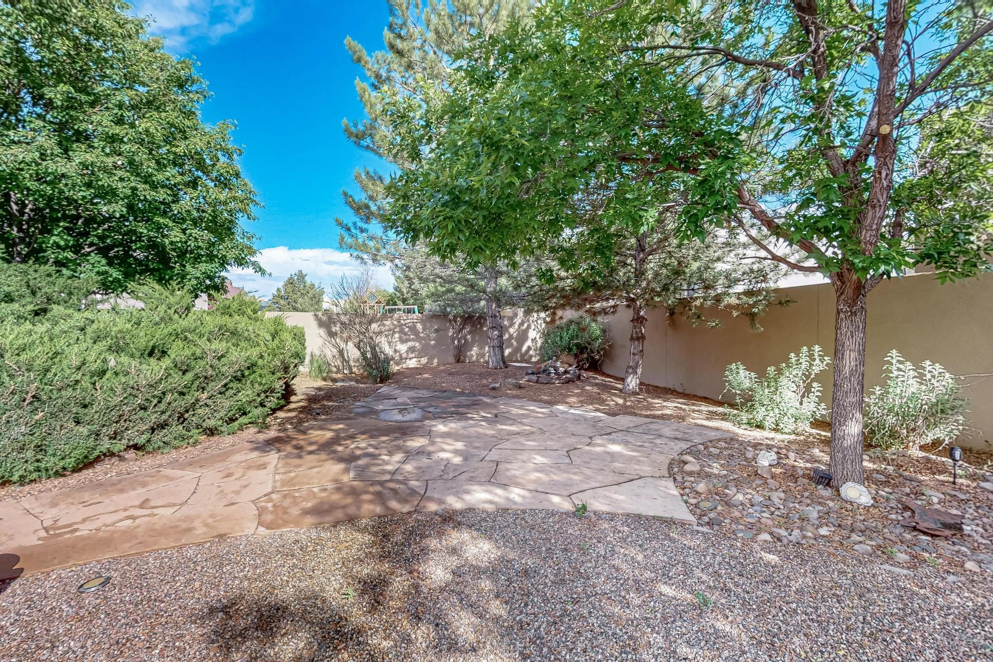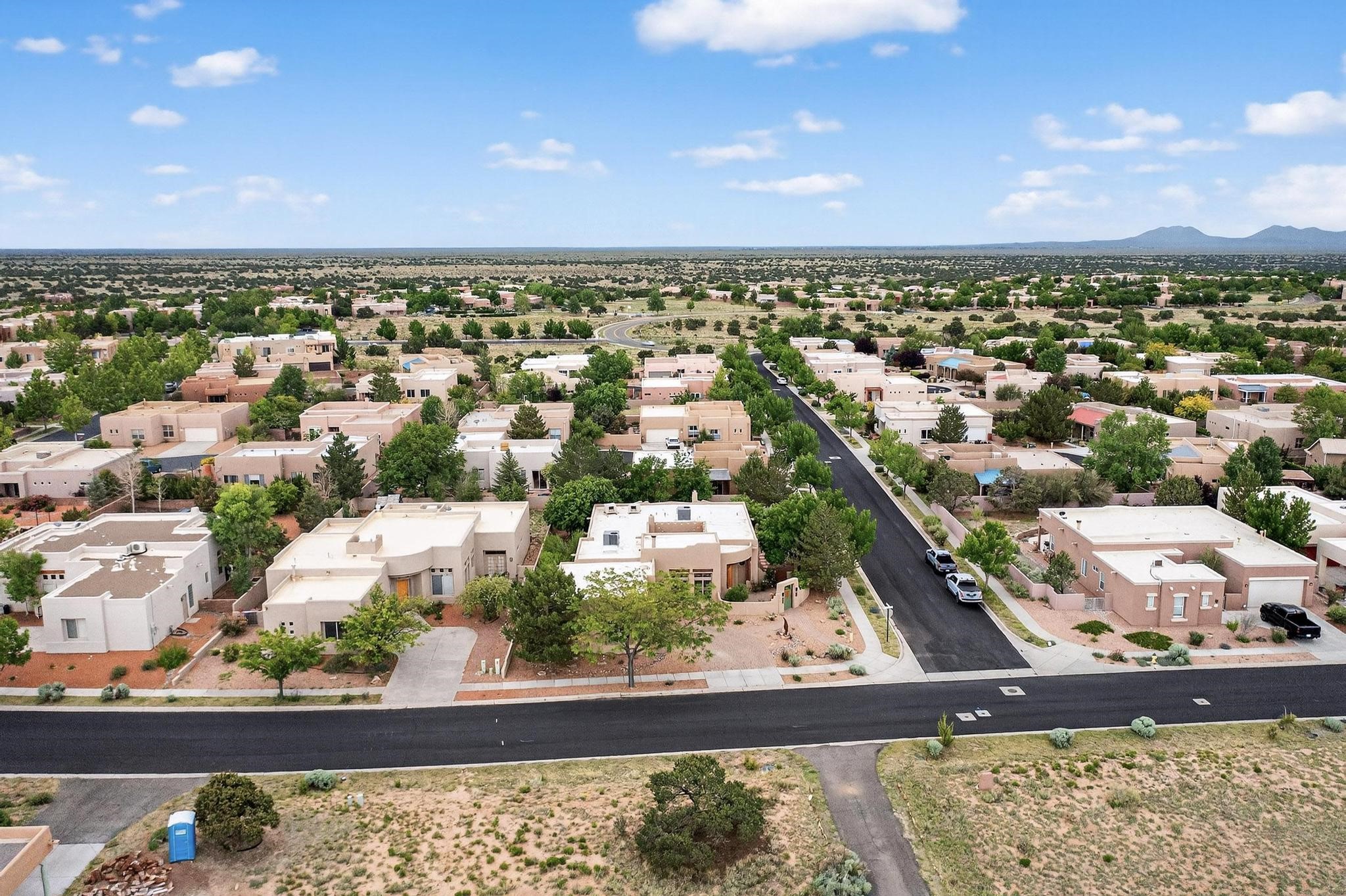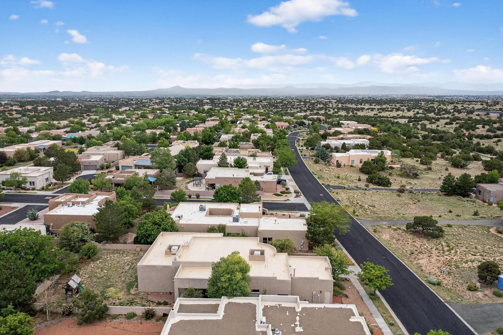This stunning home in the highly desirable Rancho Viejo community is truly something special! Formerly a Parade of Homes model, this unique floor plan is one of only a few in the neighborhood. From the moment you walk in, you're welcomed by a warm foyer with carved vigas that opens into a breathtaking living space. Soaring 14-foot tongue-and-groove ceilings, exposed beams, a built-in bookcase, and a classic kiva fireplace create an inviting atmosphere filled with natural light from expansive windows. The entire interior was freshly painted in 2023, giving the home a clean, updated feel. The chef's kitchen is as functional as it is beautiful, featuring high-end appliances, dual convection ovens, and easy access to outdoor living spaces--perfect for entertaining. At the center of the home, you'll find a peaceful flagstone patio with its own kiva fireplace, accessible from four different doors. It's the perfect setup for gatherings, relaxing evenings, or simply enjoying the New Mexico sunshine. Comfort and efficiency shine here, too. Two zoned combo heating and cooling systems (installed in 2023), smart thermostats, and radiant heated floors throughout the entire home ensure year-round comfort. You'll also love the whole-house built-in audio system, Tesla charging station, and custom solid wood doors that add warmth and authenticity to every space. The exterior stucco was replaced in 2021, bedroom flooring has been recently upgraded, and the home features a built-in rainwater collection system with an underground cistern, water pump, and spout--thoughtfully designed for sustainability.A private office tucked away near the primary suite offers built-in cabinetry and shelving, making it ideal for remote work or creative projects. And don't miss the rear patio--complete with a kiva fireplace, gas line ready for your grill, and beautiful viga-accented tongue-and-groove ceilings--extending the home's Southwestern charm outdoors.