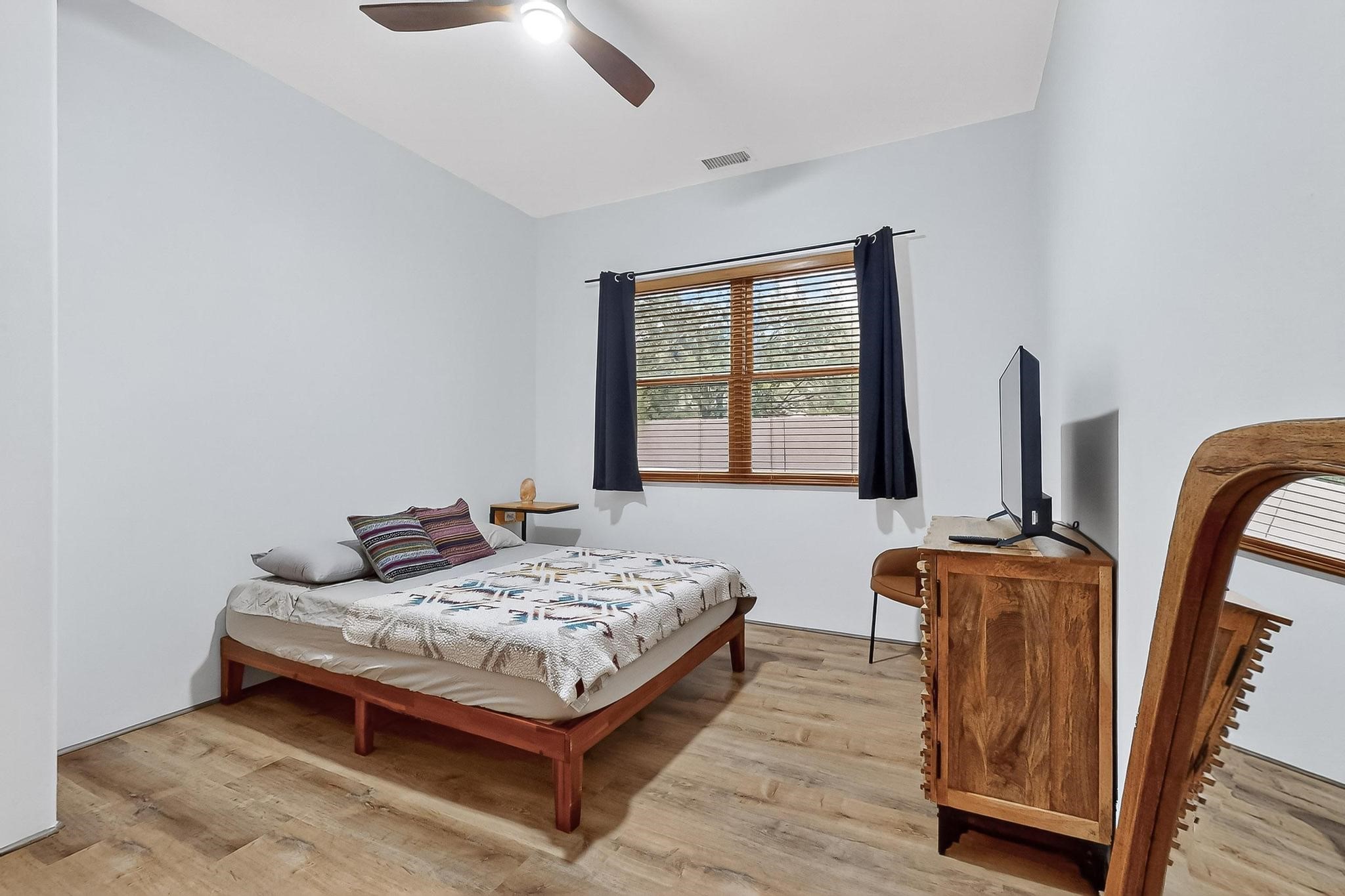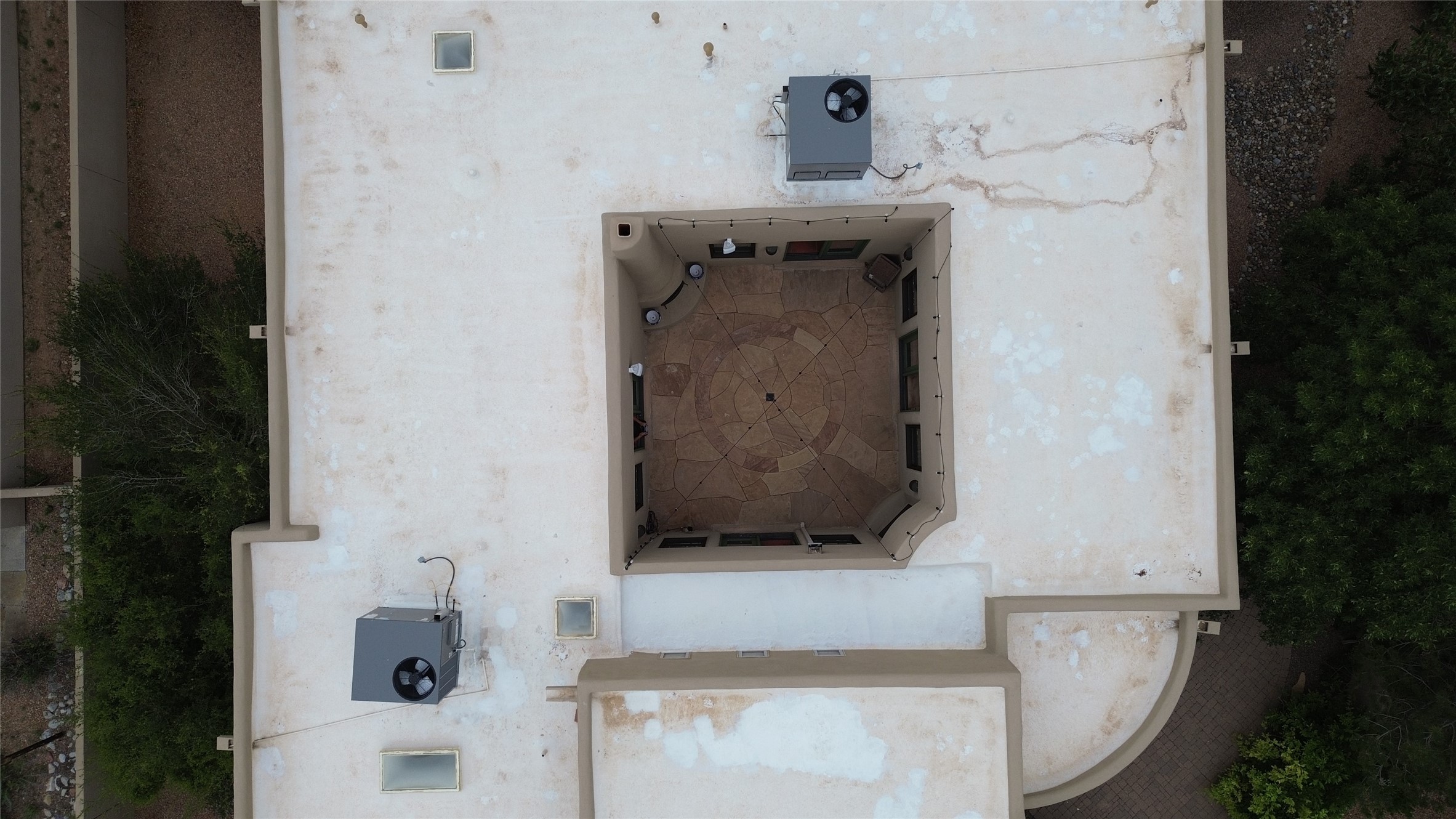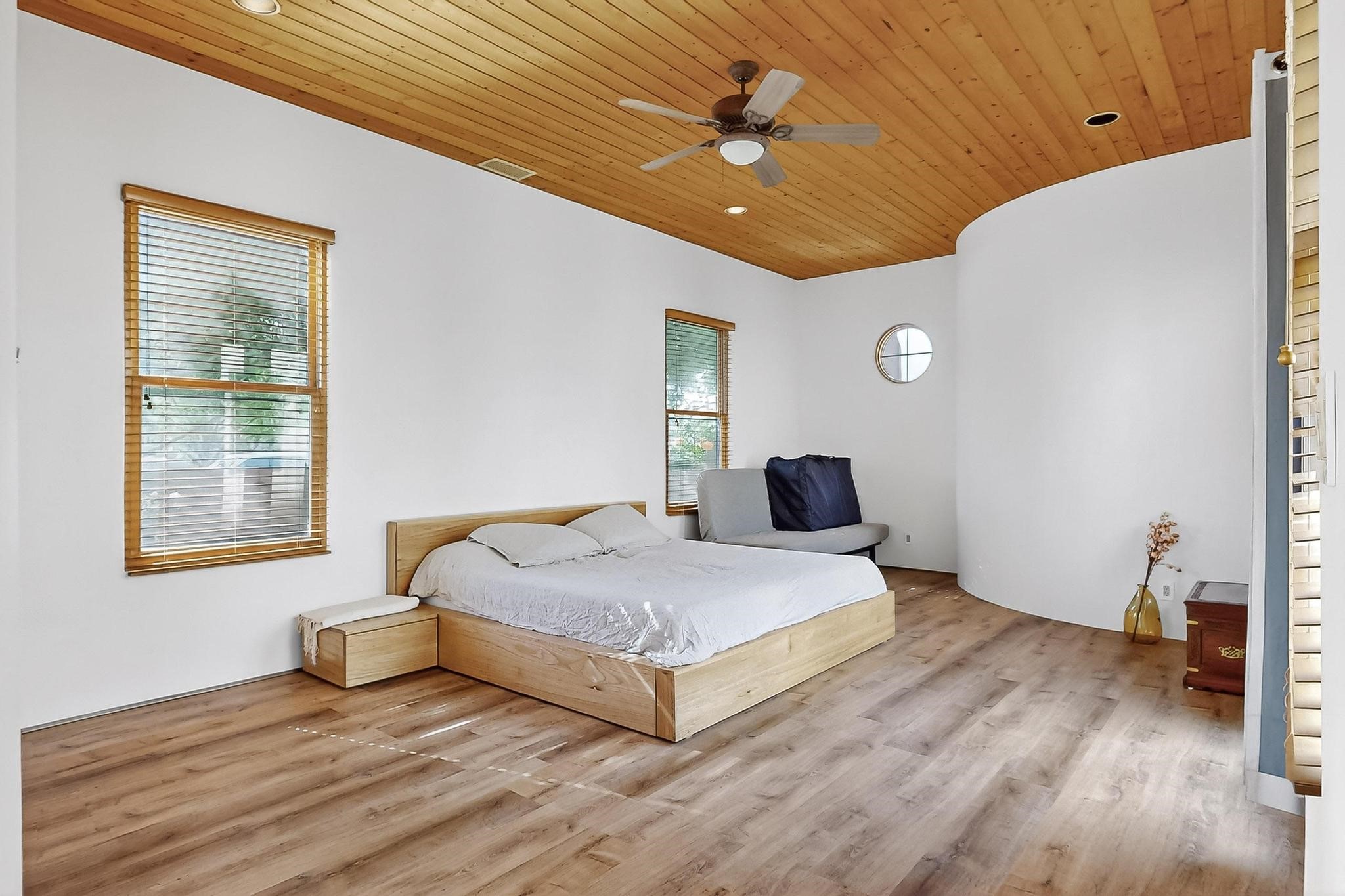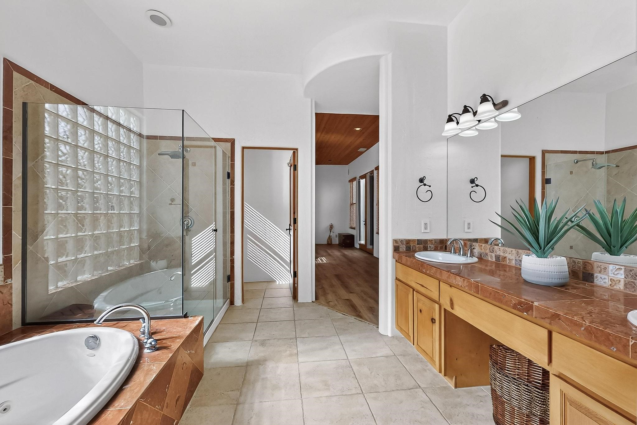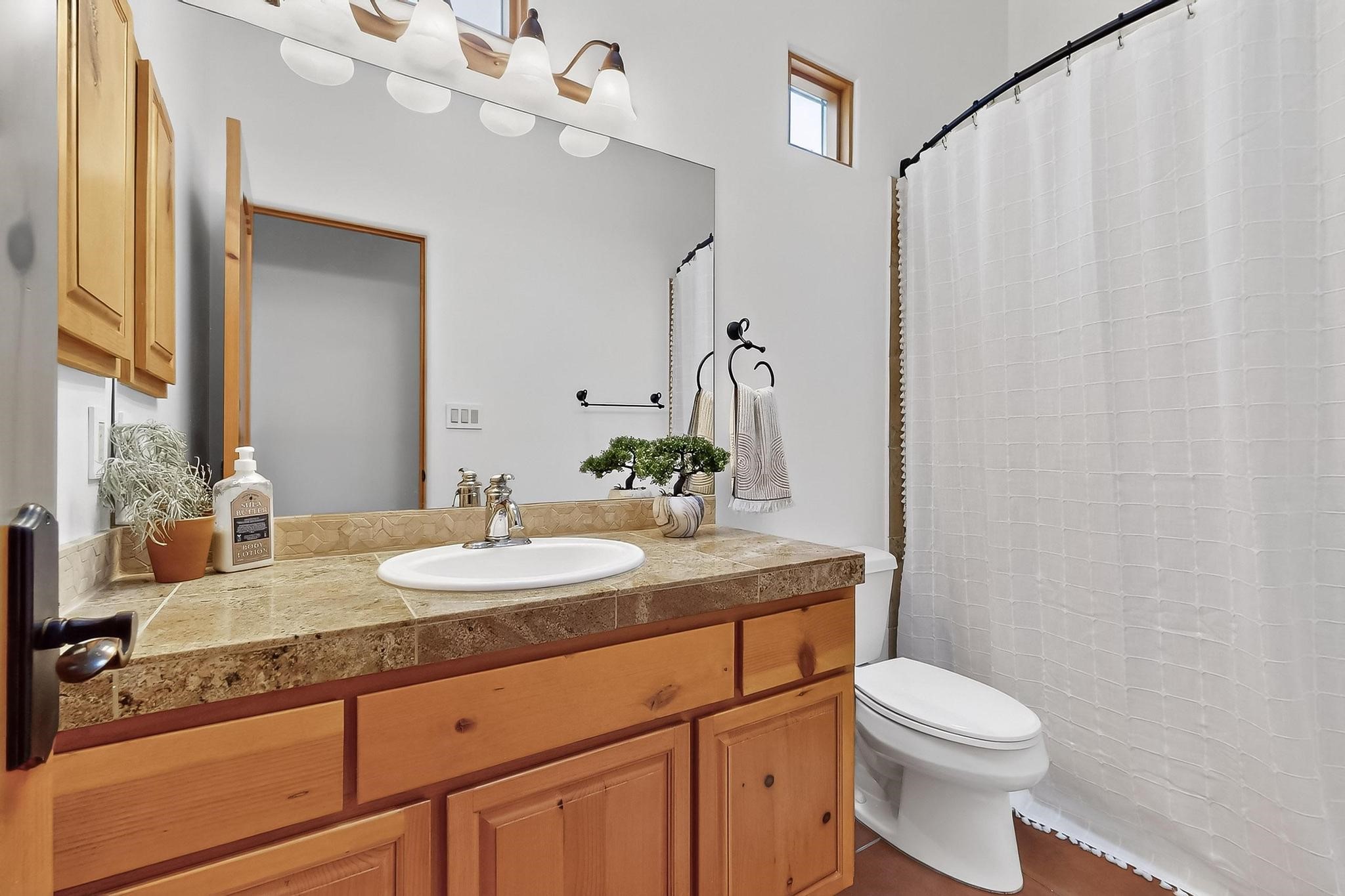 This stunning home in the highly desirable Rancho Viejo community is truly something special! Formerly a Parade of Homes model, this unique floor plan is one of only a few in the neighborhood. From the moment you walk in, you're welcomed by a warm foyer with carved vigas that opens into a breathtaking living space. Soaring 14-foot tongue-and-groove ceilings, exposed beams, a built-in bookcase, and a classic kiva fireplace create an inviting atmosphere filled with natural light from expansive windows. The entire interior was freshly painted in 2023, giving the home a clean, updated feel. The chef's kitchen is as functional as it is beautiful, featuring high-end appliances, dual convection ovens, and easy access to outdoor living spaces--perfect for entertaining. At the center of the home, you'll find a peaceful flagstone patio with its own kiva fireplace, accessible from four different doors. It's the perfect setup for gatherings, relaxing evenings, or simply enjoying the New Mexico sunshine. Comfort and efficiency shine here, too. Two zoned combo heating and cooling systems (installed in 2023), smart thermostats, and radiant heated floors throughout the entire home ensure year-round comfort. You'll also love the whole-house built-in audio system, Tesla charging station, and custom solid wood doors that add warmth and authenticity to every space. The exterior stucco was replaced in 2021, bedroom flooring has been recently upgraded, and the home features a built-in rainwater collection system with an underground cistern, water pump, and spout--thoughtfully designed for sustainability.A private office tucked away near the primary suite offers built-in cabinetry and shelving, making it ideal for remote work or creative projects. And don't miss the rear patio--complete with a kiva fireplace, gas line ready for your grill, and beautiful viga-accented tongue-and-groove ceilings--extending the home's Southwestern charm outdoors.