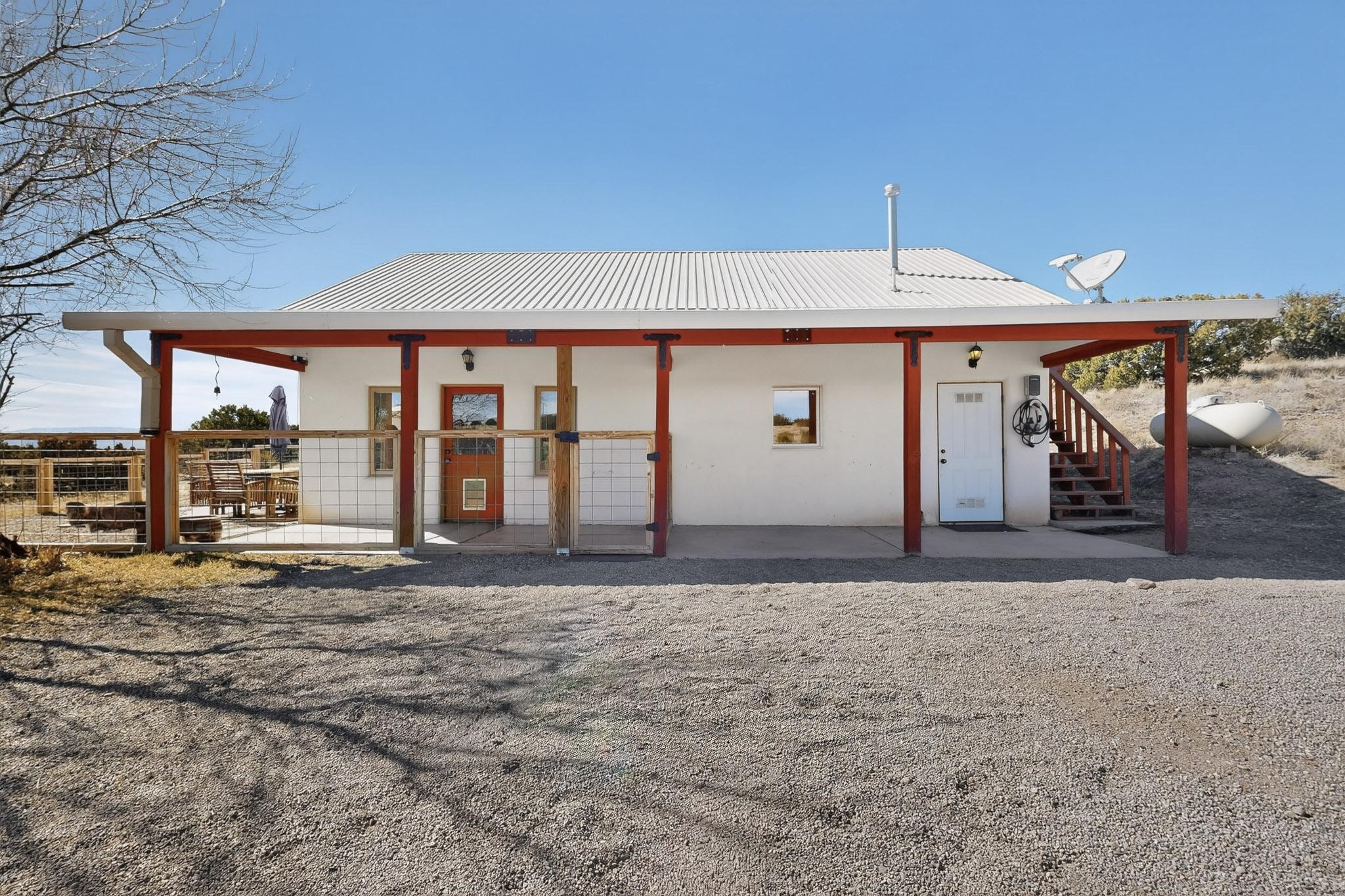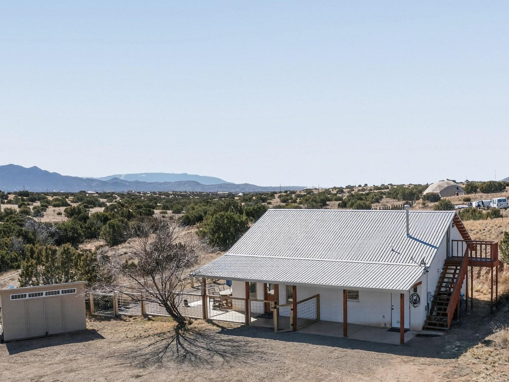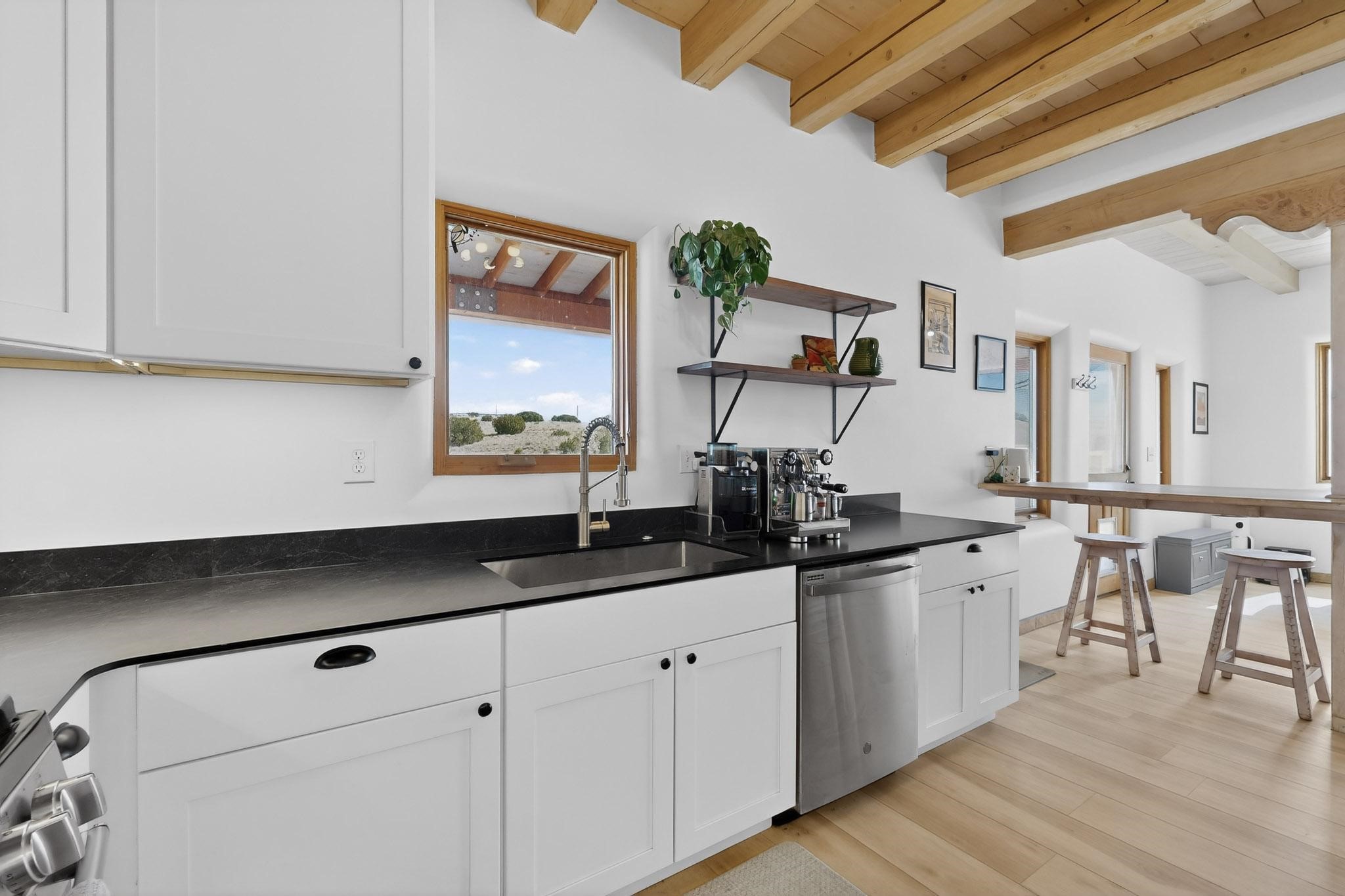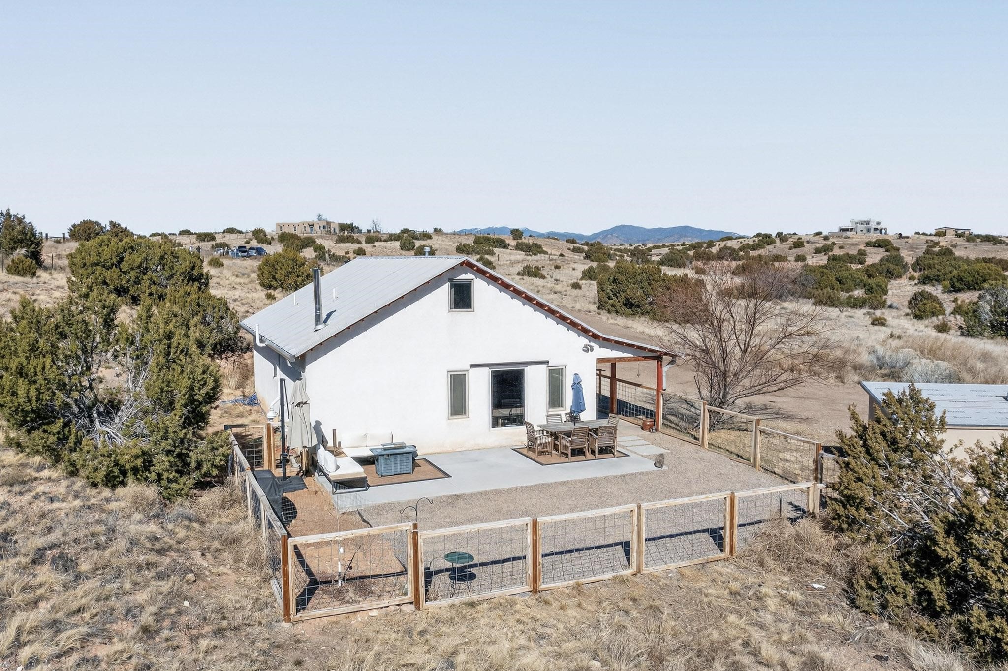 Nestled at the end of private drive, this Northern New Mexico-style home (built 2011) offers something rare: privacy, open space, and low operating costs, all just 25 minutes from downtown Santa Fe. Set on over 6 acres with mountain views, enjoy morning coffee on the patio as the sun rises or unwind with a hike on your own land as sunset settles over the Ortiz and Sandia ranges. Constructed with insulated concrete forms (ICF), thick walls provide exceptional insulation. Natural wood beams, high ceilings, and large windows connect the interior to the surrounding landscape. In-floor radiant heat and a wood-burning stove add comfort. The kitchen, remodeled in 2023, blends clean design with environmentally conscious materials, including Wilsonart® THINSCAPE performance countertops. Made from a sustainable, high-density engineered composite and GREENGUARD Gold certified, these sleek surfaces offer low maintenance and an eco-friendly footprint. Generous cabinetry and open flow into the living space create relaxed, everyday living. The main level has new flooring throughout. Downstairs there's a spacious primary bedroom and renovated bath (which could easily be modified to include a second bathroom). Upstairs, two bedrooms provide flexibility for guests, a home office, or creative space, with access to a deck overlooking the acreage. A fully owned solar system covers most electrical usage, reducing utility costs and supporting a sustainable lifestyle. A metal roof, newly installed radon mitigation system, recent pre-inspection with health and safety items addressed, and hog-wire perimeter fencing provide practical peace of mind. Horses are allowed, offering future possibilities. This is a home for someone who values independence without isolation, land to explore, space to breathe, and a thoughtfully built retreat less than a half hour from downtown Santa Fe.