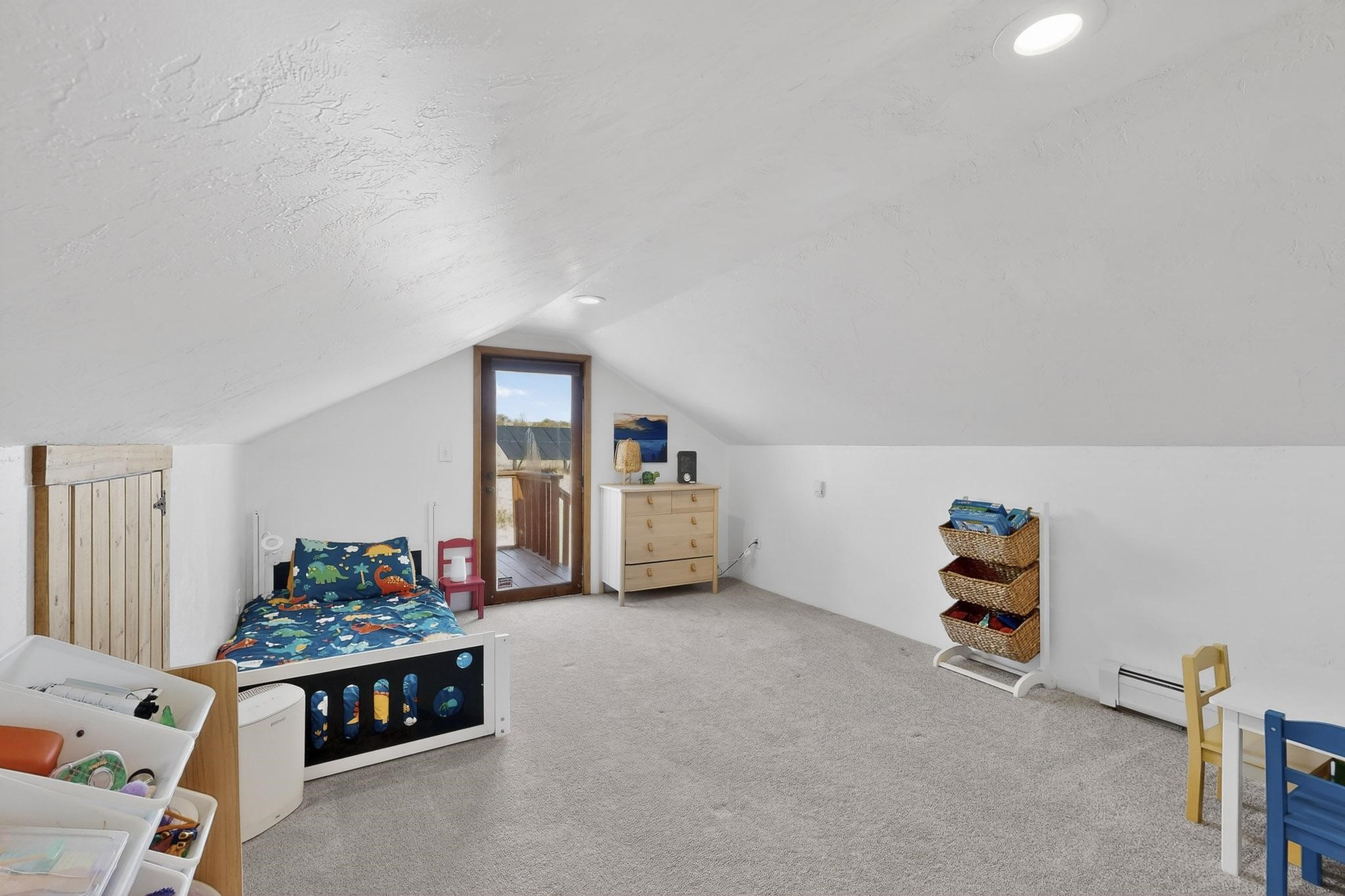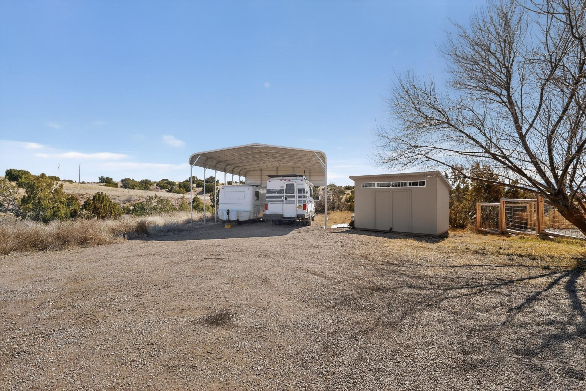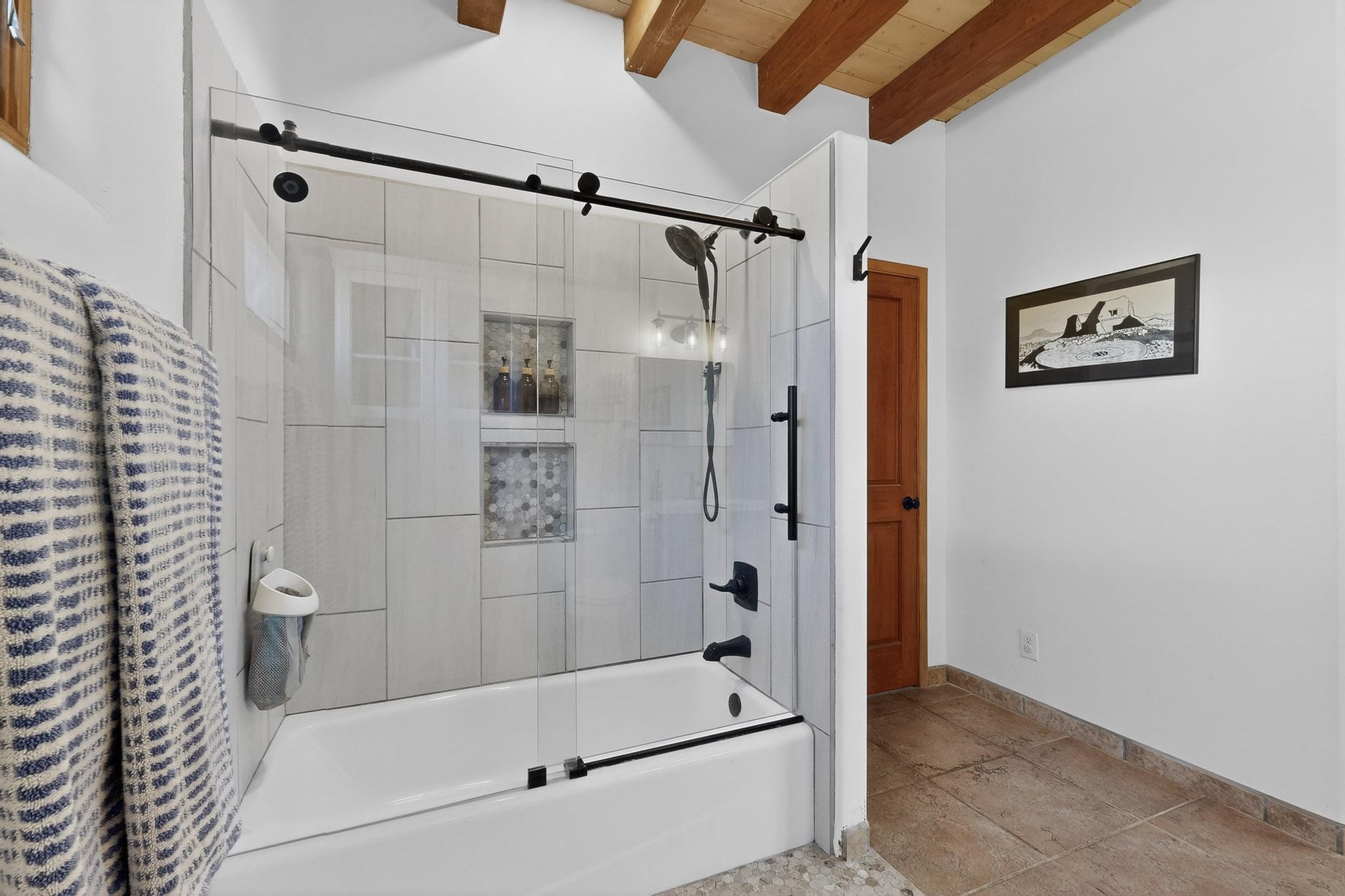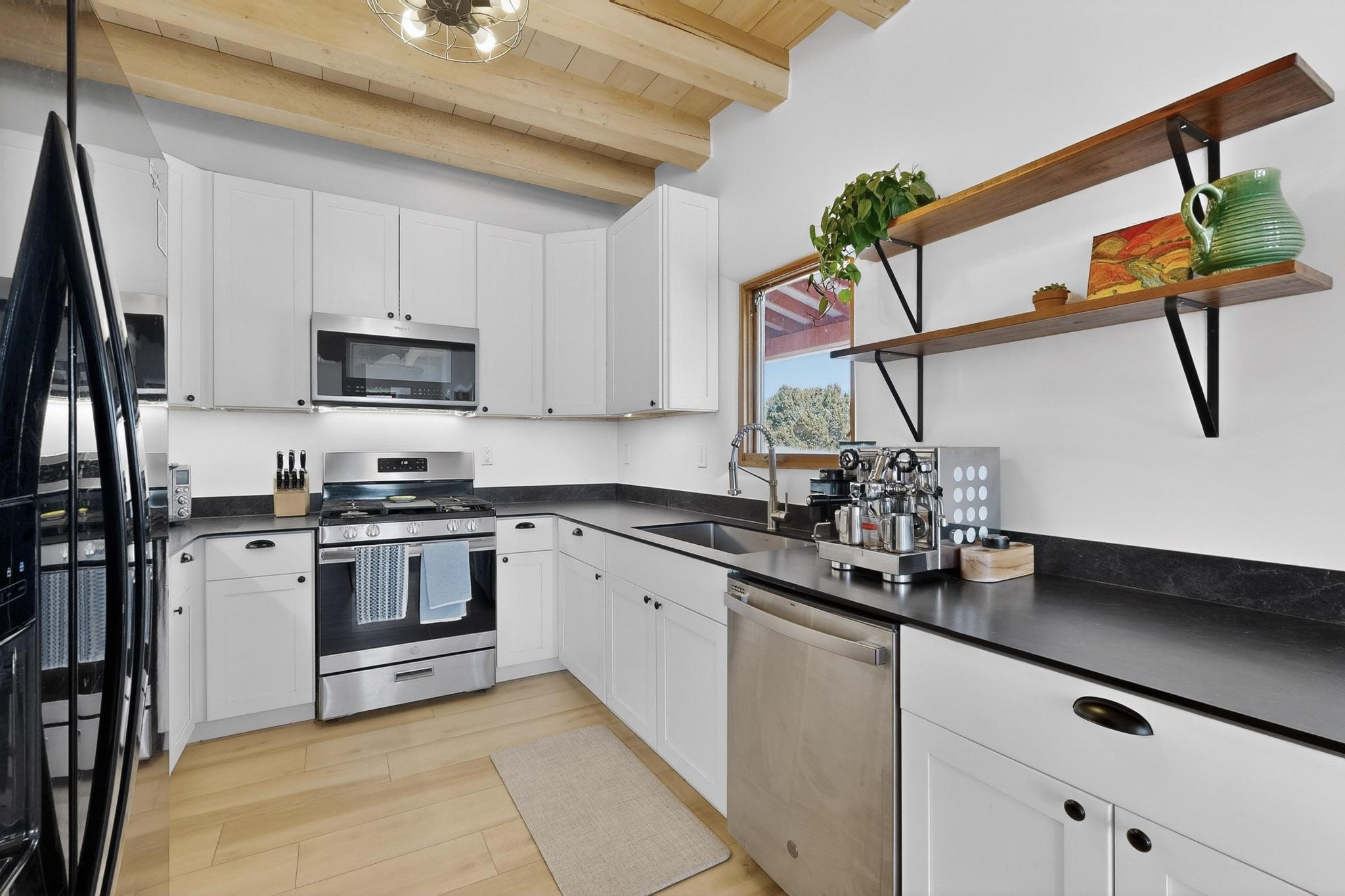 Nestled at the end of private drive, this Northern New Mexico-style home (built 2011) offers something rare: privacy, open space, and low operating costs, all just 25 minutes from downtown Santa Fe. Set on over 6 acres with mountain views, enjoy morning coffee on the patio as the sun rises or unwind with a hike on your own land as sunset settles over the Ortiz and Sandia ranges. Constructed with insulated concrete forms (ICF), thick walls provide exceptional insulation. Natural wood beams, high ceilings, and large windows connect the interior to the surrounding landscape. In-floor radiant heat and a wood-burning stove add comfort. The kitchen, remodeled in 2023, blends clean design with environmentally conscious materials, including Wilsonart® THINSCAPE performance countertops. Made from a sustainable, high-density engineered composite and GREENGUARD Gold certified, these sleek surfaces offer low maintenance and an eco-friendly footprint. Generous cabinetry and open flow into the living space create relaxed, everyday living. The main level has new flooring throughout. Downstairs there's a spacious primary bedroom and renovated bath (which could easily be modified to include a second bathroom). Upstairs, two bedrooms provide flexibility for guests, a home office, or creative space, with access to a deck overlooking the acreage. A fully owned solar system covers most electrical usage, reducing utility costs and supporting a sustainable lifestyle. A metal roof, newly installed radon mitigation system, recent pre-inspection with health and safety items addressed, and hog-wire perimeter fencing provide practical peace of mind. Horses are allowed, offering future possibilities. This is a home for someone who values independence without isolation, land to explore, space to breathe, and a thoughtfully built retreat less than a half hour from downtown Santa Fe.