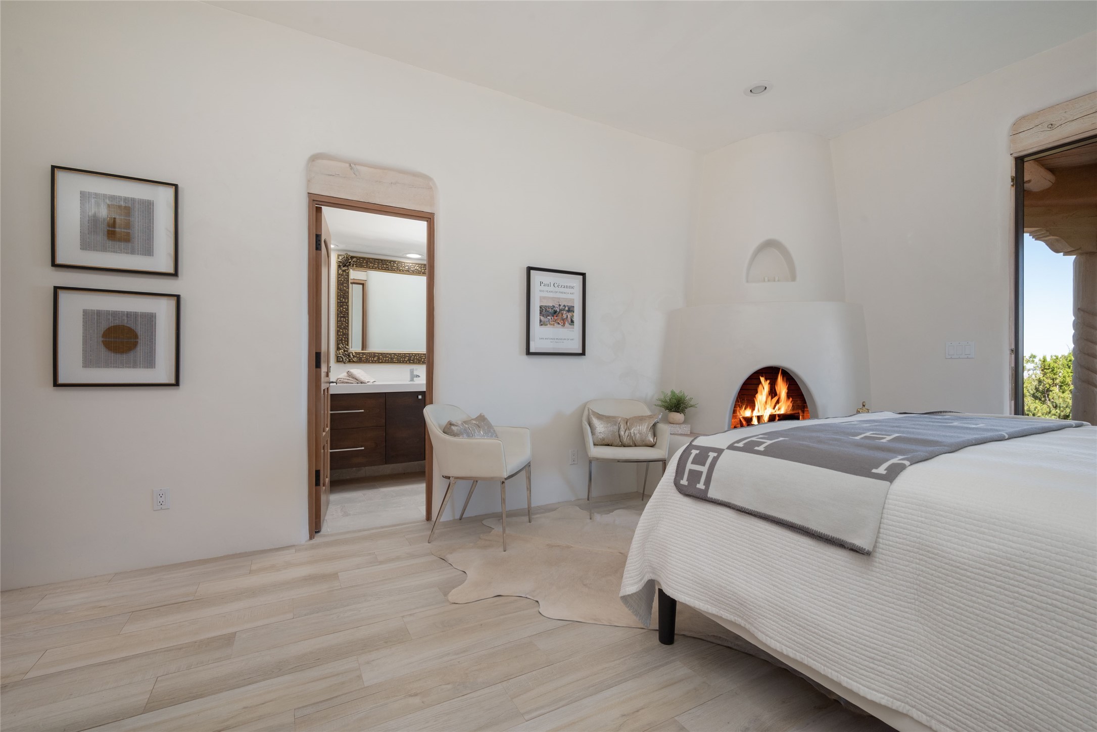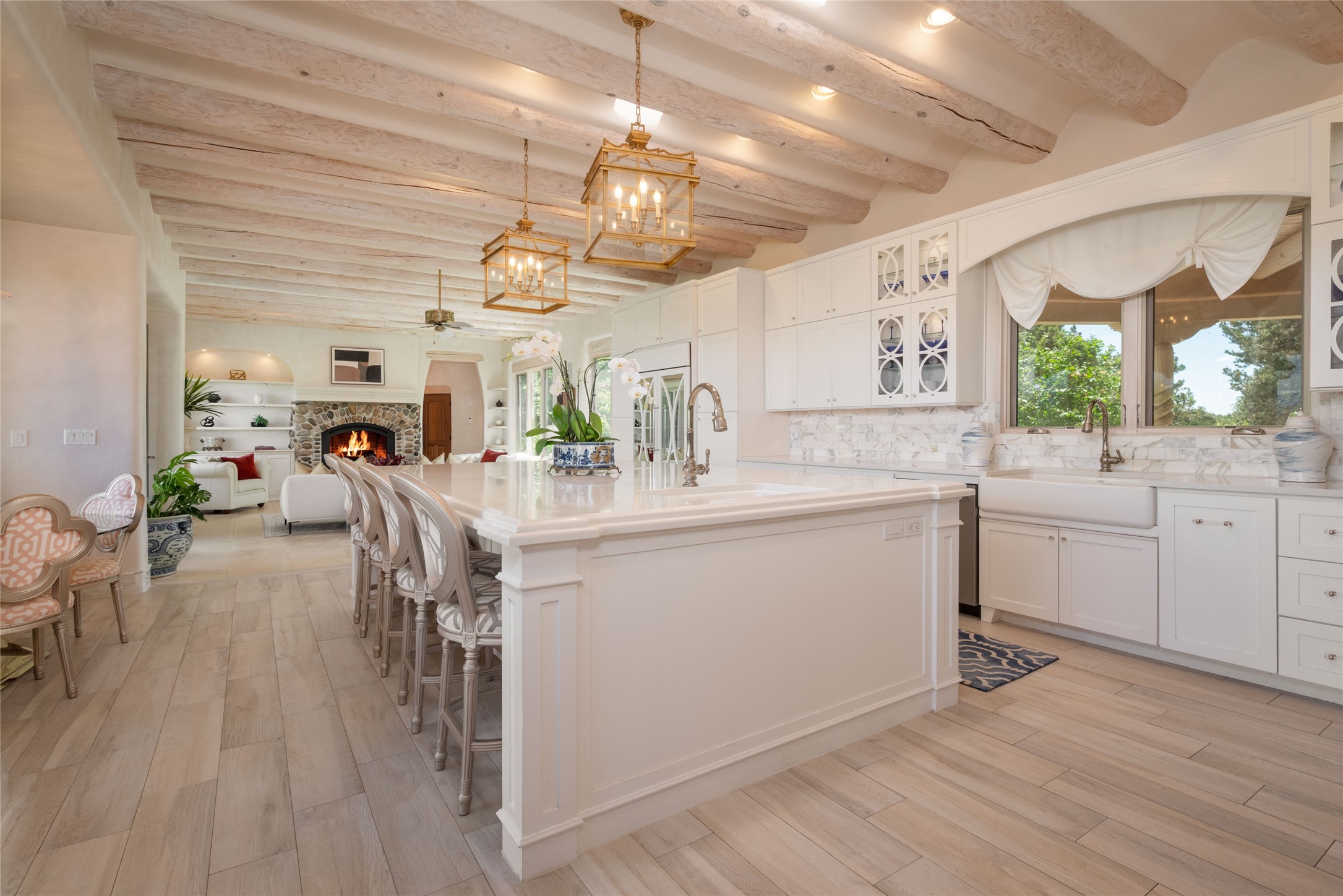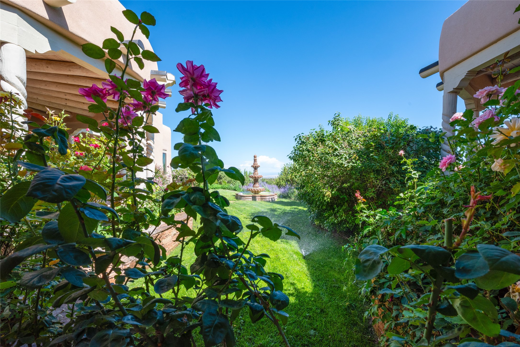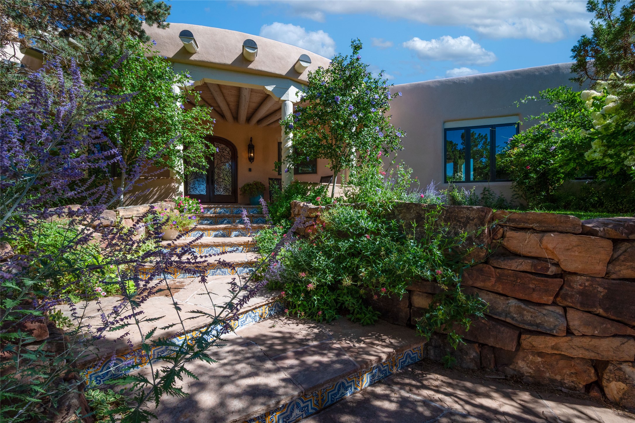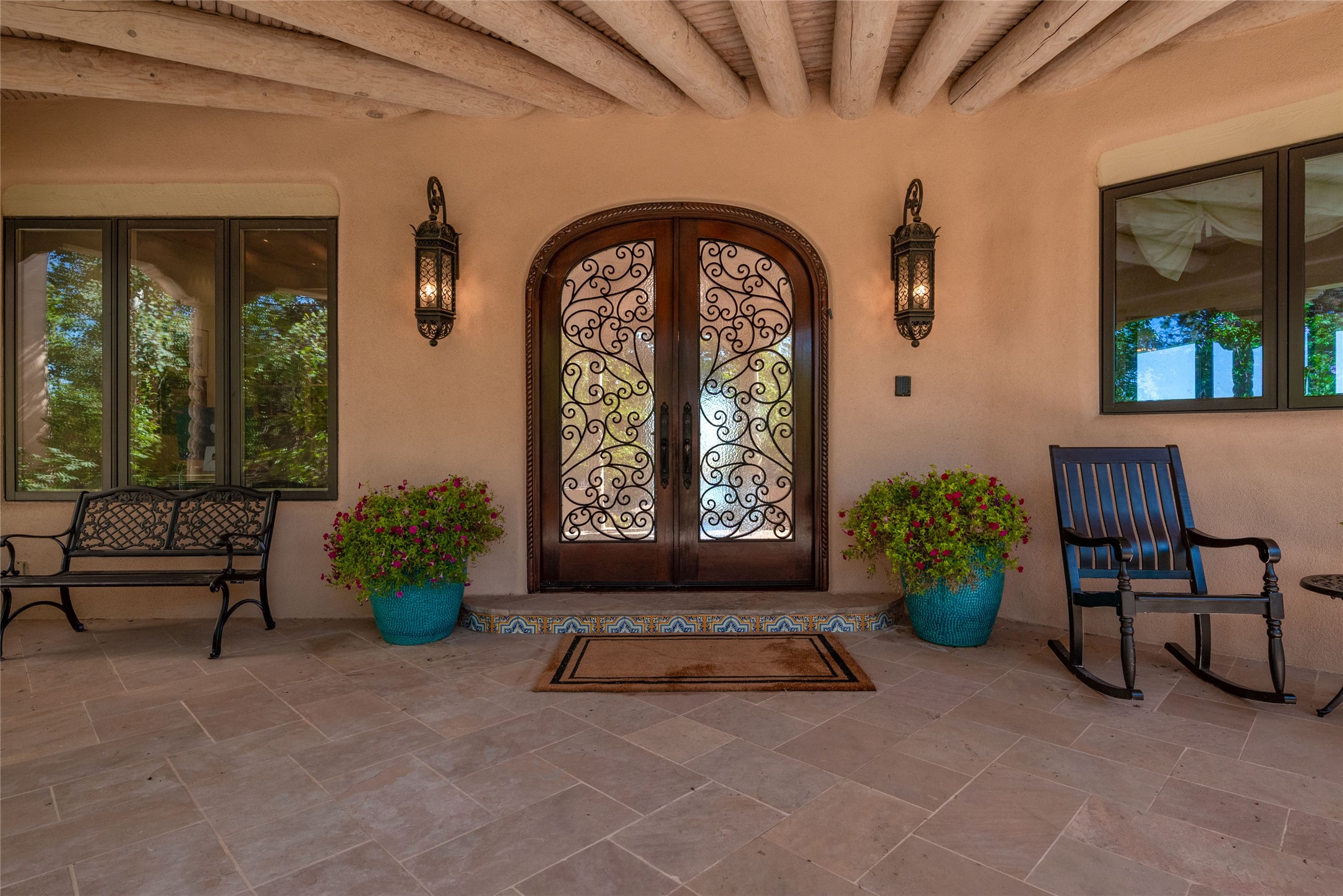 Grand Hacienda Winner and the unrivaled Belle of Tano Road redefines the essence of luxury living. Nestled behind exquisite handcrafted wrought iron gates, you are transported to a serene desert oasis, embraced by the splendor of nature, offering unparalleled privacy and sanctuary from the world. As you enter through handcrafted mahogany and wrought iron doors, the soaring ceilings and diamond plaster walls create an atmosphere of grandeur, while the Italian porcelain floors reflect a commitment to the highest standards of luxury and craftsmanship. Every detail has been meticulously curated for you. The great room, with its endless windows, invites you to bask in the breathtaking views of the sweeping mountains and the enchanting cityscape below, perfectly positioned above the exclusive enclave of Santa Fe. The sprawling estate houses two exquisite primary suites, each featuring spa-like bathrooms with soaking tubs, emperor showers, and ample space to have a powder room lounge, a meditation space, or a fitness area. Each of the four bedrooms is its own sanctuary, complete with fireplace and en-suite facilities, ensuring every guest feels like royalty and that their comfort and privacy are paramount. The gourmet kitchen is a culinary dream featuring custom cabinetry, Wolf range with double ovens and a warming drawer, Sub-Zero refrigerator, and a massive island seamlessly connecting to the outdoor cooking and dining spaces for effortless entertaining. Expansive grounds, nearly three lush acres, adorned with manicured lawns, vibrant rose gardens, and fruit trees, offer an idyllic setting for outdoor gatherings. These luxurious spaces provide not just comfort, but a lifestyle of sophistication. Immaculately maintained and thoughtfully expanded, this sprawling 6,700sq.ft estate is a testament to refined living. This is more than just a home - it is a lifestyle drenched in luxury and elegance. Design that speaks to the most discerning tastes and coveted desires. *Video*